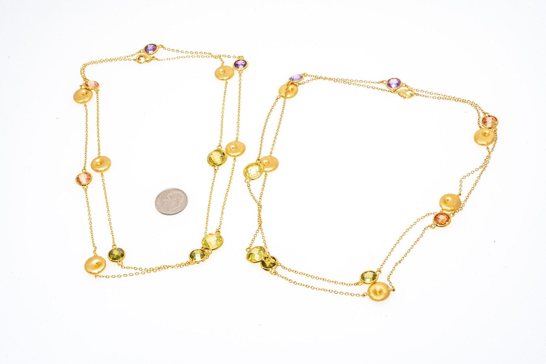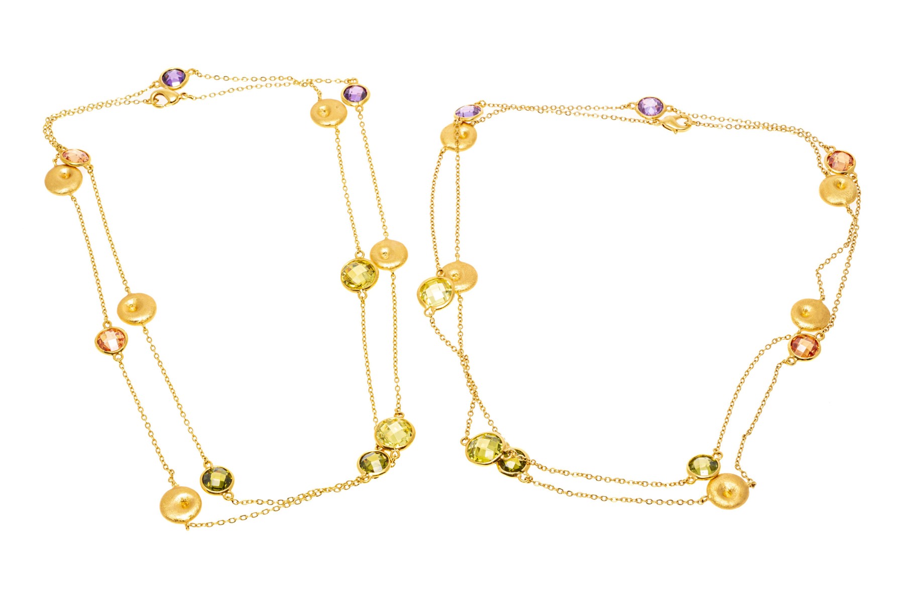 Pair of two fabulous colorful opera length costume jewelry necklaces, lobster claw clasps, can be combined to make one long rope length