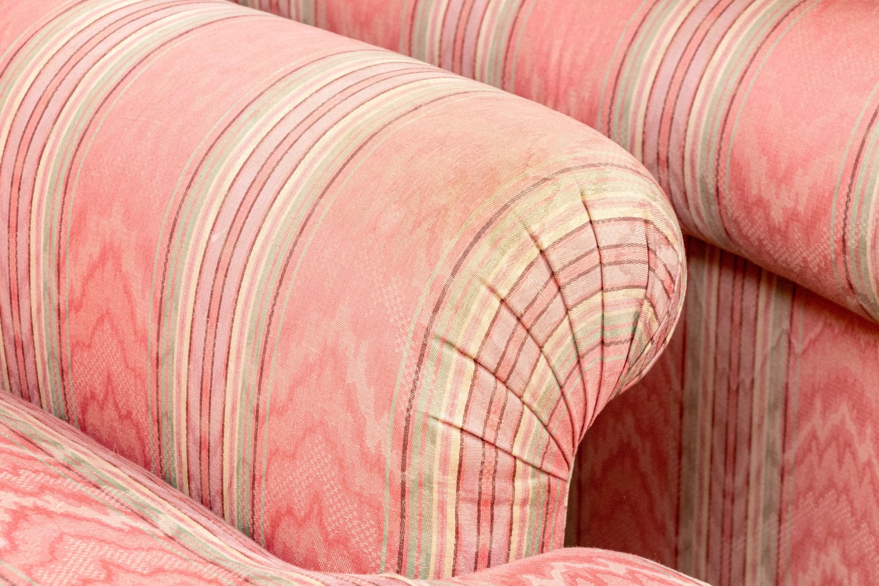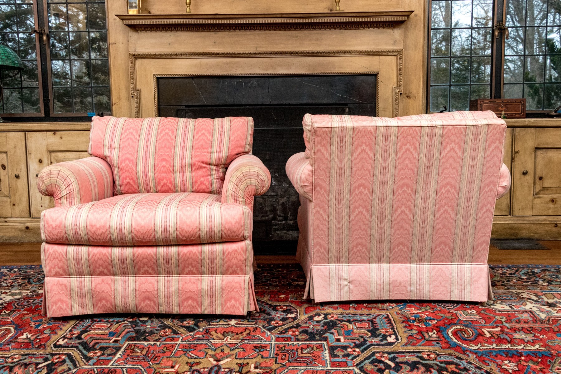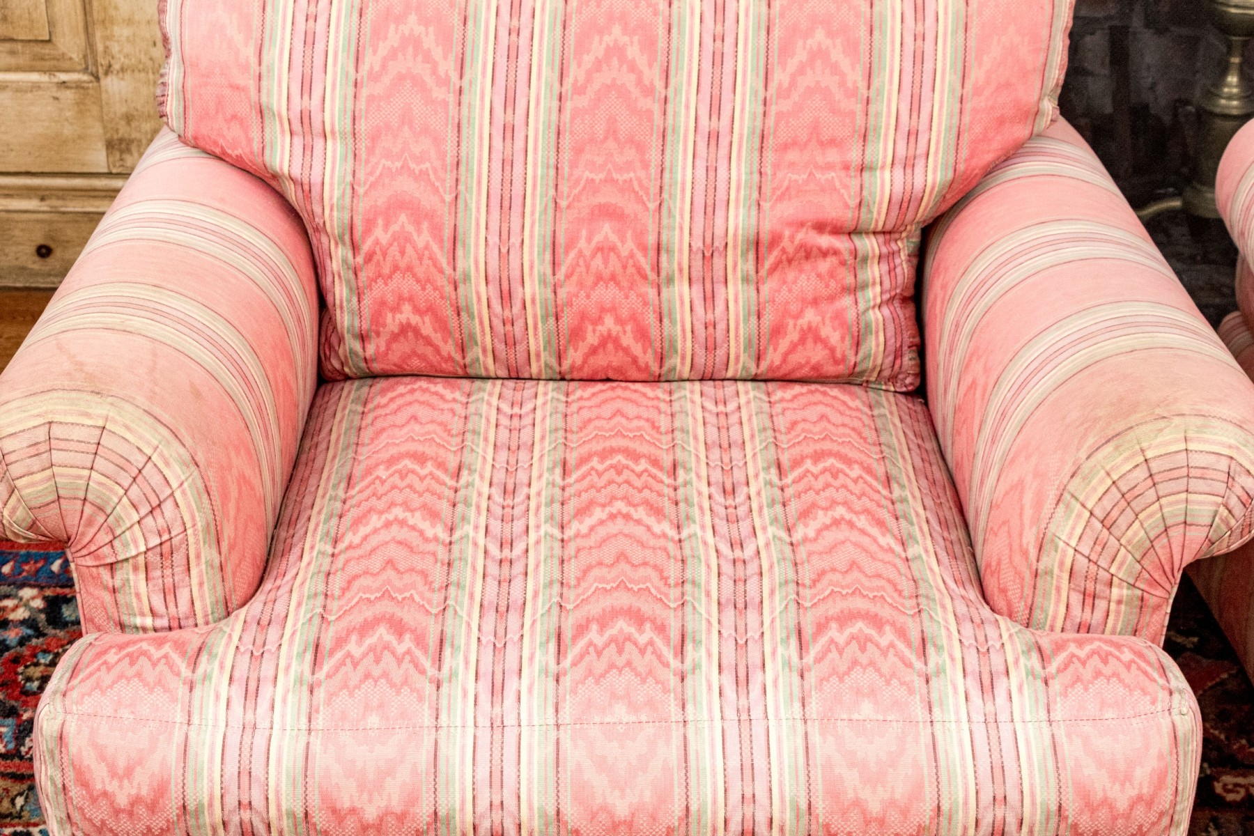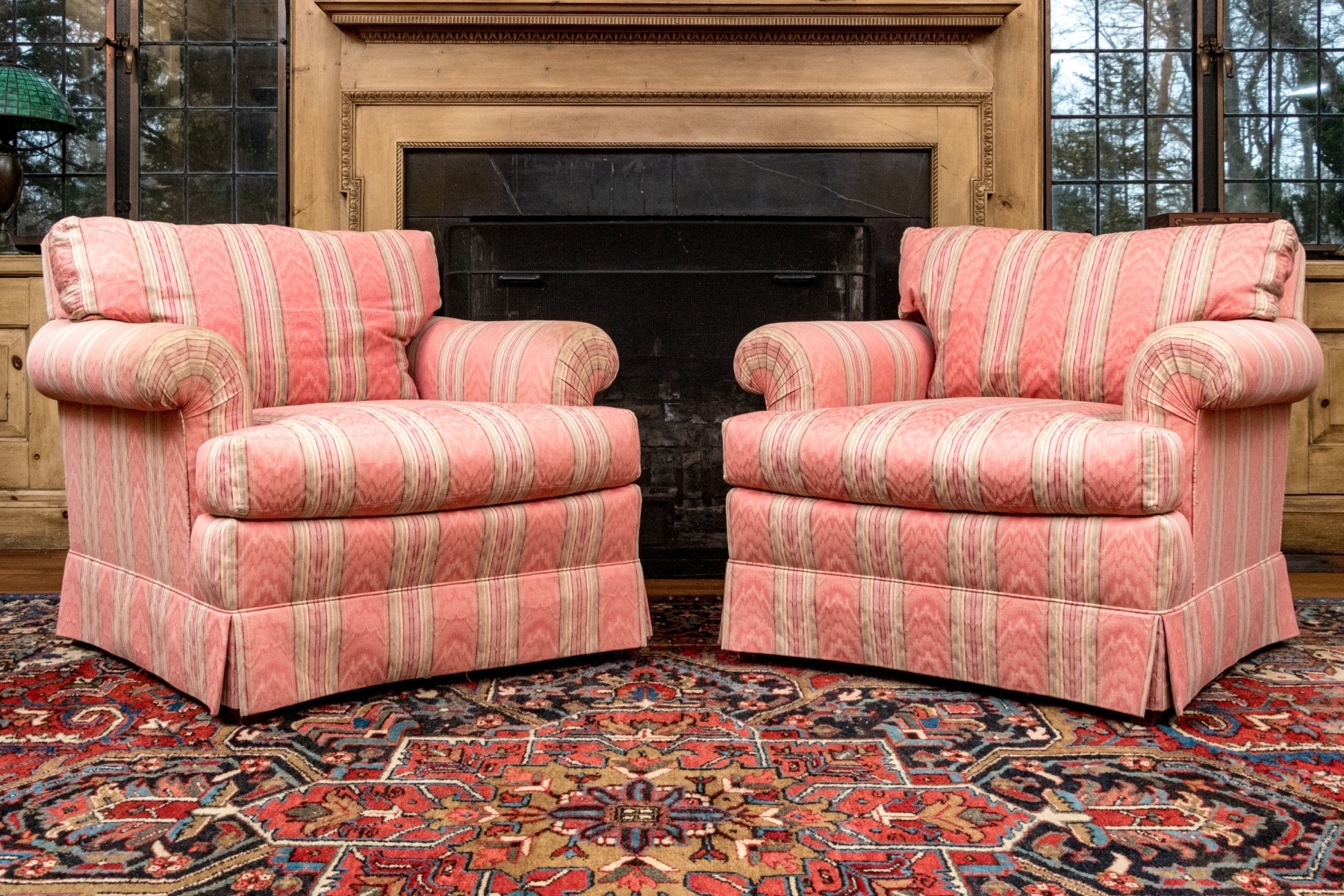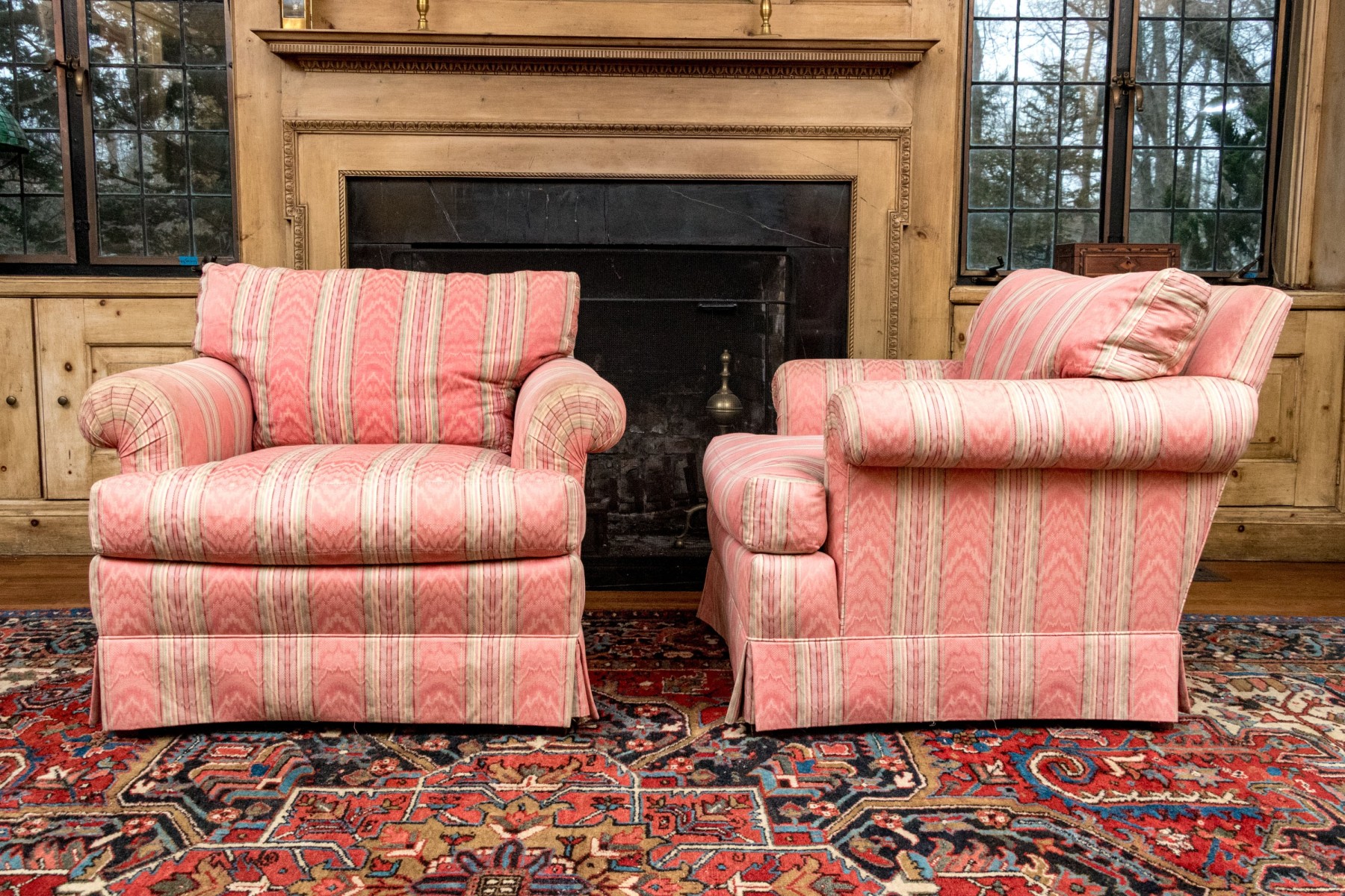A delightful pair of club chairs with versatile style perfect for both traditional and contemporary aesthetics. The chairs feature loose back and seat cushions with low and wide backs, rolled arms, and deep-set seats over skirts. Upholstered throughout in patterned red, green, pink, and yellow stripes. Cushions are filled with down blend for a luxurious, comfortable feel.