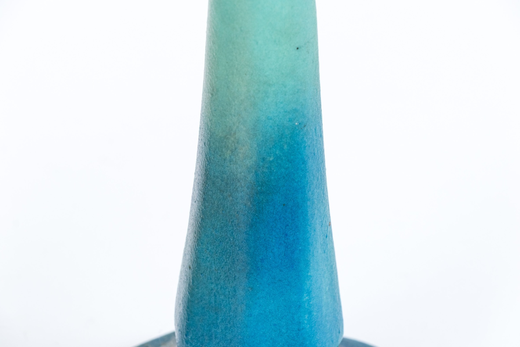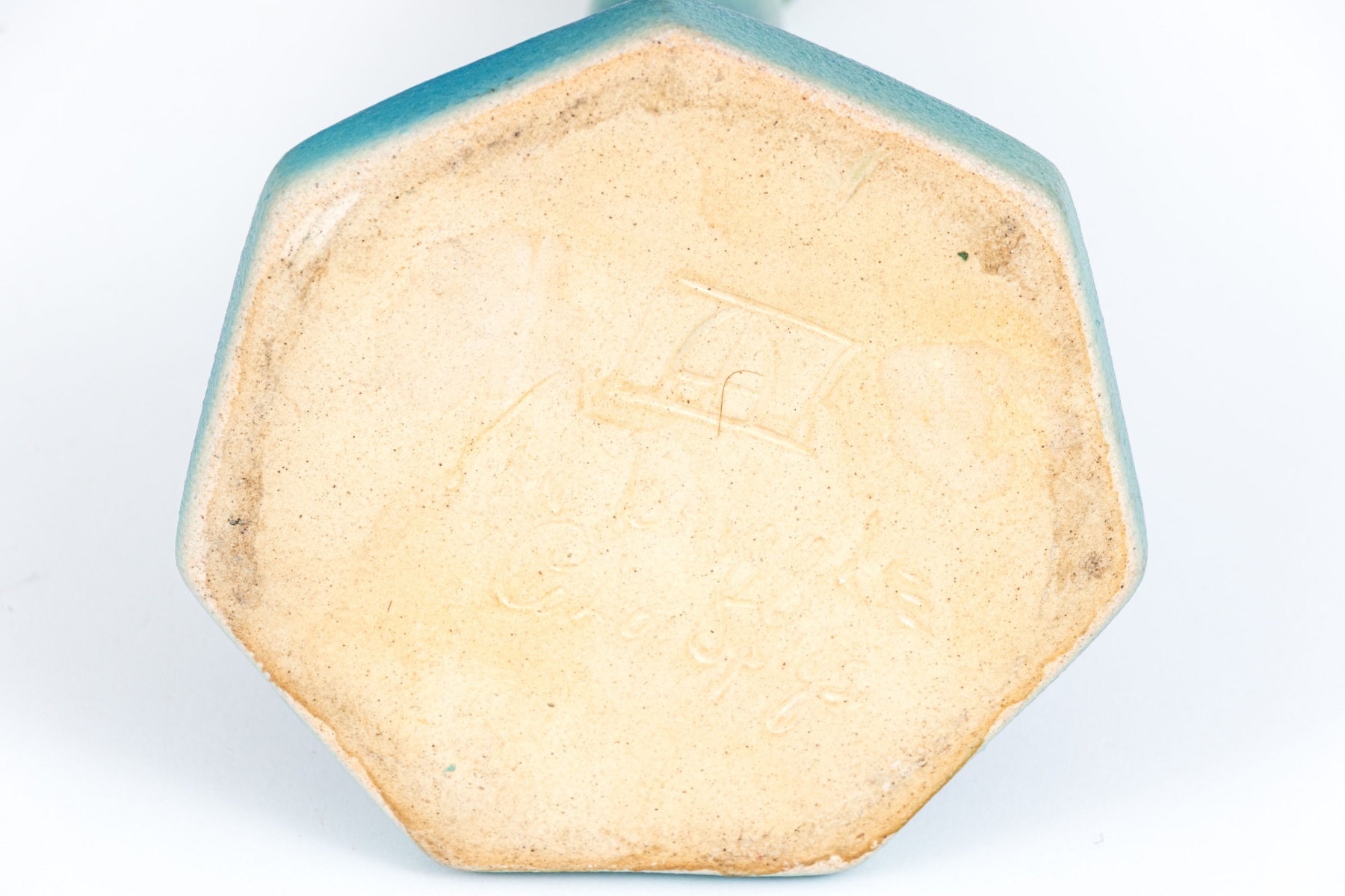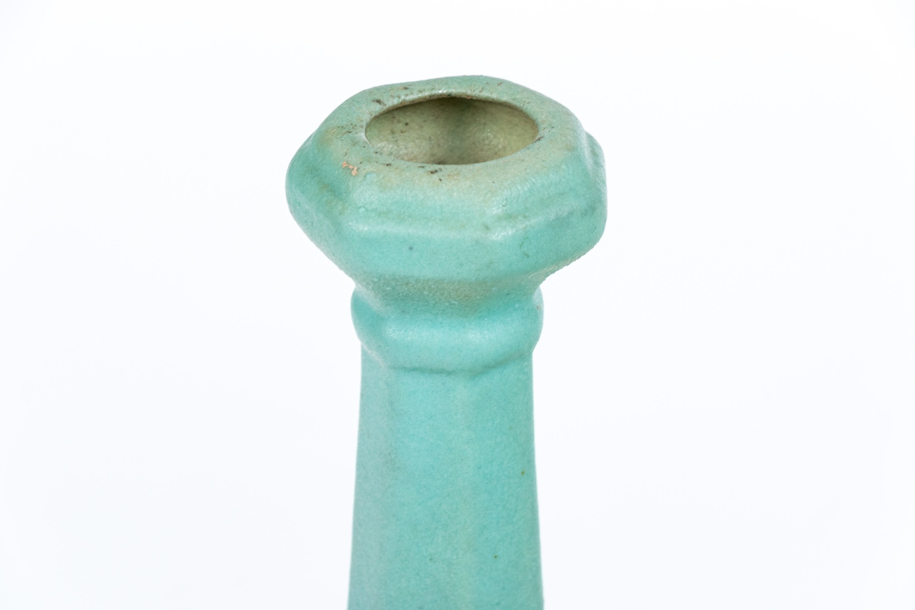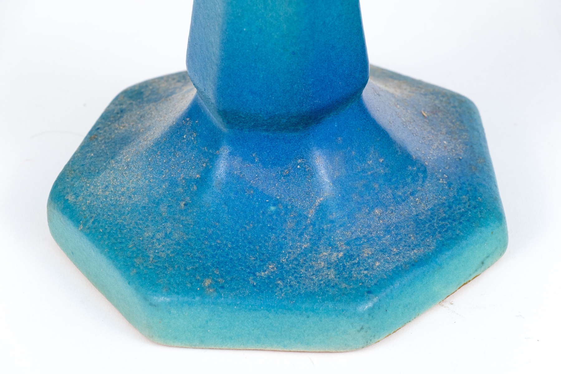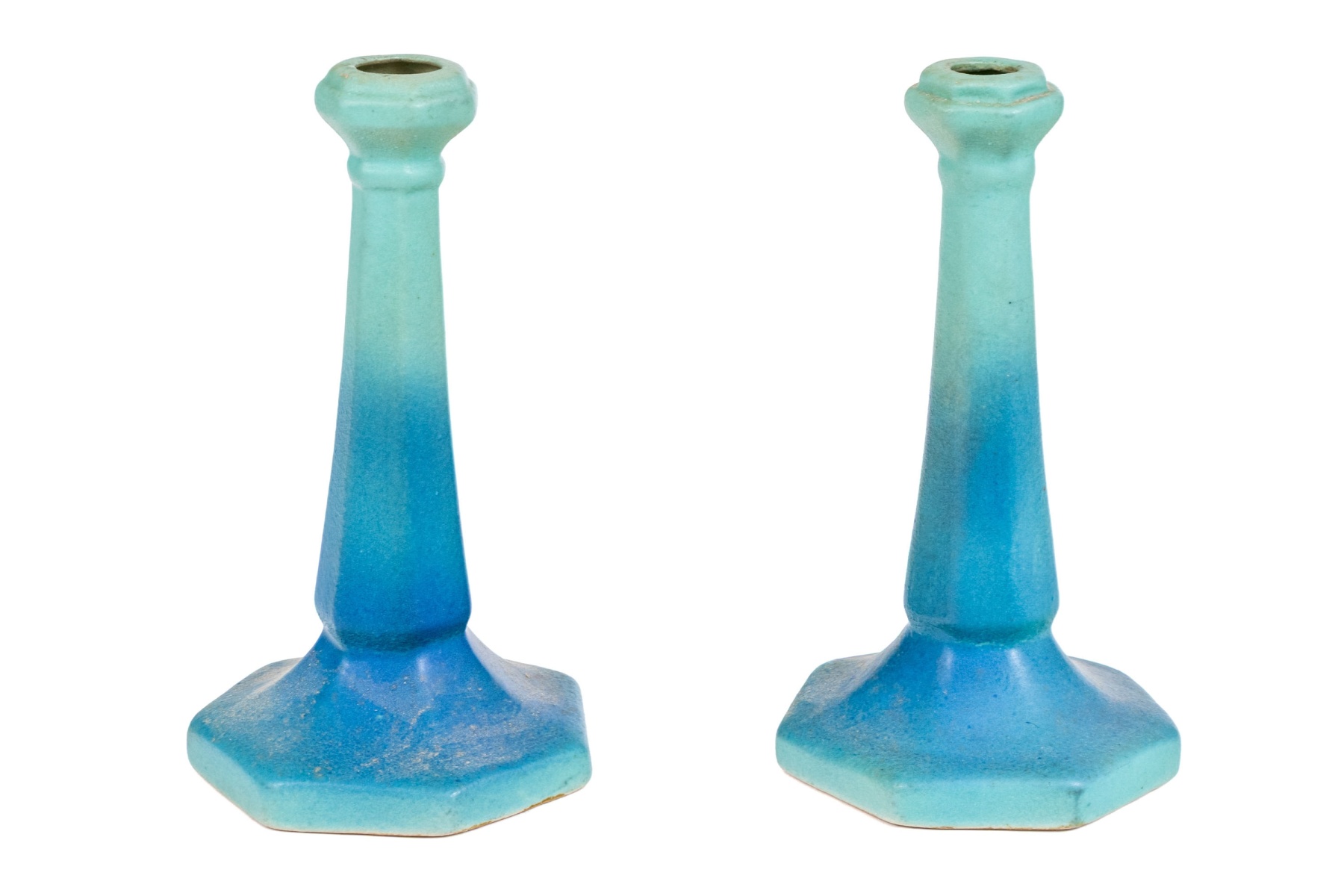 A wonderful pair of Van Briggle ceramic candlesticks on seven sided bases with classic tapered forms and nozzles. Signed underfoot.