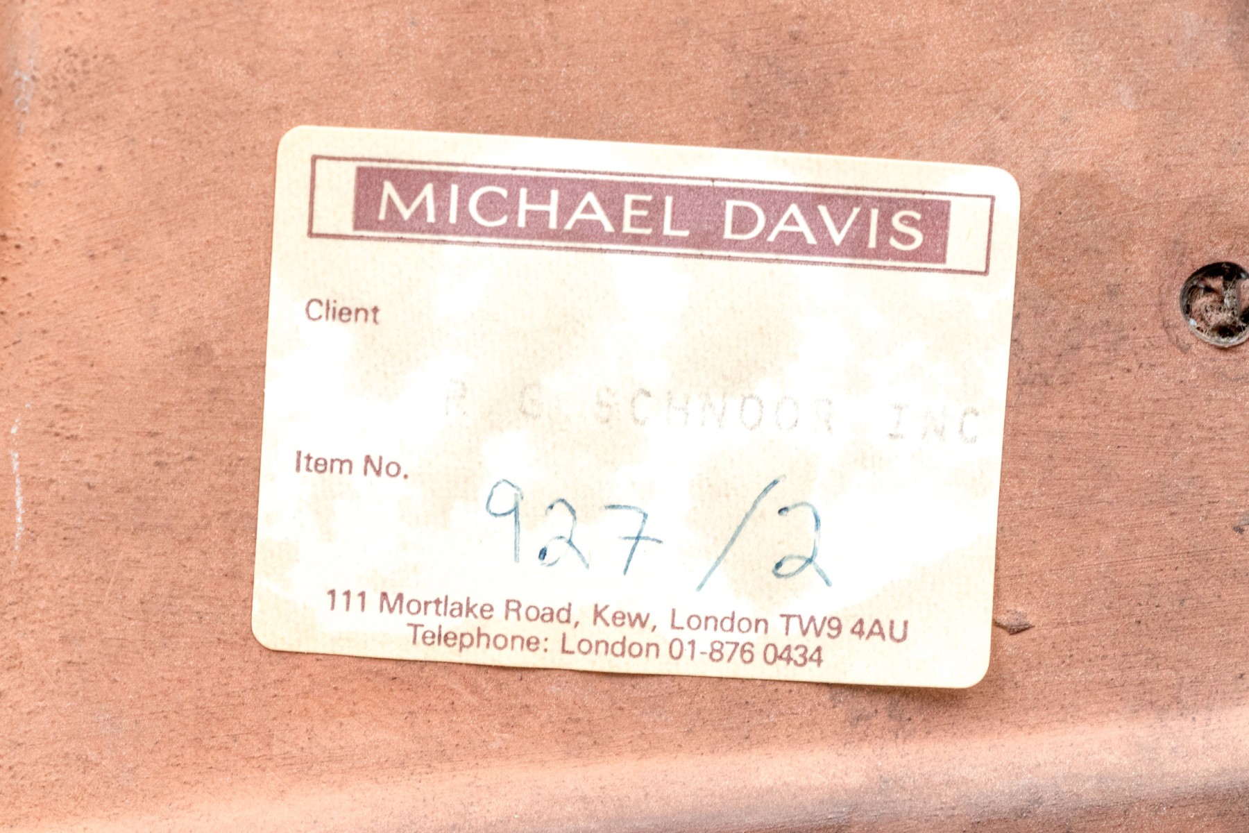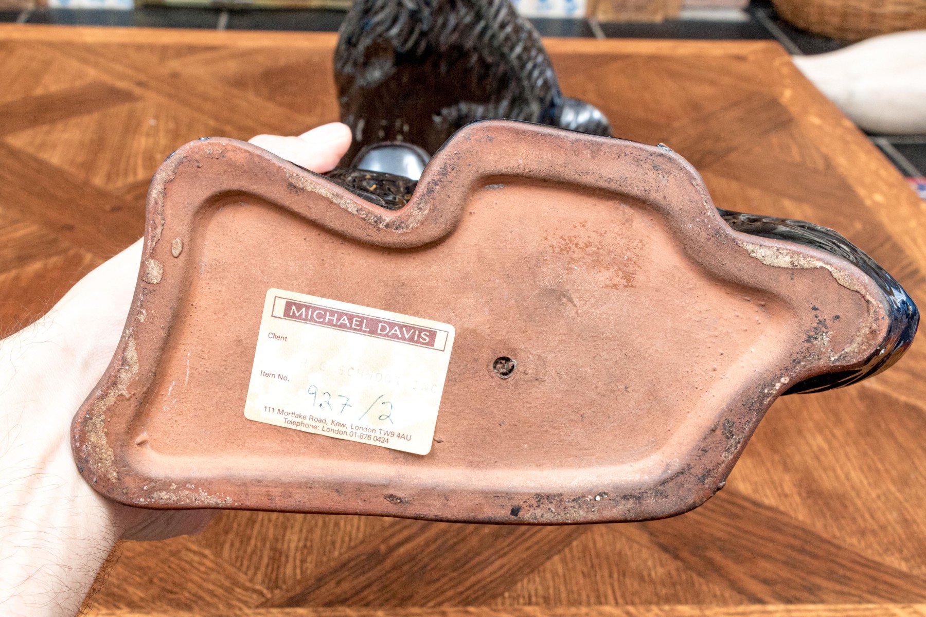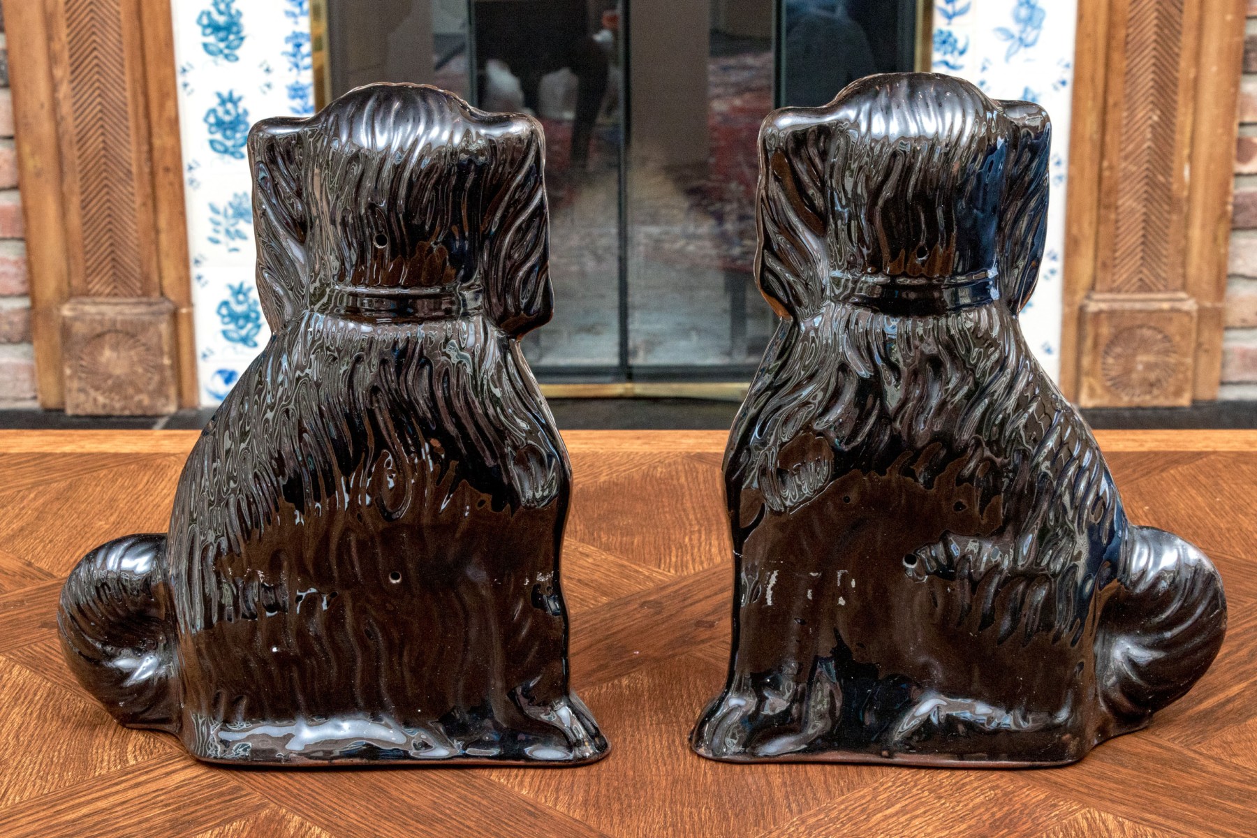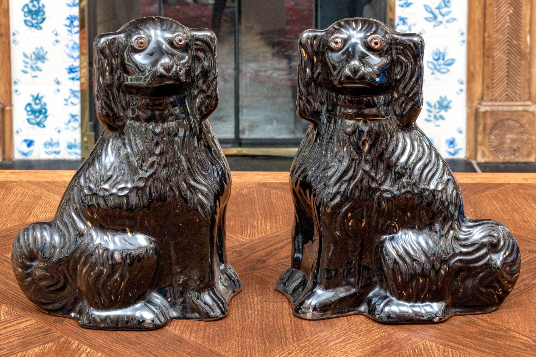 Pair of black glazed English Staffordshire Spaniels, inset with brown glass eyes, bearing labels beneath "Michael Davis, London".