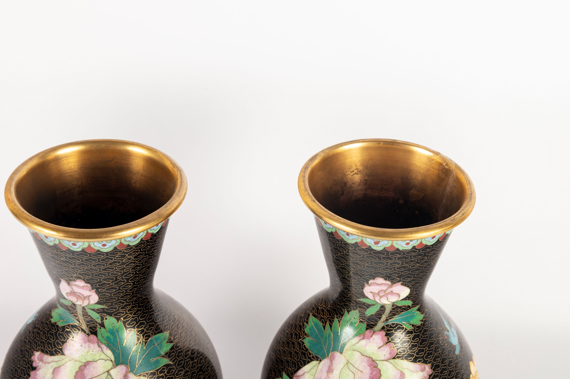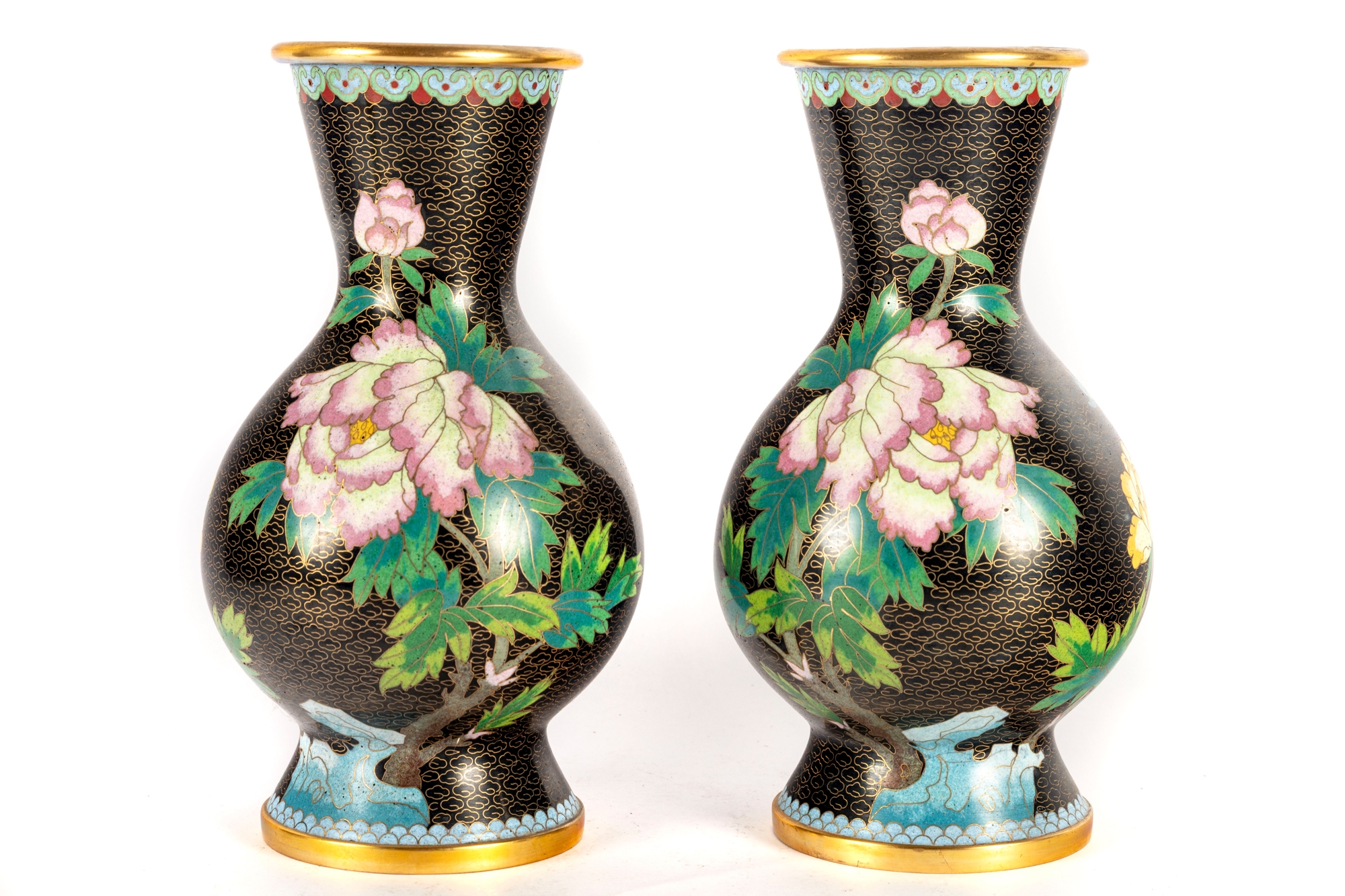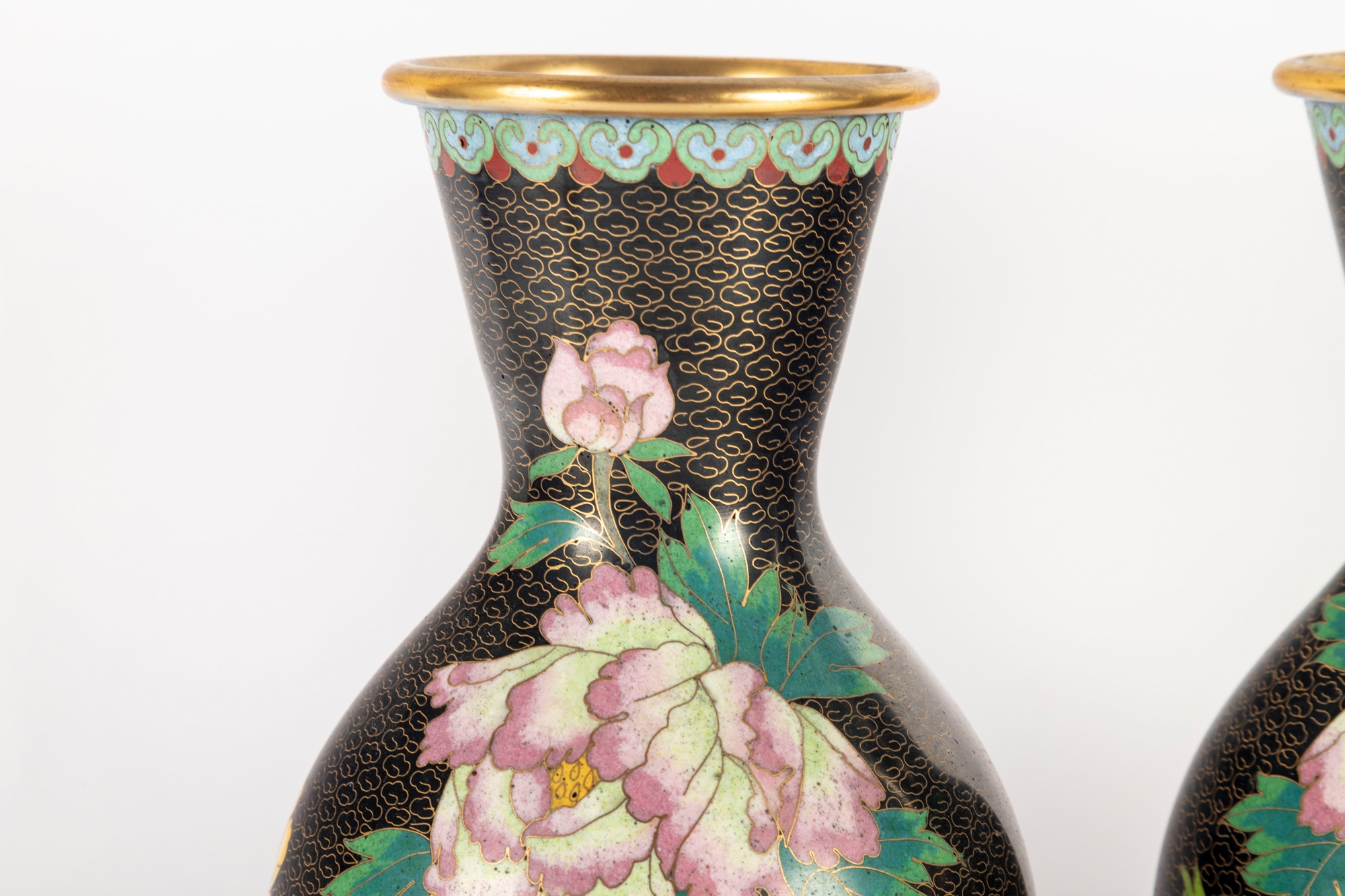 Elegant pair of vintage cloisonné vases featuring large blooming pink and white peonies with lush green leaves on a rich black background accented by intricate gold cloud patterns. The vases are finished with turquoise and red decorative borders near the rim and base, and gold-toned rims and feet.