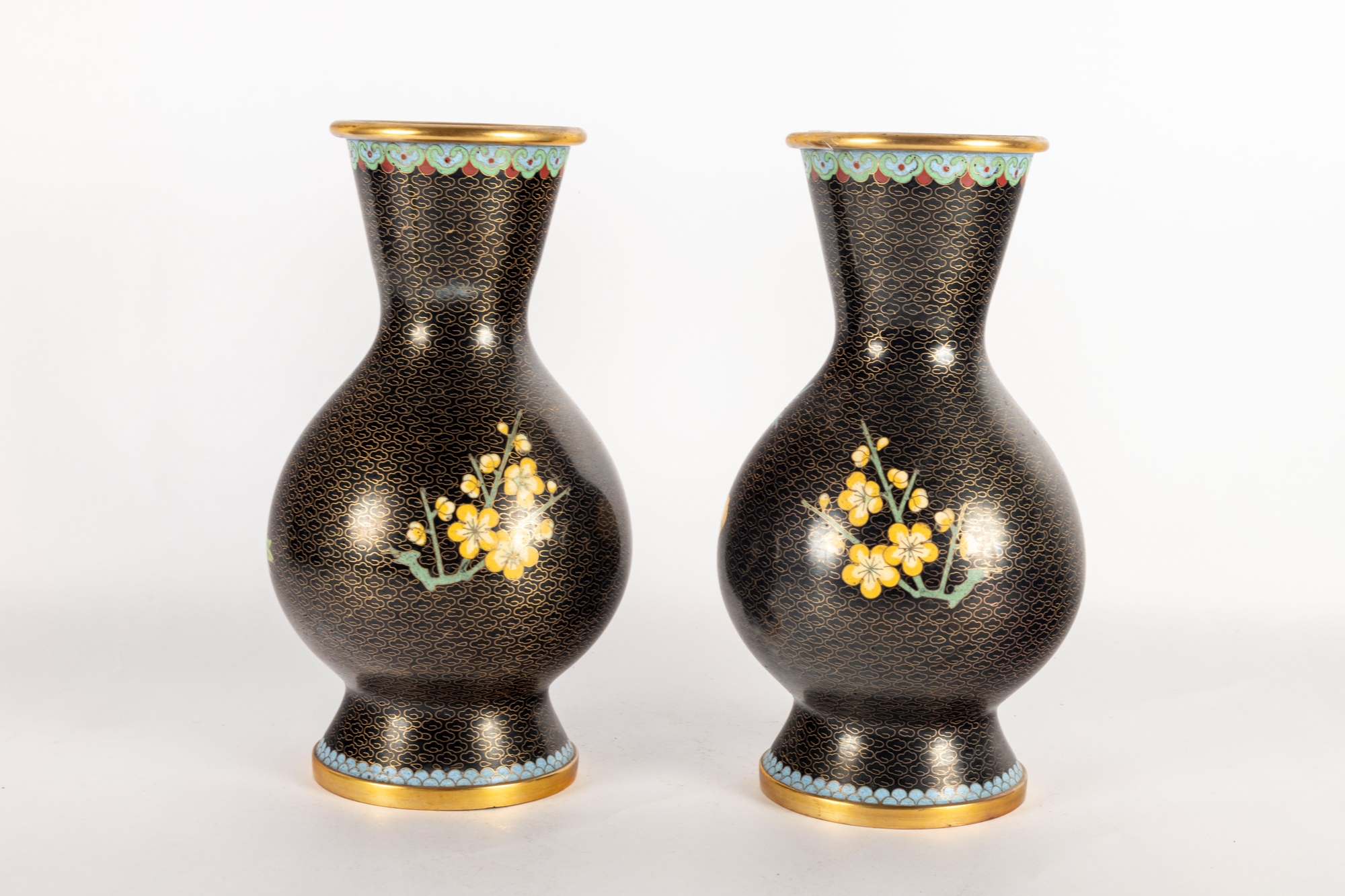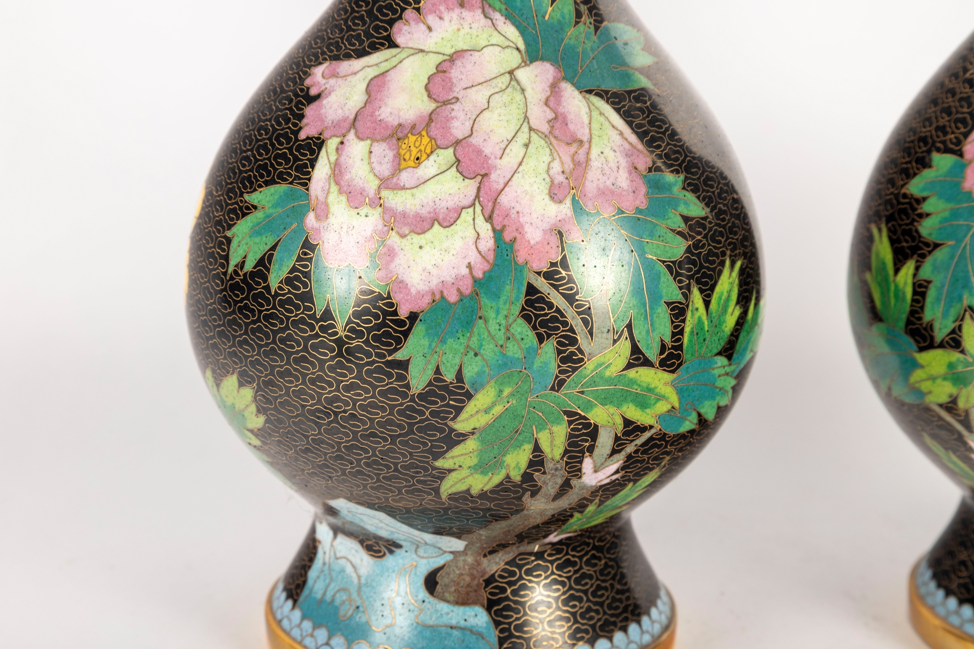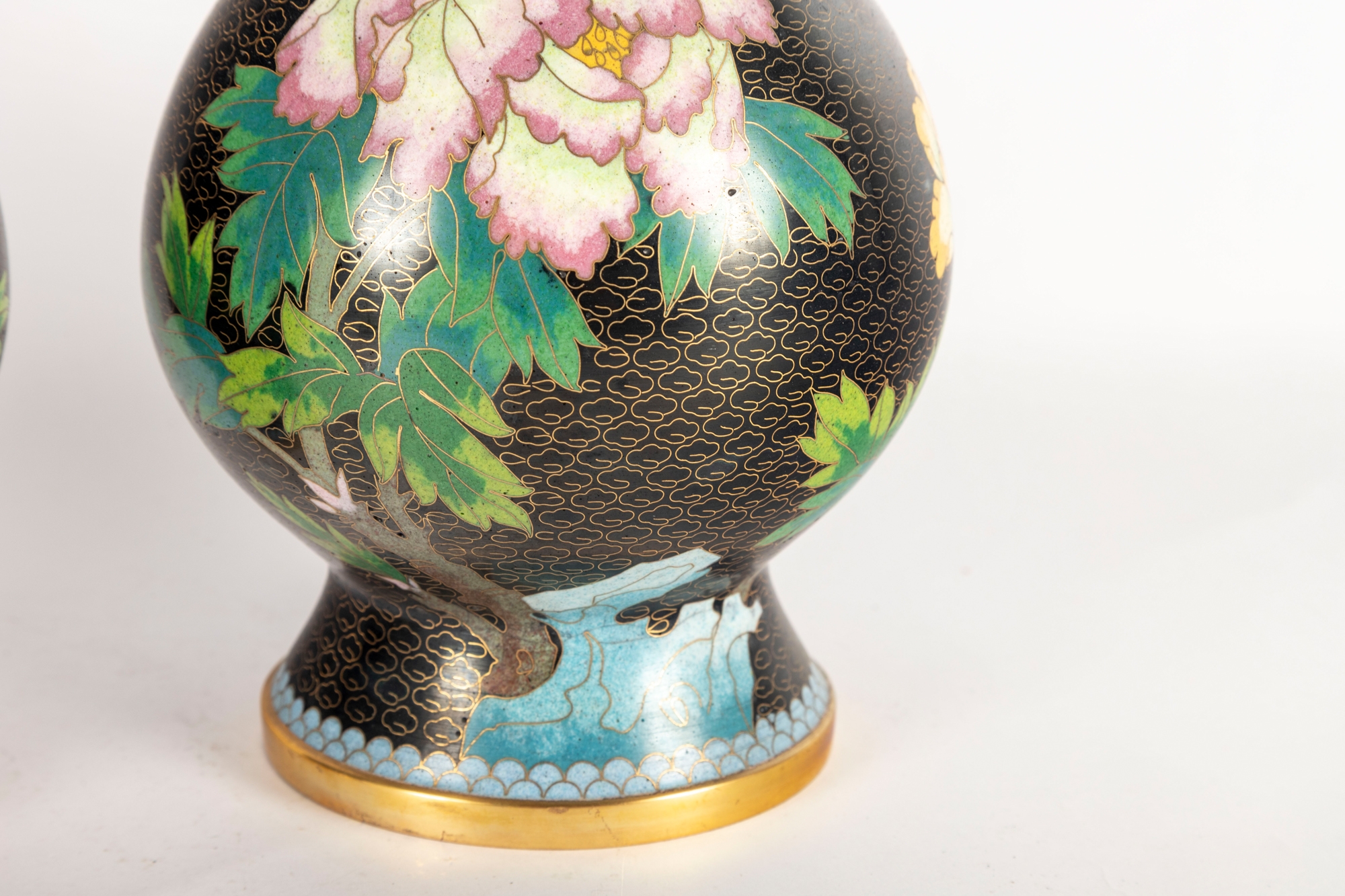Elegant pair of vintage cloisonné vases featuring large blooming pink and white peonies with lush green leaves on a rich black background accented by intricate gold cloud patterns. The vases are finished with turquoise and red decorative borders near the rim and base, and gold-toned rims and feet.