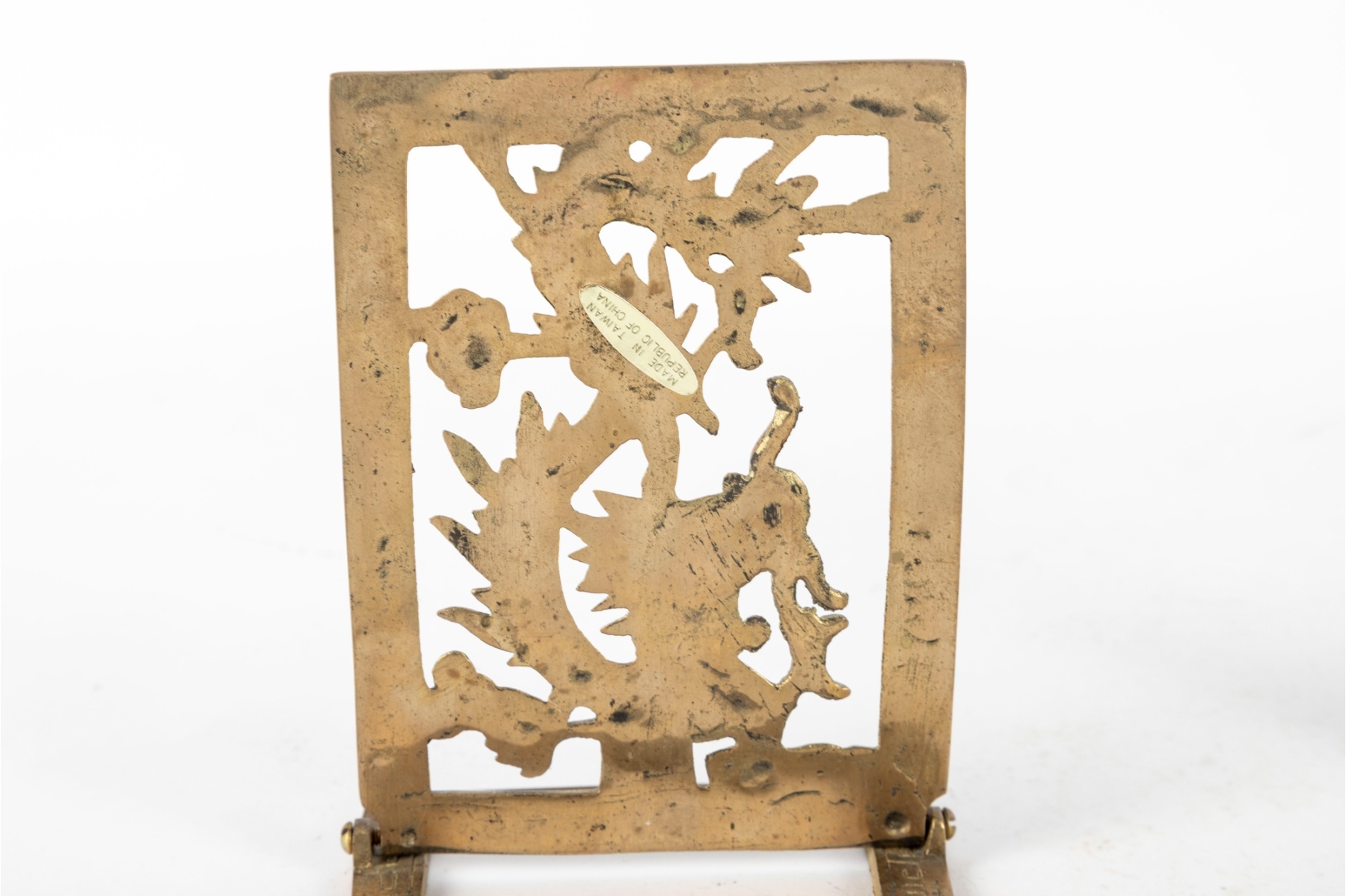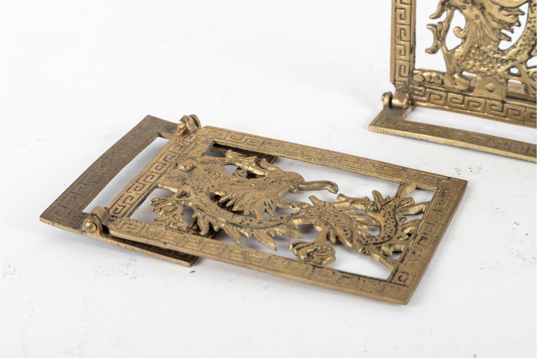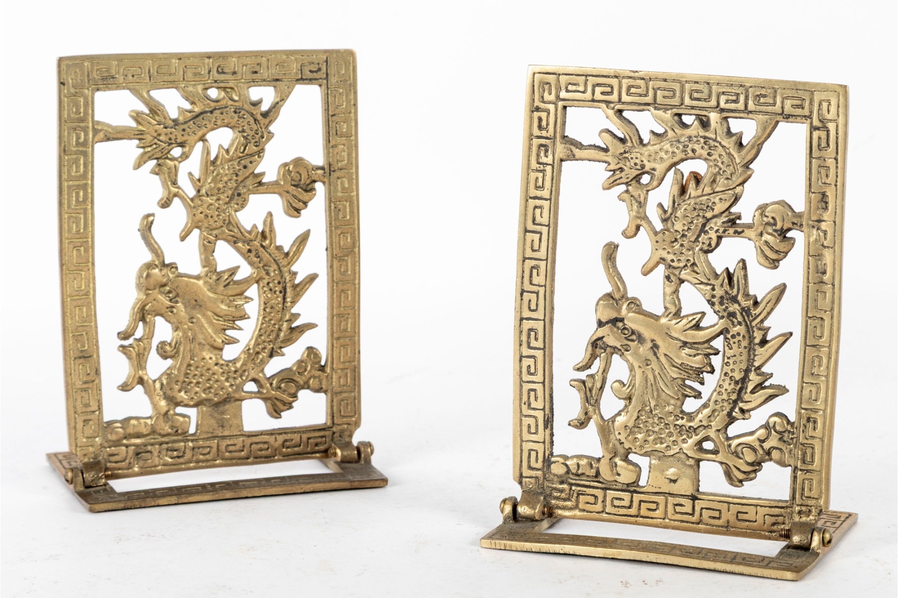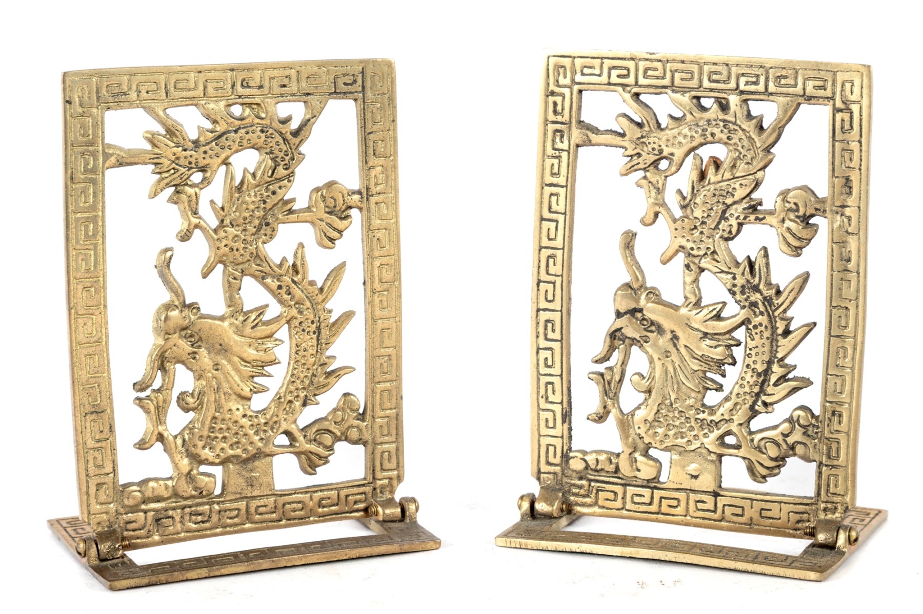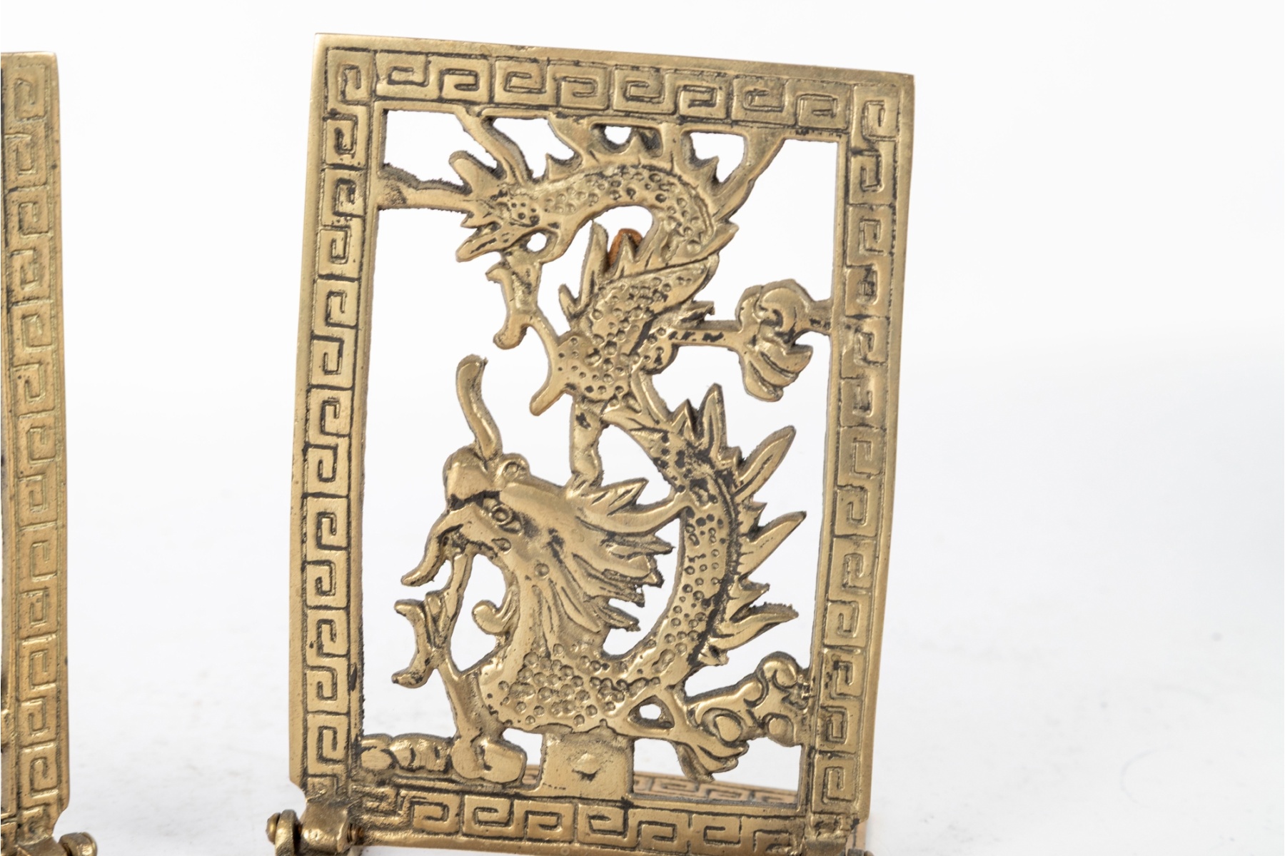 A striking pair of vintage brass bookends featuring detailed openwork dragon designs framed by a geometric Greek key border. Each bookend is hinged, allowing them to fold flat for easy storage or display versatility. The dragons are depicted in dynamic motion, symbolizing strength and power in traditional Asian art. One retains a label reading “Made in Taiwan, Republic of China.”