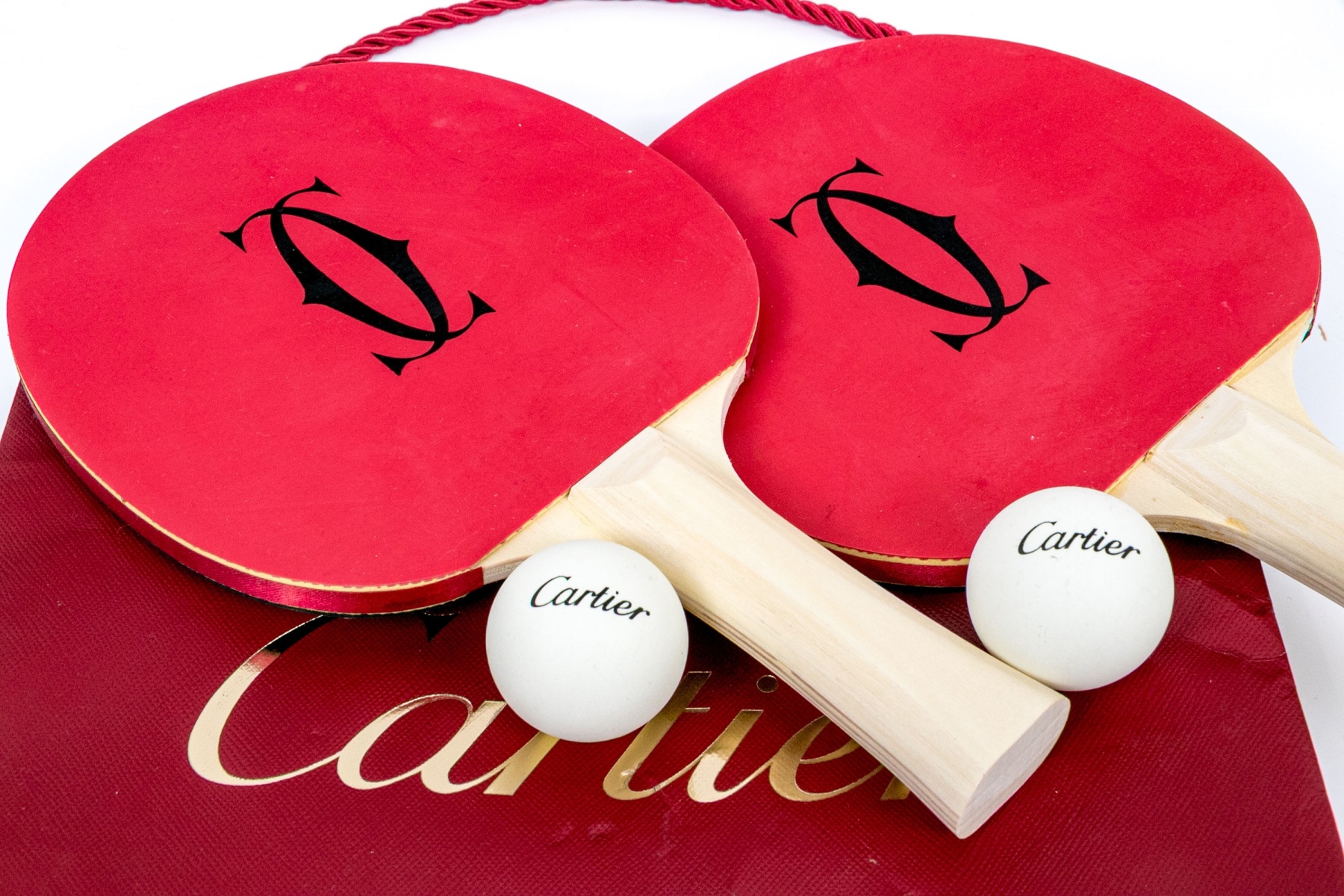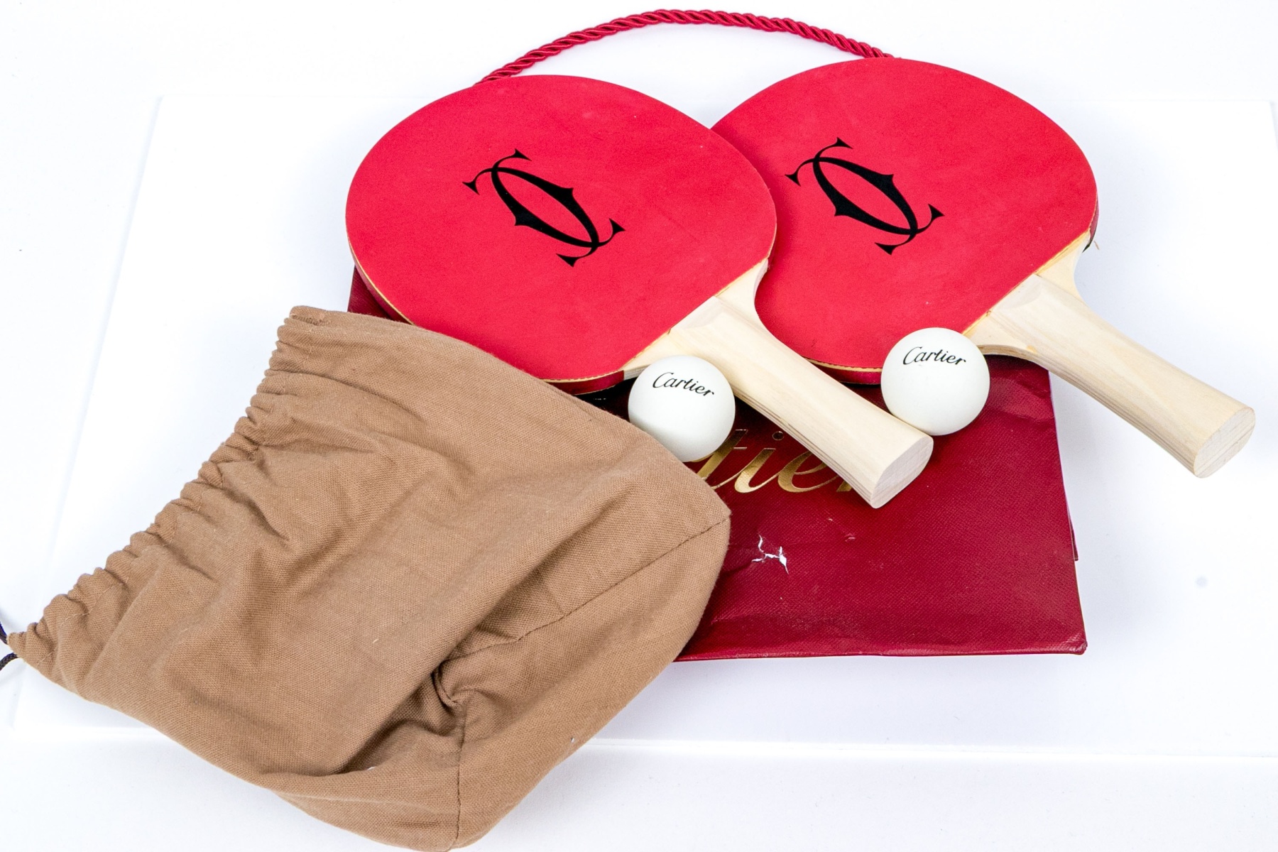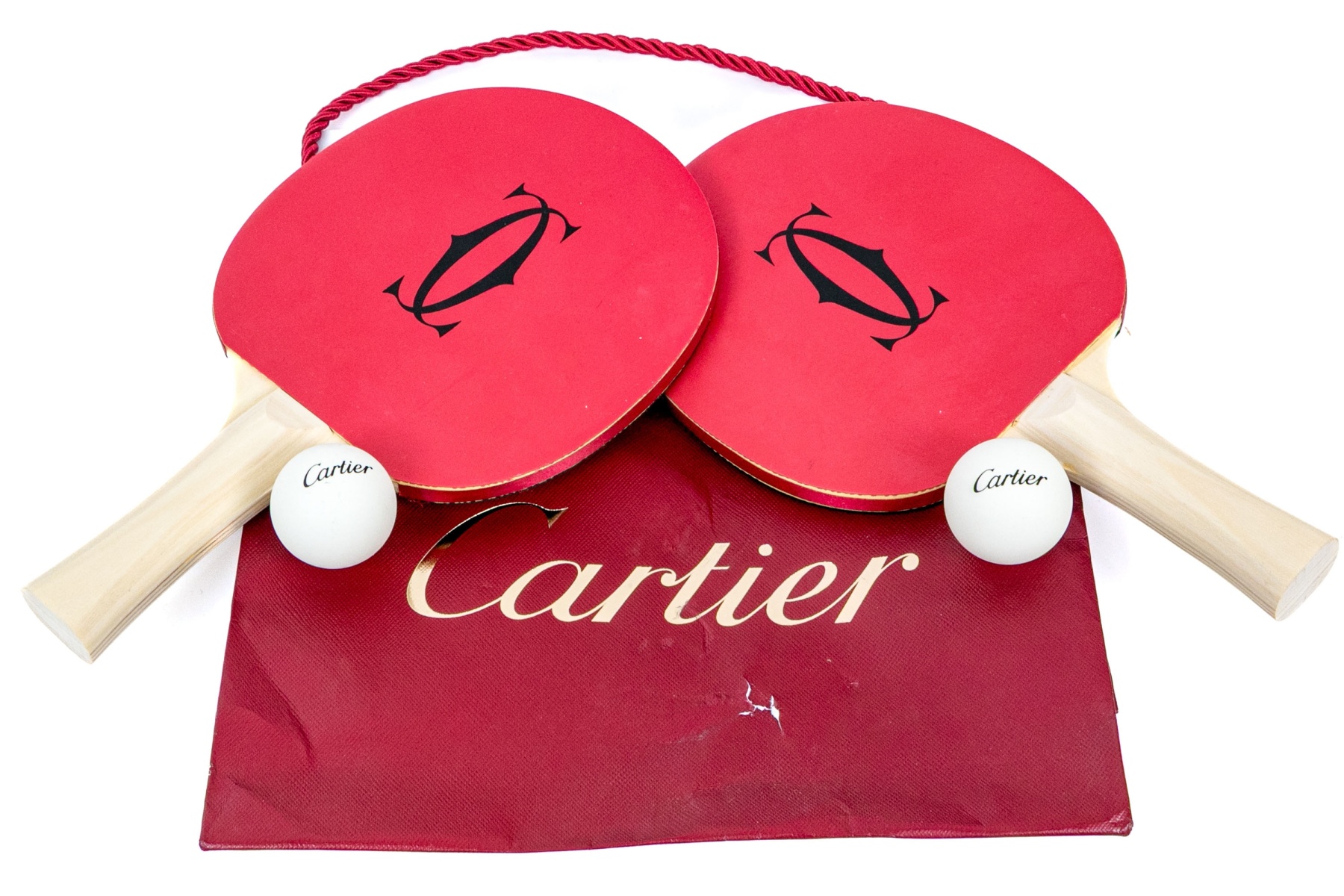 The paddles with red rubberized tops with the Cartier monogram. The sides with ribbon and the back in black lacquer. Natural wood handles. Along with a pair of balls with the Cartier label. With a pouch and all presented in a Cartier red tote bag.