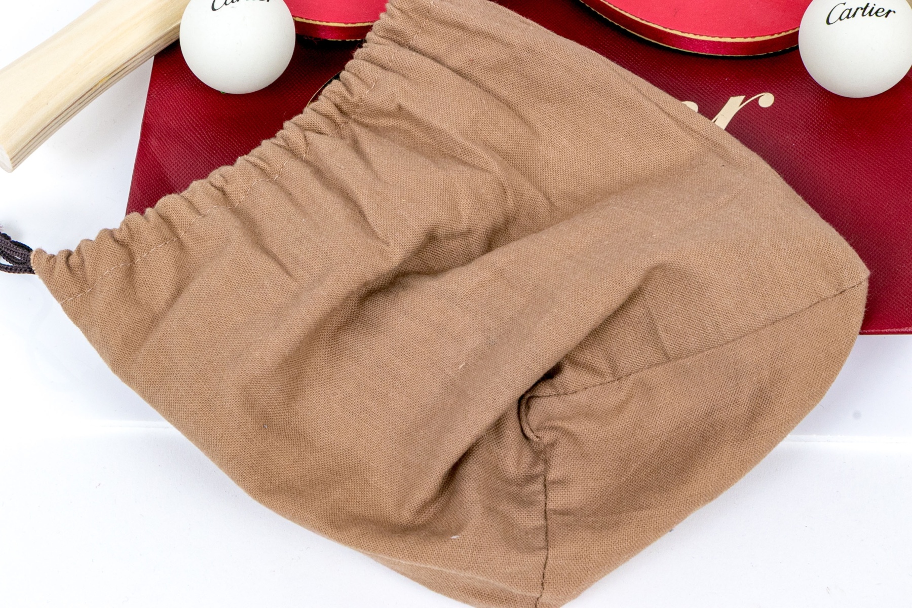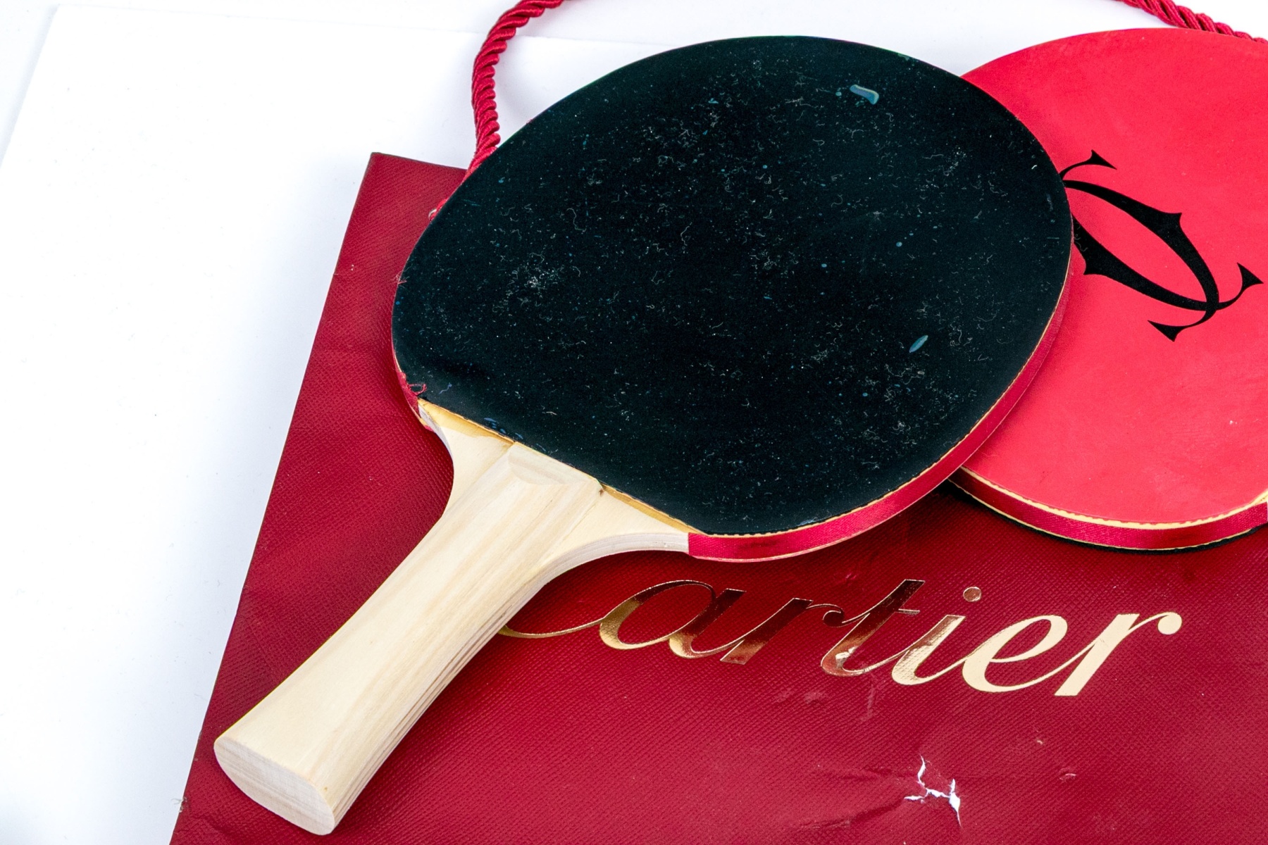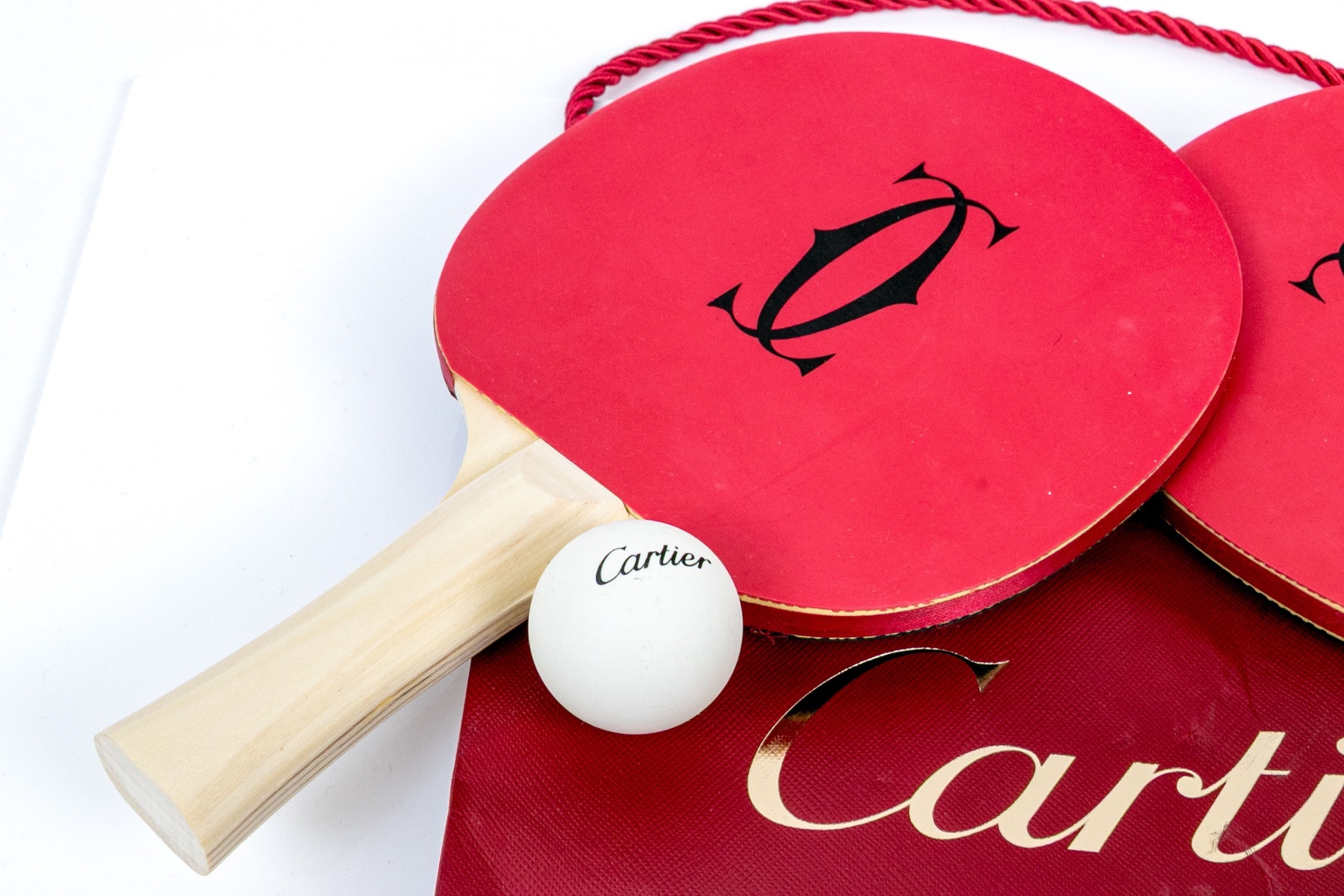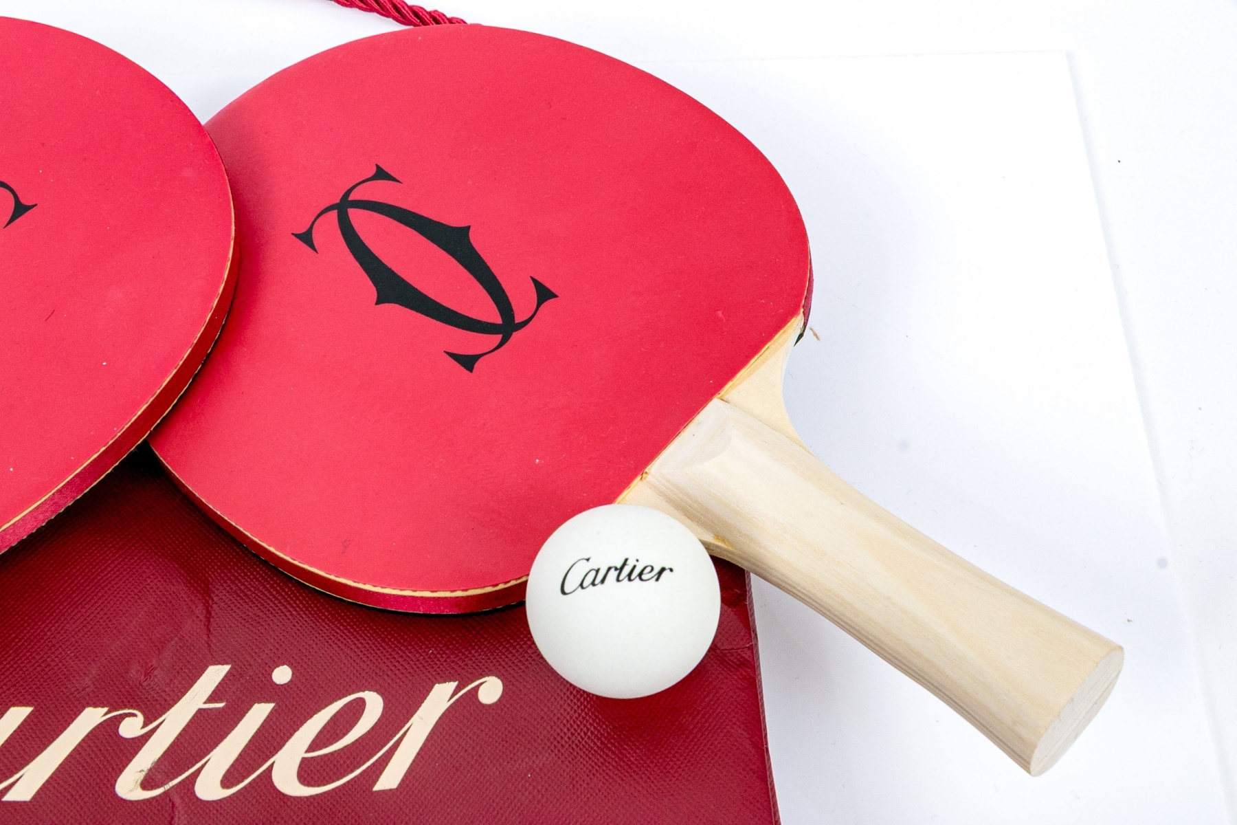 The paddles with red rubberized tops with the Cartier monogram. The sides with ribbon and the back in black lacquer. Natural wood handles. Along with a pair of balls with the Cartier label. With a pouch and all presented in a Cartier red tote bag.