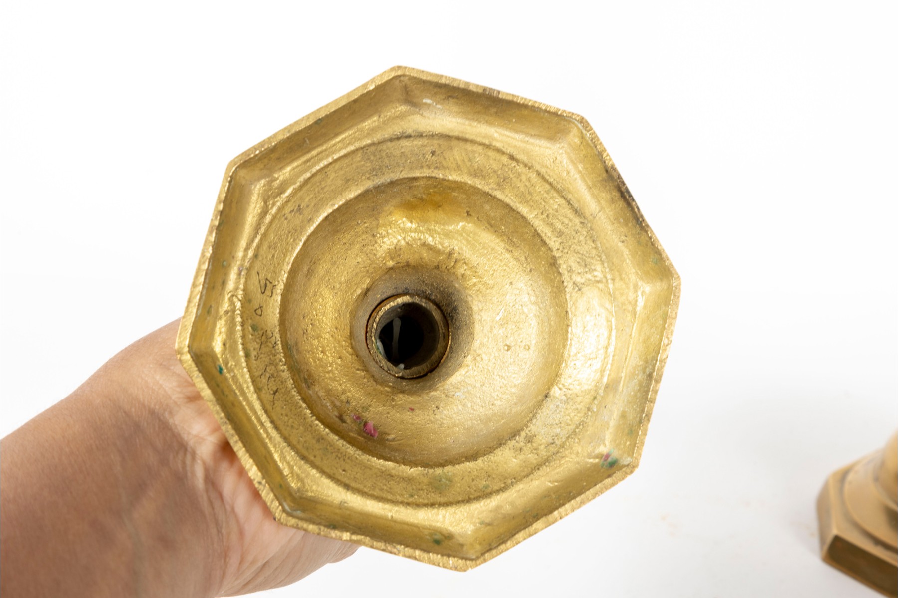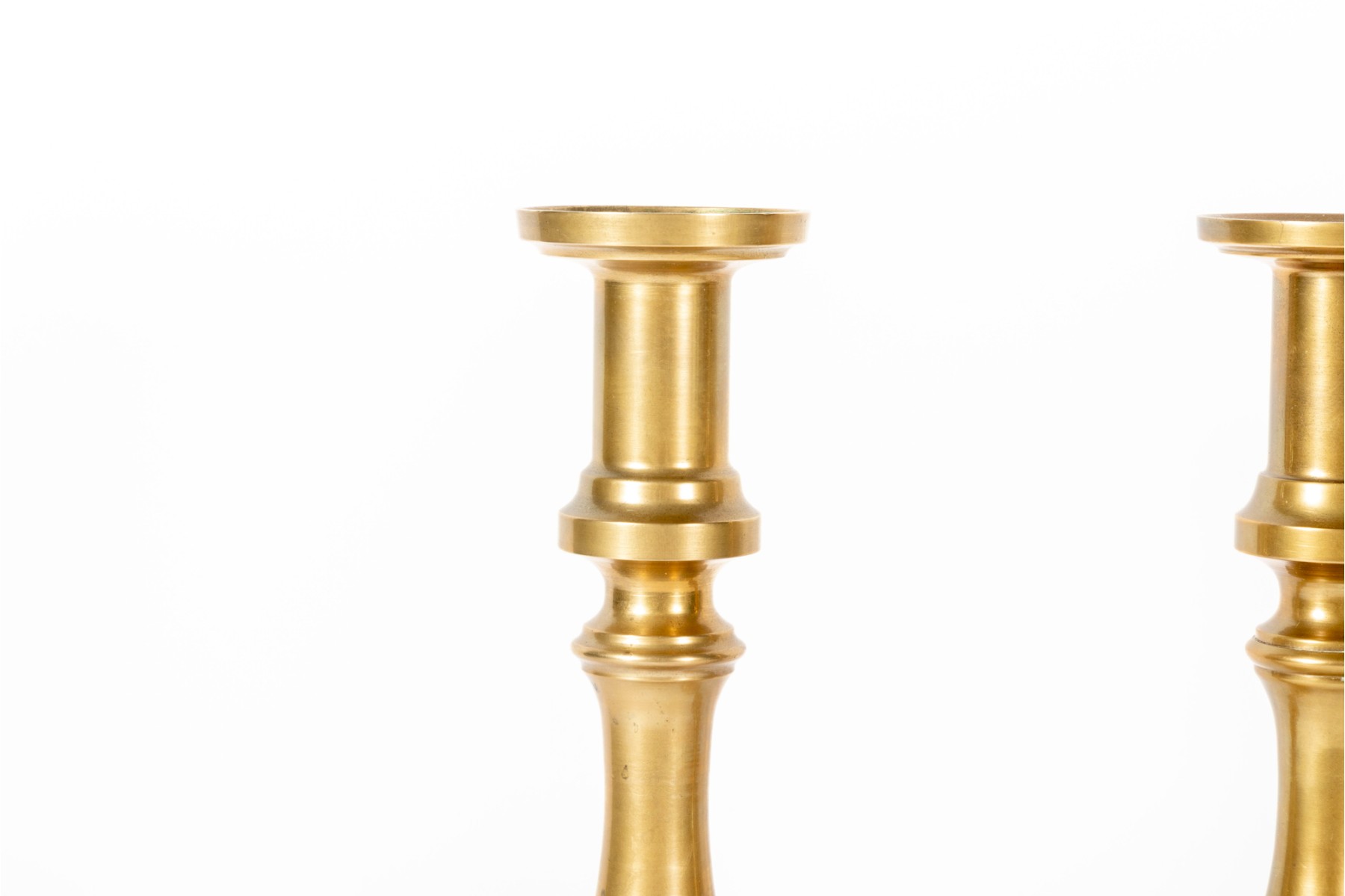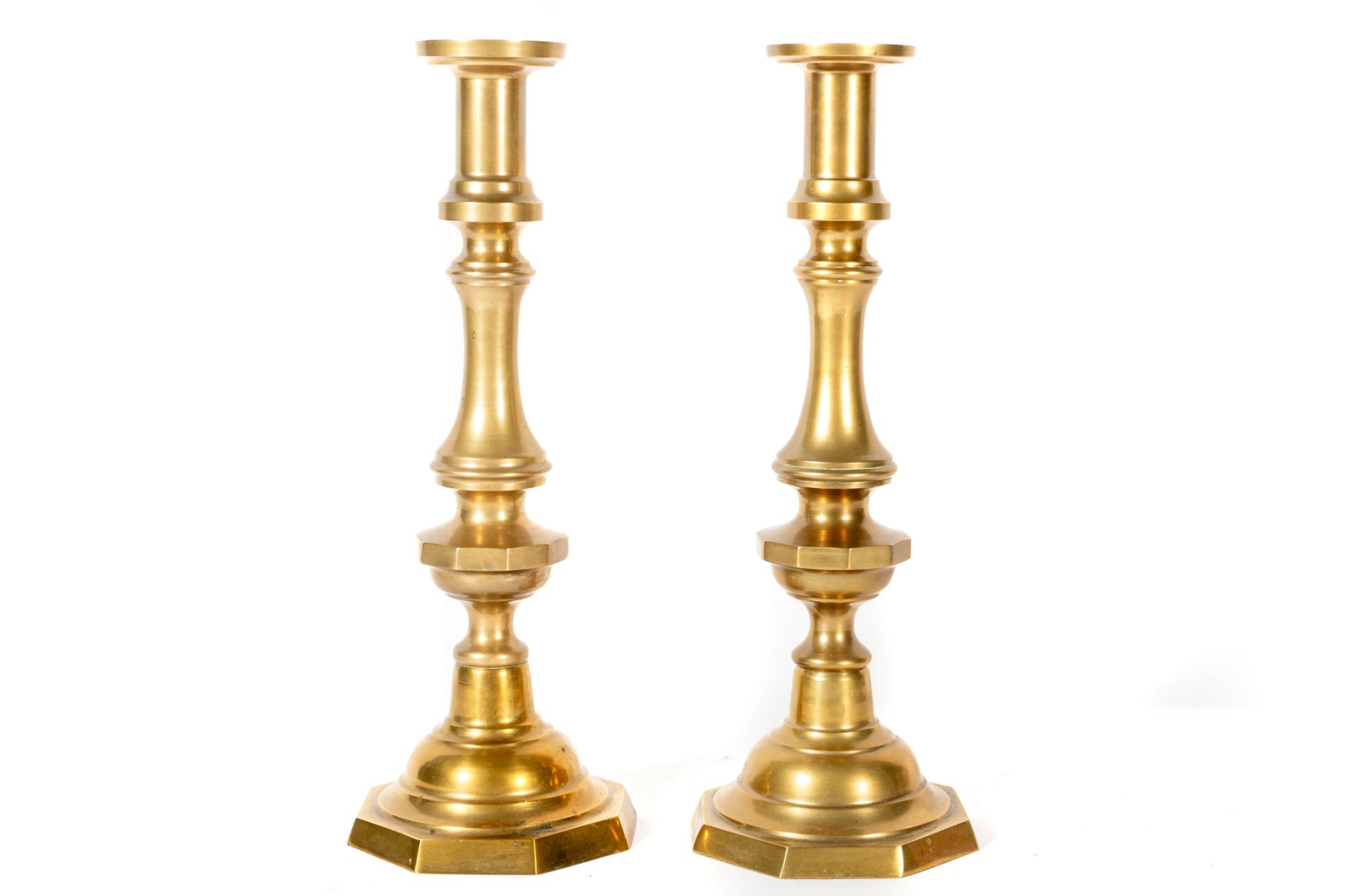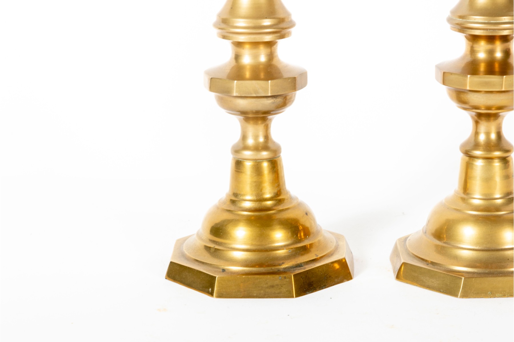 A pair of vintage baluster column cast- brass candestick holders supported on octagonal bases.
