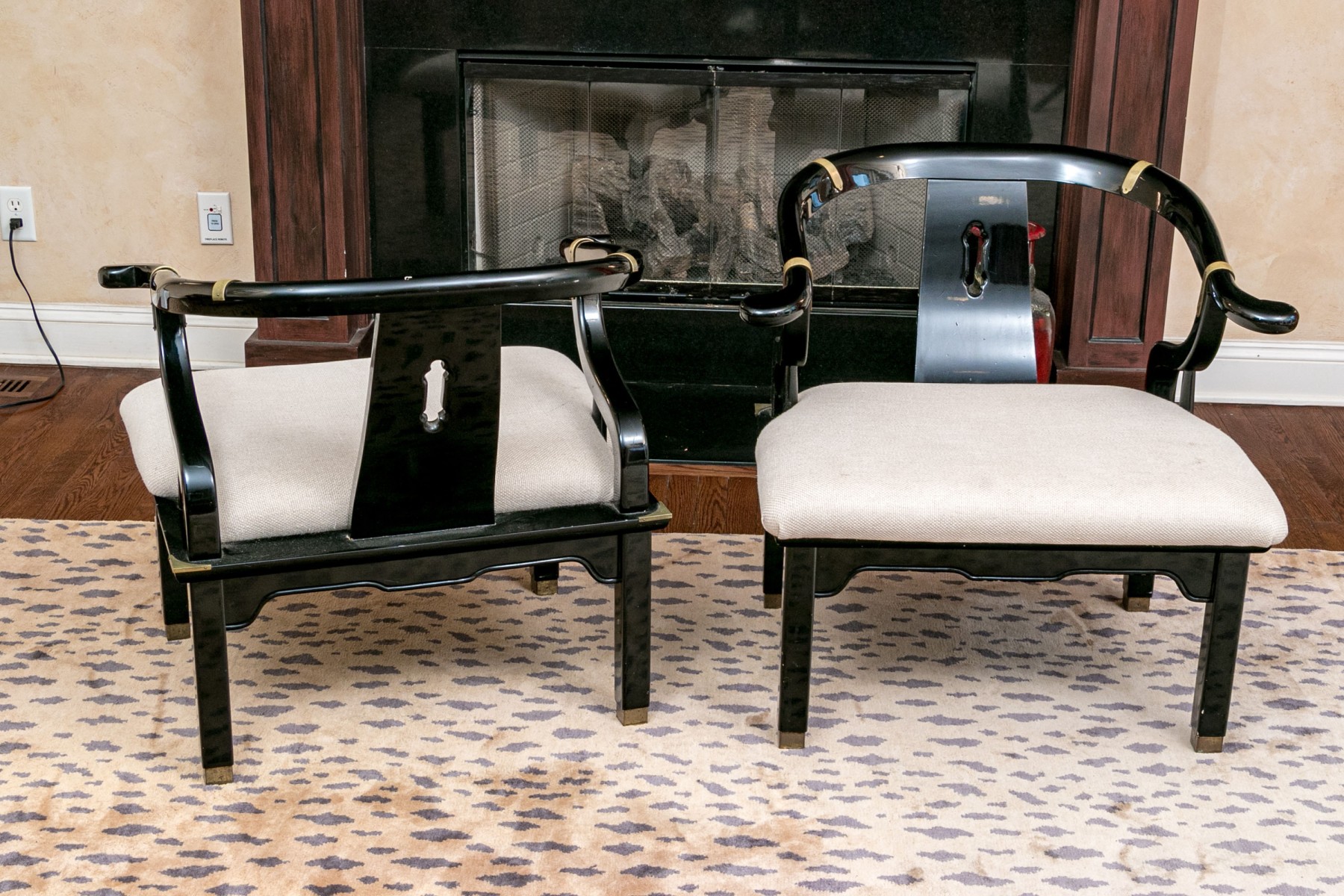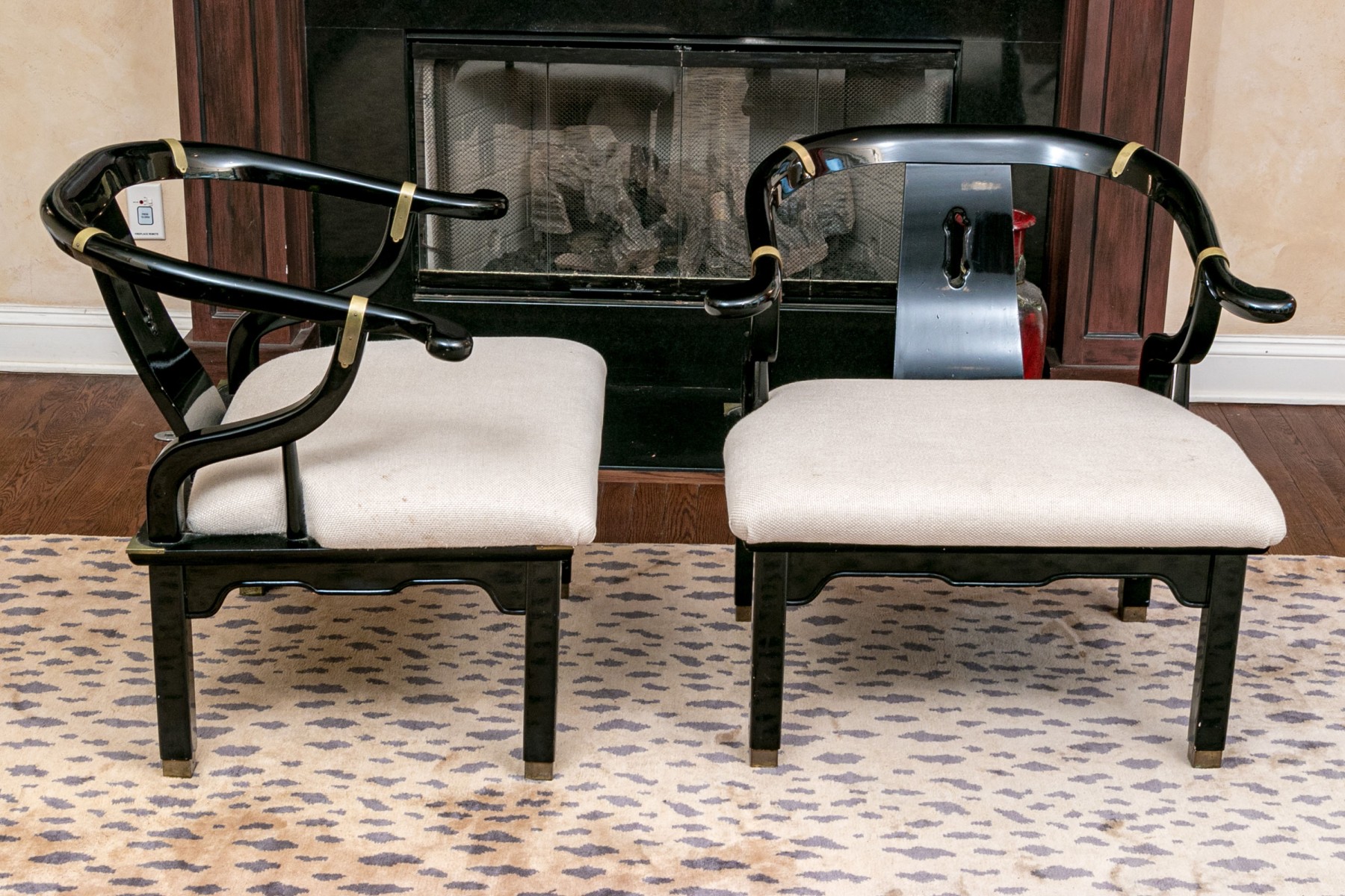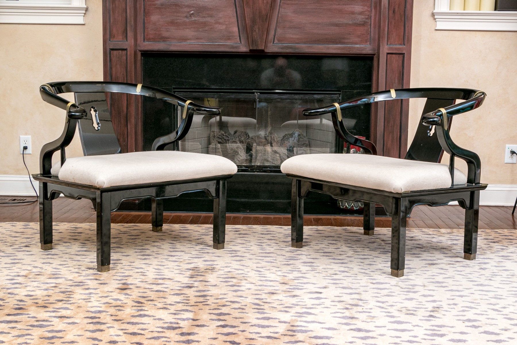 The curved frames in black lacquer with tub shaped backs, curved arms and shaped seat rails. Accented with brass bands, seat frame corners and feet. The seats upholstered in a textured pale fabric.