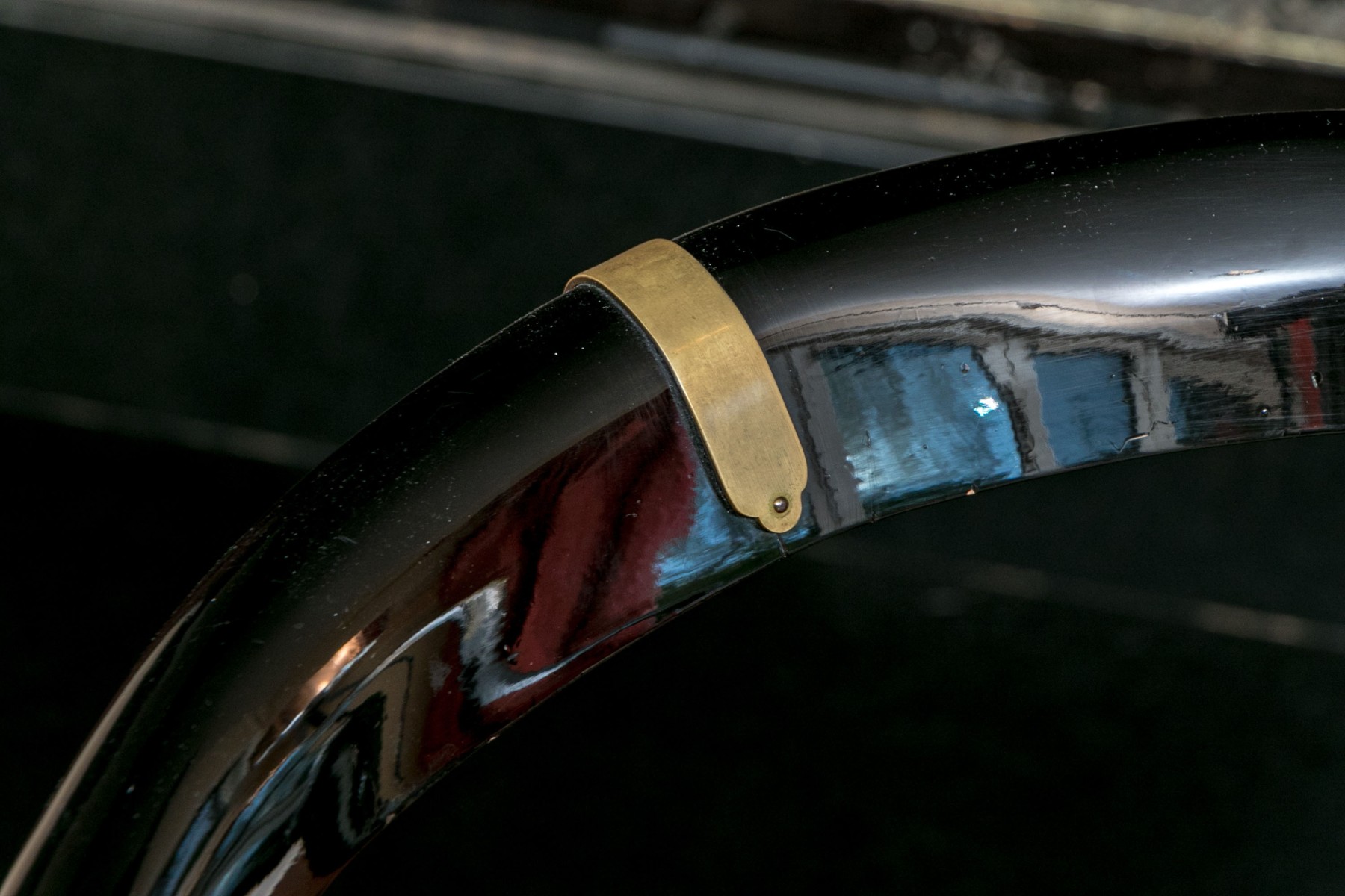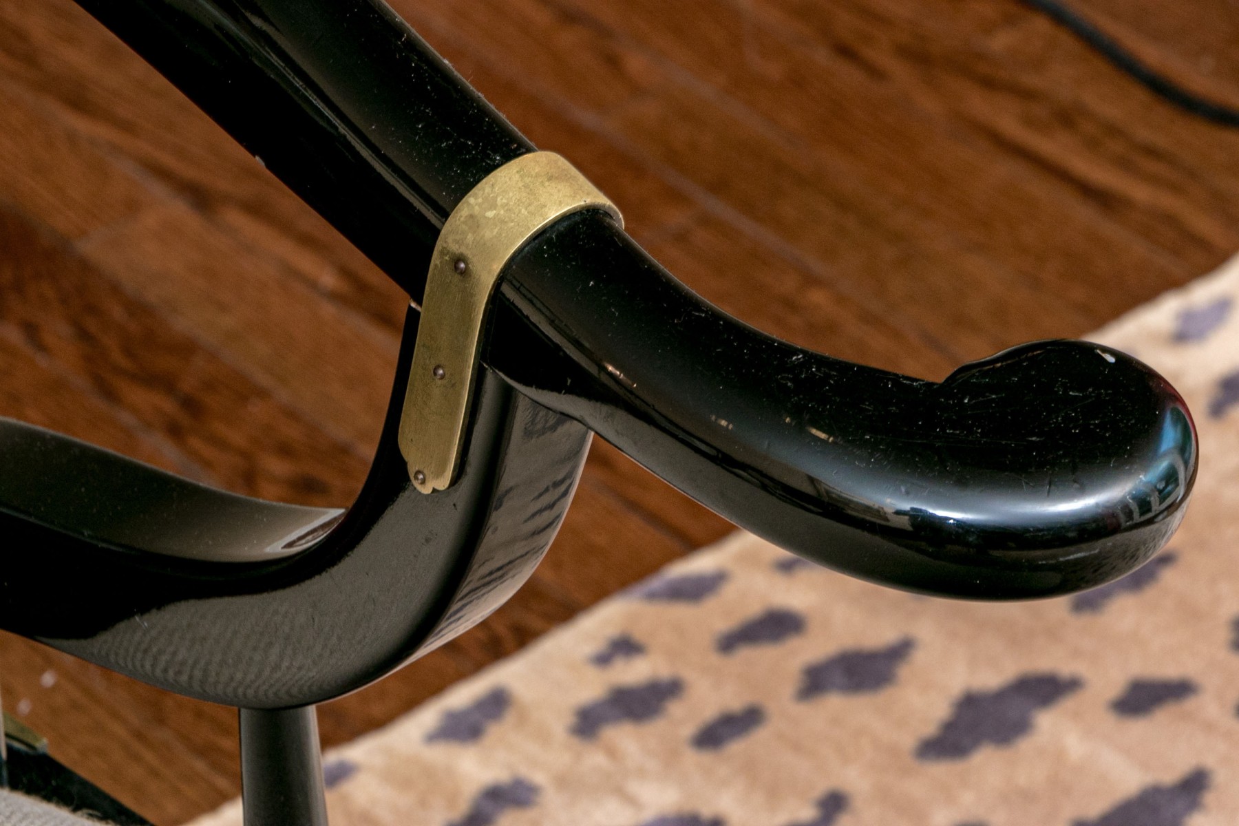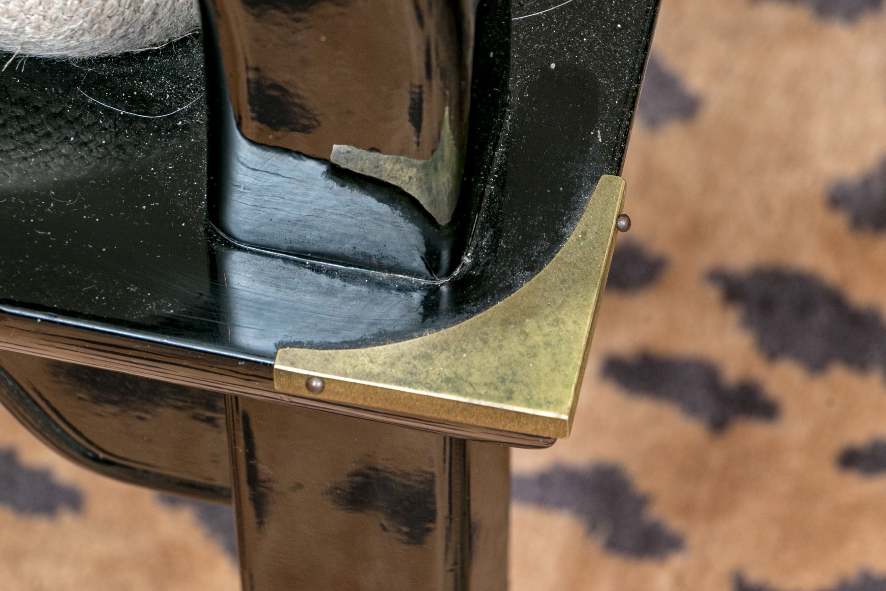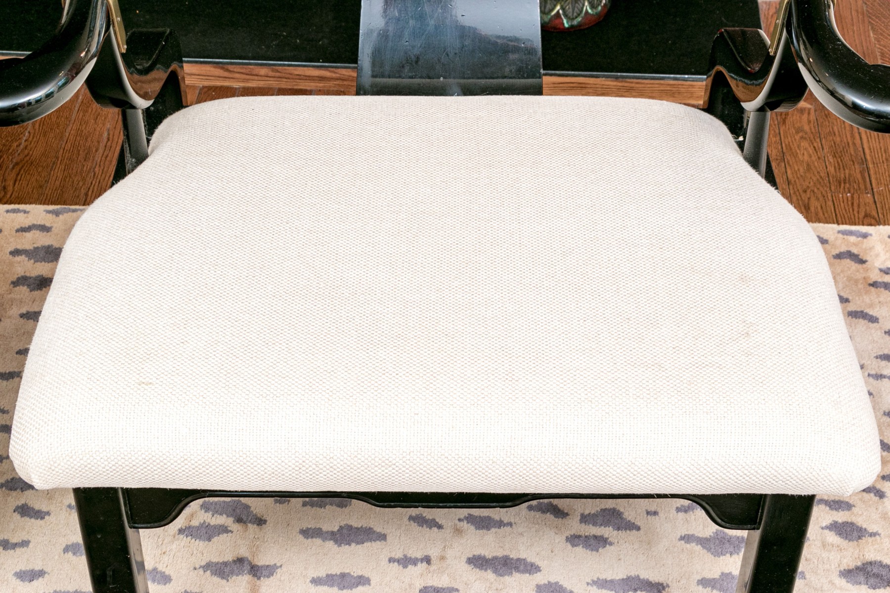 The curved frames in black lacquer with tub shaped backs, curved arms and shaped seat rails. Accented with brass bands, seat frame corners and feet. The seats upholstered in a textured pale fabric.