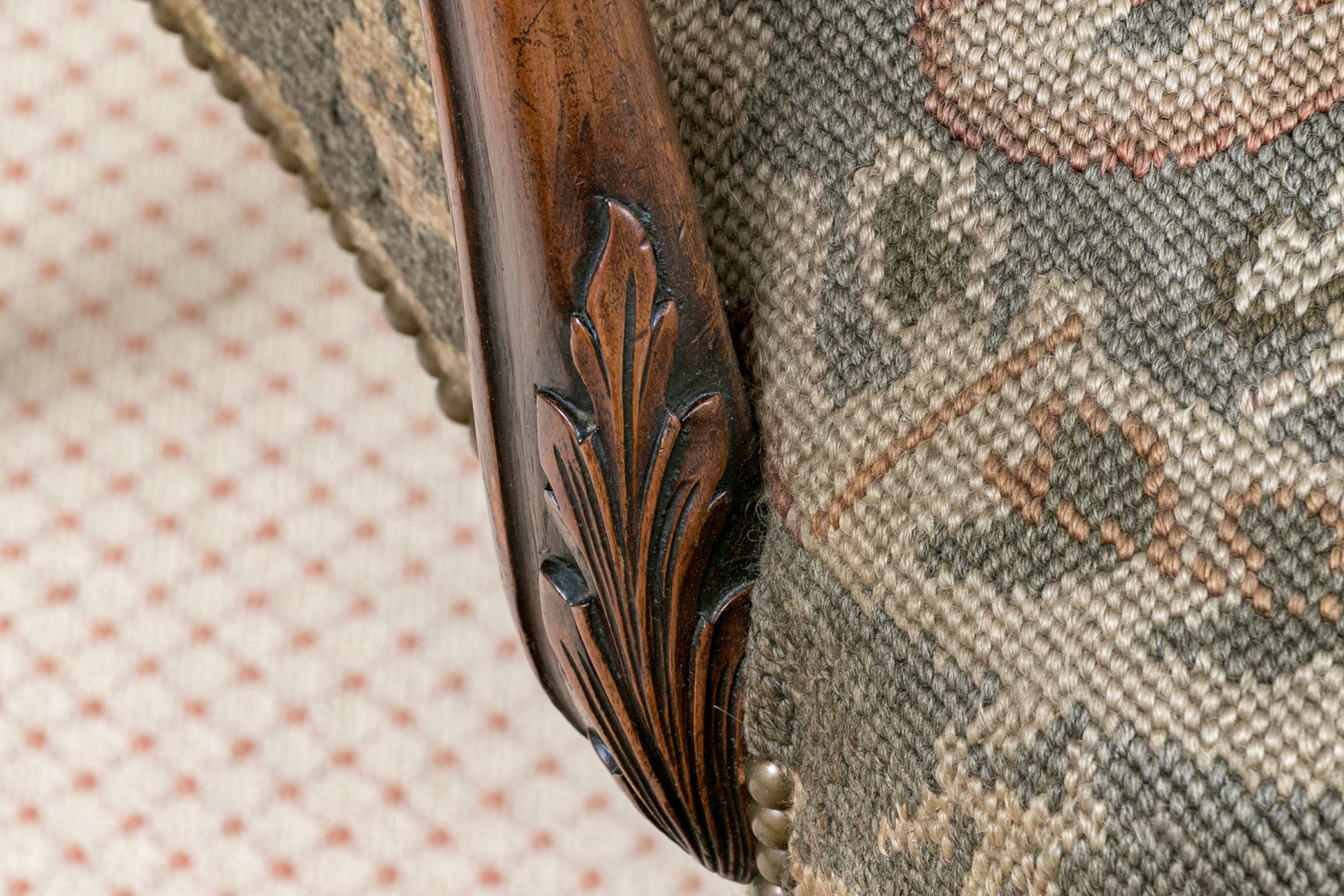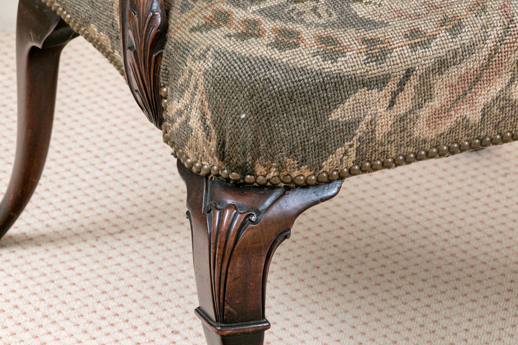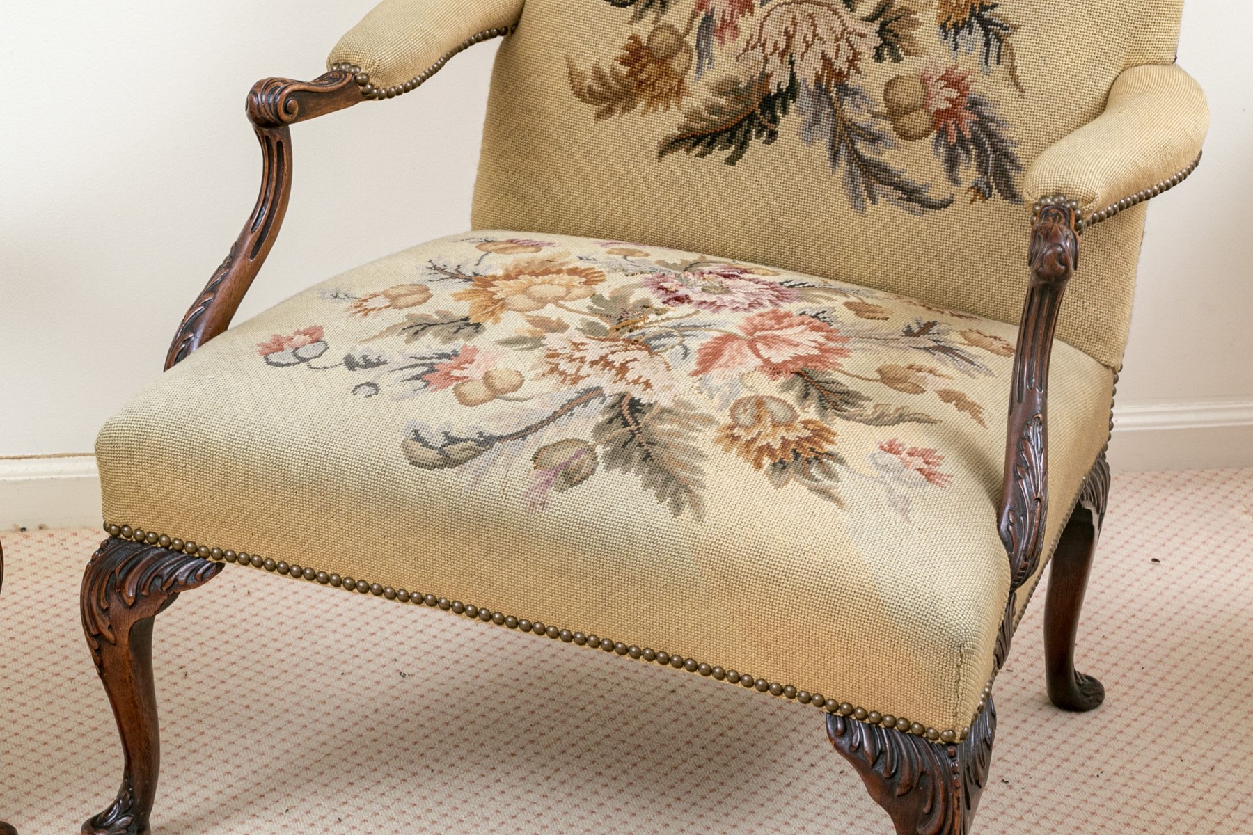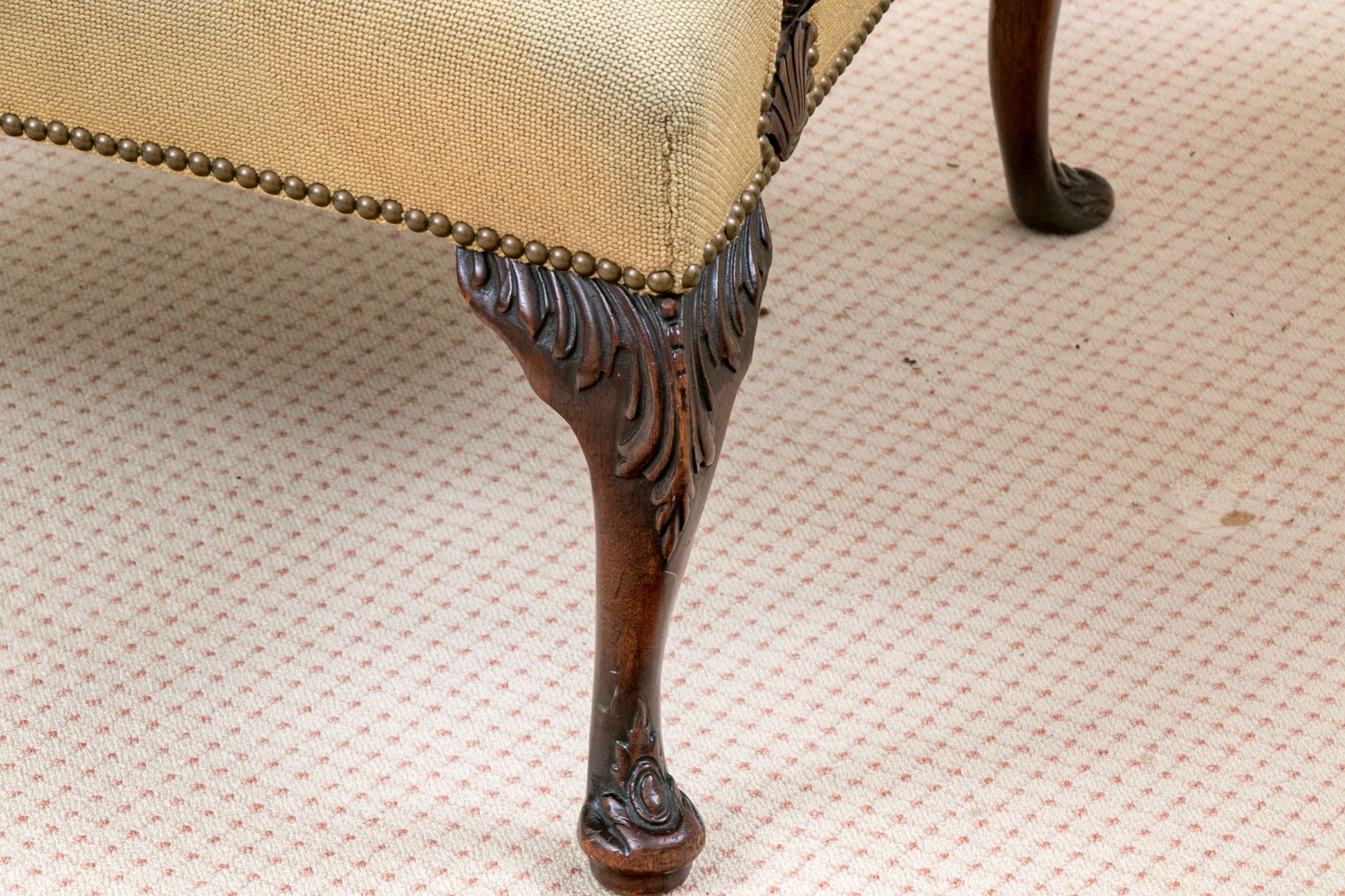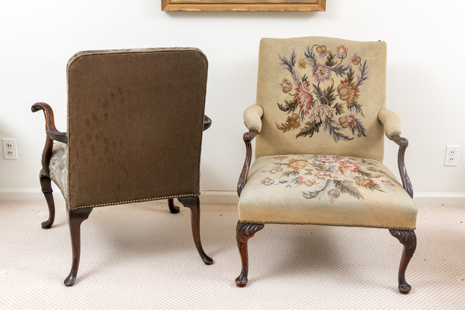 A delightful pair of Chippendale-style chairs adorned with intricate carving and featuring elegant needlepoint upholstery. These chairs are finished with a touch of sophistication, showcasing brass nail tack trim
