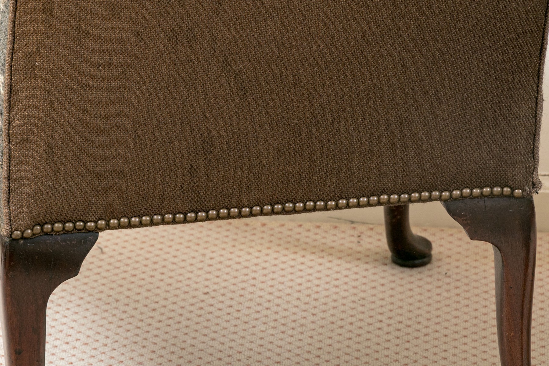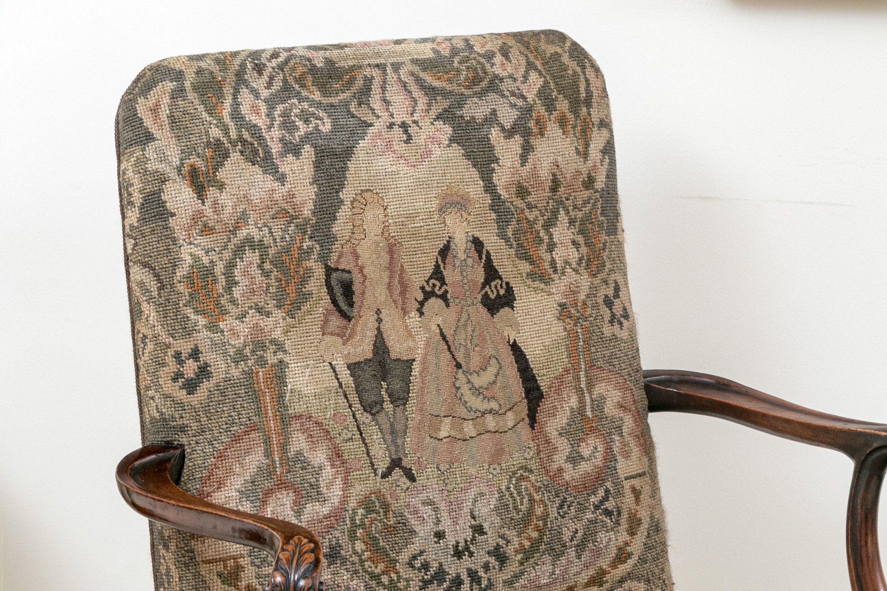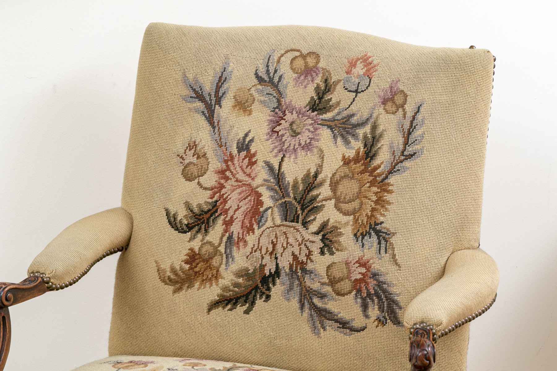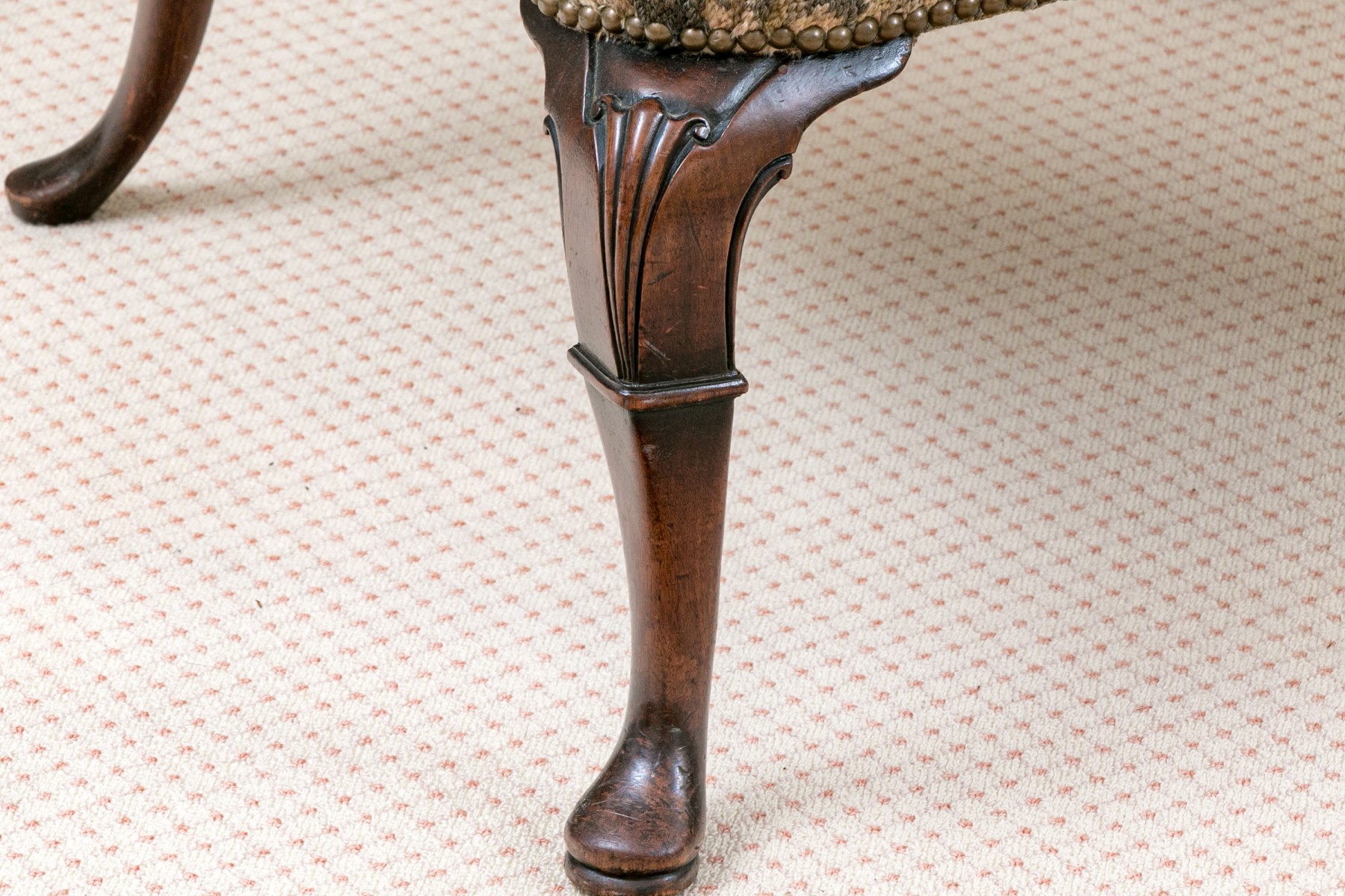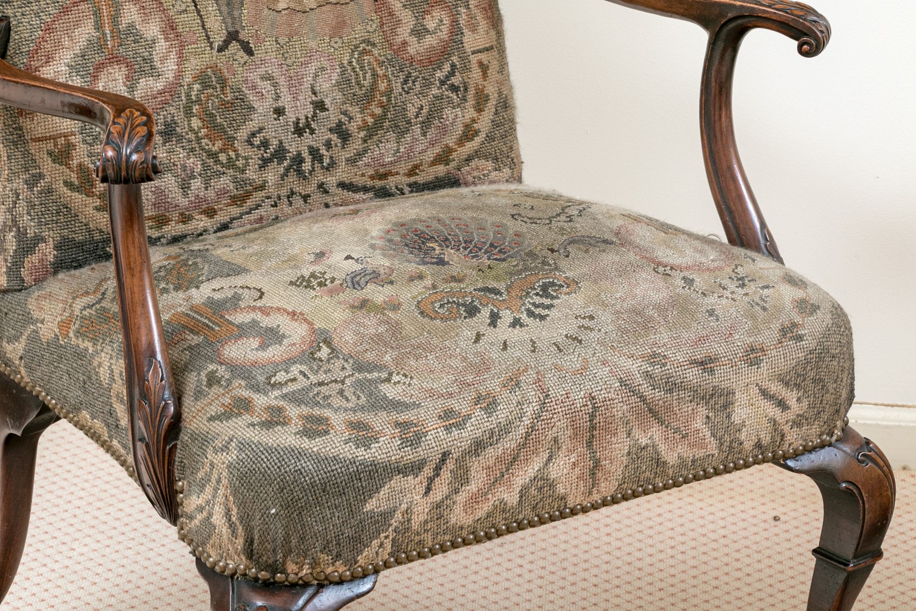 A delightful pair of Chippendale-style chairs adorned with intricate carving and featuring elegant needlepoint upholstery. These chairs are finished with a touch of sophistication, showcasing brass nail tack trim