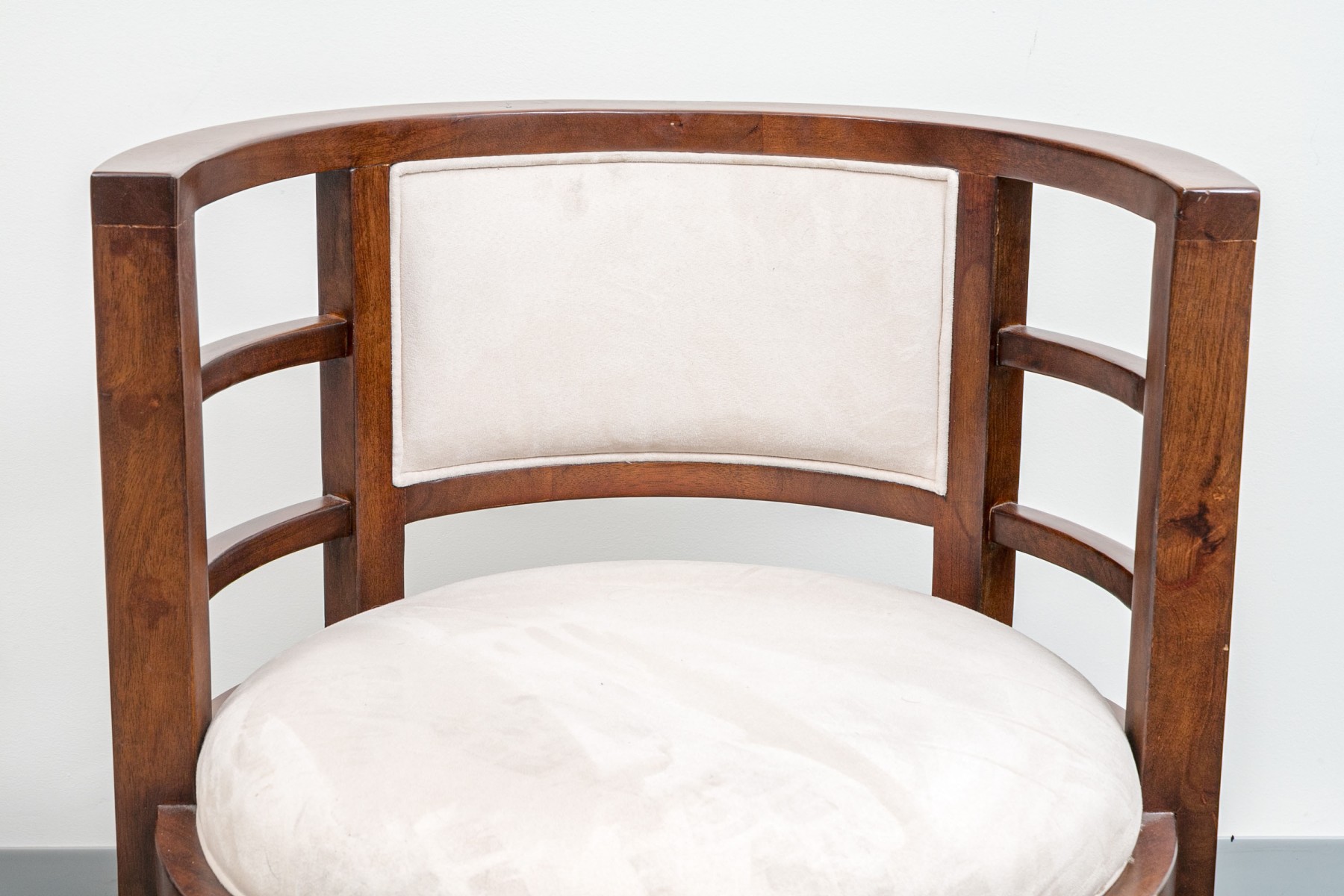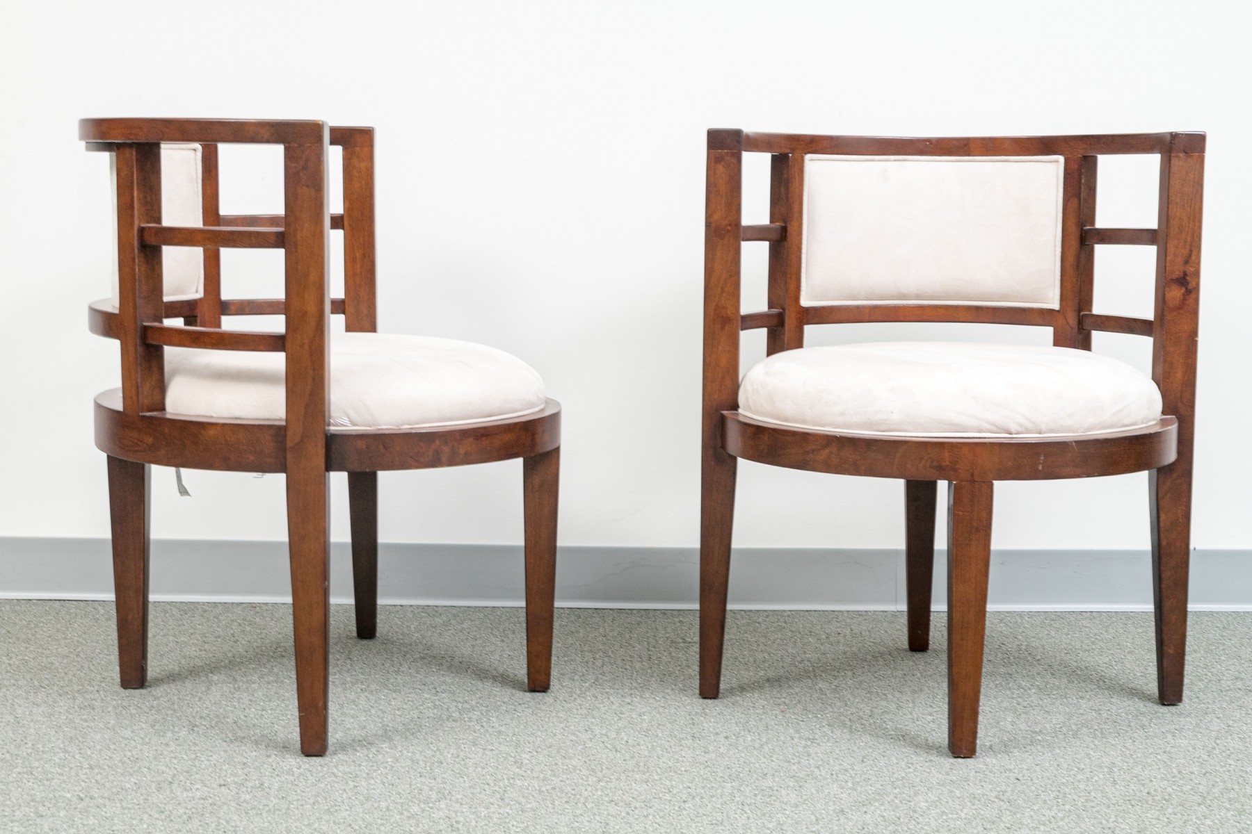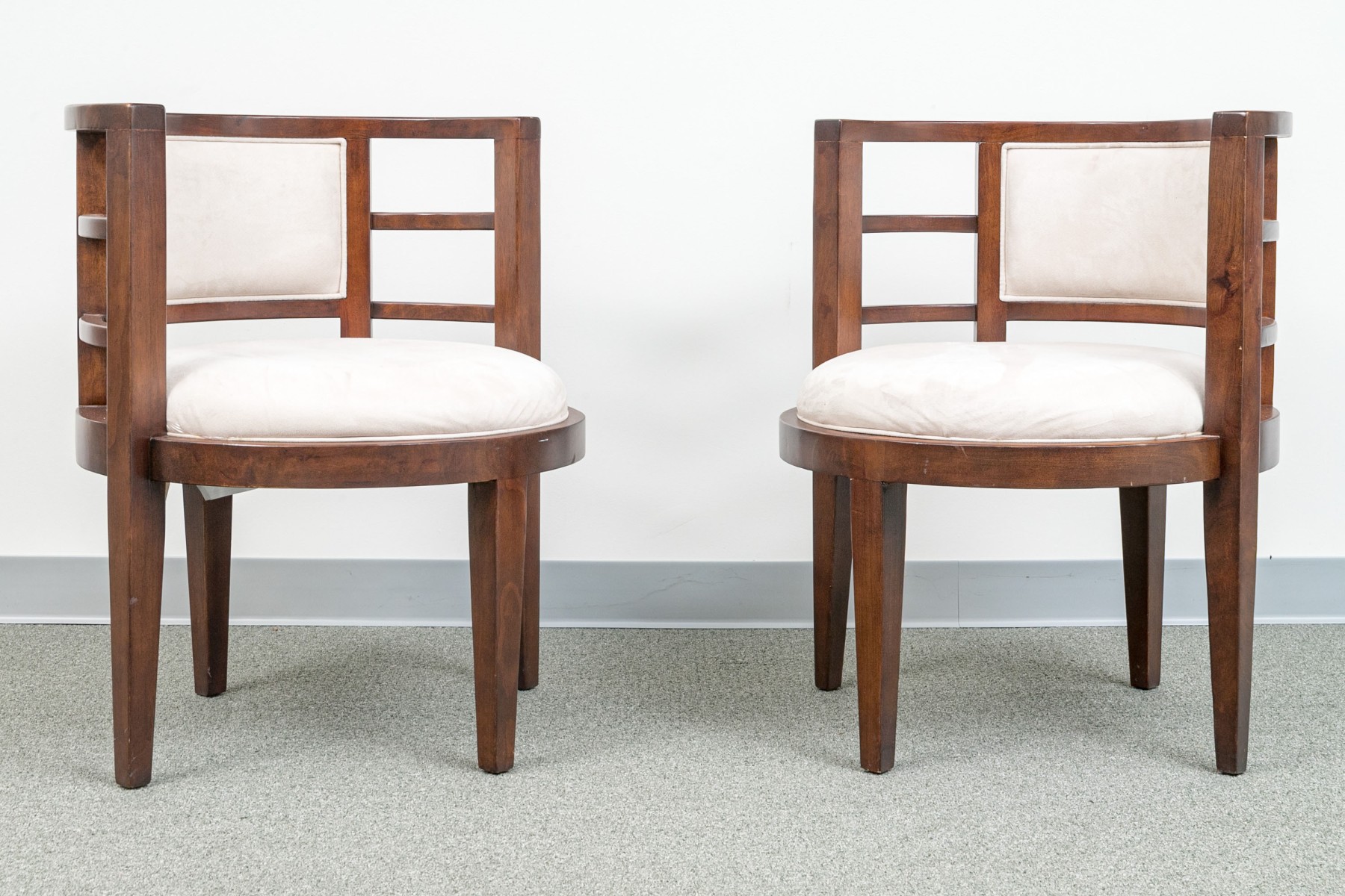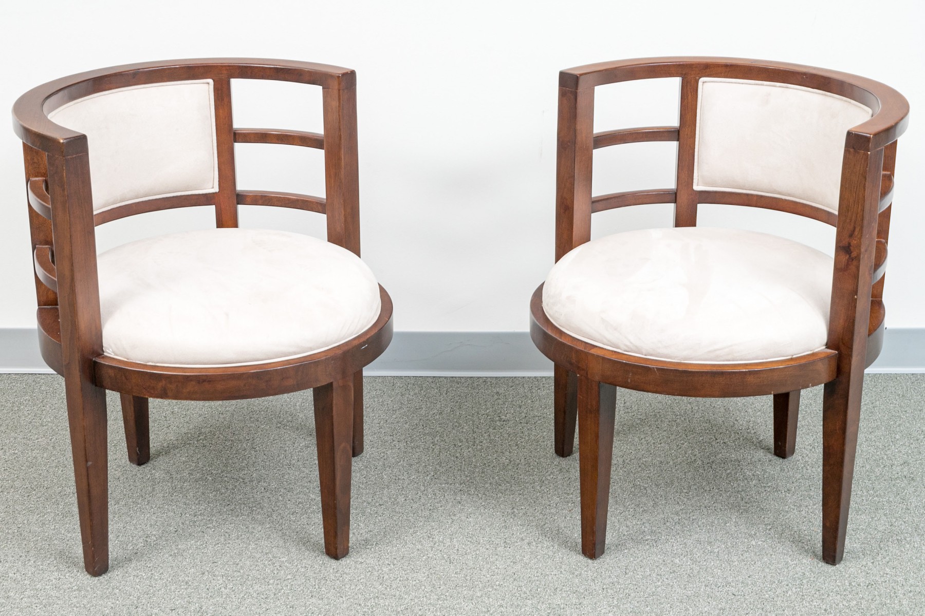 Deco style fine wood framed tub form armchairs with slat constructed sides and round seats. Raised on square tapering legs. Upholstered in an ecru faux suede.