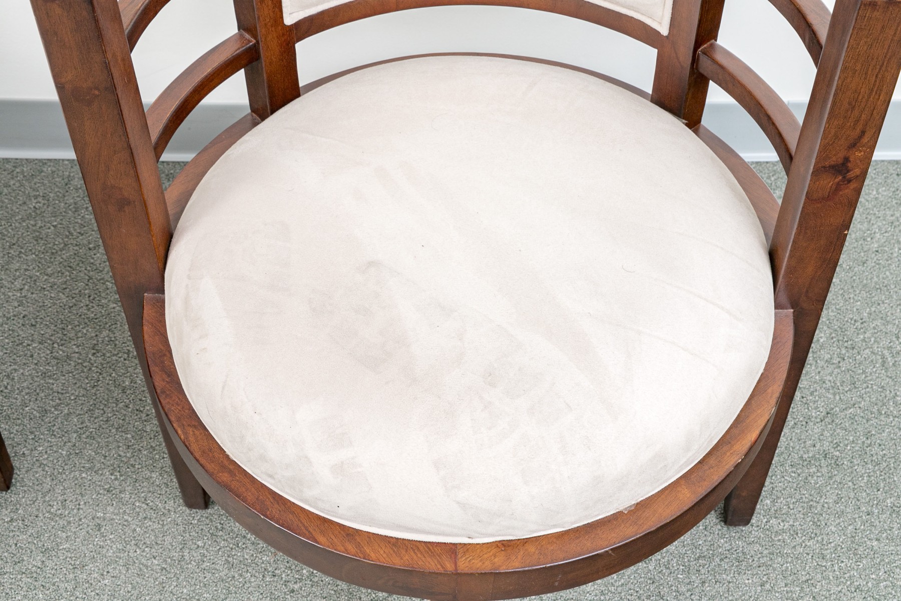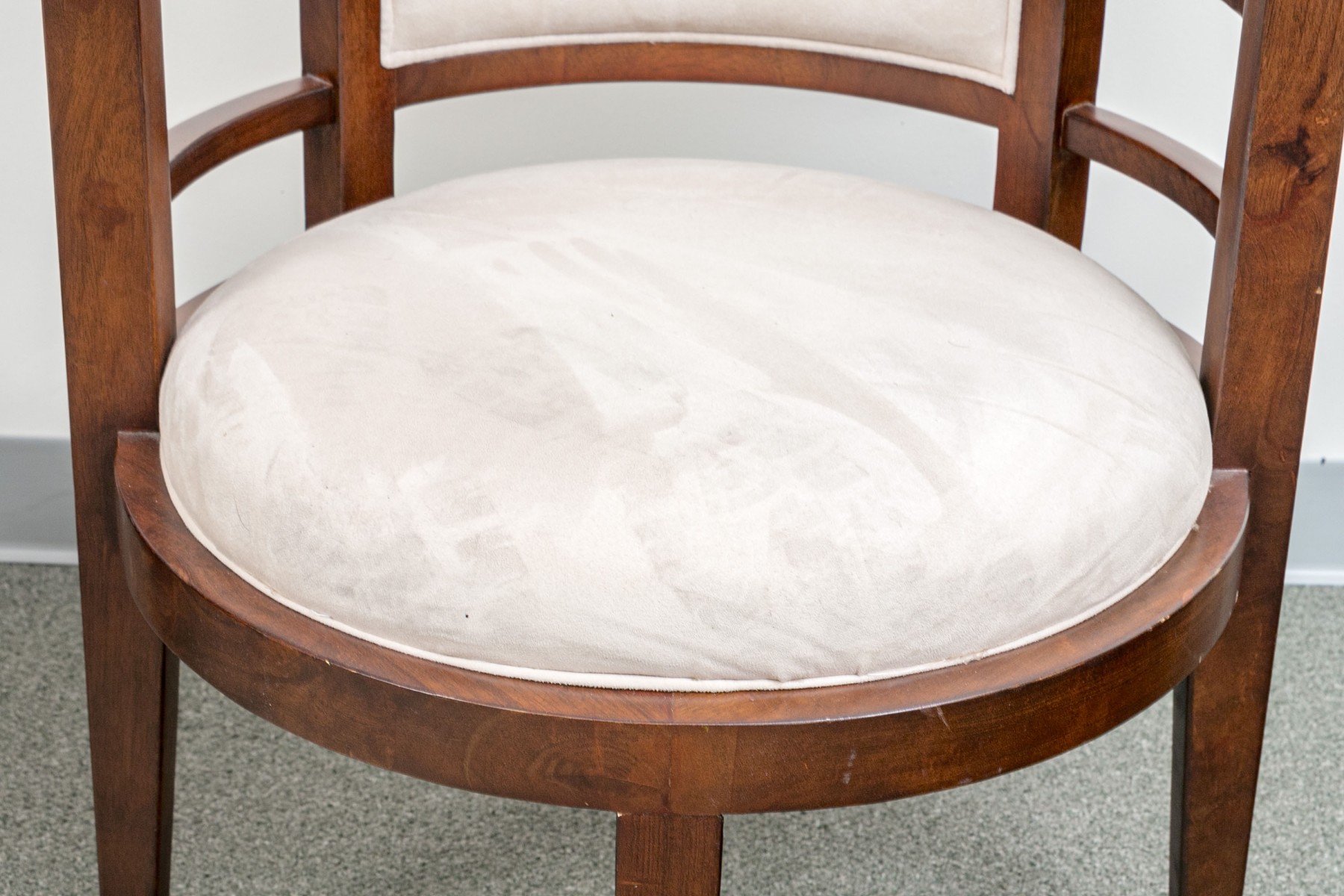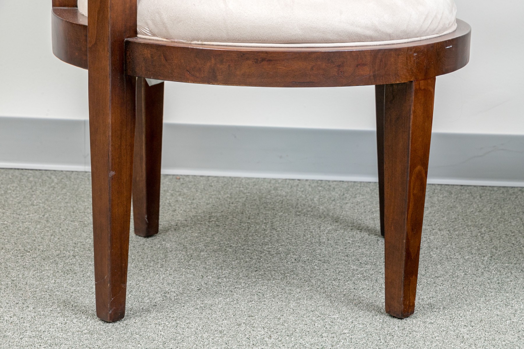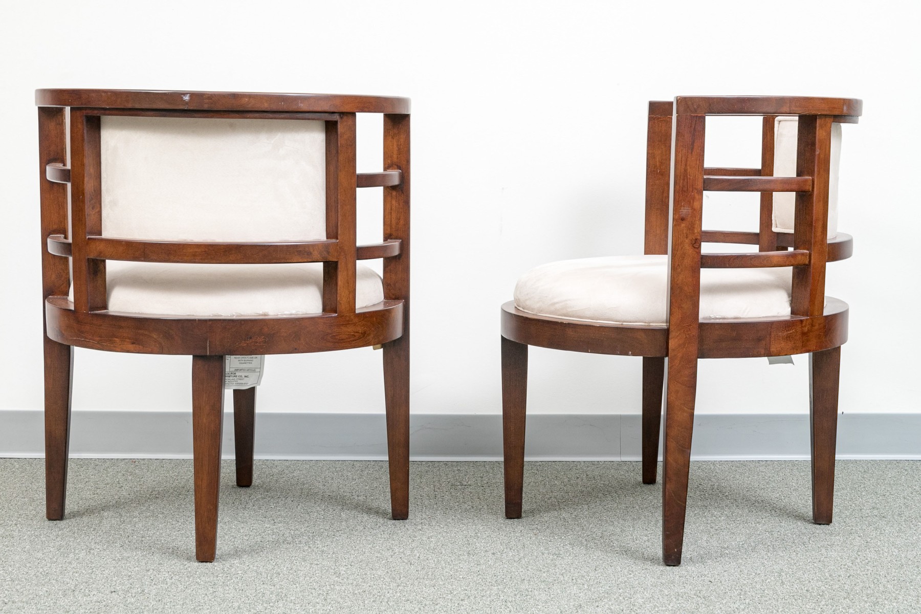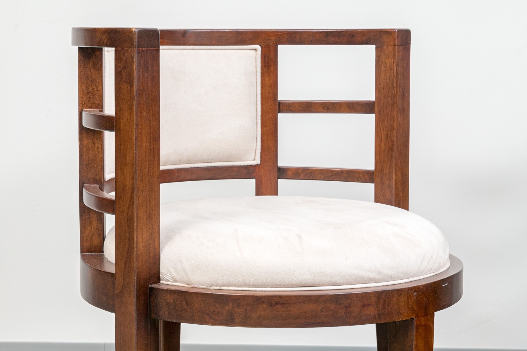 Deco style fine wood framed tub form armchairs with slat constructed sides and round seats. Raised on square tapering legs. Upholstered in an ecru faux suede.