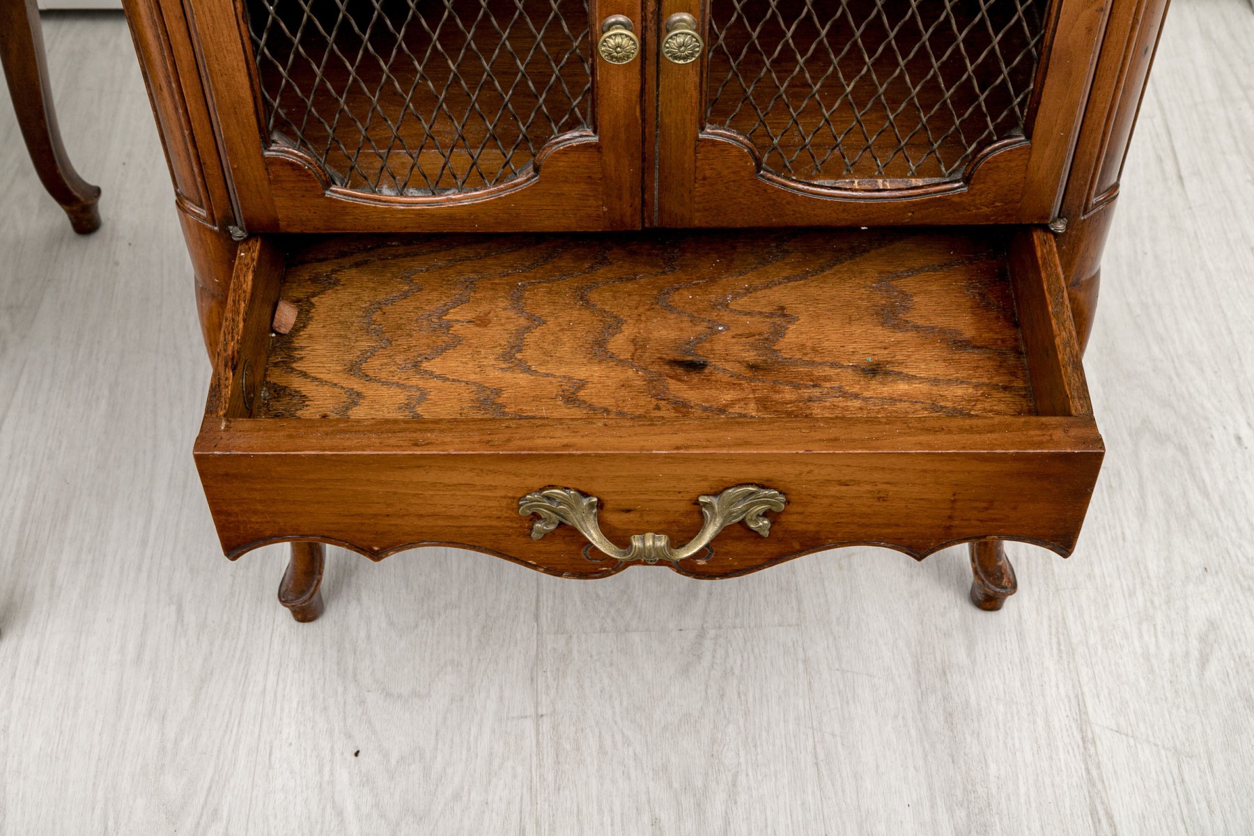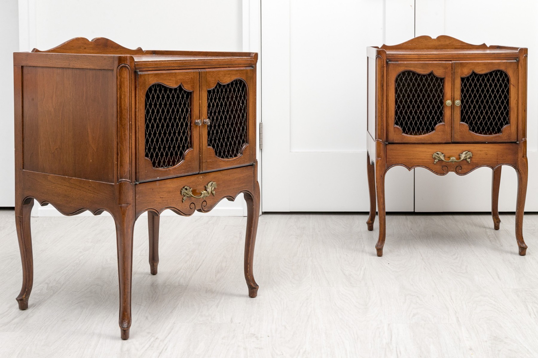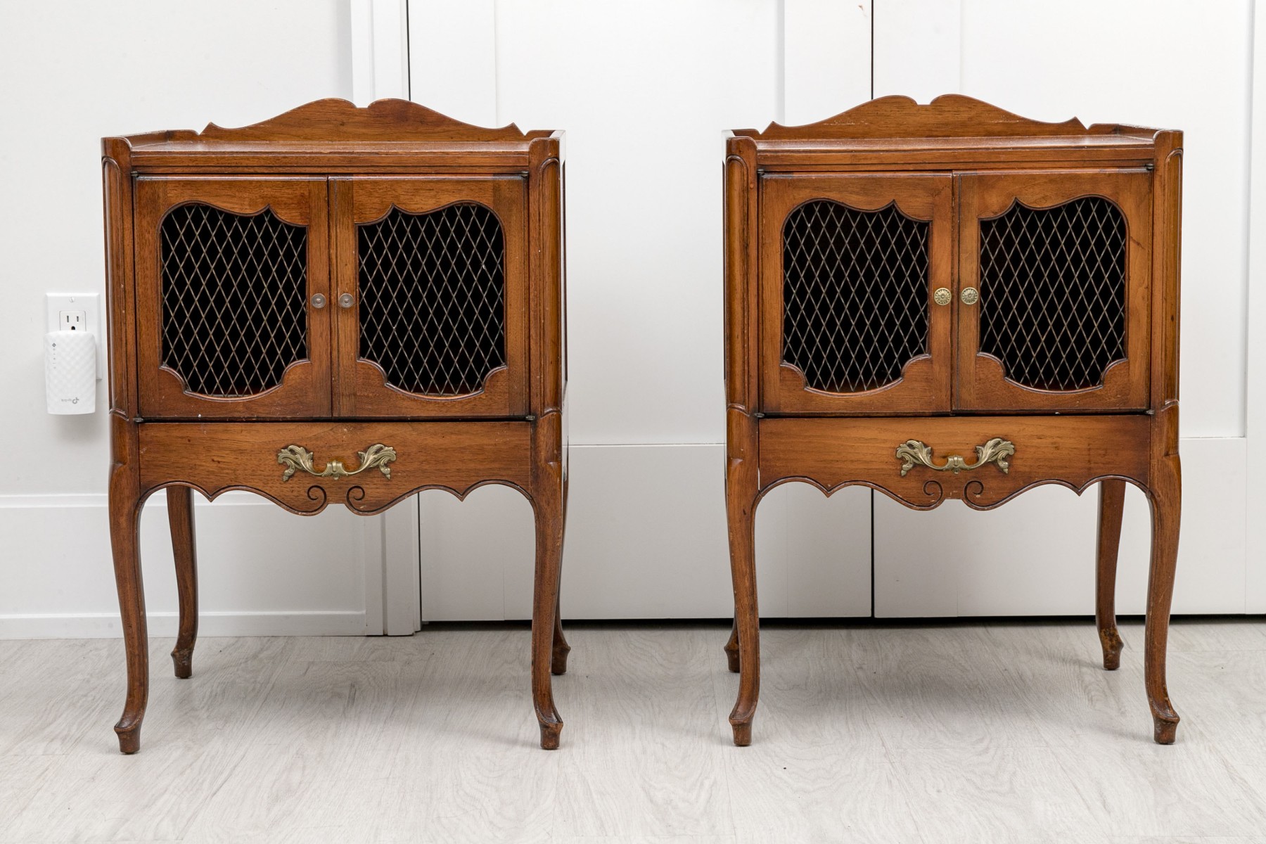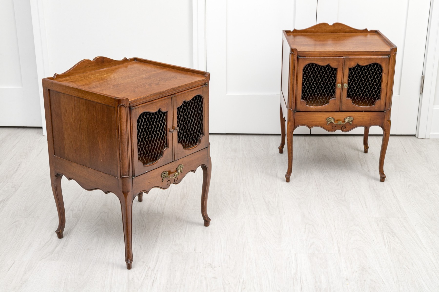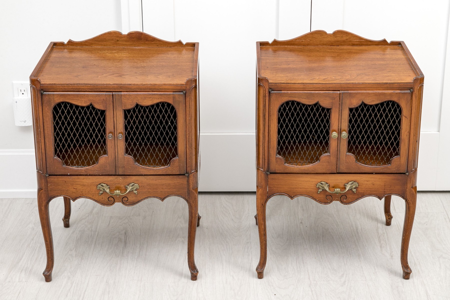 Fruit wood French country style night stands with a shaped gallery on top over double grille work doors. With a lower drawer. Raised on cabriole legs.