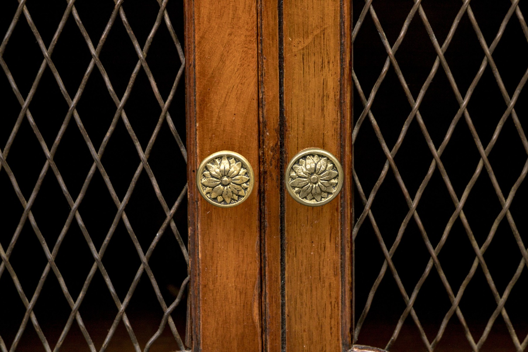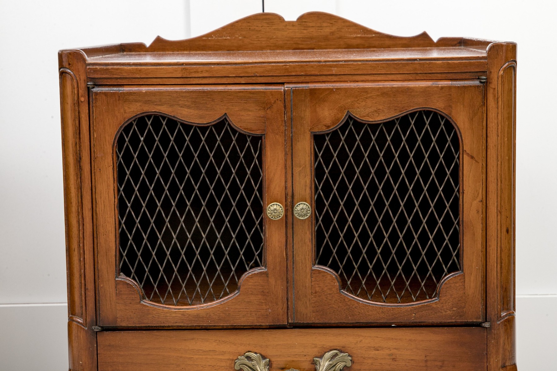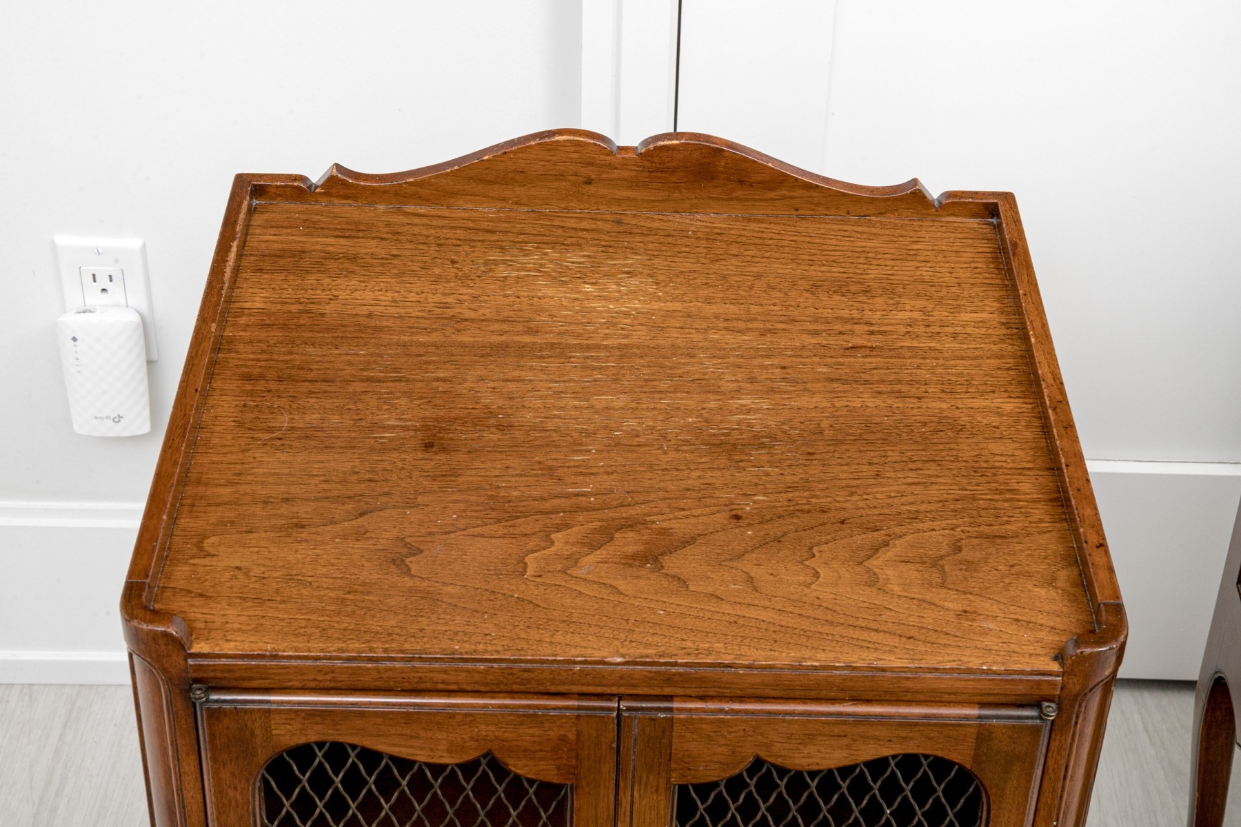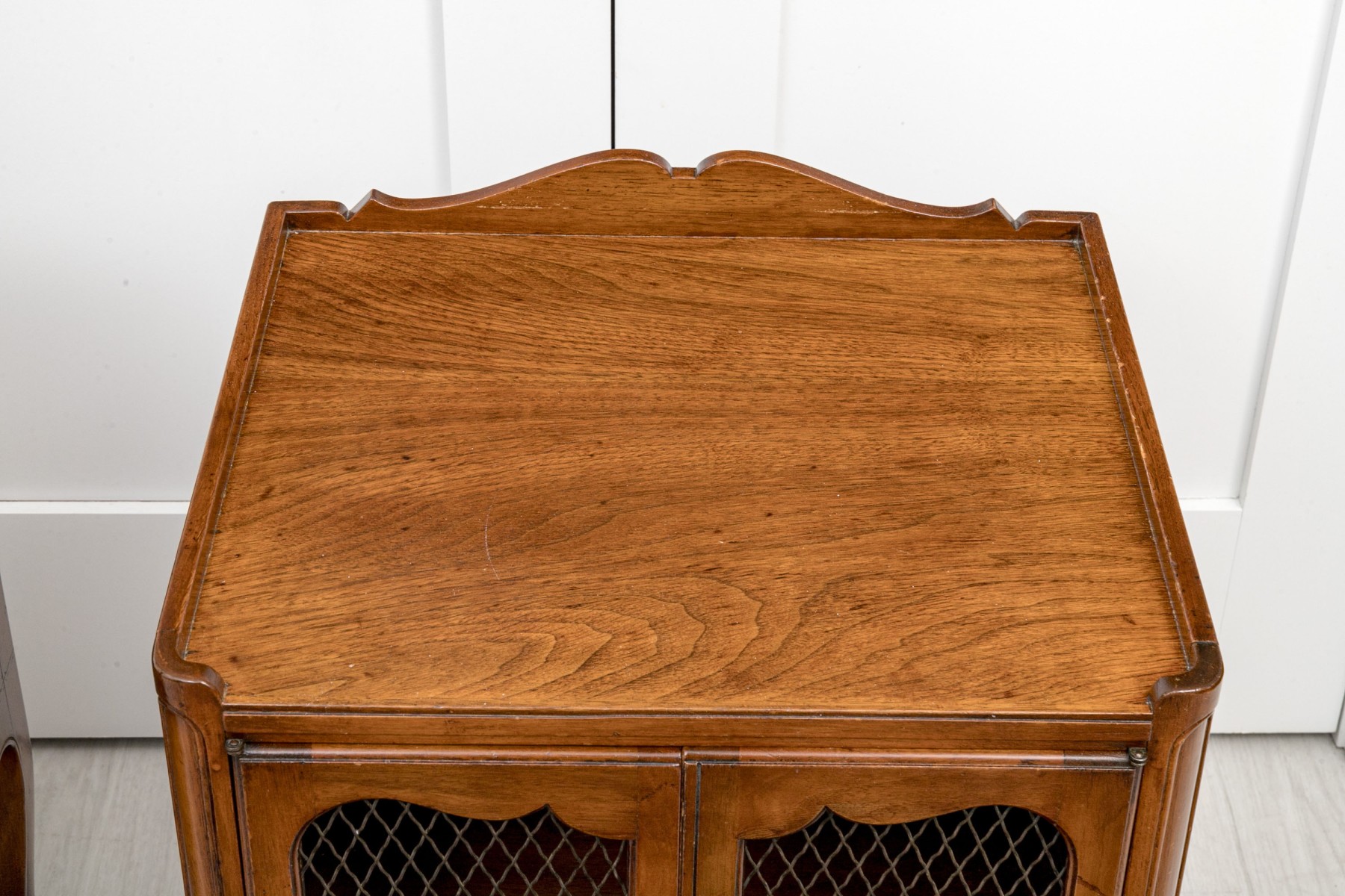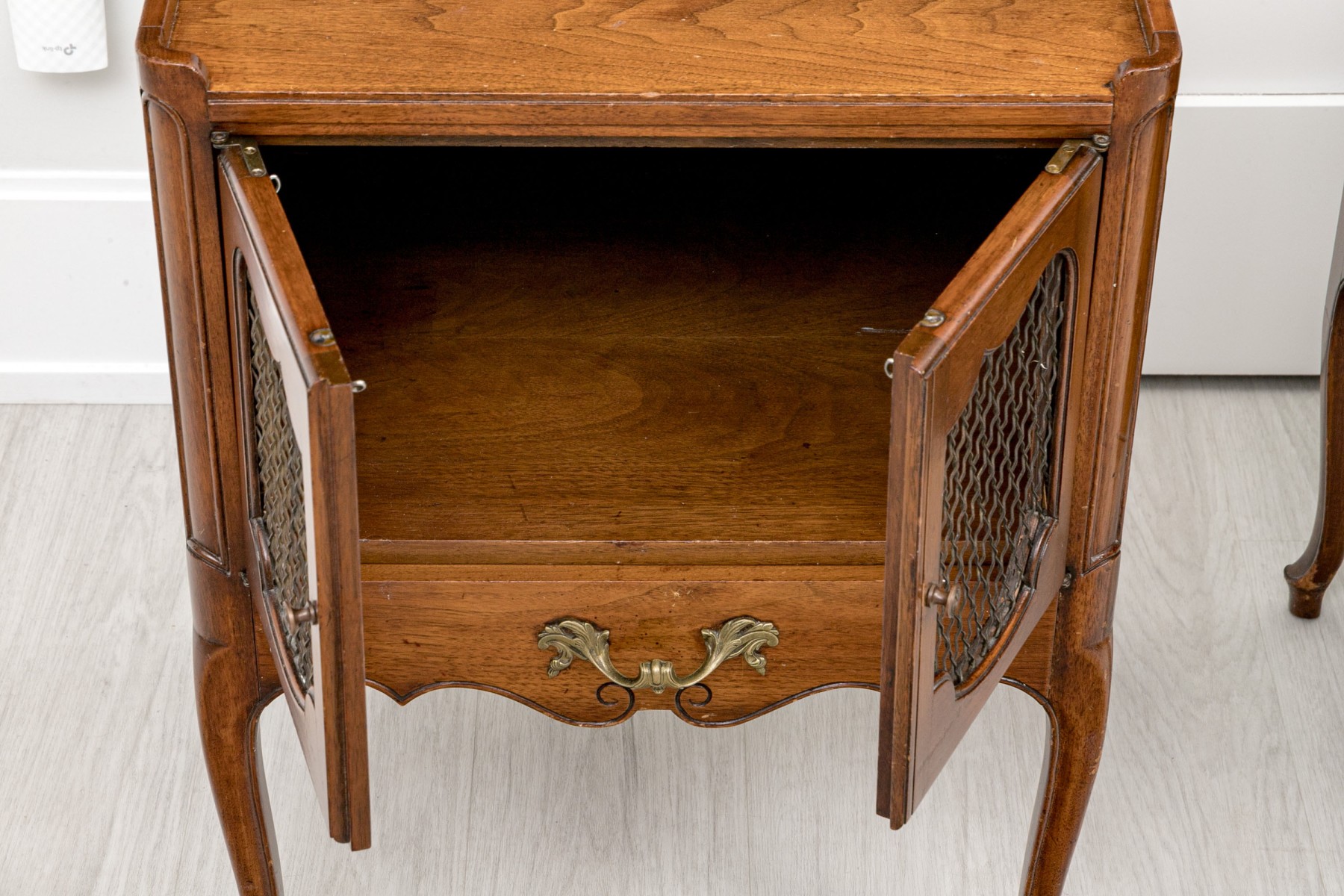 Fruit wood French country style night stands with a shaped gallery on top over double grille work doors. With a lower drawer. Raised on cabriole legs.