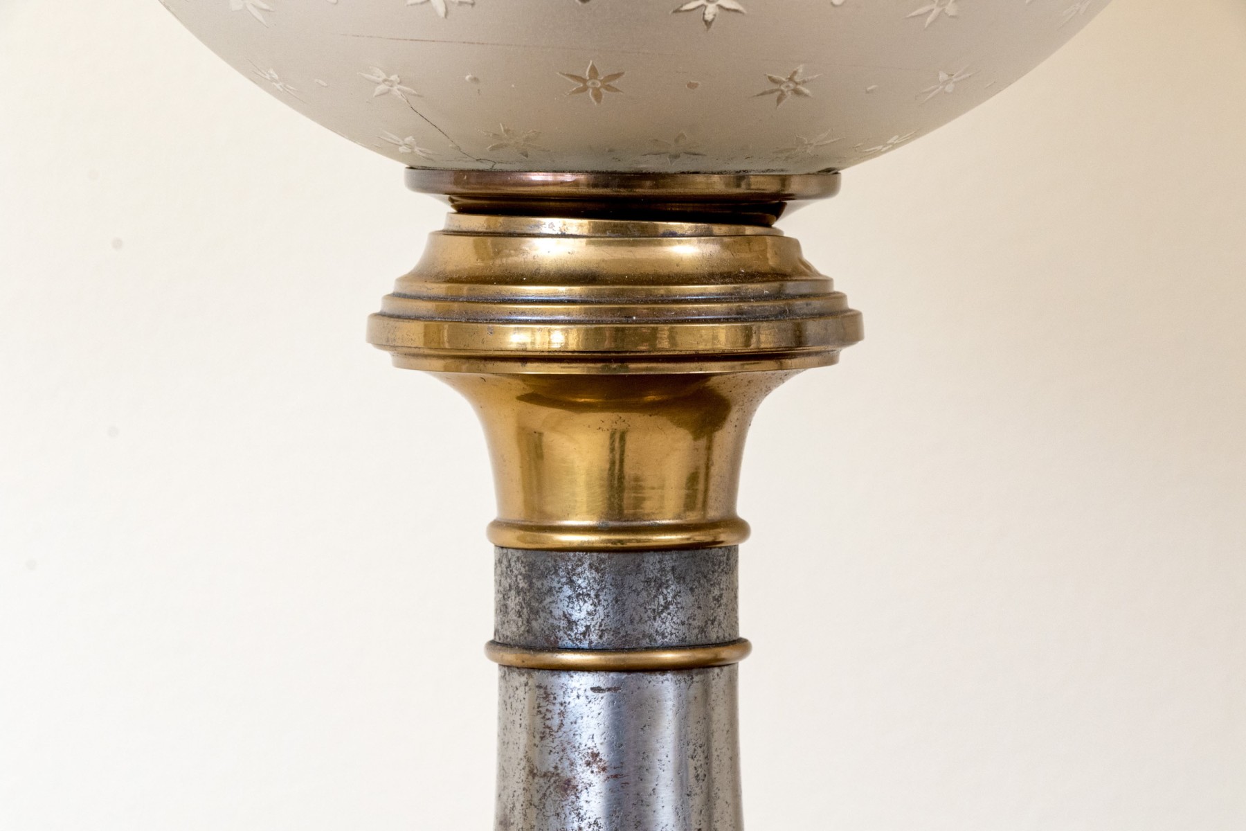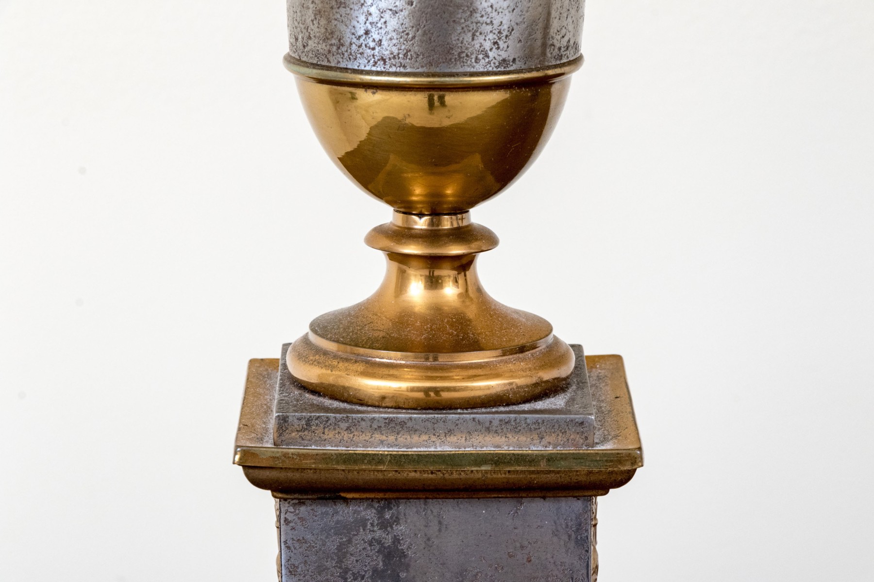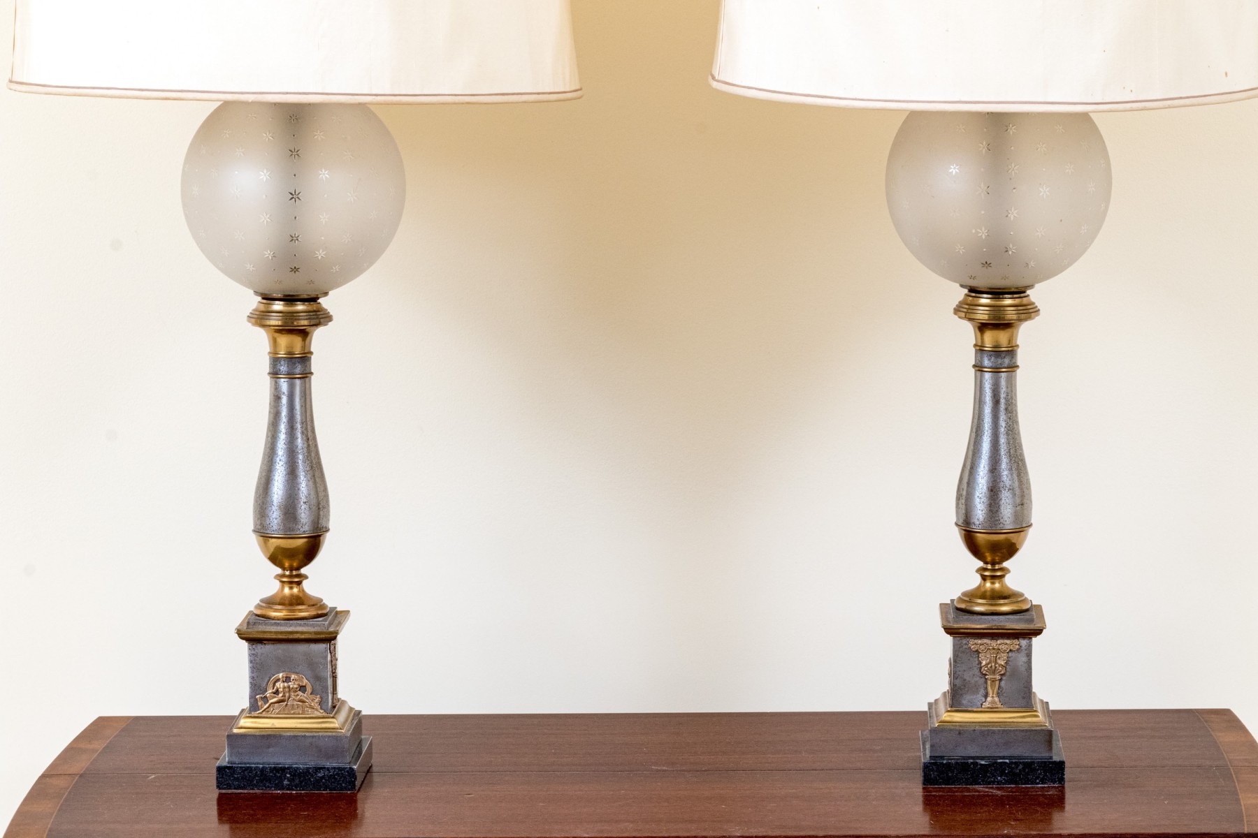 The tall lamps with frosted glass globes decorated with clear stars below the twin lights. Mounted on attractive golden tone and gray speckled metal supports. Baluster form gray supports with golden tone capitals and bases, mounted on tiered pedestals. Two sides with neoclassical appliques of couples and two sides with tall vases of flowers. The whole mounted on marble bases.