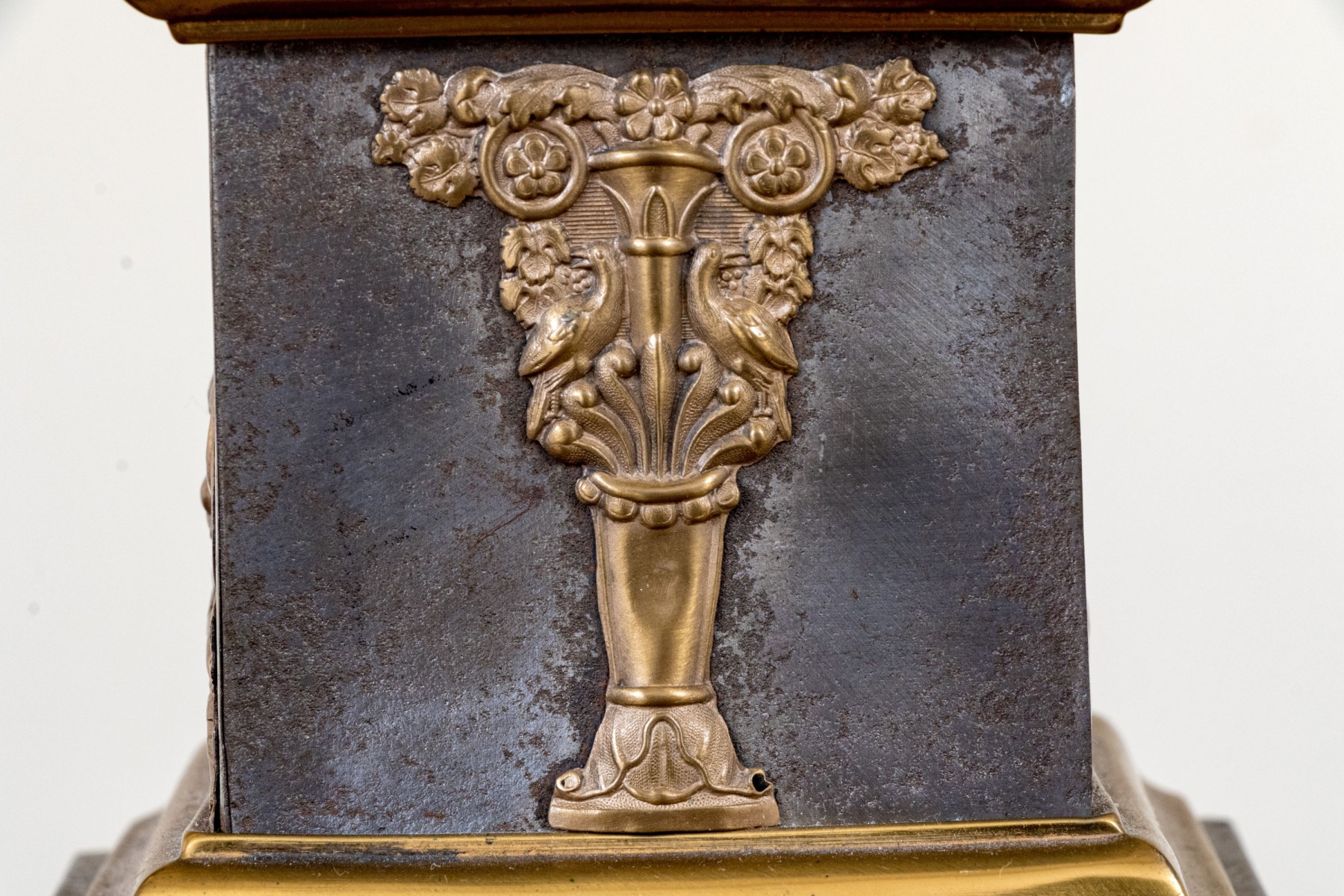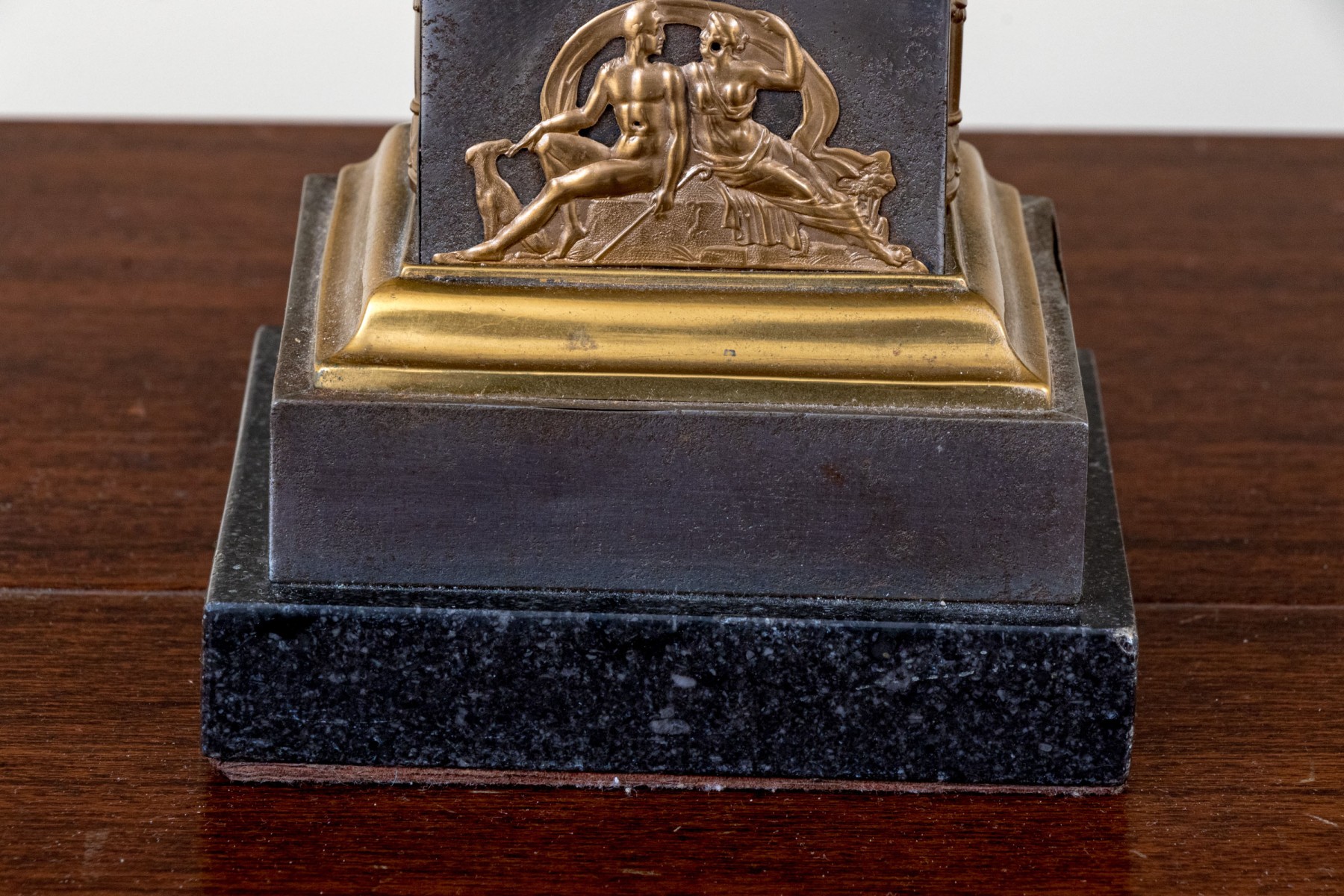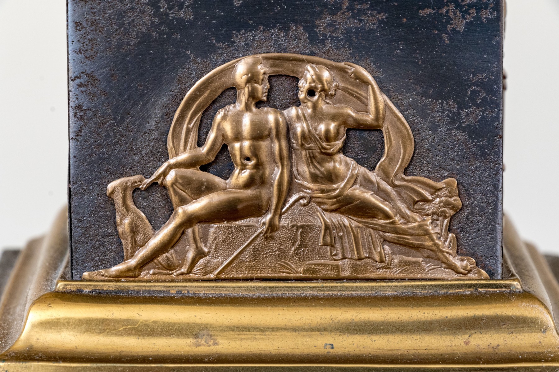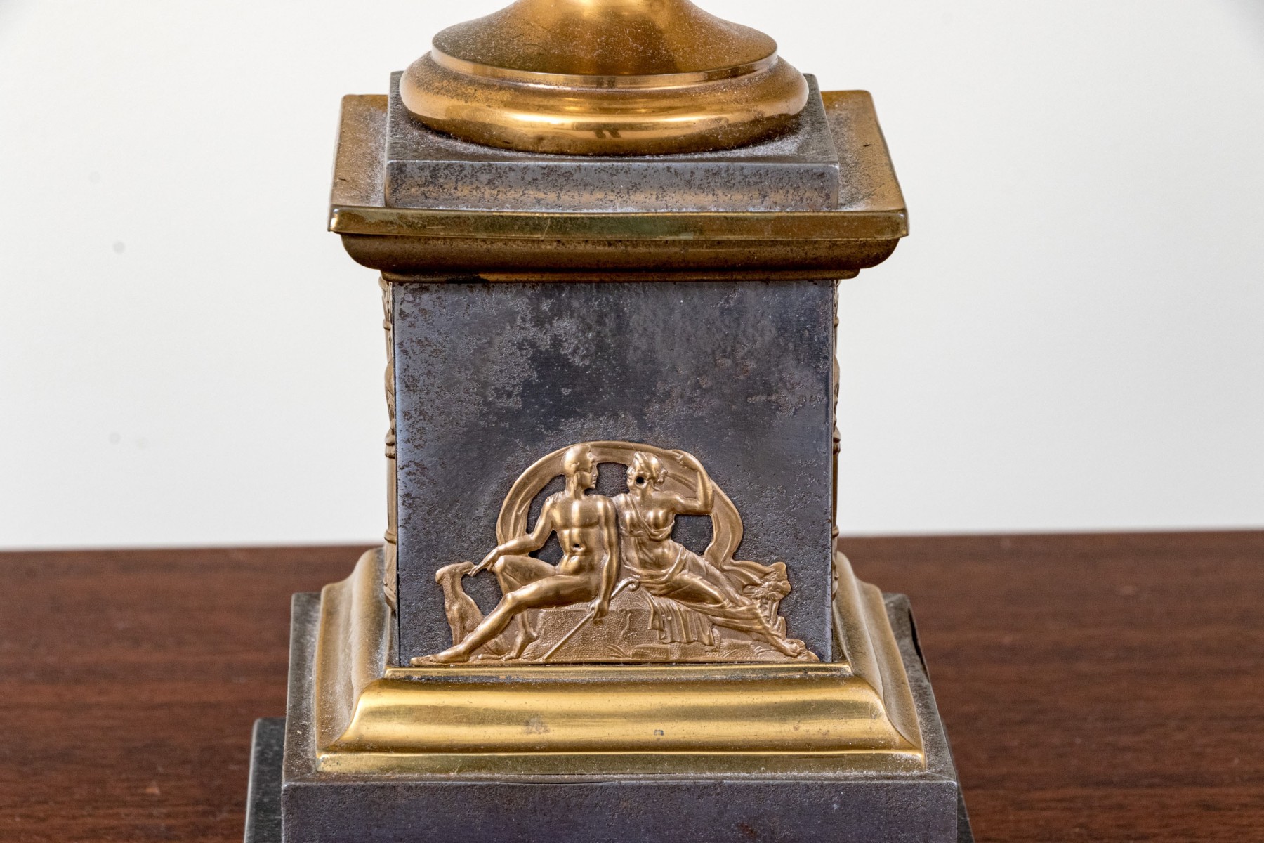 The tall lamps with frosted glass globes decorated with clear stars below the twin lights. Mounted on attractive golden tone and gray speckled metal supports. Baluster form gray supports with golden tone capitals and bases, mounted on tiered pedestals. Two sides with neoclassical appliques of couples and two sides with tall vases of flowers. The whole mounted on marble bases.