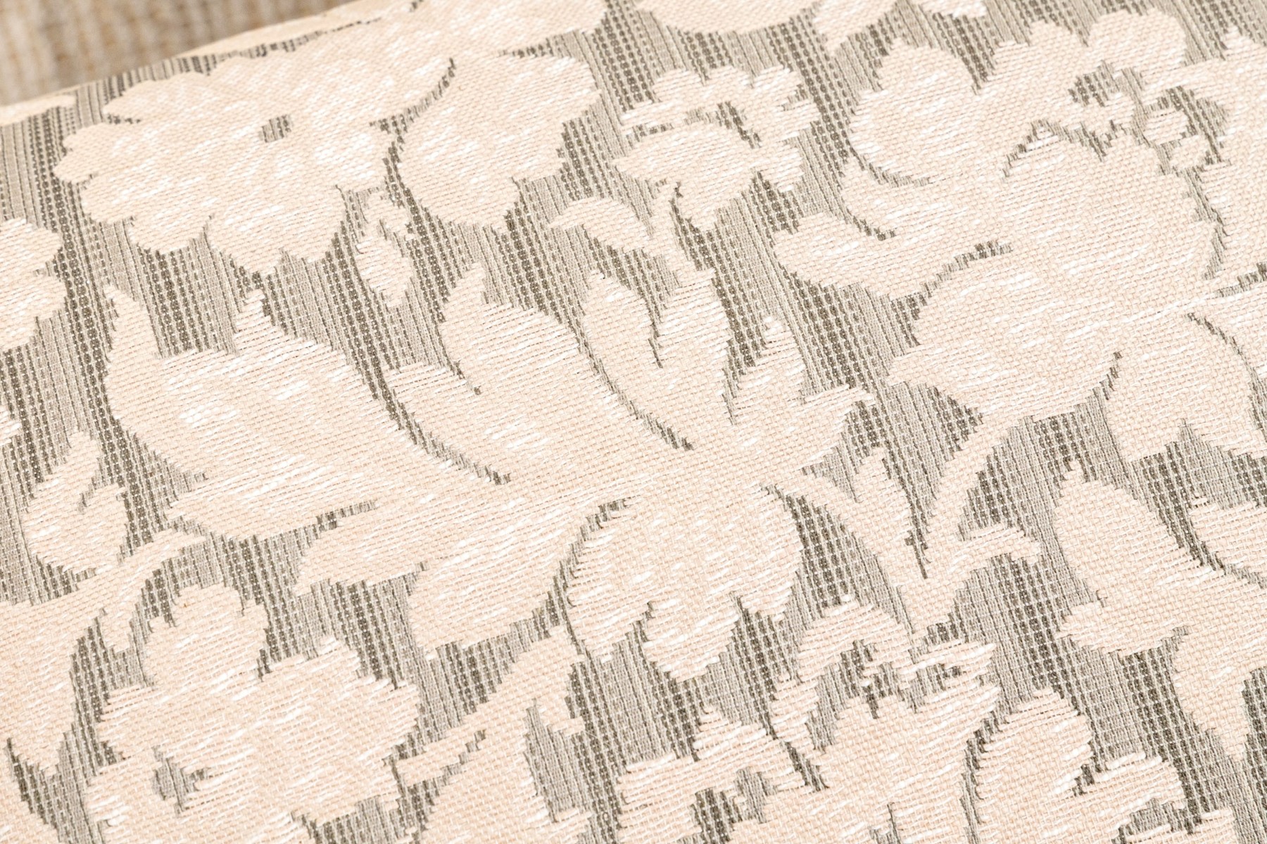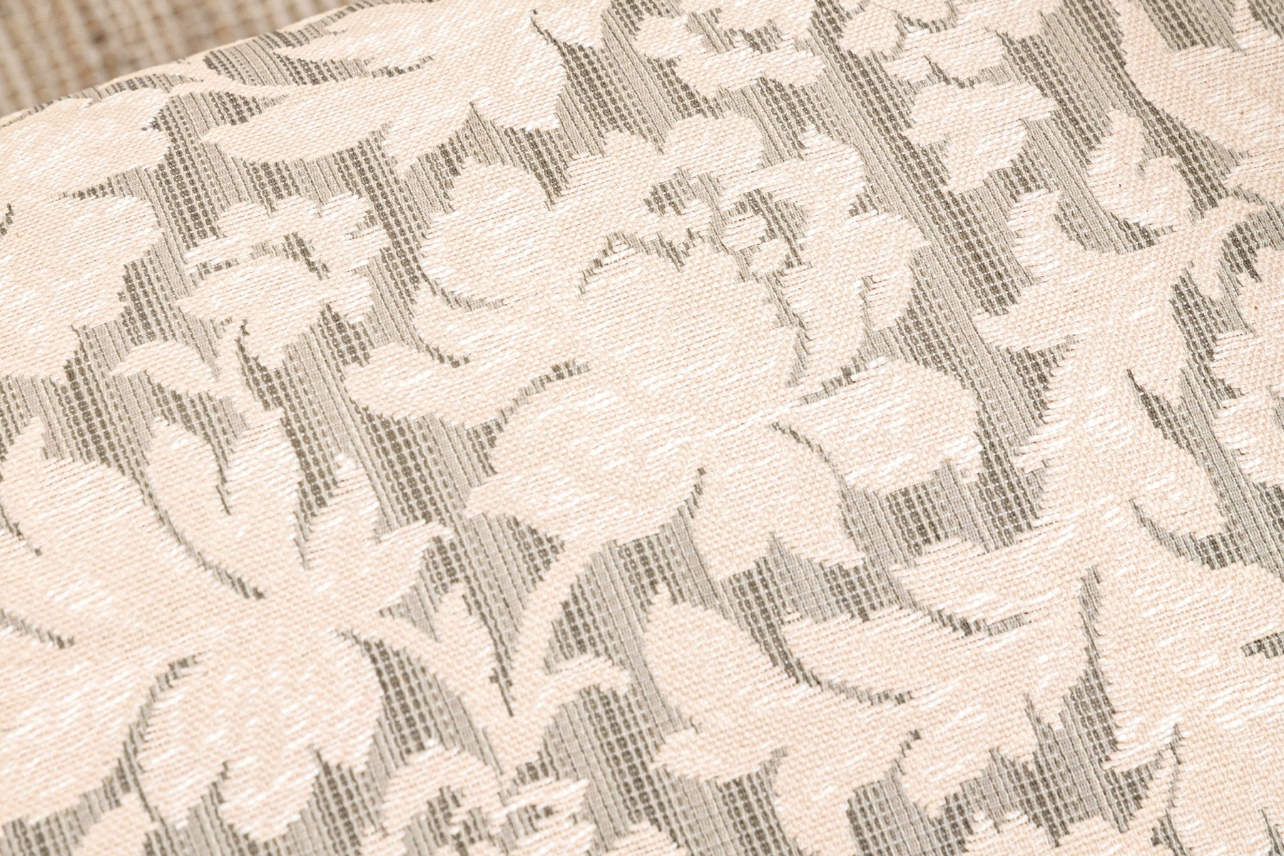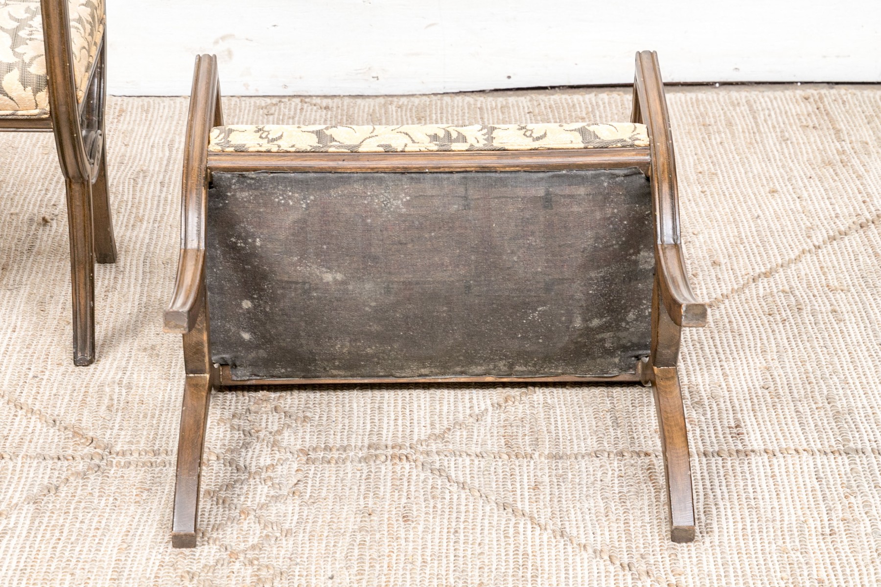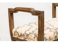 The carved frames with high U shaped arms and splayed legs in a walnut finish. Upholstered in an ecru on gray large floral print fabric.