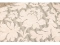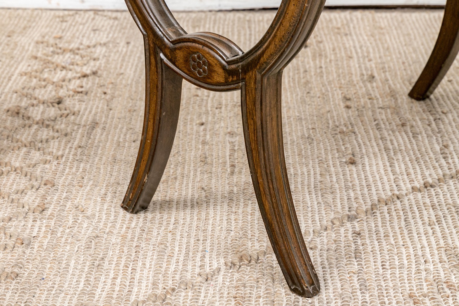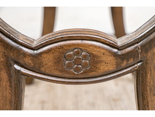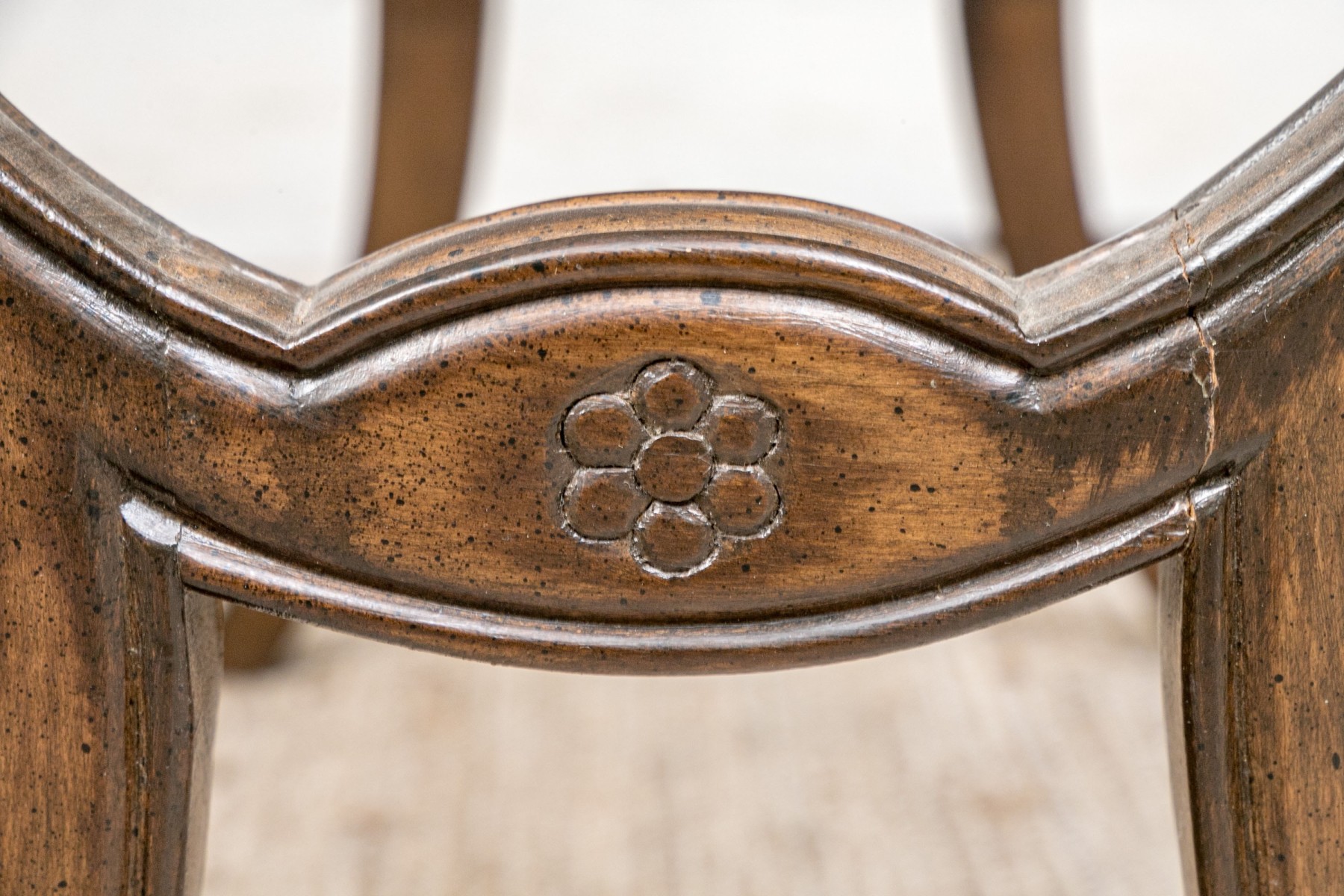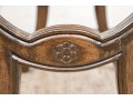 The carved frames with high U shaped arms and splayed legs in a walnut finish. Upholstered in an ecru on gray large floral print fabric.