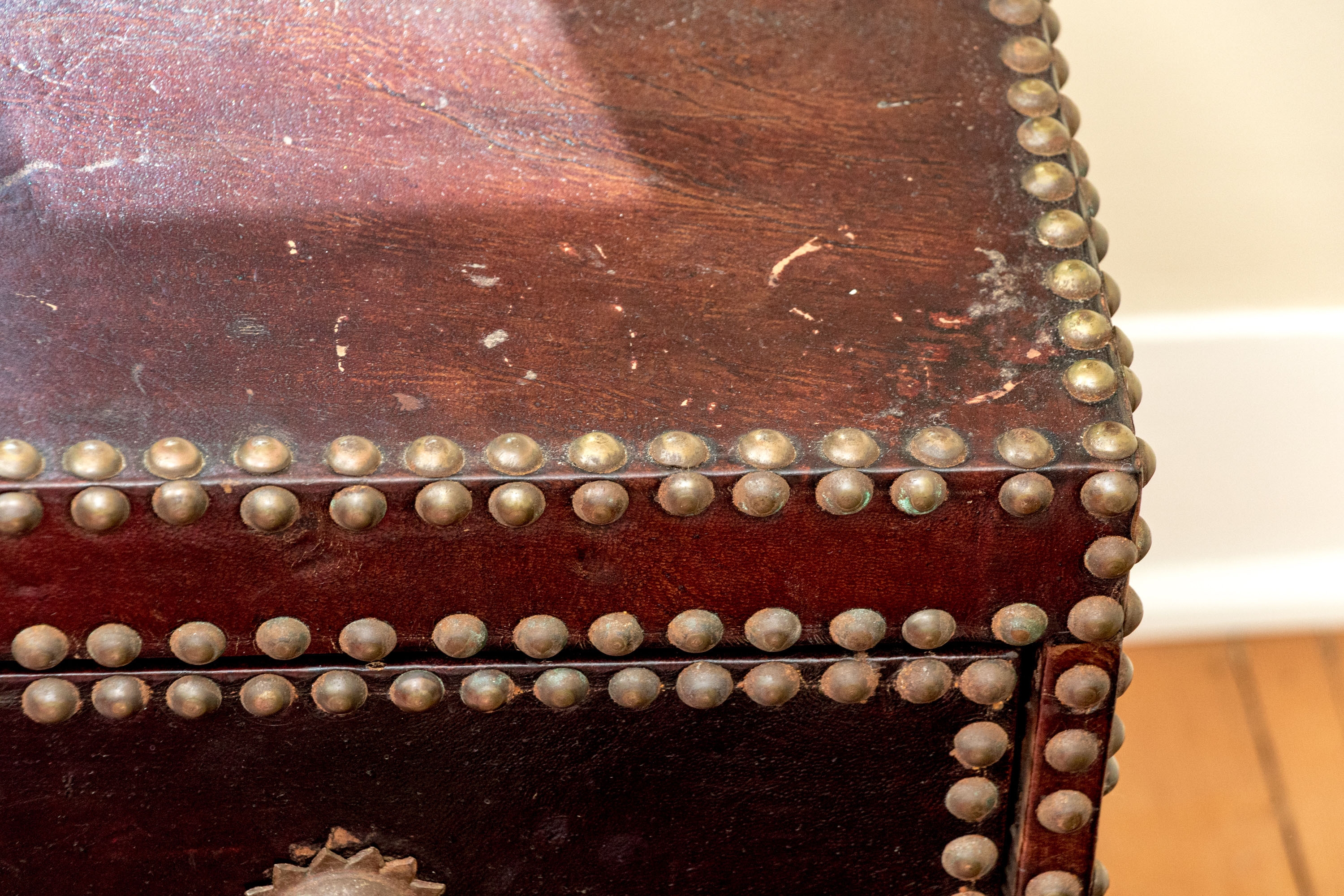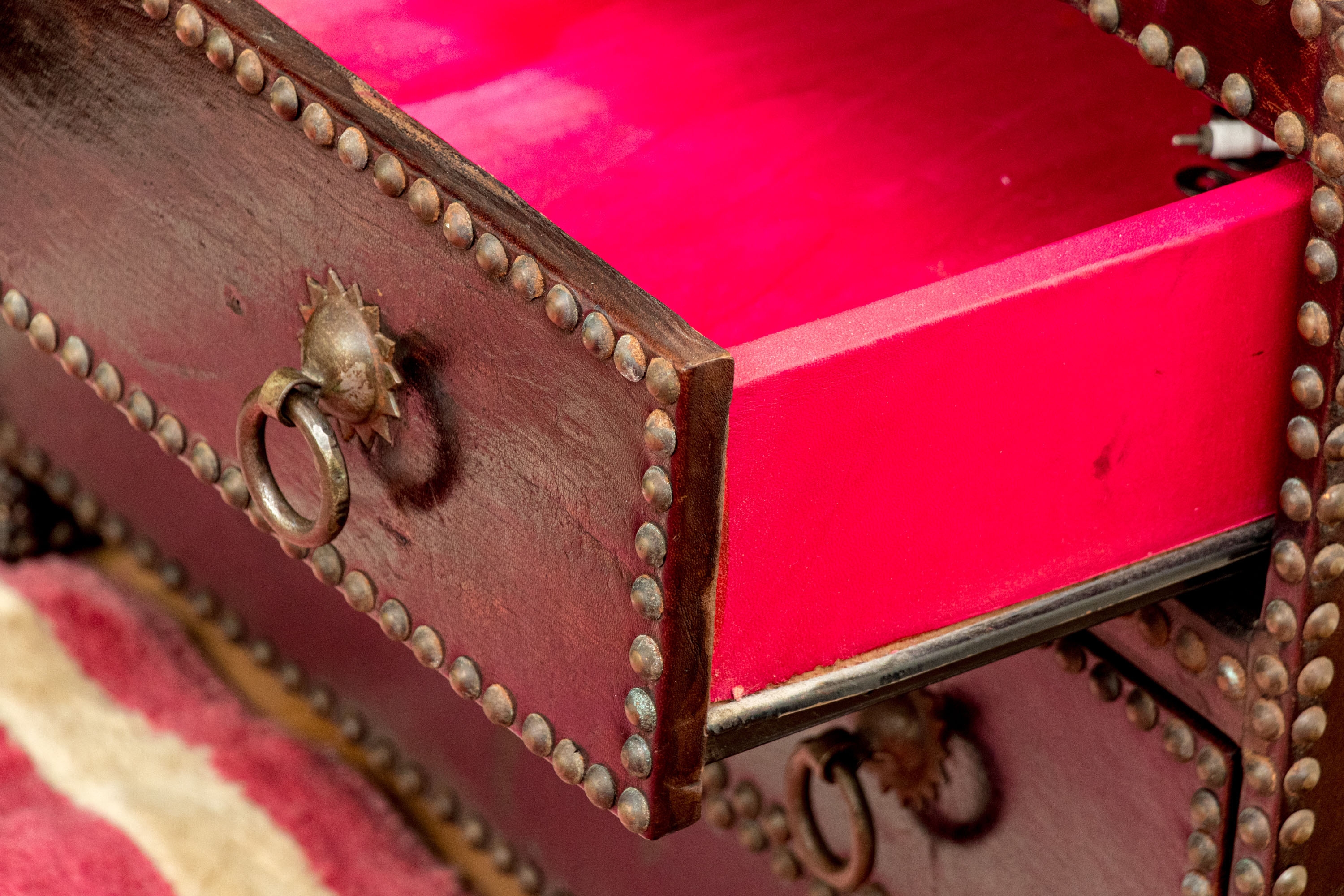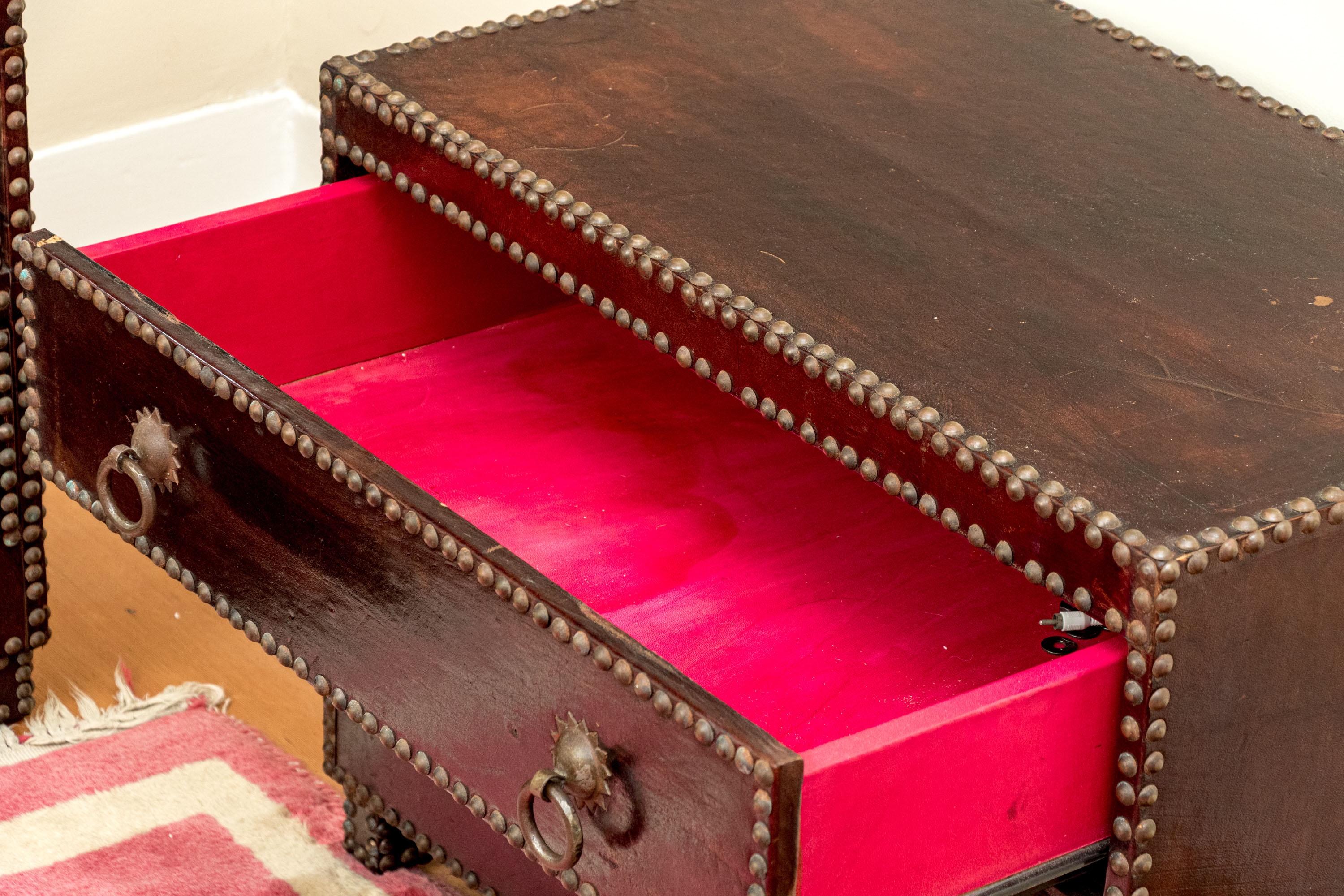 Each on four feet with two drawers, both with a pair of ring pulls The bodies are wrapped in leather with brass tack nailhead trim for a fabulous aesthetic.