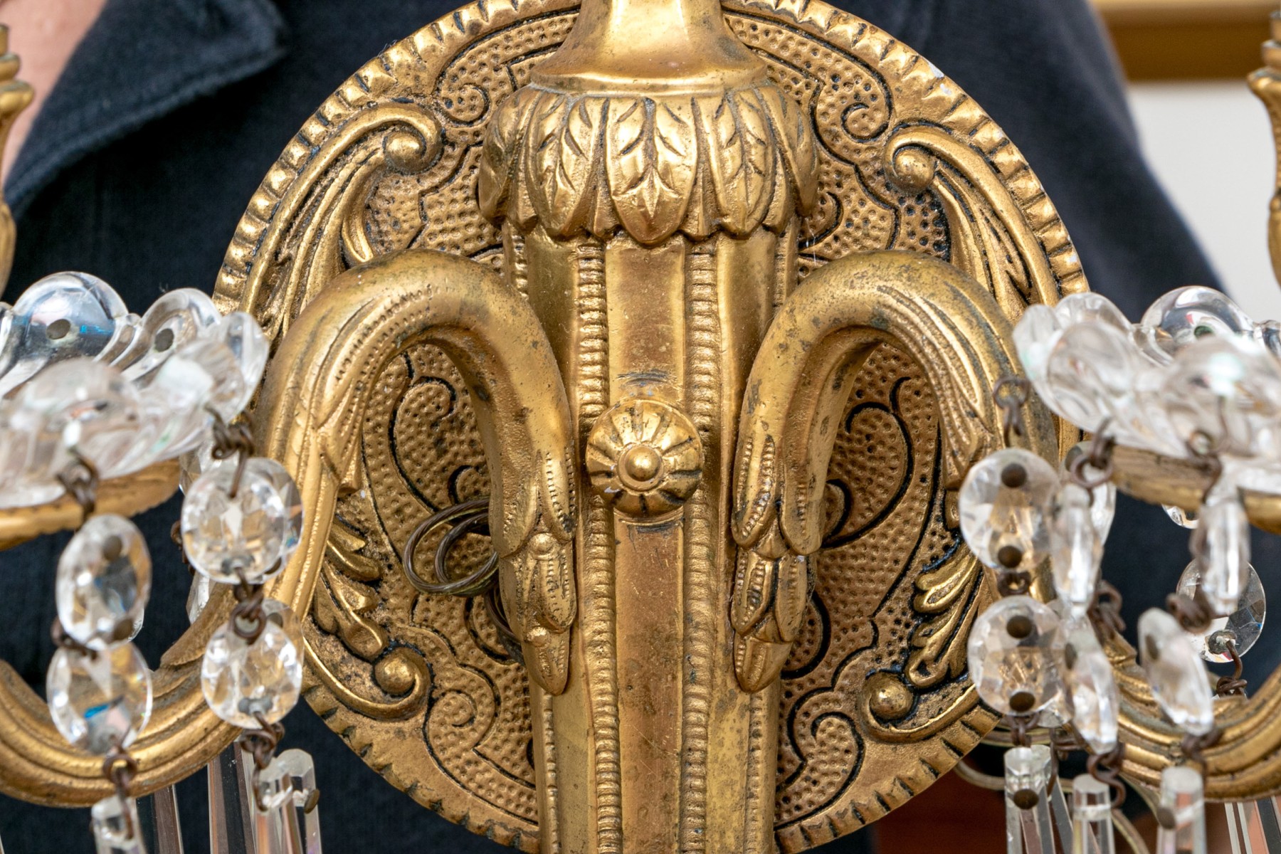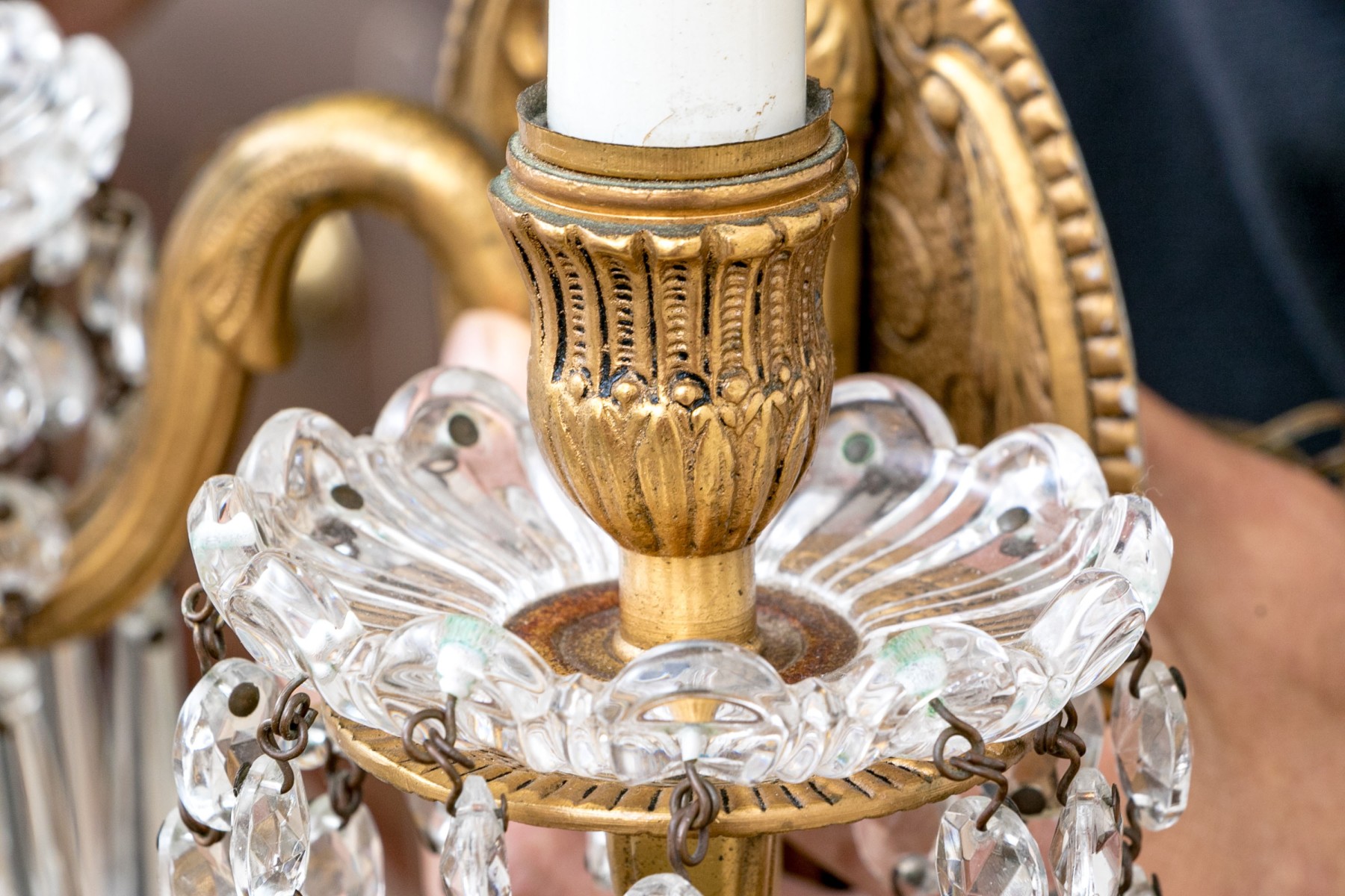 A decadent pair of Louis XVI style electric wall sconces in sturdy brass. Features torch designs with pinecone finials over urns encircled by wreaths, leading to tapered columns over circular medallion plaques. Two S-curved arms support candlestick sockets dazzling with crystal bobeches and prisms, completing the elegant displays.