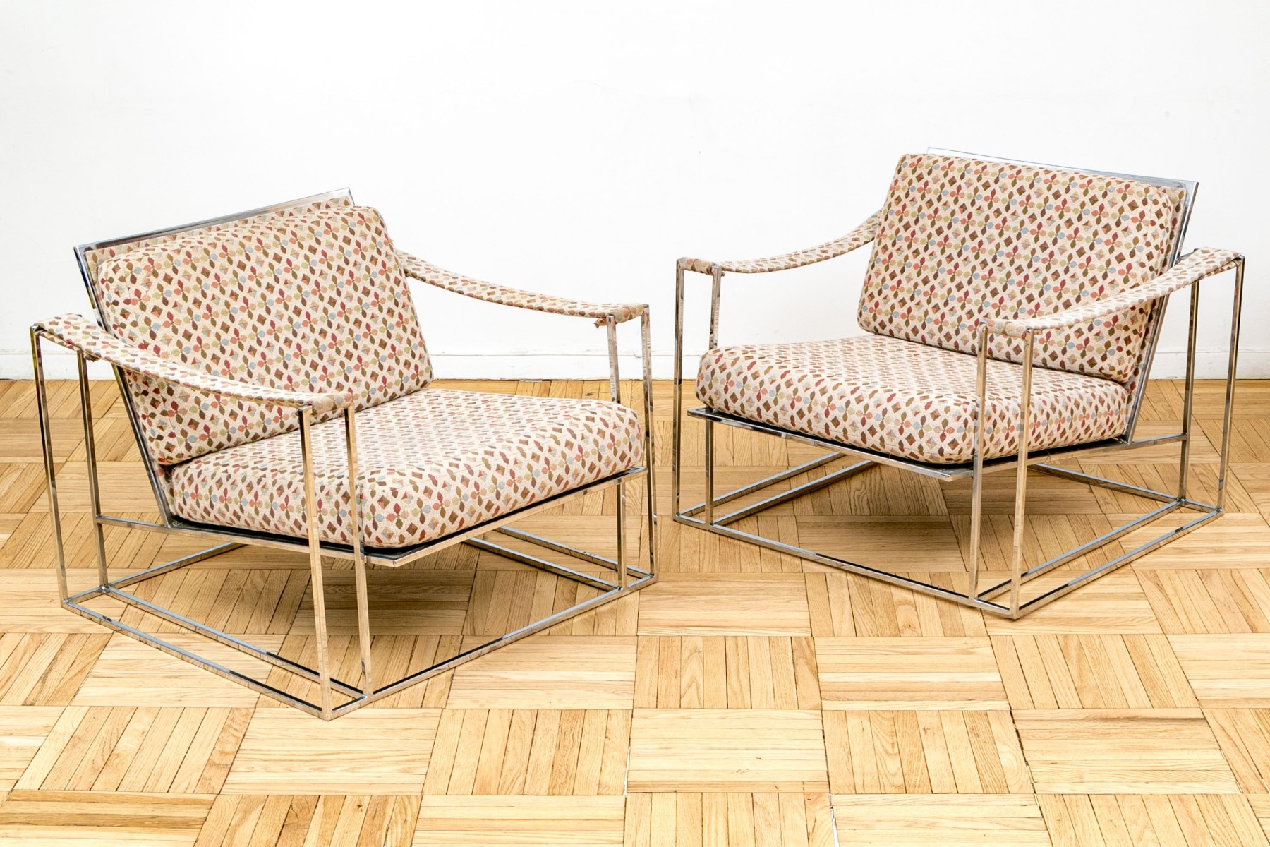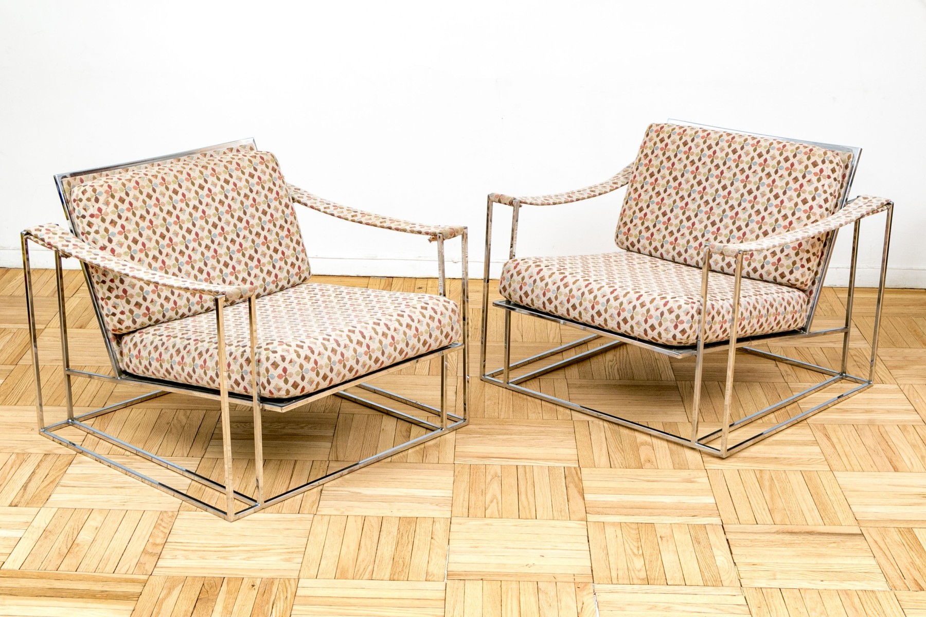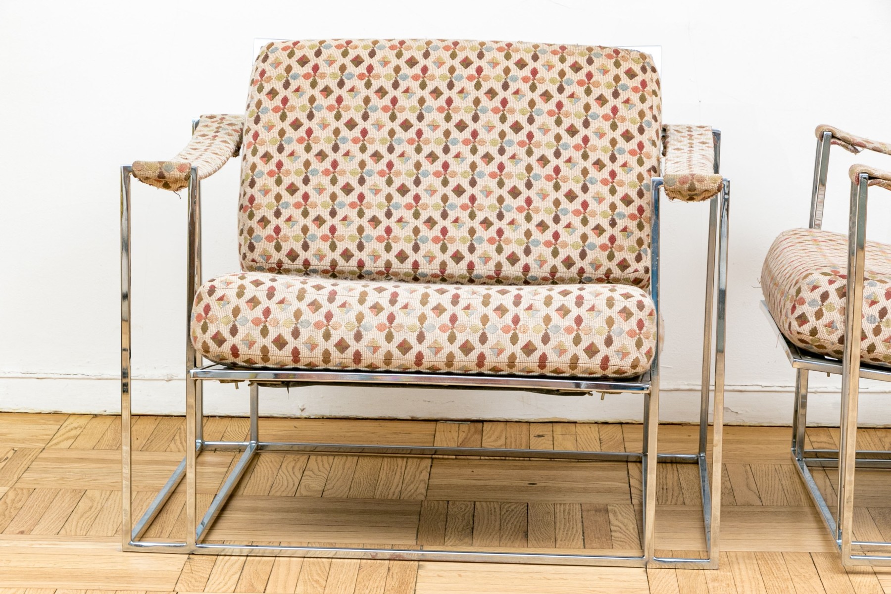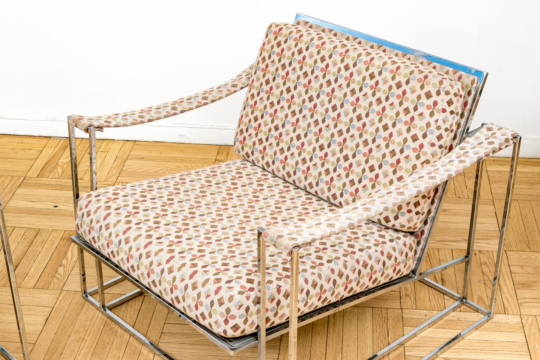 A vintage pair of Milo Baughman style chrome-plated steel framed lounge chairs with fabric upholstered seat cushions, seat back cushions and arms.