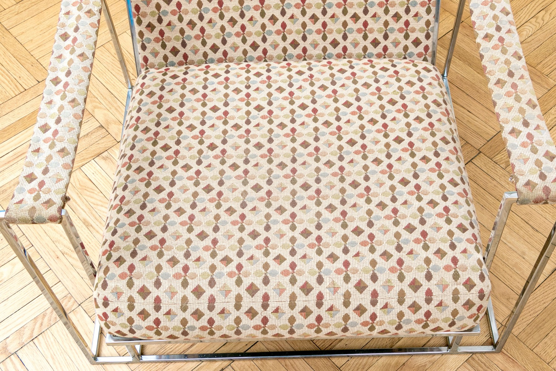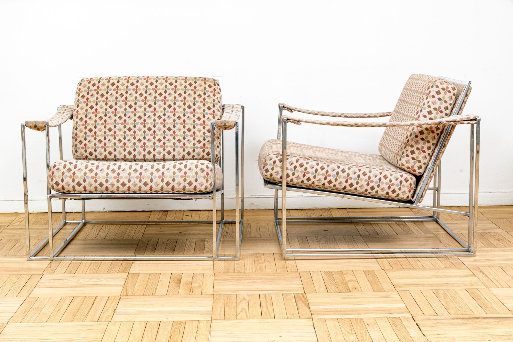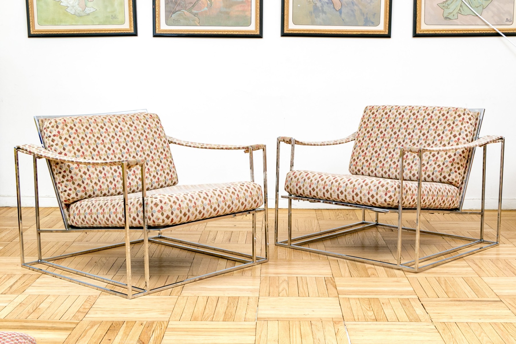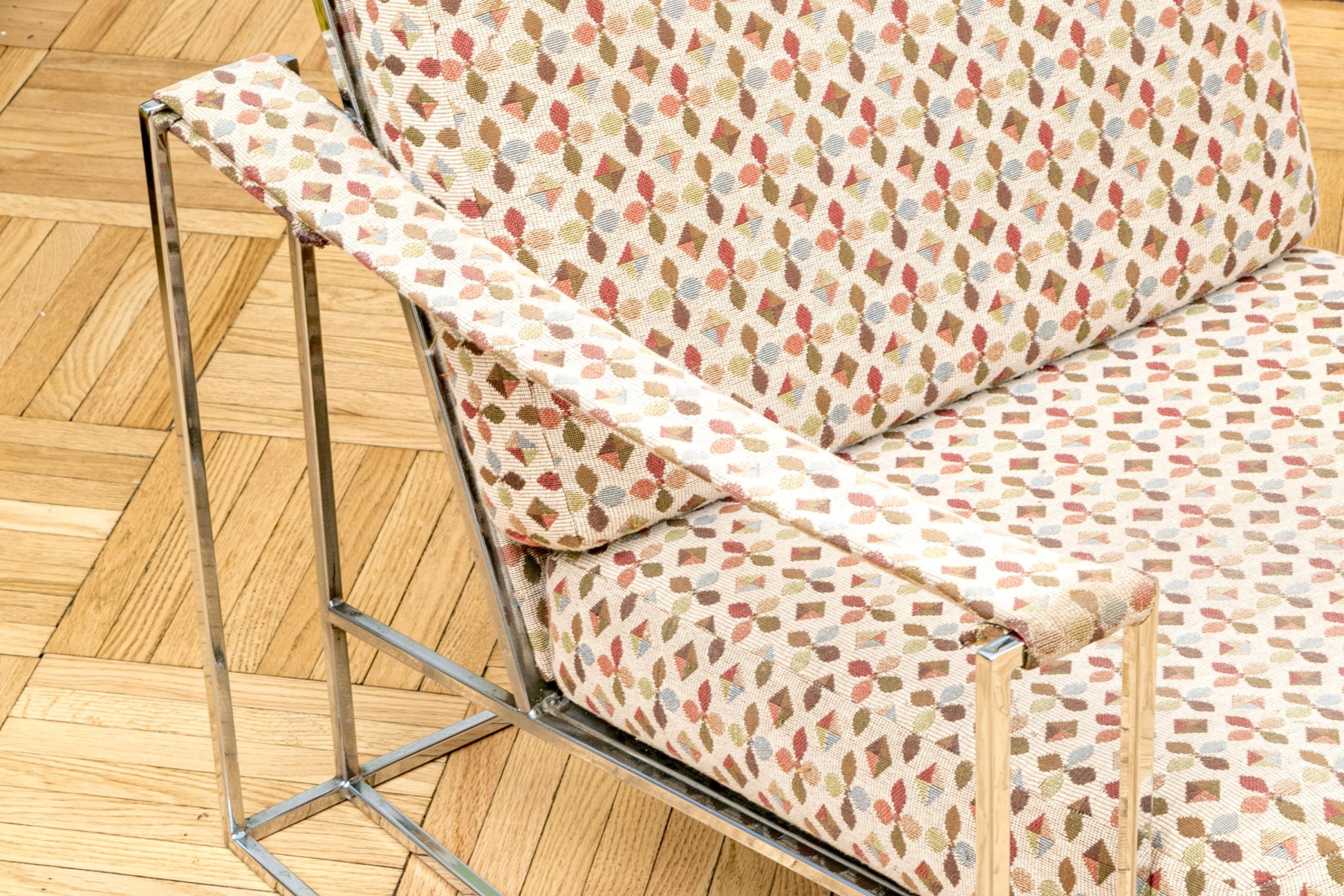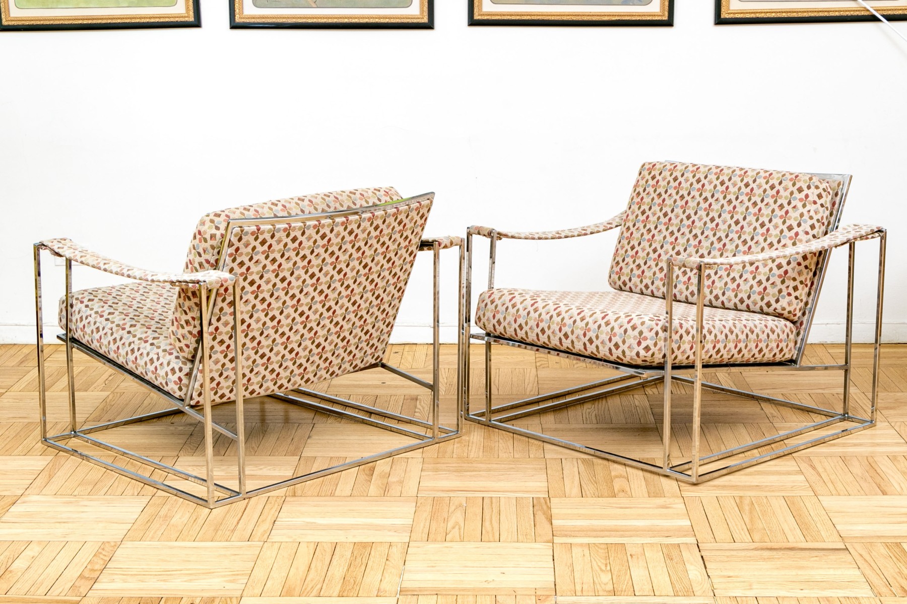 A vintage pair of Milo Baughman style chrome-plated steel framed lounge chairs with fabric upholstered seat cushions, seat back cushions and arms.