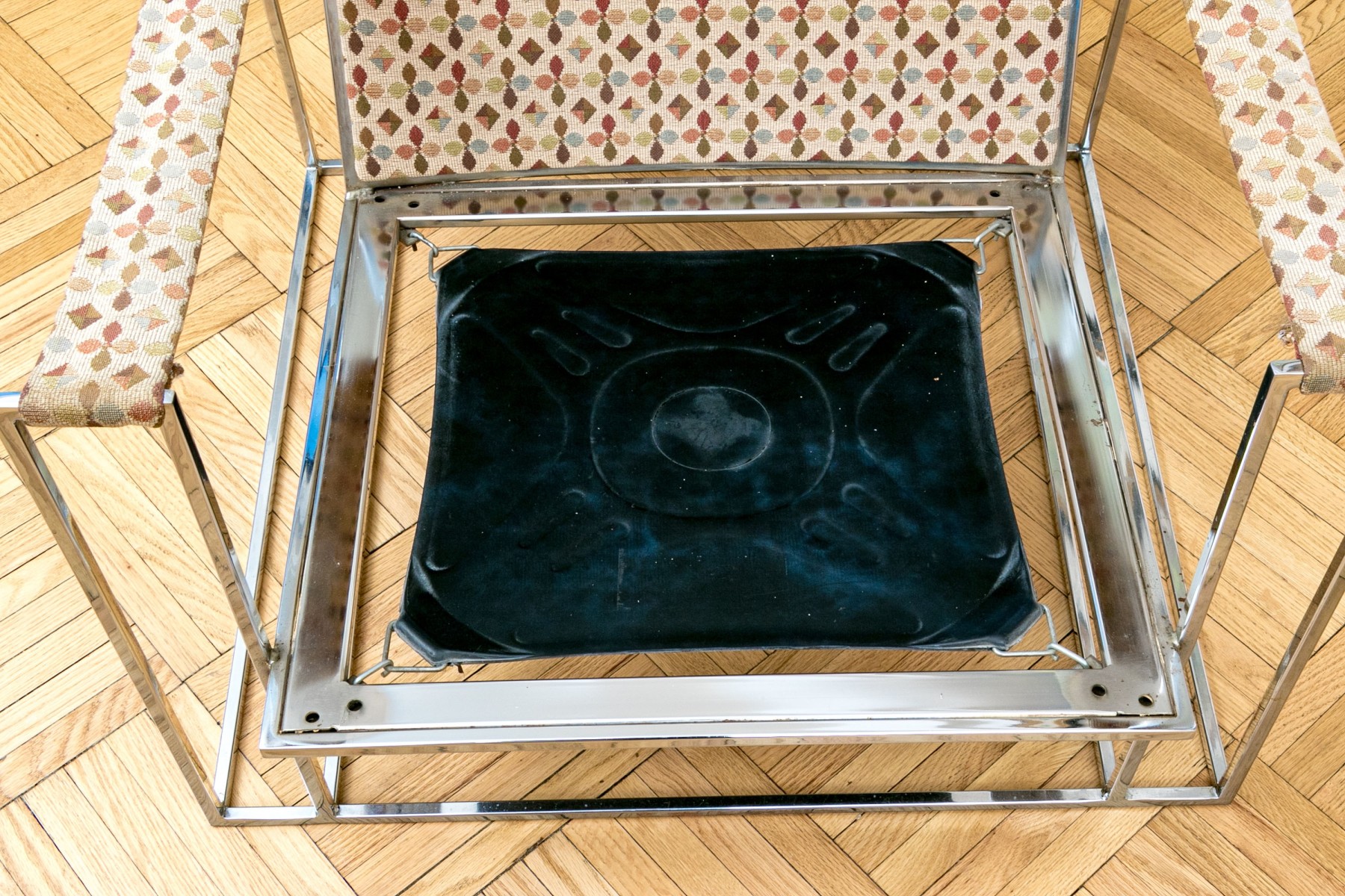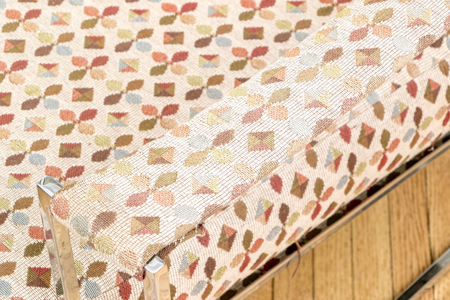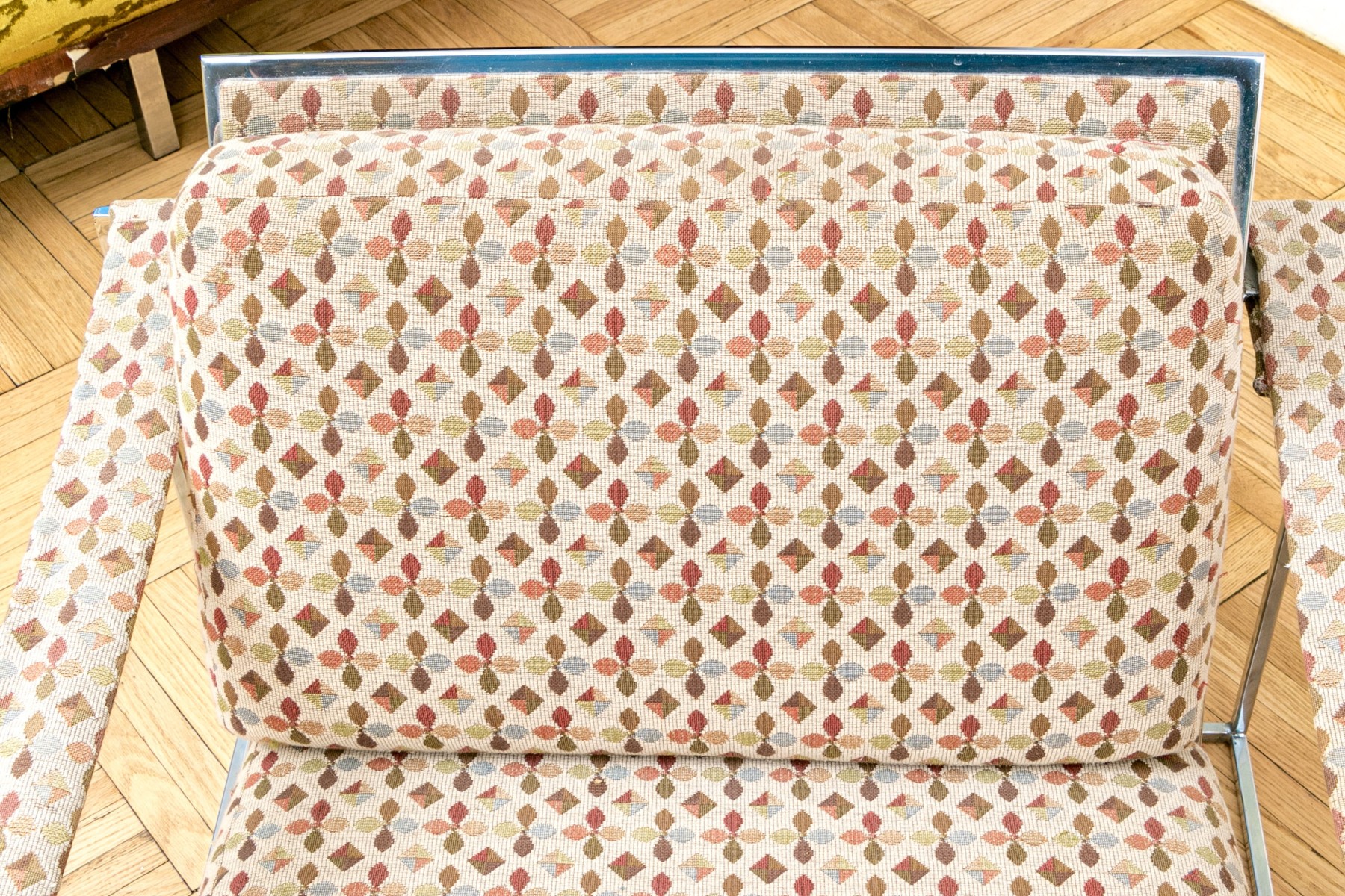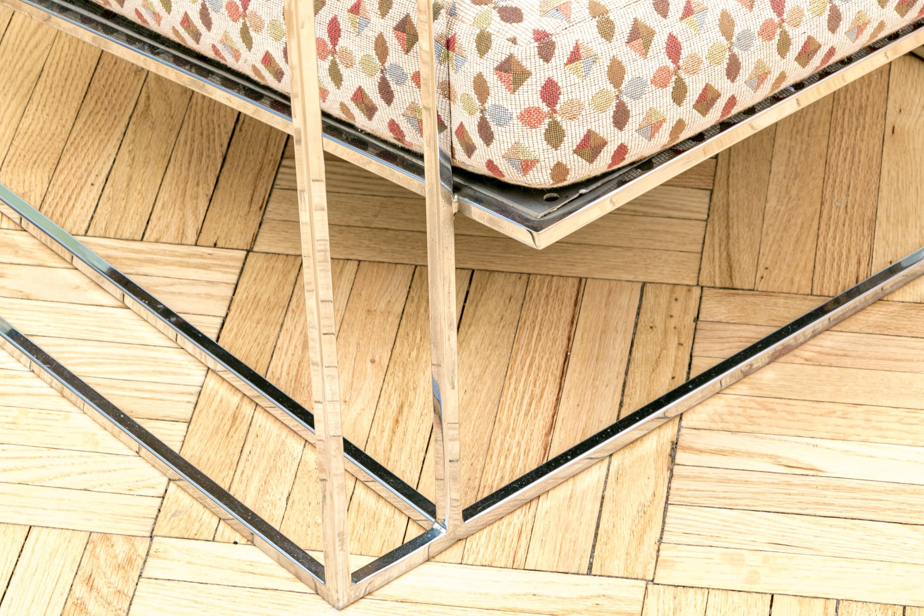 A vintage pair of Milo Baughman style chrome-plated steel framed lounge chairs with fabric upholstered seat cushions, seat back cushions and arms.