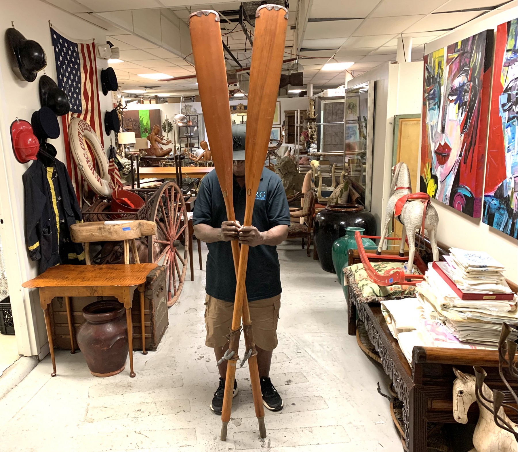 Pair Of Vintage Oars With Partial Label & Riggings #267591. Black Rock Galleries provides high end estate liquidation services through online estate auctions and a 50,000 sq ft designer showroom. estate liquidator, estate sale, online auction, antiques, fine art, liquidation, clean outs, auction, consignment, interior design, fine jewelry, collectibles, appraisals, estate appraisals, estate services, decor, furniture, furniture consignment, antique center, consignment shop. We offer appraisal services and specialize in fine art, jewelry, antiques and decorative arts. Sell with us. Black Rock Galleries is the tri-state's largest estate liquidator serving New England and the greater New York City area. We are the trusted source for expert appraisals, auction services, estate sales, and consignments. Black Rock Galleries is the east coast's largest and most trusted estate liquidator, with locations in Connecticut, greater Boston, MA and Raleigh, NC, Fairfield, Southport, Apex, TX. We are the best source for expert appraisals, auction services, estate sales and consignments. We have served thousands of families and estates with compassion, professionalism and expertise. BRG works with attorneys, executors, realtors and families to bring the greatest return on personal and estate property in the current market. Our unique combination of services make us the easy choice to get the job done in a timely and stress-free manner. We are with you from the initial consultation to the final clean out. Our house-built online auction software platform offers clients a dynamic approach to liquidating their personal property. This venue is most successful in bringing the best return with the least amount of disruption for our clients. See our services page for a complete description of this offering. Pair Of Vintage Oars With Partial Label & Riggings #267591