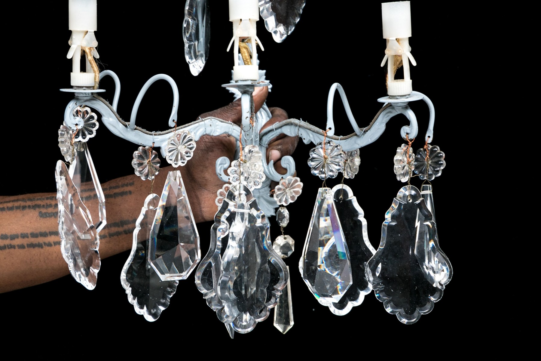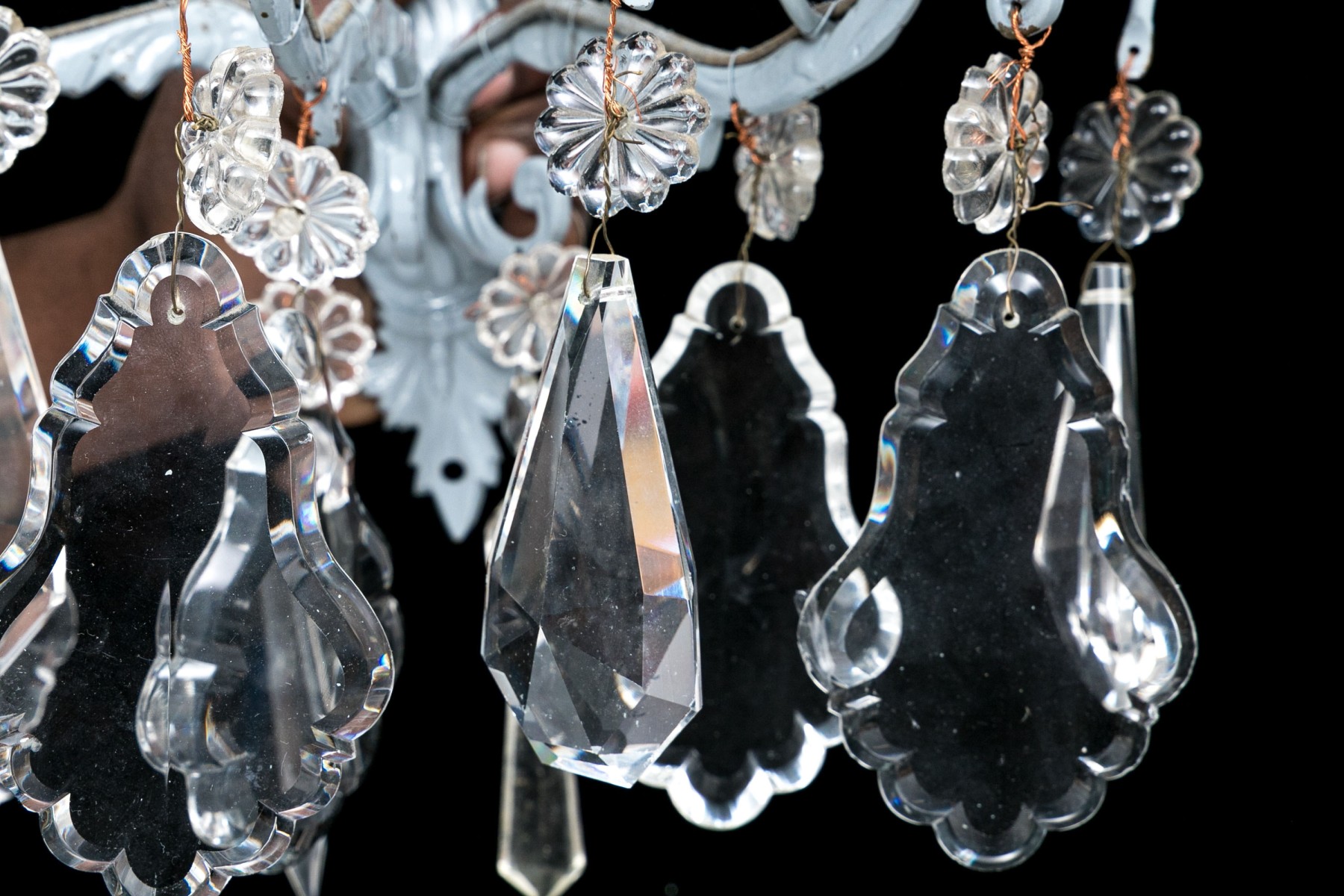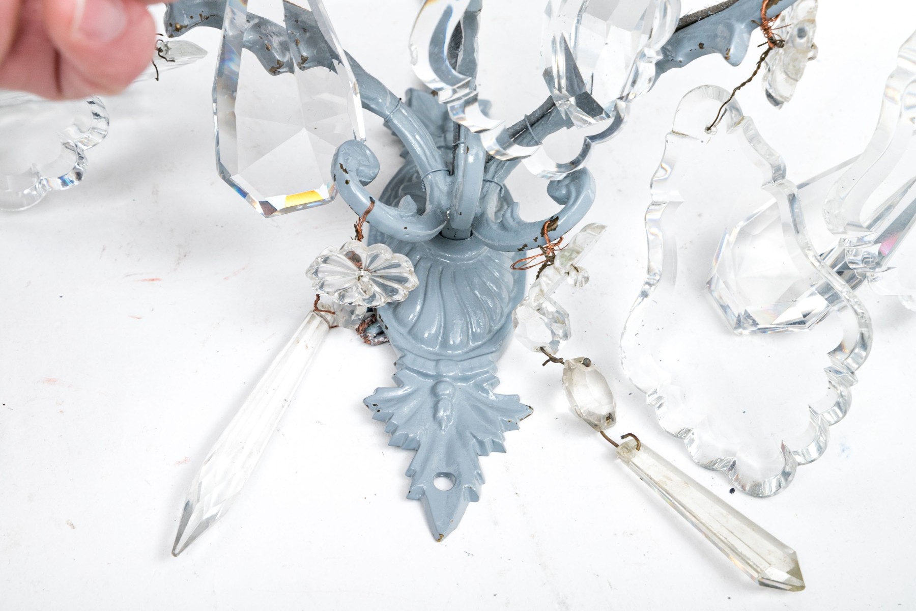 The sconces with leaf and medallion support, triple scrolled tops and three scrolled arms. The whole with crystal pendants, prisms and rosettes. In gray paint overall. With the hardware.