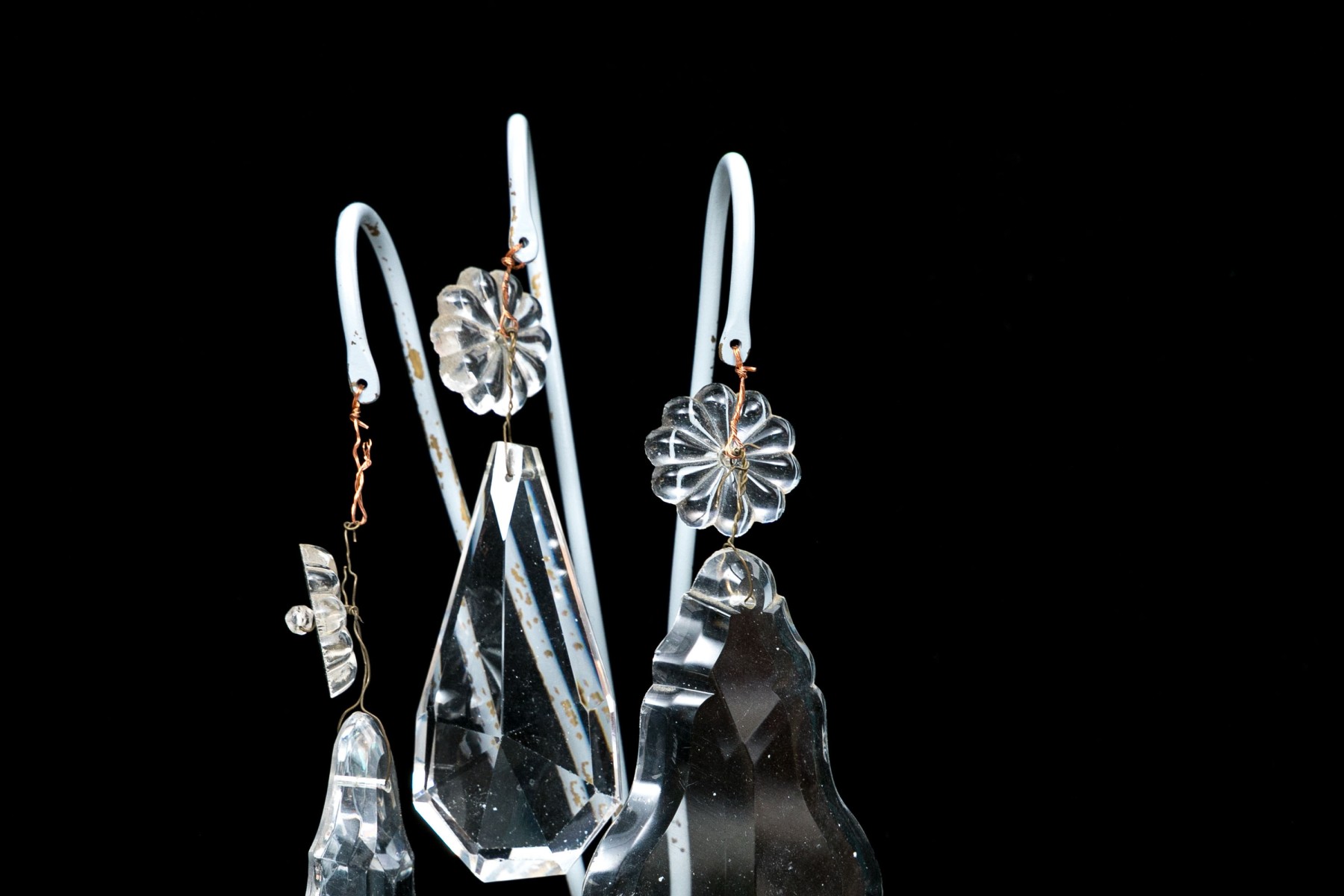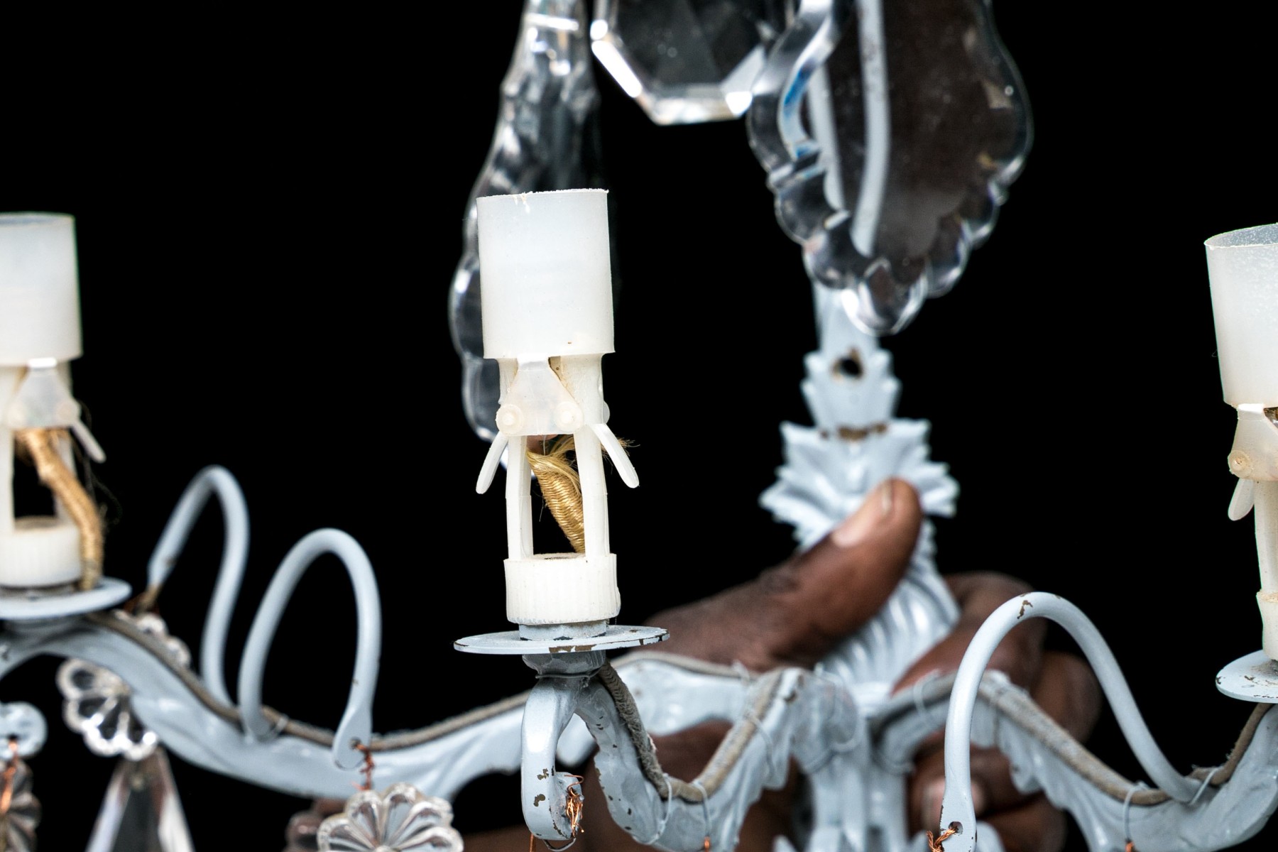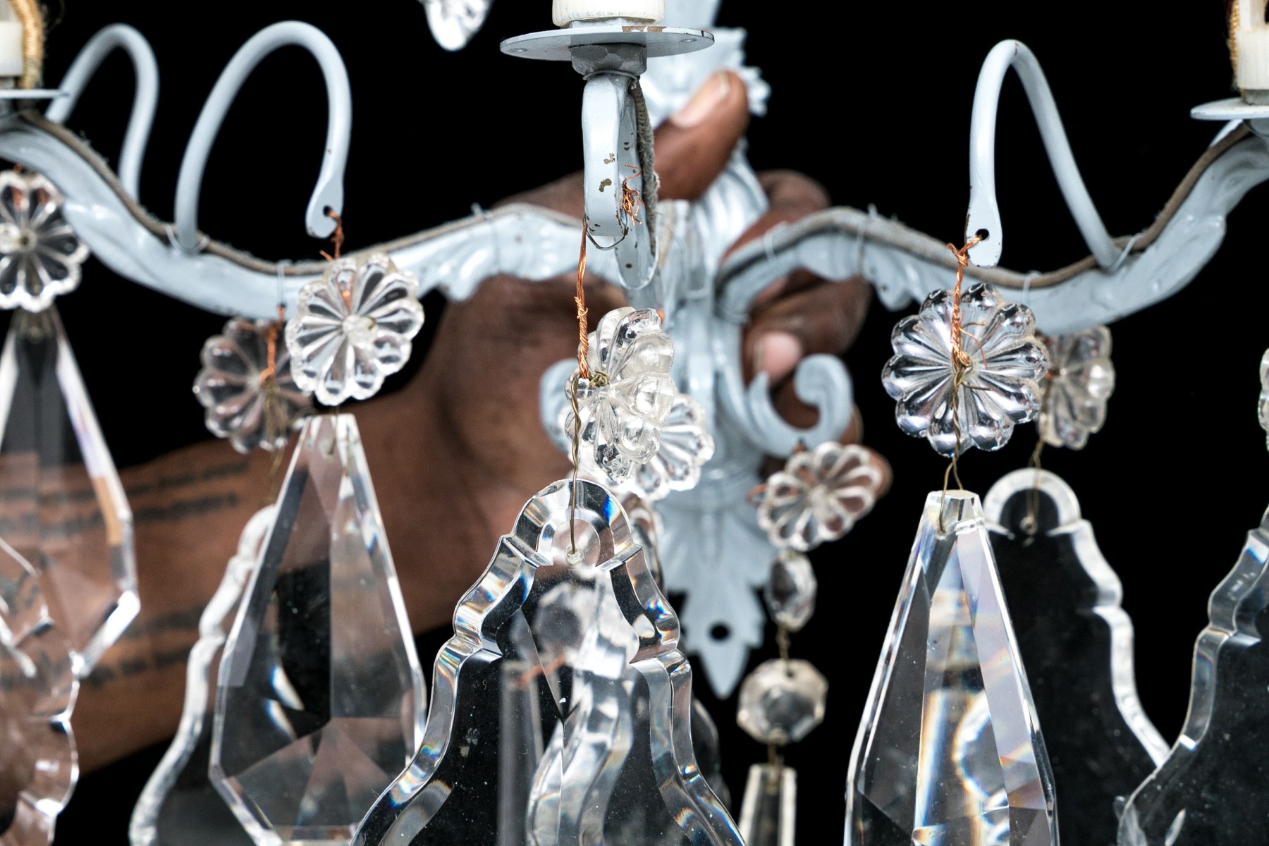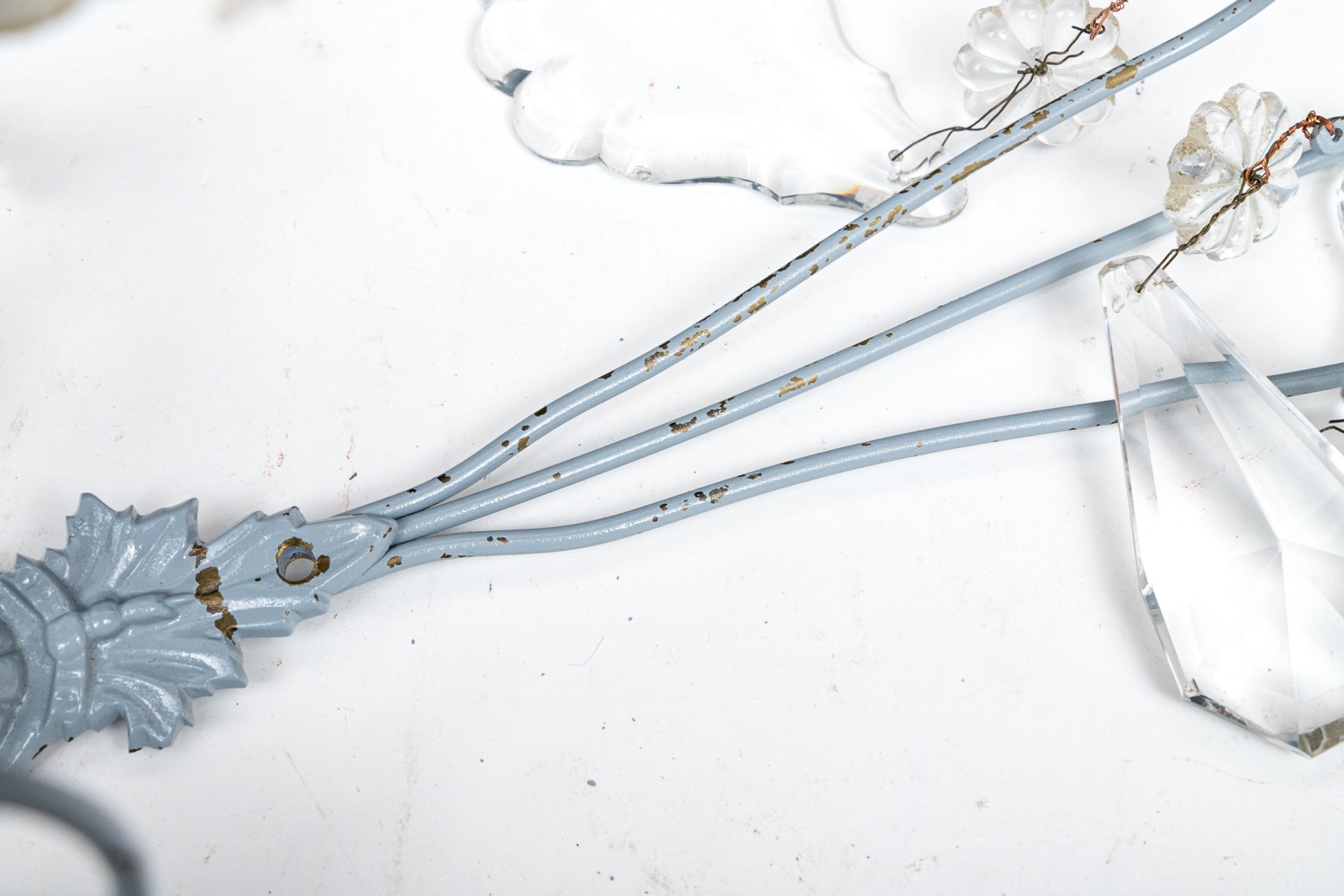 The sconces with leaf and medallion support, triple scrolled tops and three scrolled arms. The whole with crystal pendants, prisms and rosettes. In gray paint overall. With the hardware.