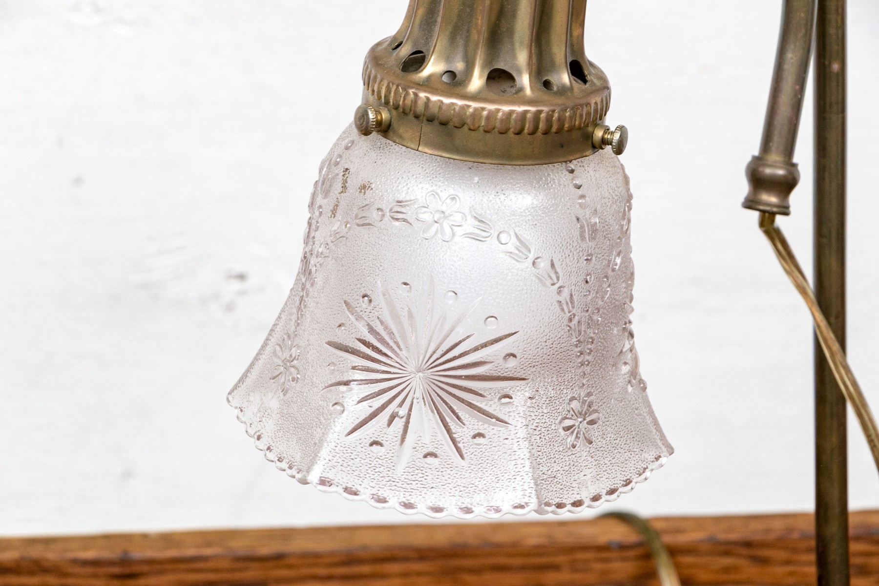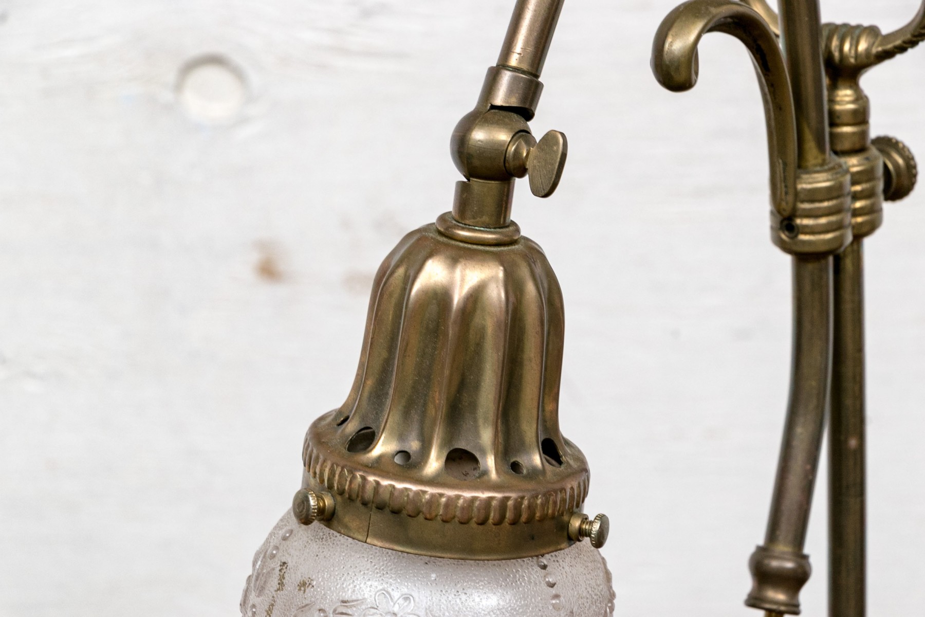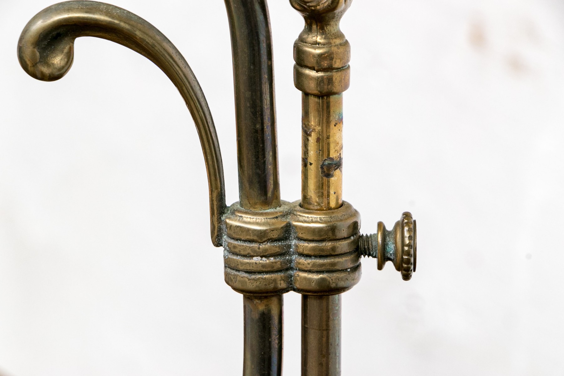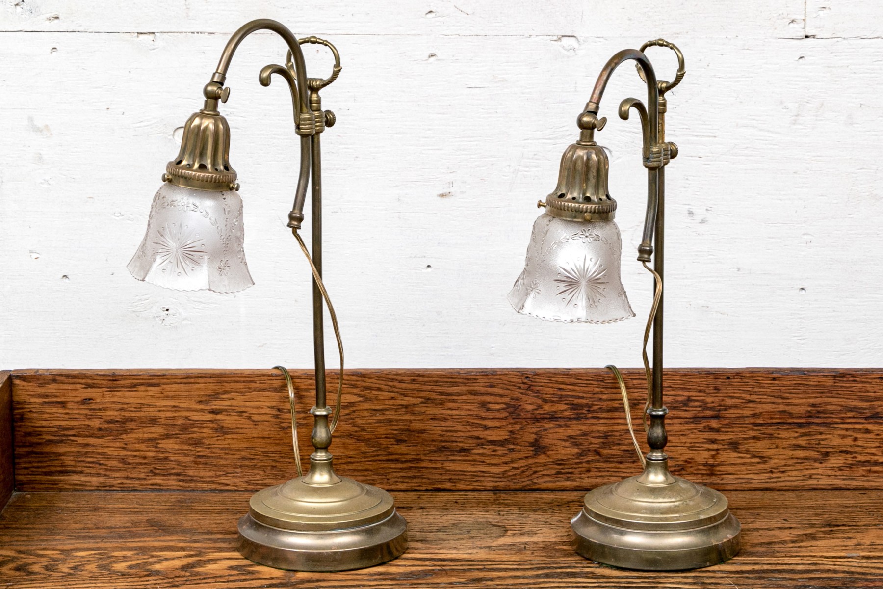 Heavy brass standards with scrolled arms and adjustable decorated molded glass hexagonal shades. Raised on round bases.