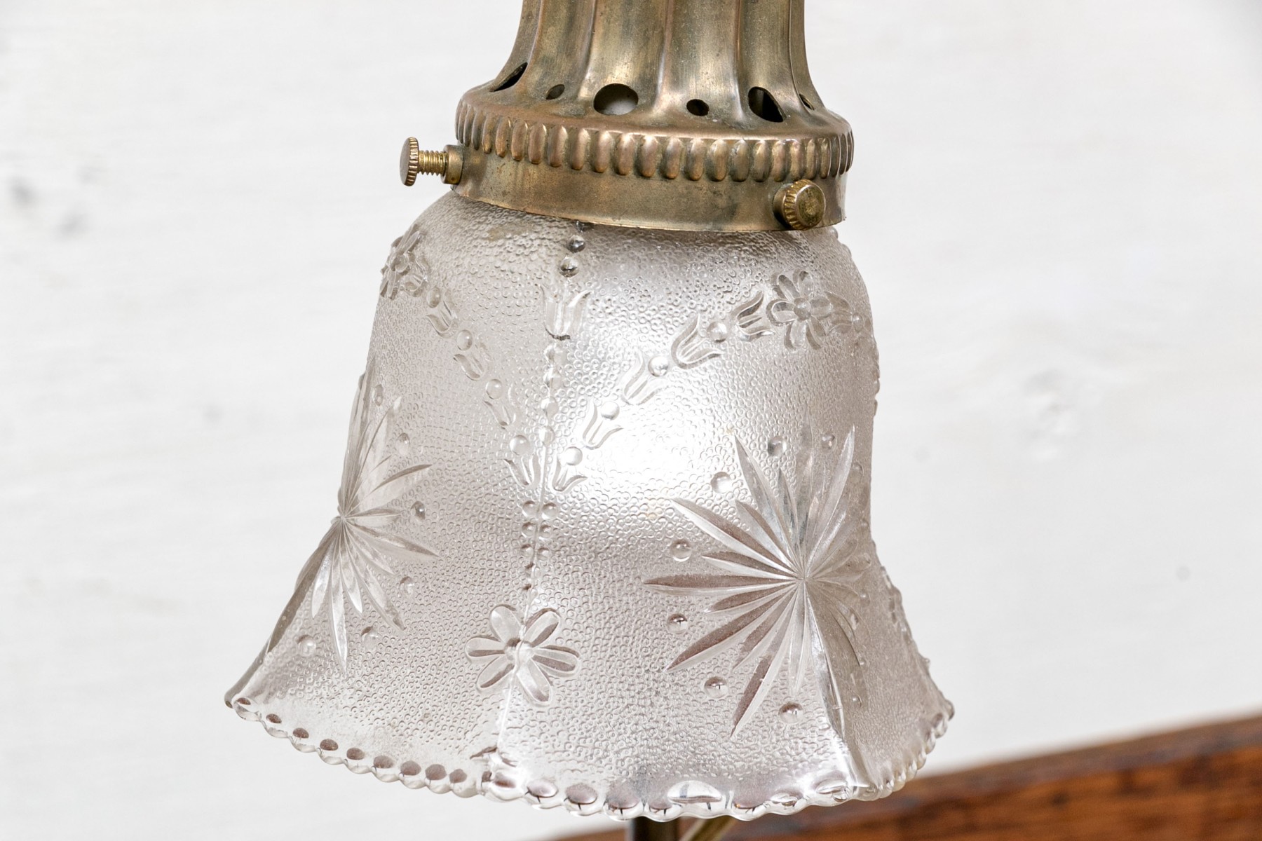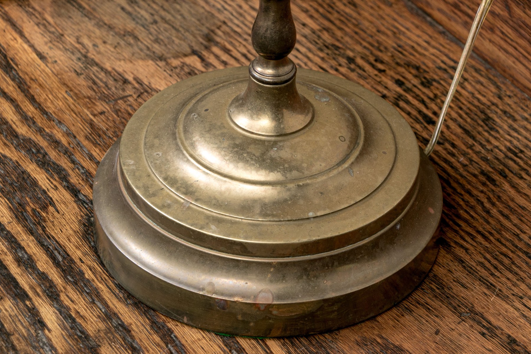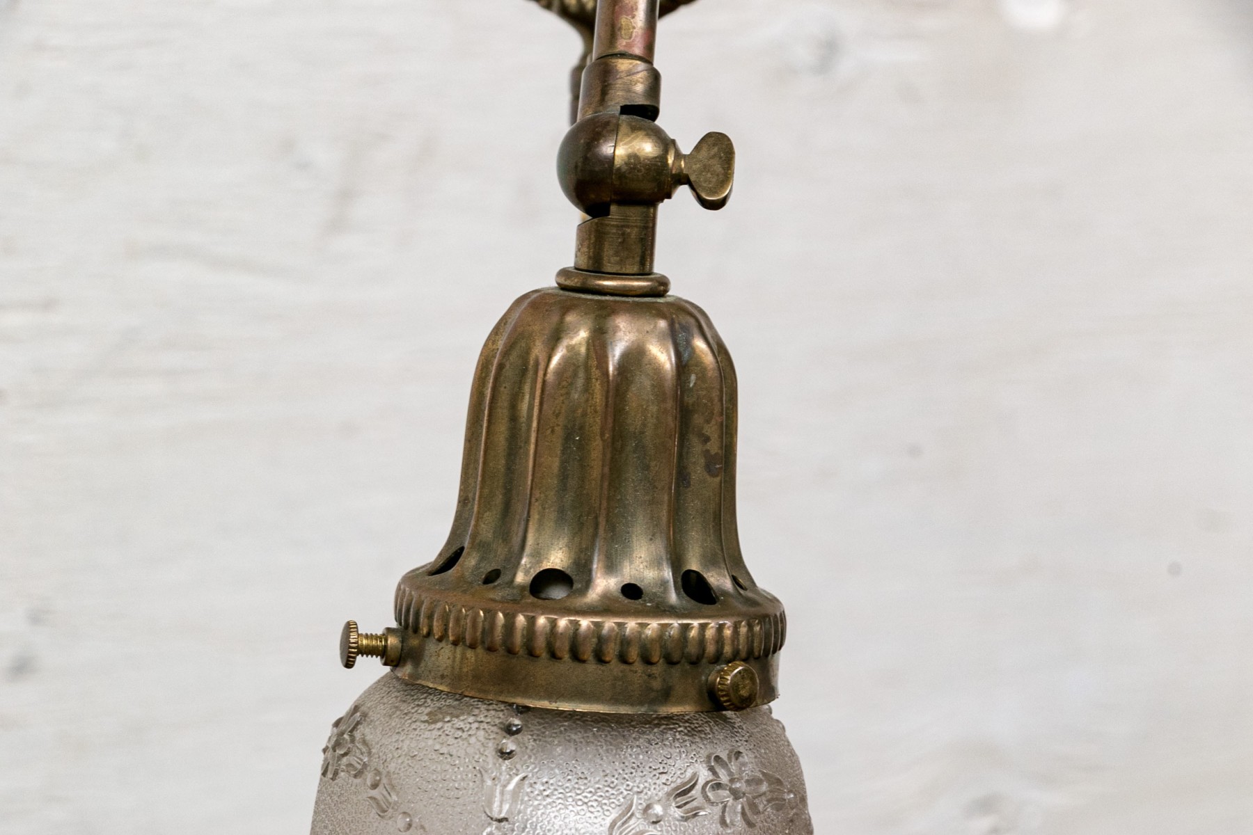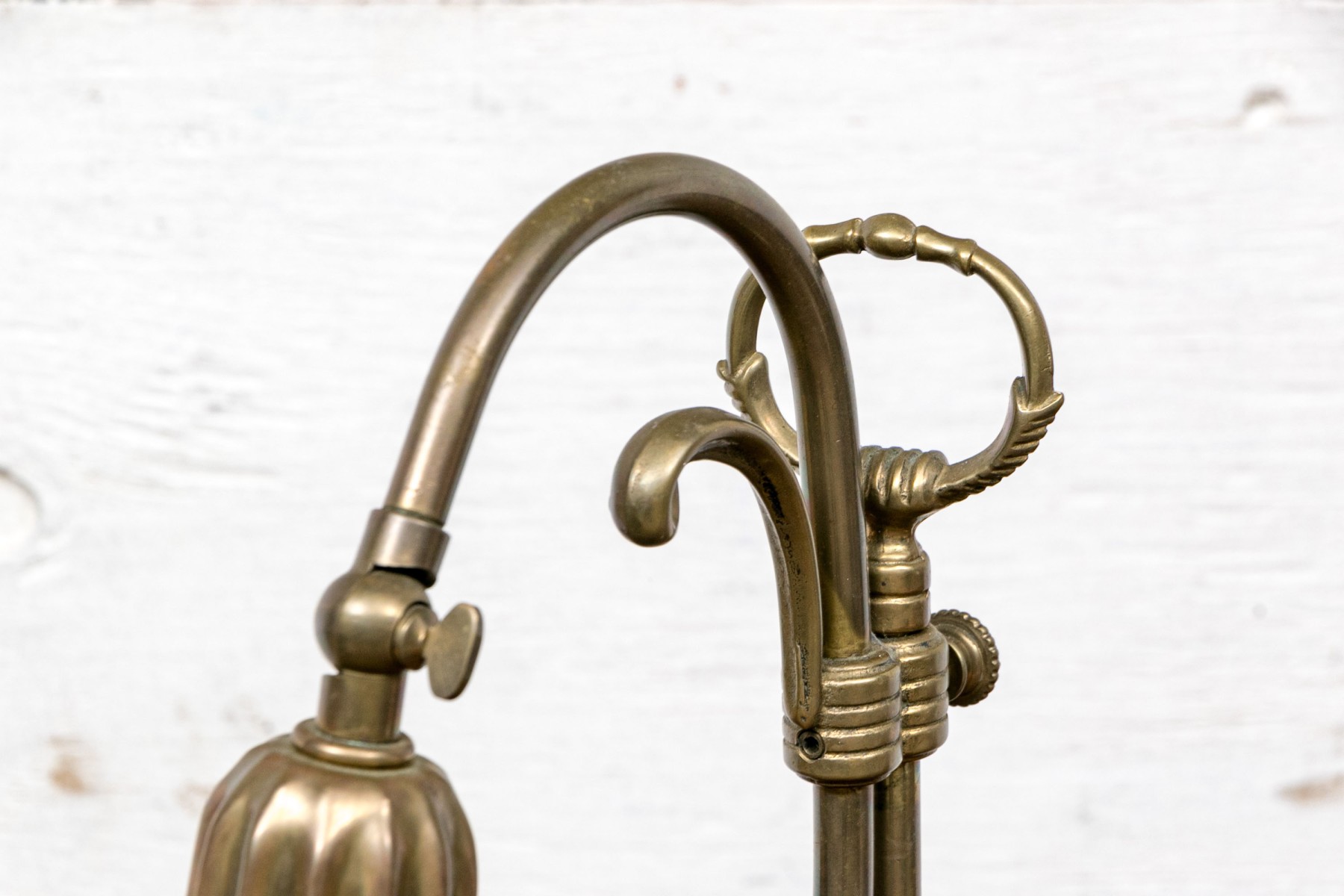 Heavy brass standards with scrolled arms and adjustable decorated molded glass hexagonal shades. Raised on round bases.