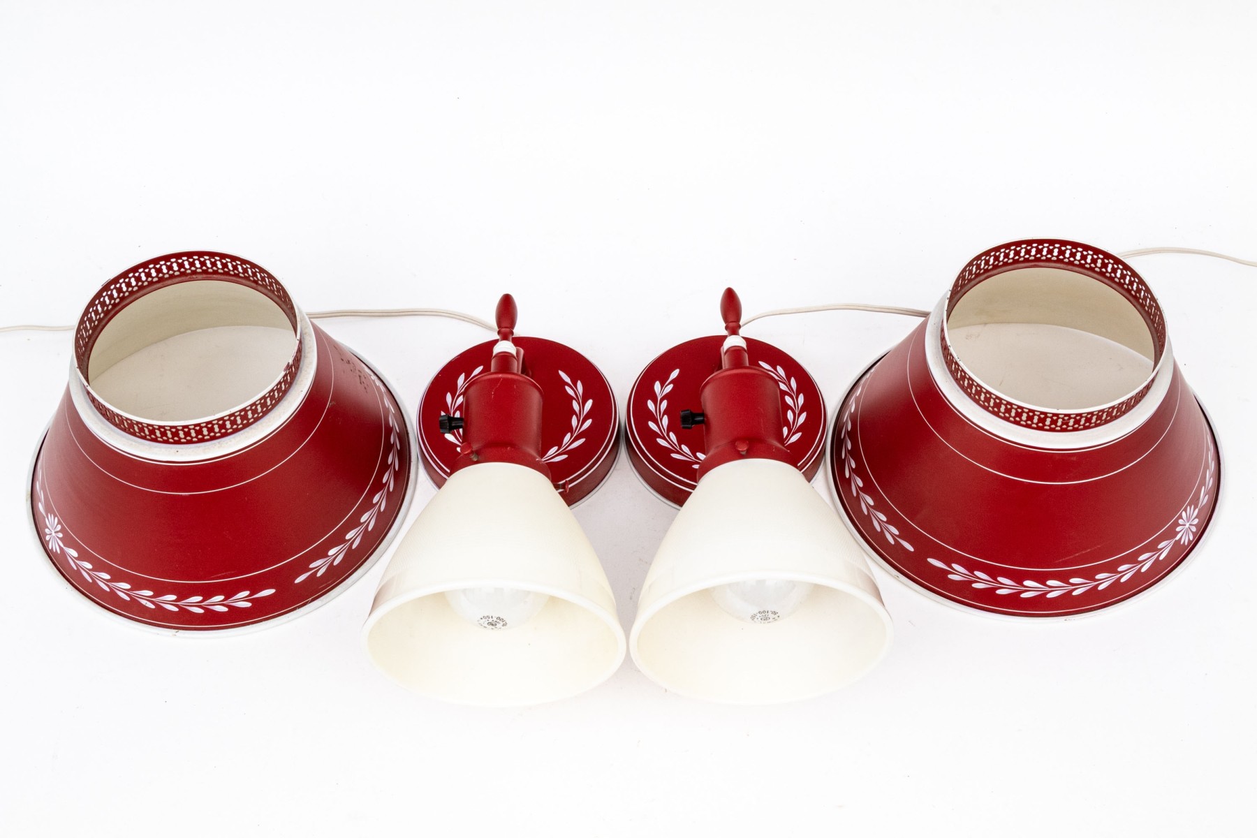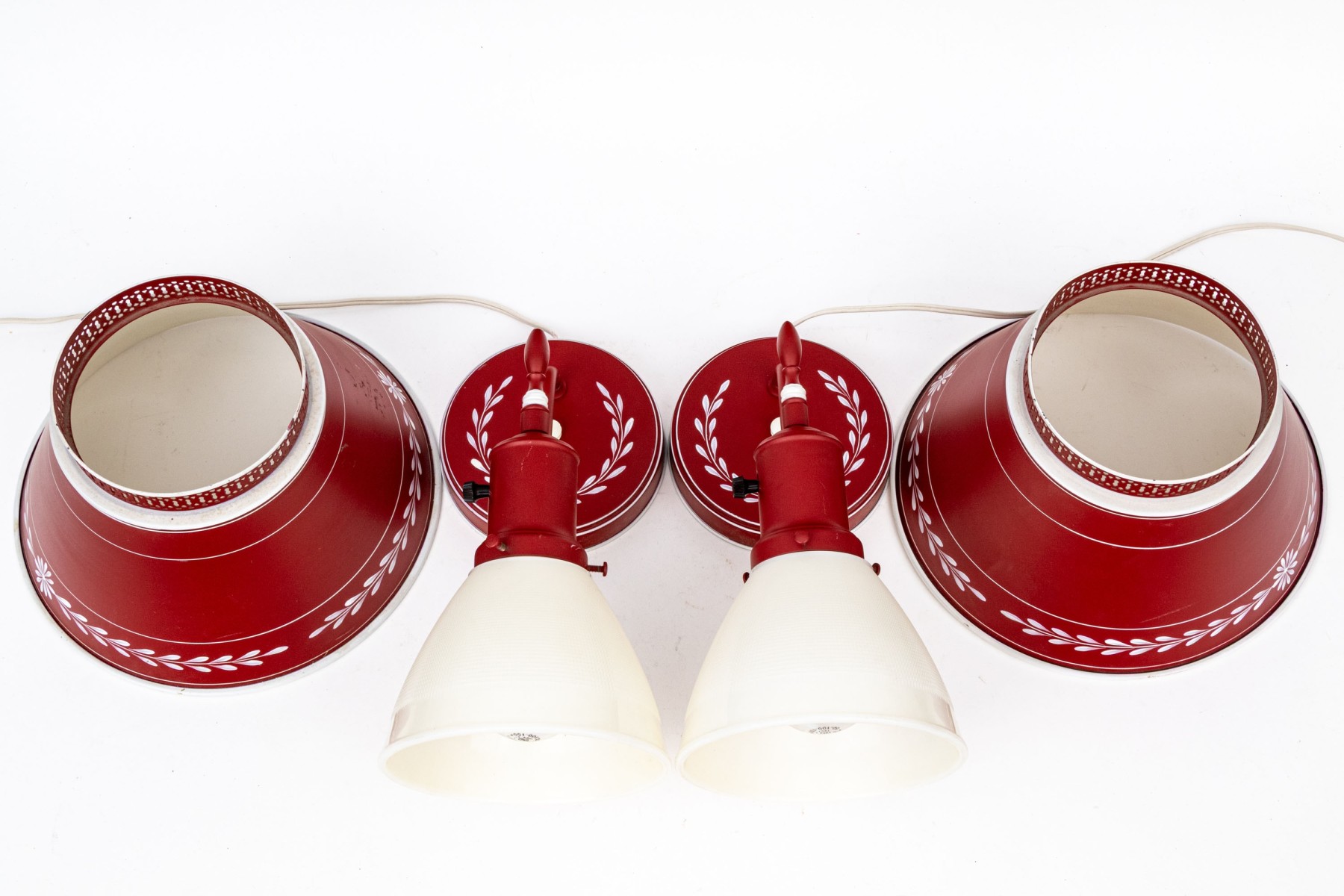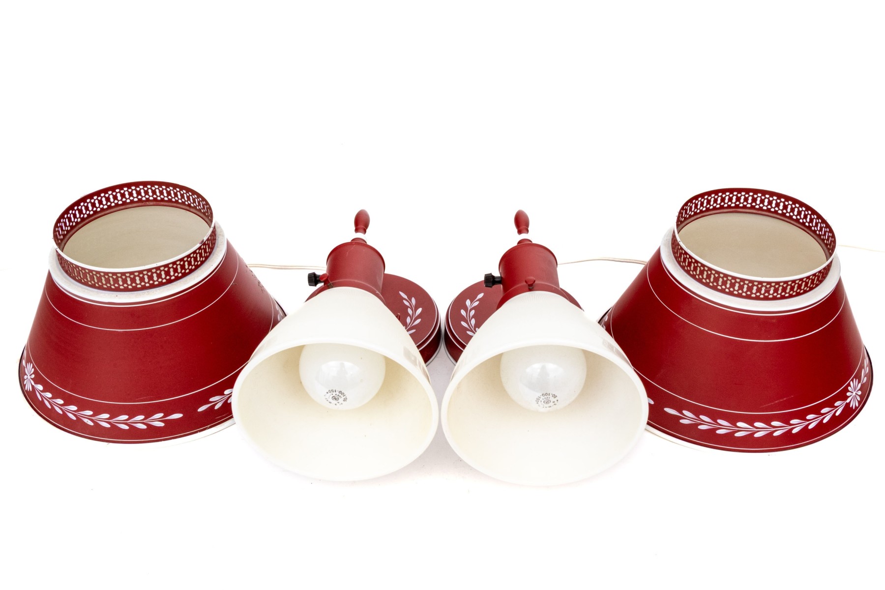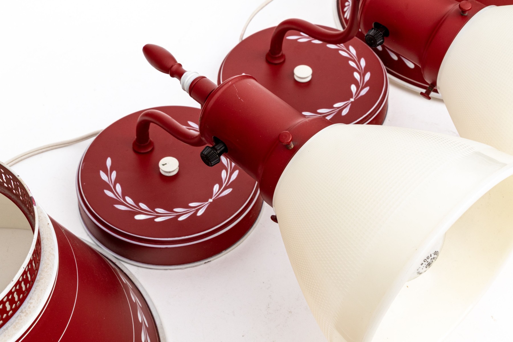 A handsome collection of red ground white decorated tole ware lighting. Includes a pair of shades with pierced openwork tops and white floral bands to the base trim. Together with a pair of wall sconces of the same stylistic decoration with red ground bodies and faux glass plastic shades