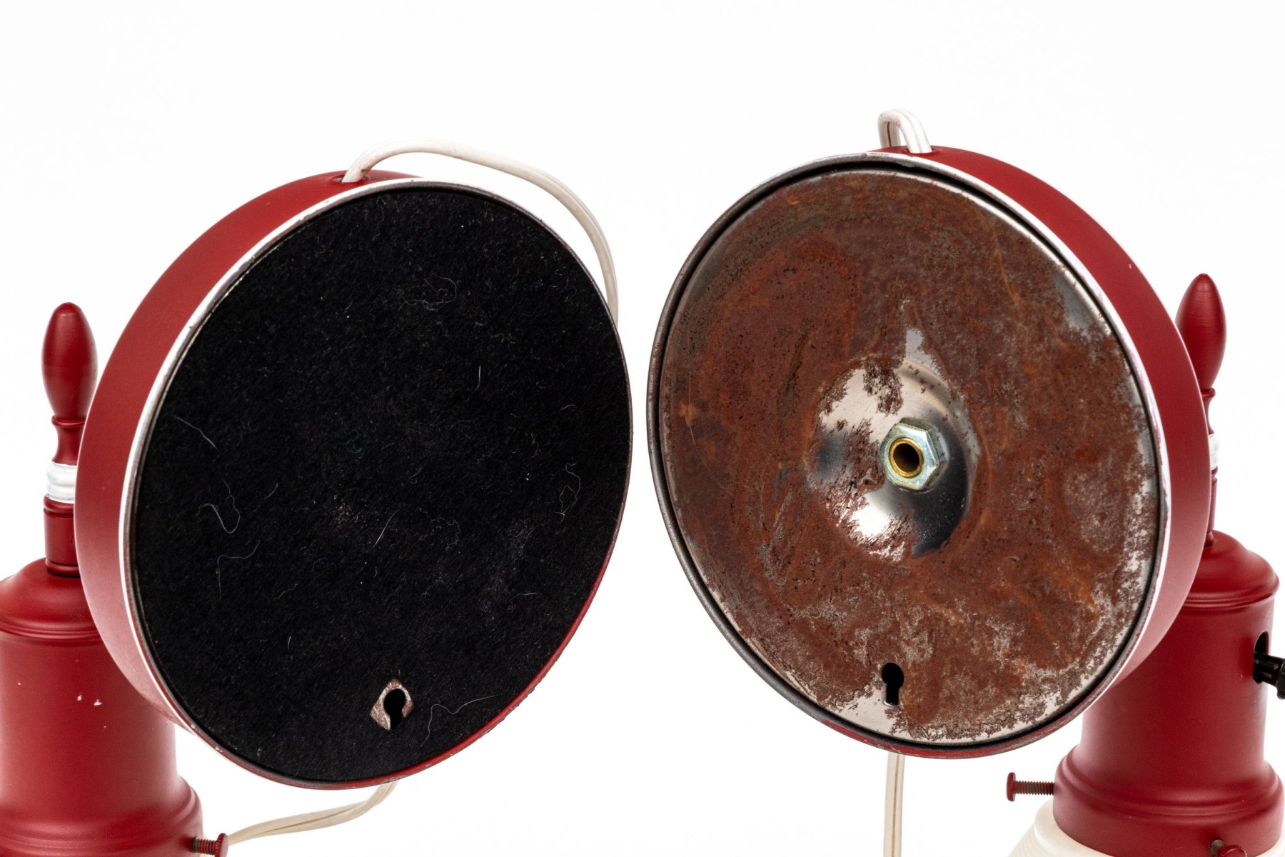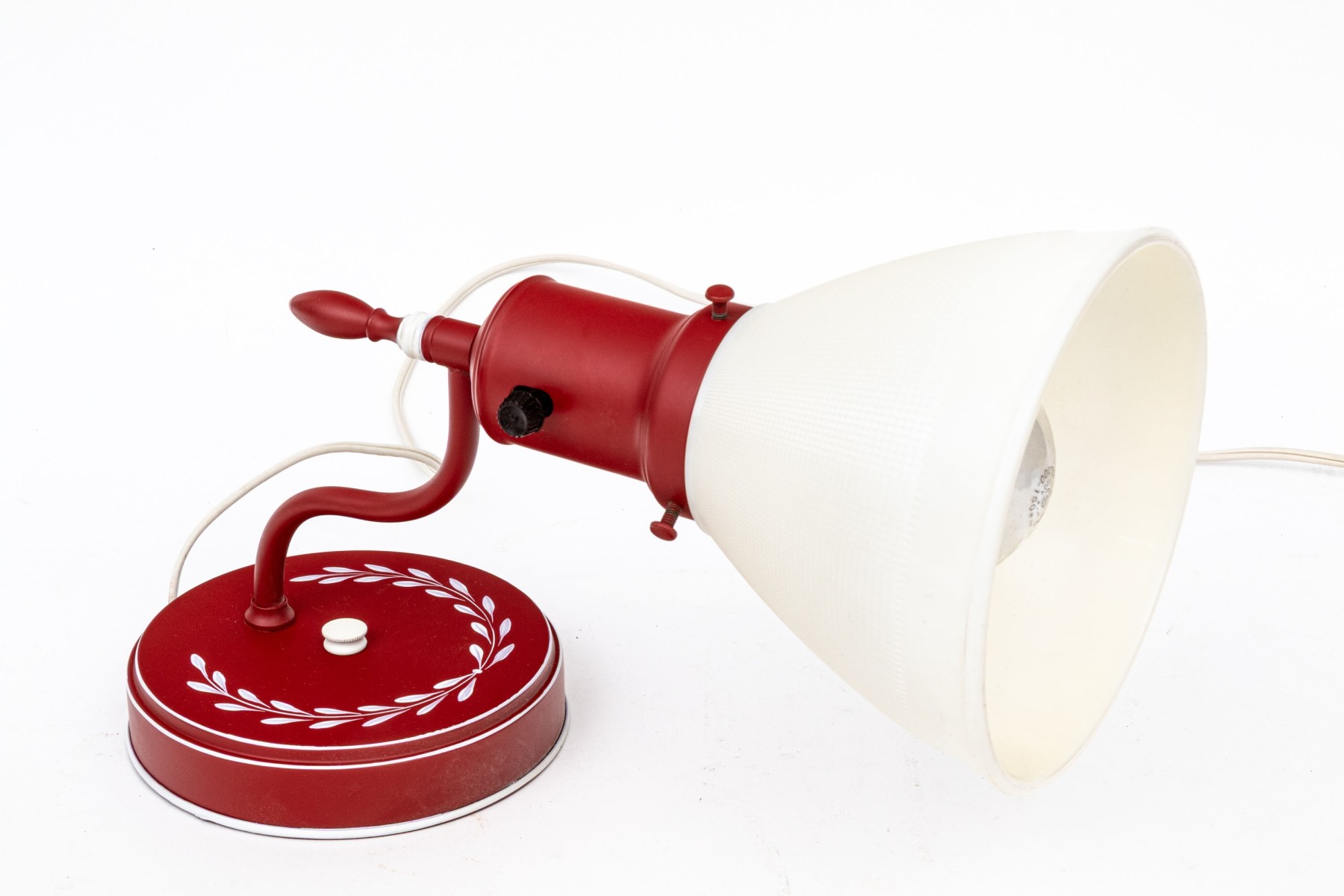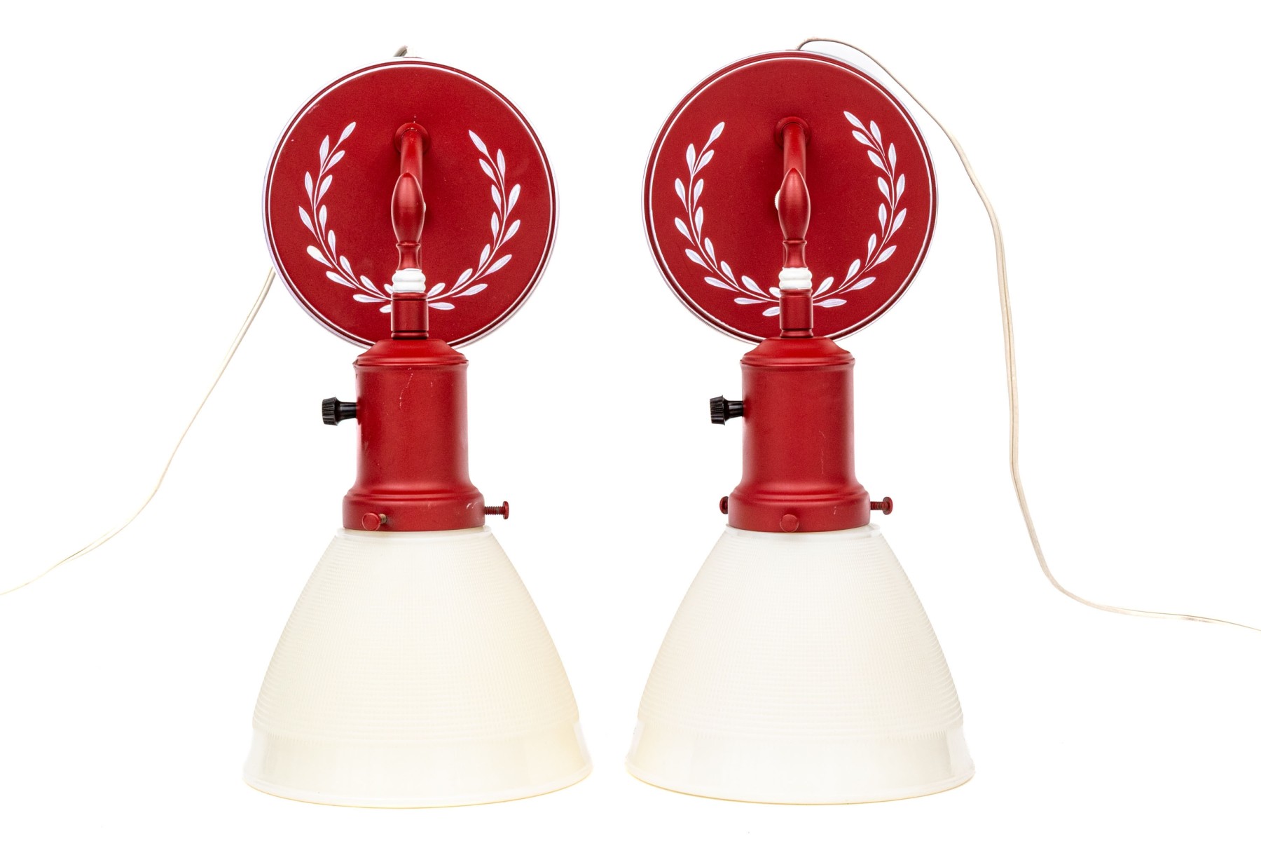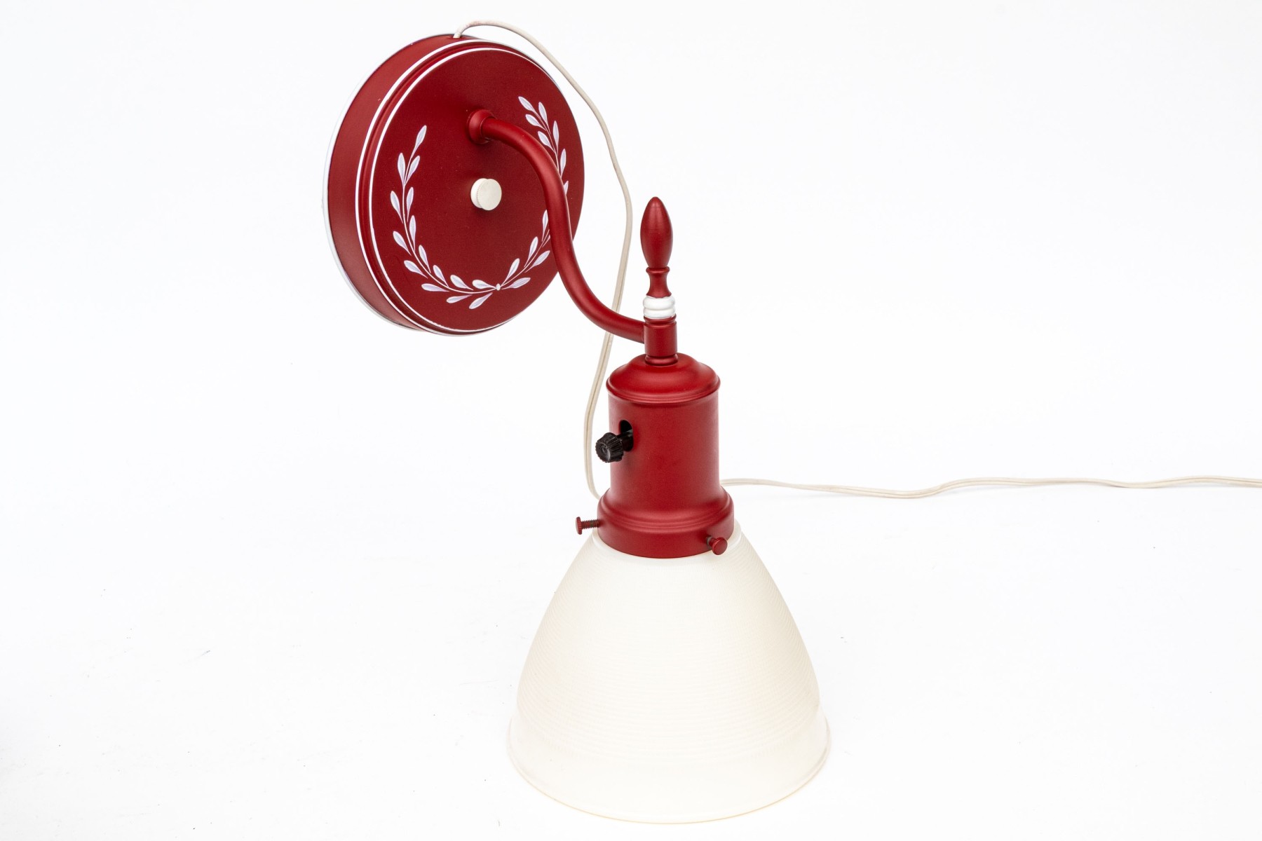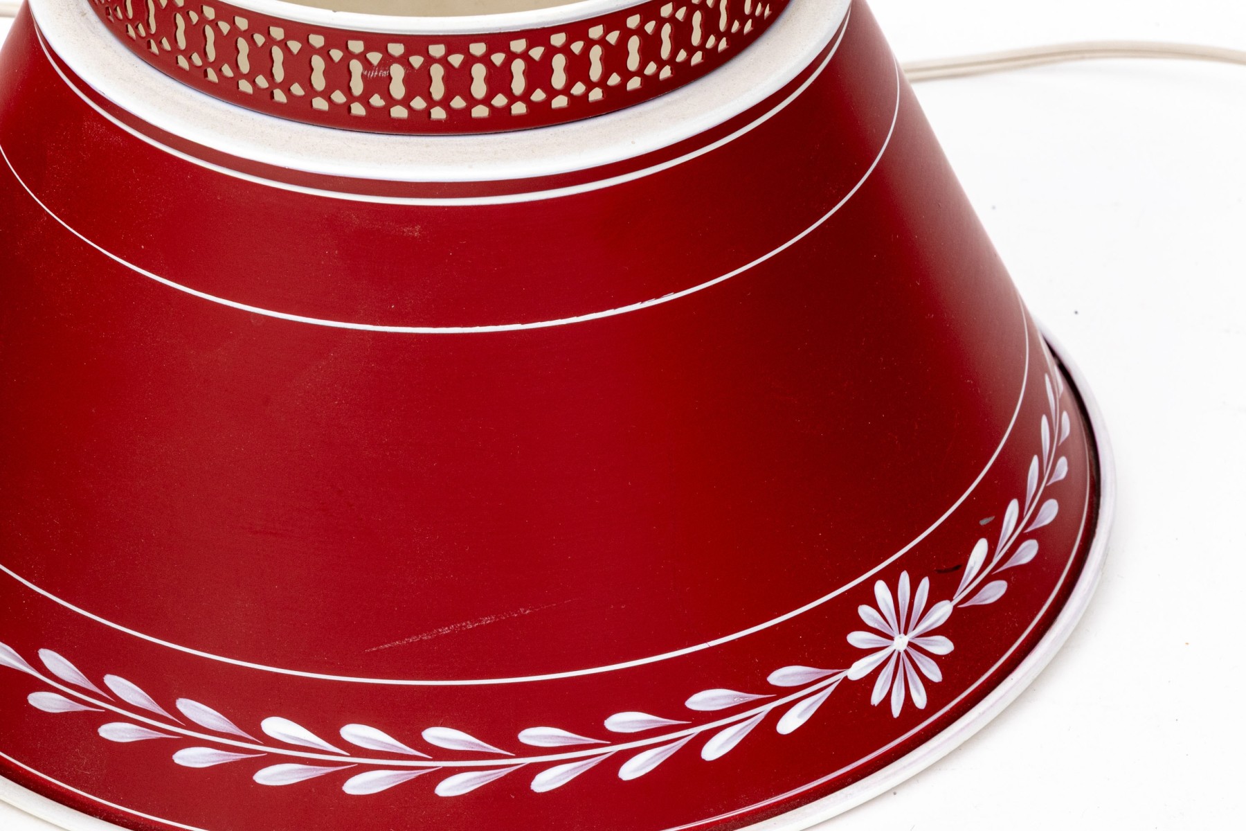 A handsome collection of red ground white decorated tole ware lighting. Includes a pair of shades with pierced openwork tops and white floral bands to the base trim. Together with a pair of wall sconces of the same stylistic decoration with red ground bodies and faux glass plastic shades