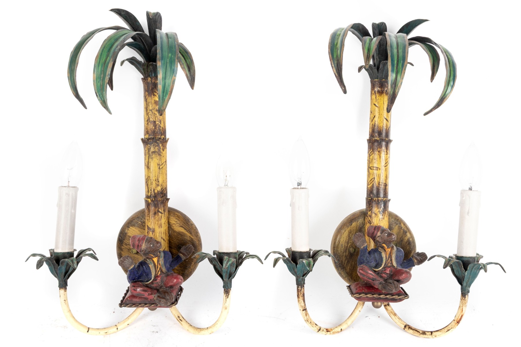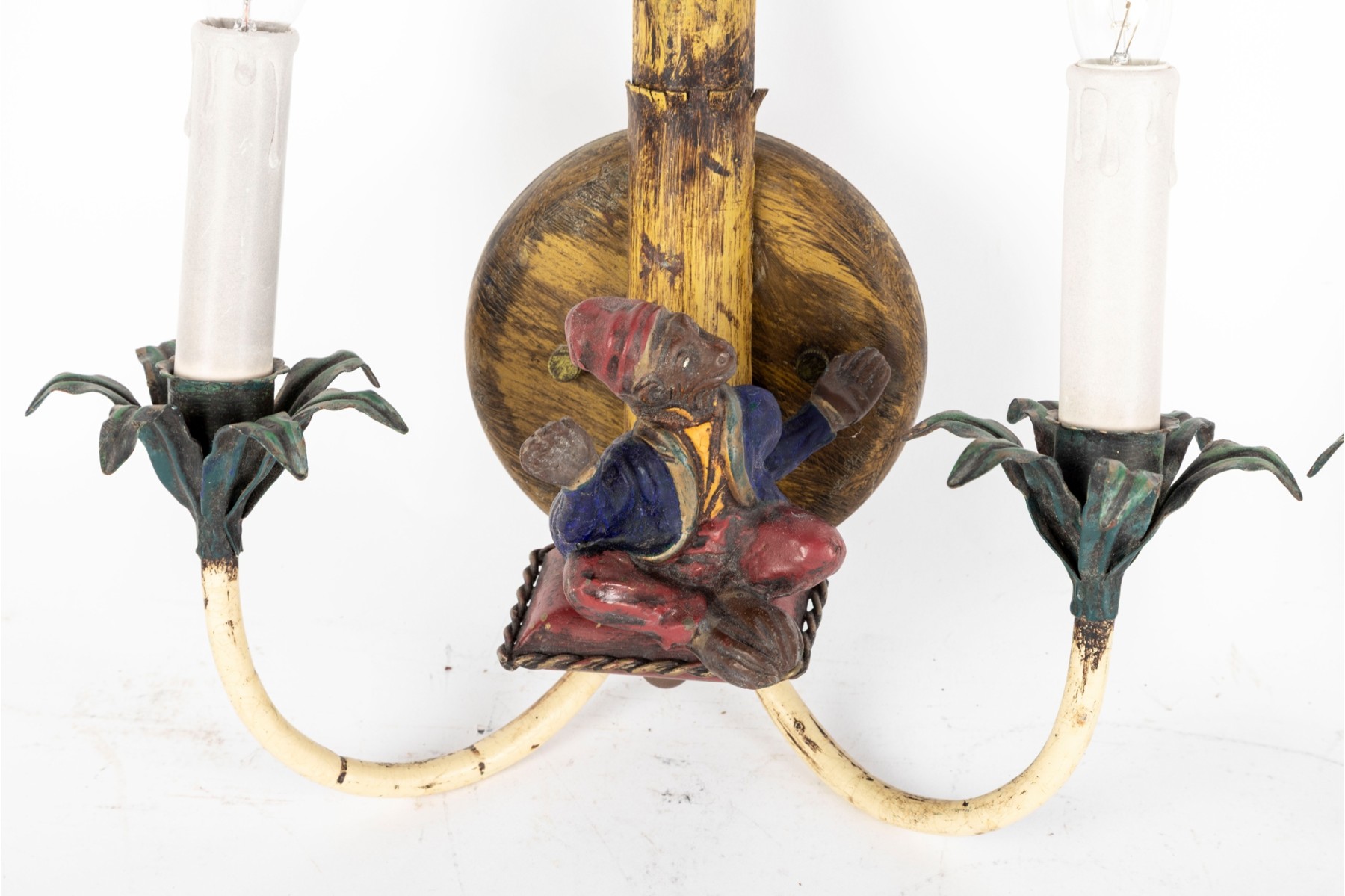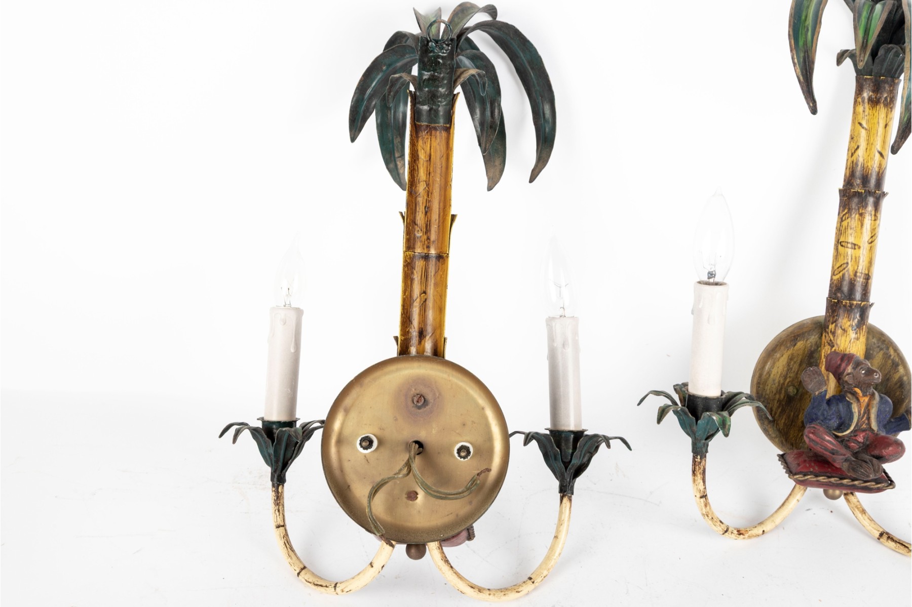 A charming pair of vintage tole metal wall sconces with excellent Hollywood Regency and chinoiserie appeal, showcasing palm tree columns with seated iron monkey bellhops heralding two arms with white electric candle sockets.