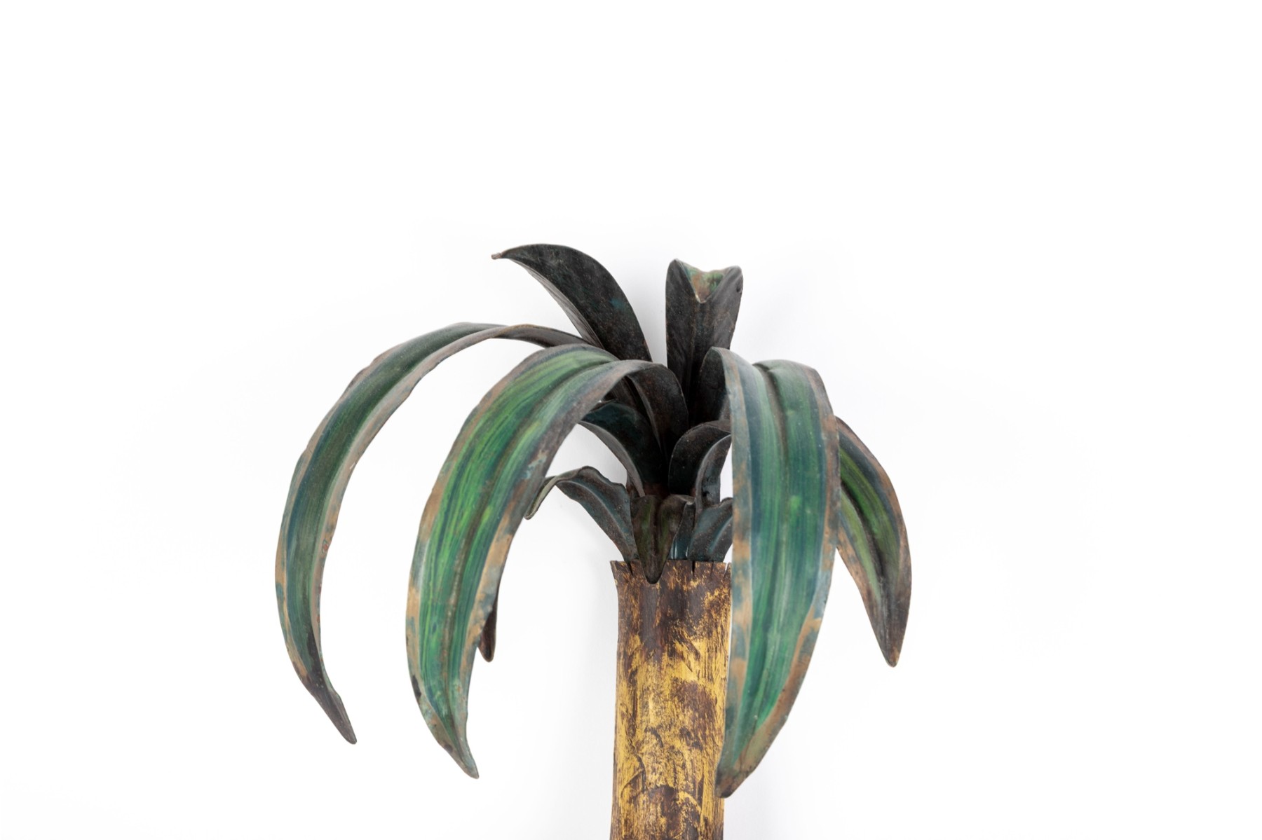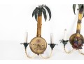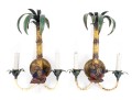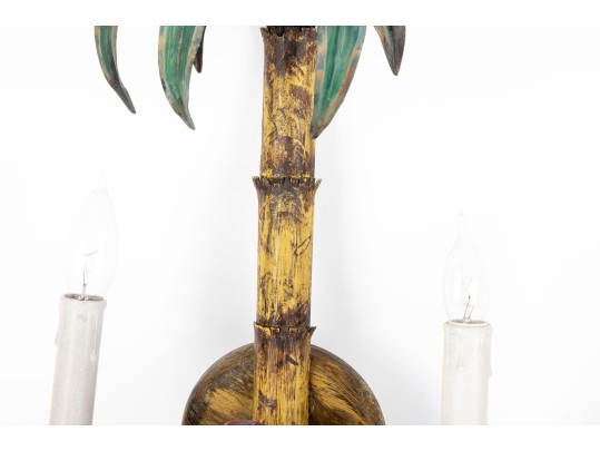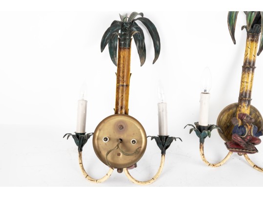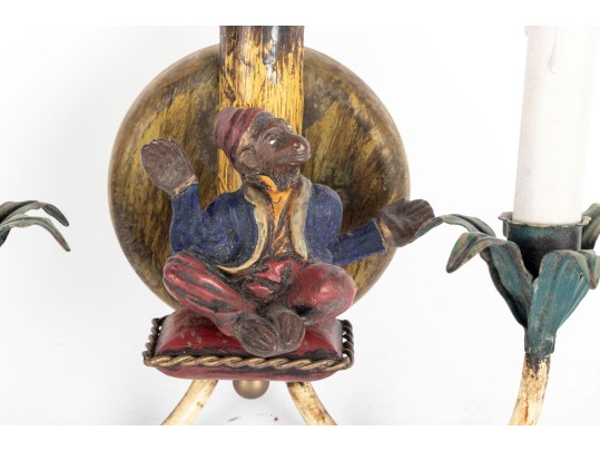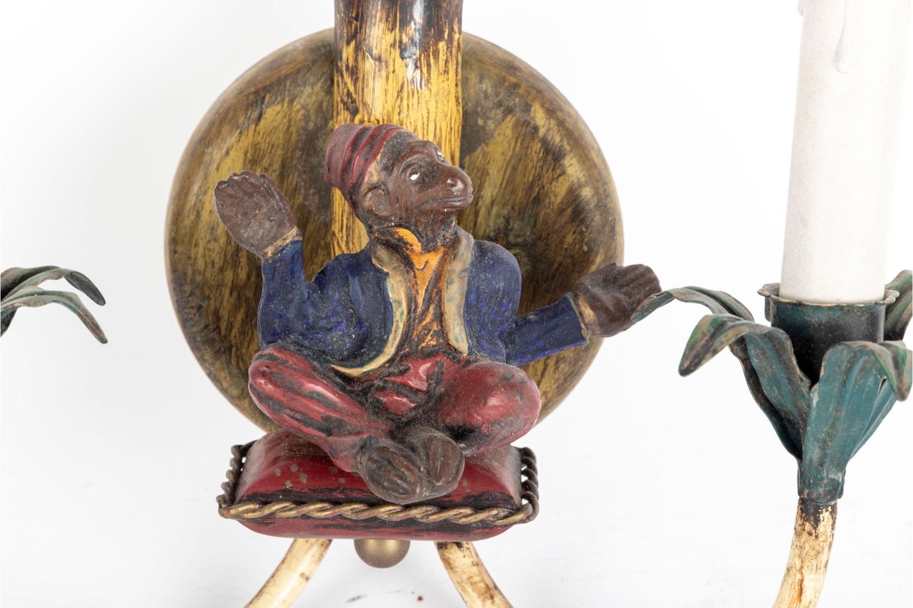 A charming pair of vintage tole metal wall sconces with excellent Hollywood Regency and chinoiserie appeal, showcasing palm tree columns with seated iron monkey bellhops heralding two arms with white electric candle sockets.
