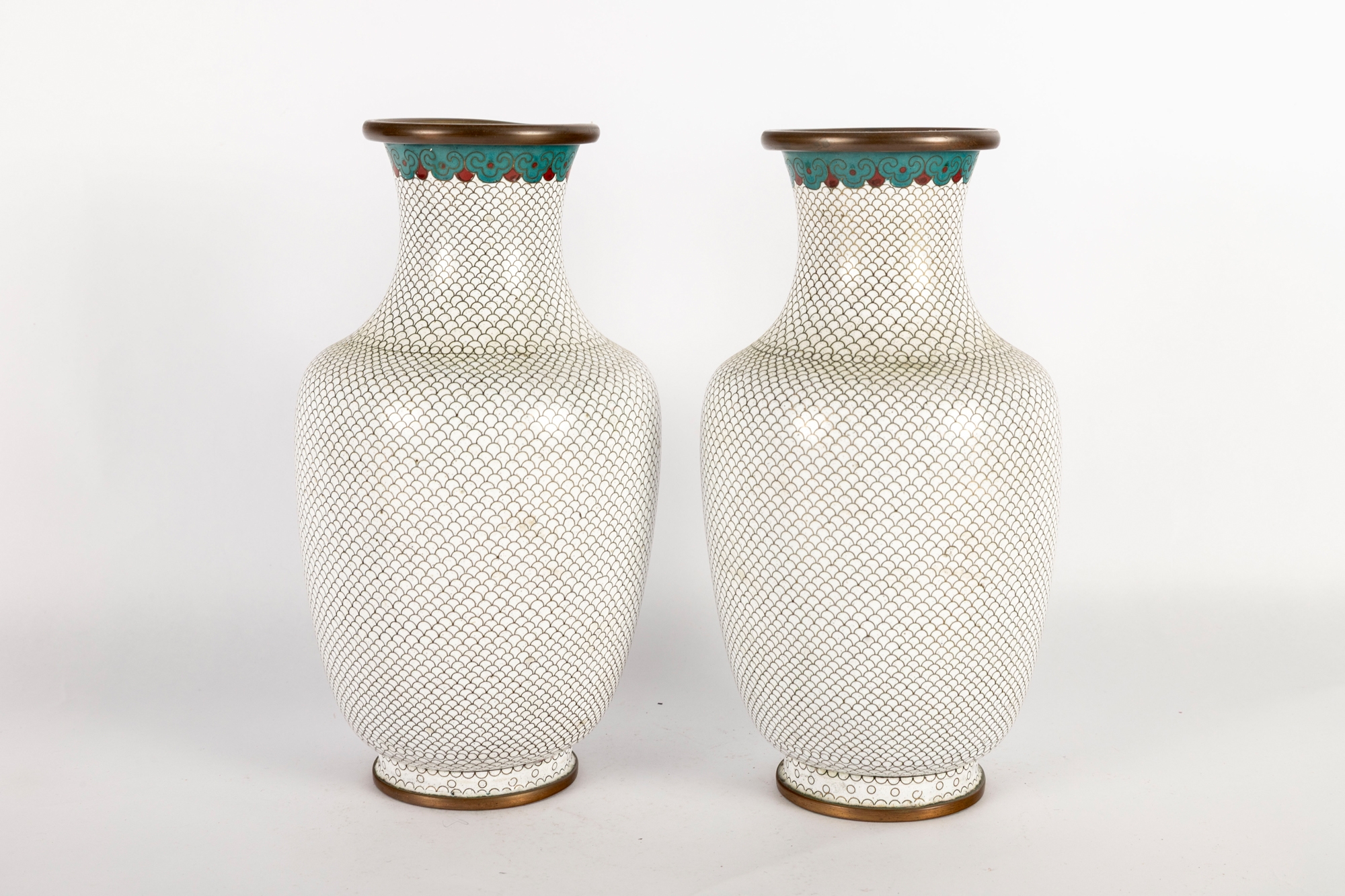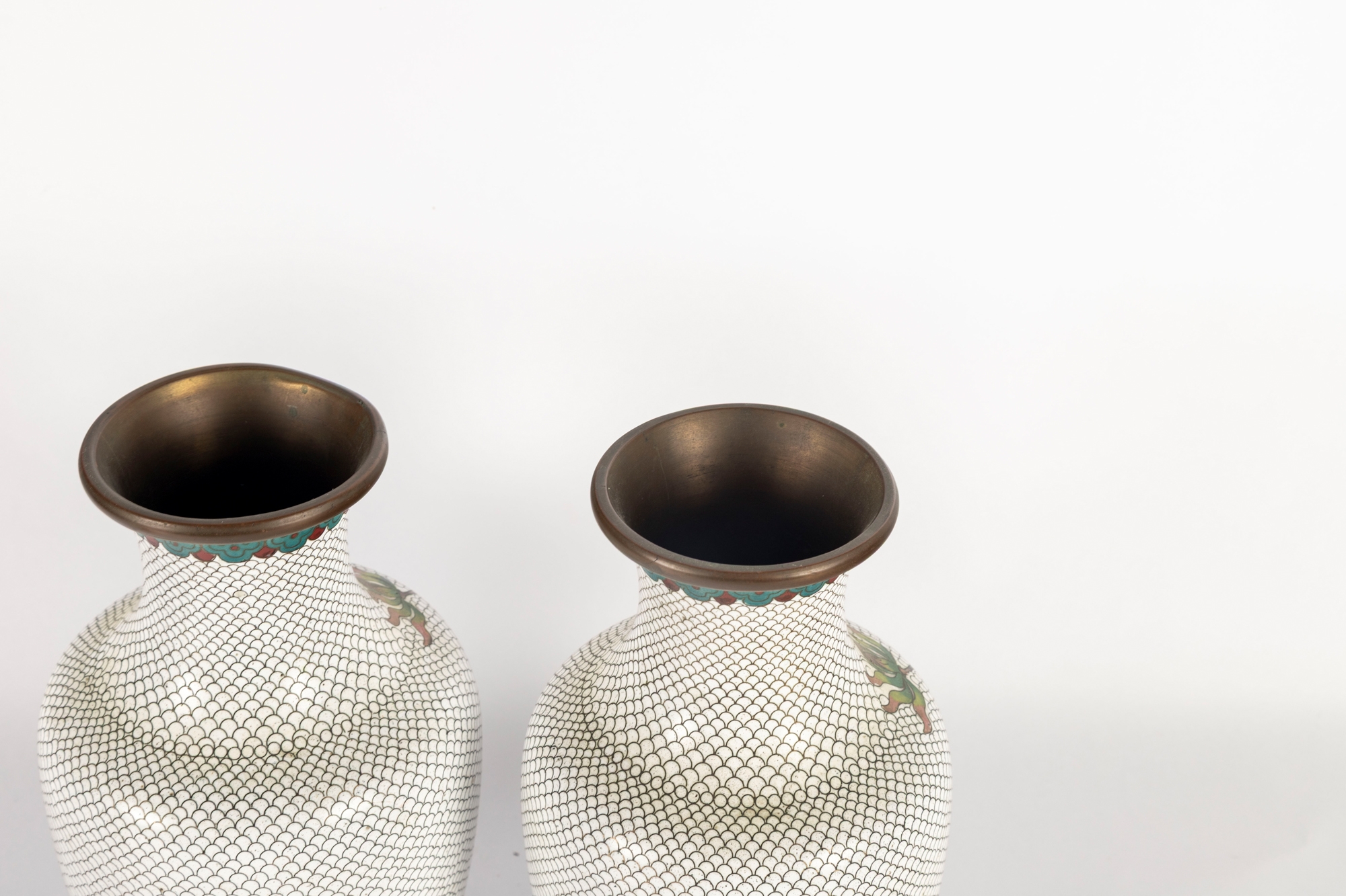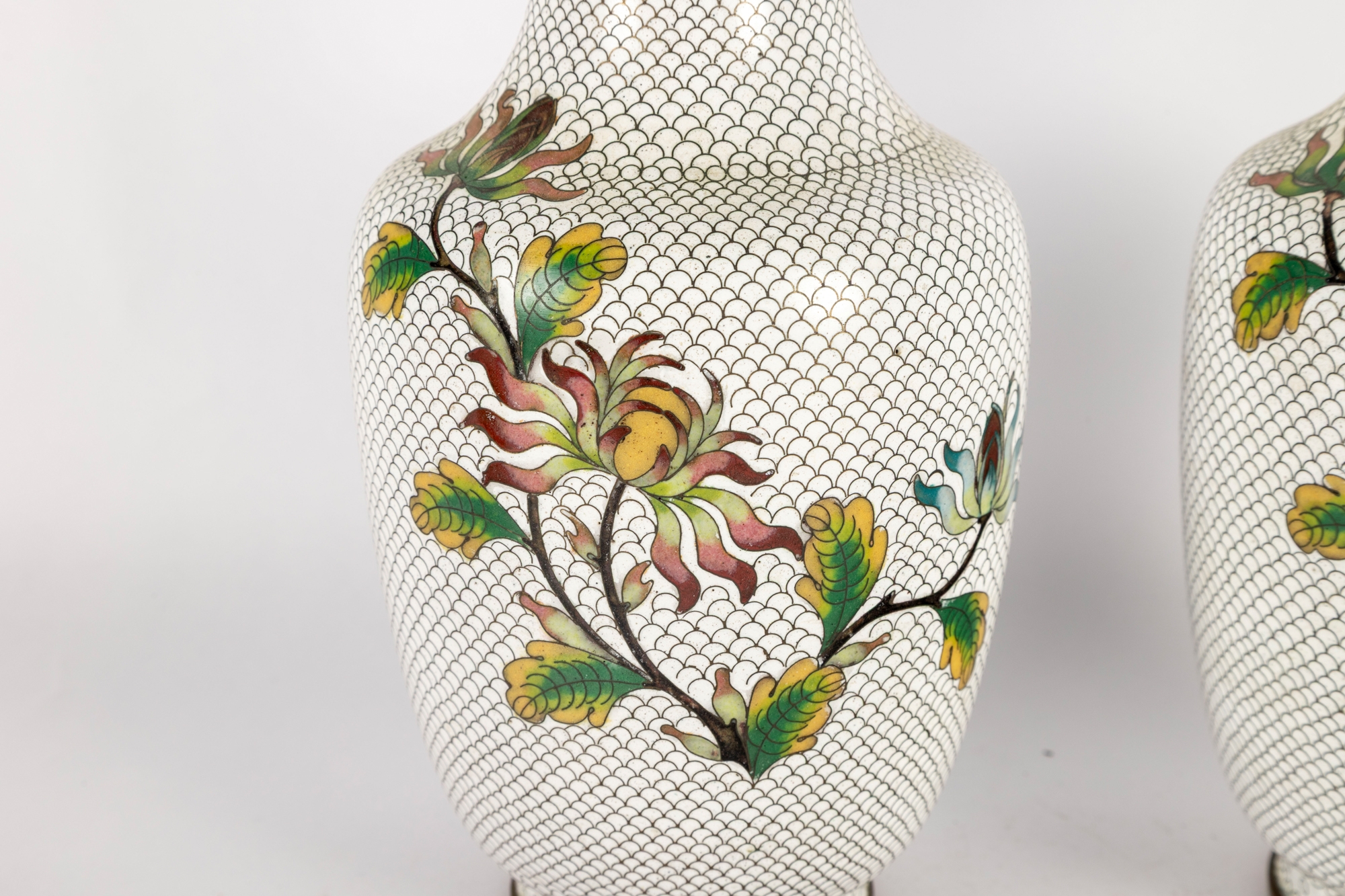 Beautiful pair of vintage cloisonné vases featuring hand-enameled chrysanthemum and foliage motifs in vibrant shades of green, yellow, and red against a classic white geometric background. Each vase is accented with brass rims and bases, and finished with intricate turquoise and red banding around the necks.