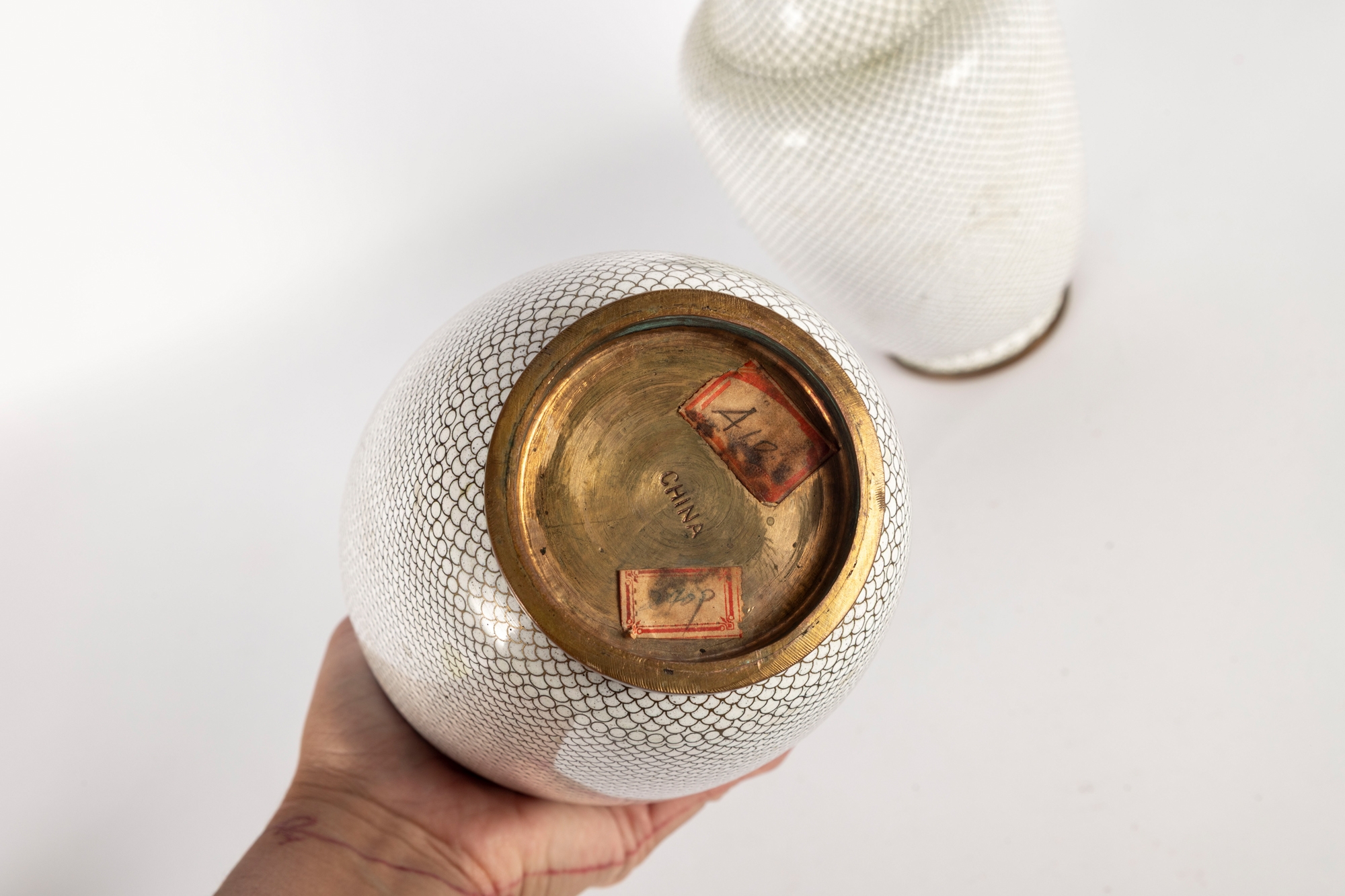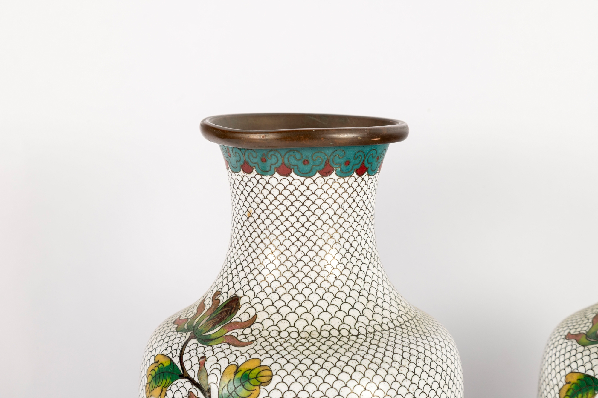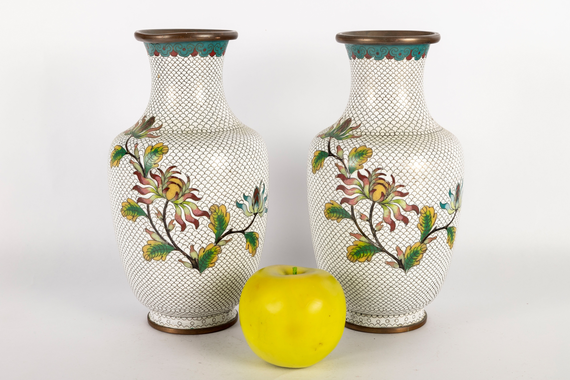 Beautiful pair of vintage cloisonné vases featuring hand-enameled chrysanthemum and foliage motifs in vibrant shades of green, yellow, and red against a classic white geometric background. Each vase is accented with brass rims and bases, and finished with intricate turquoise and red banding around the necks.