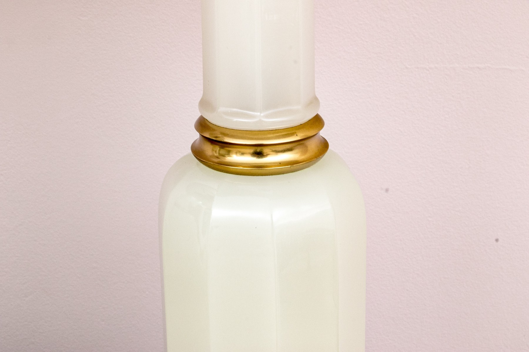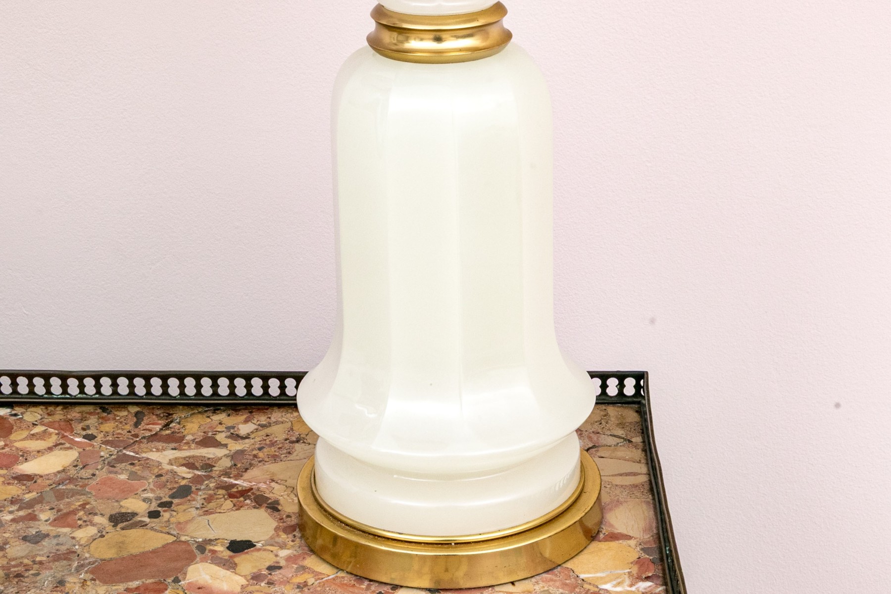 A delightful pair of vintage Warren Kessler white milk glass table lamps with elegant bottle forms, showcasing tall, faceted columns with brass bands over elongated bell form bodies on circular brass bases. Surmounted by white fabric shades.