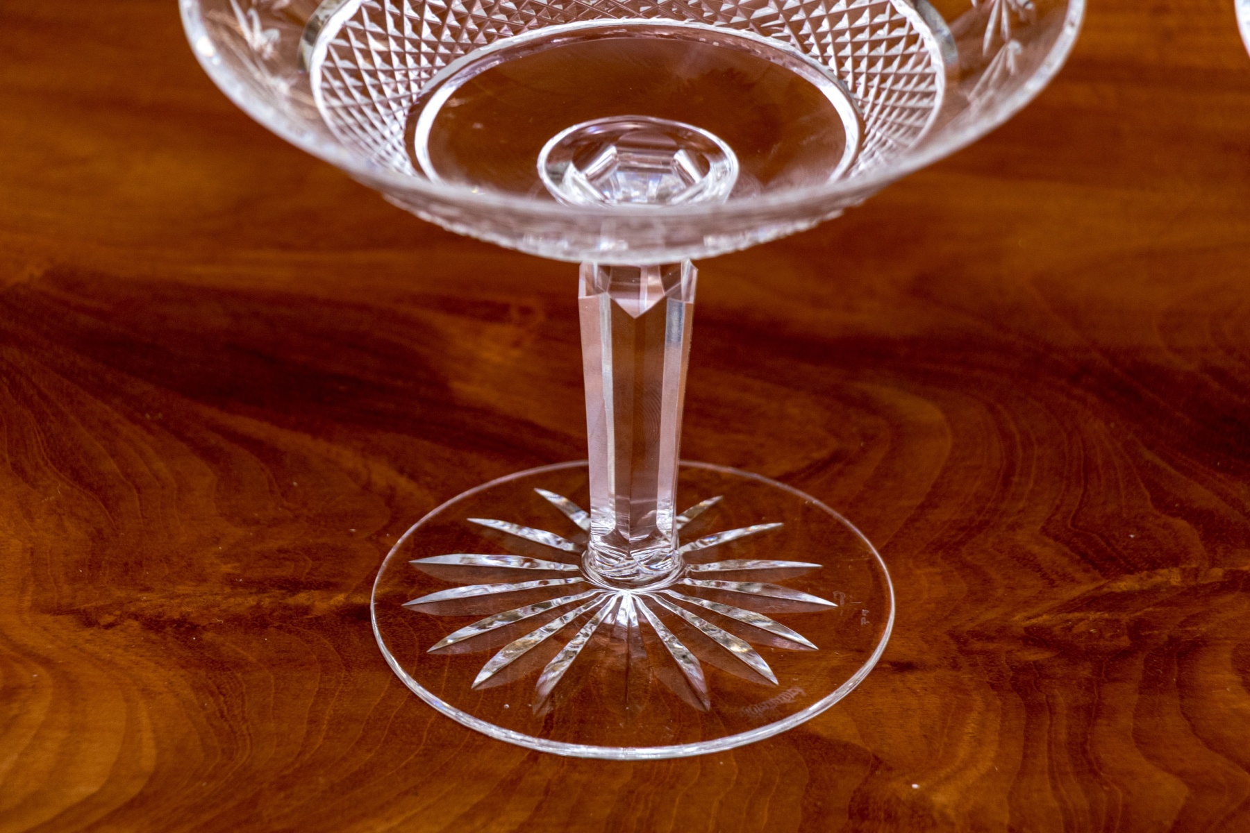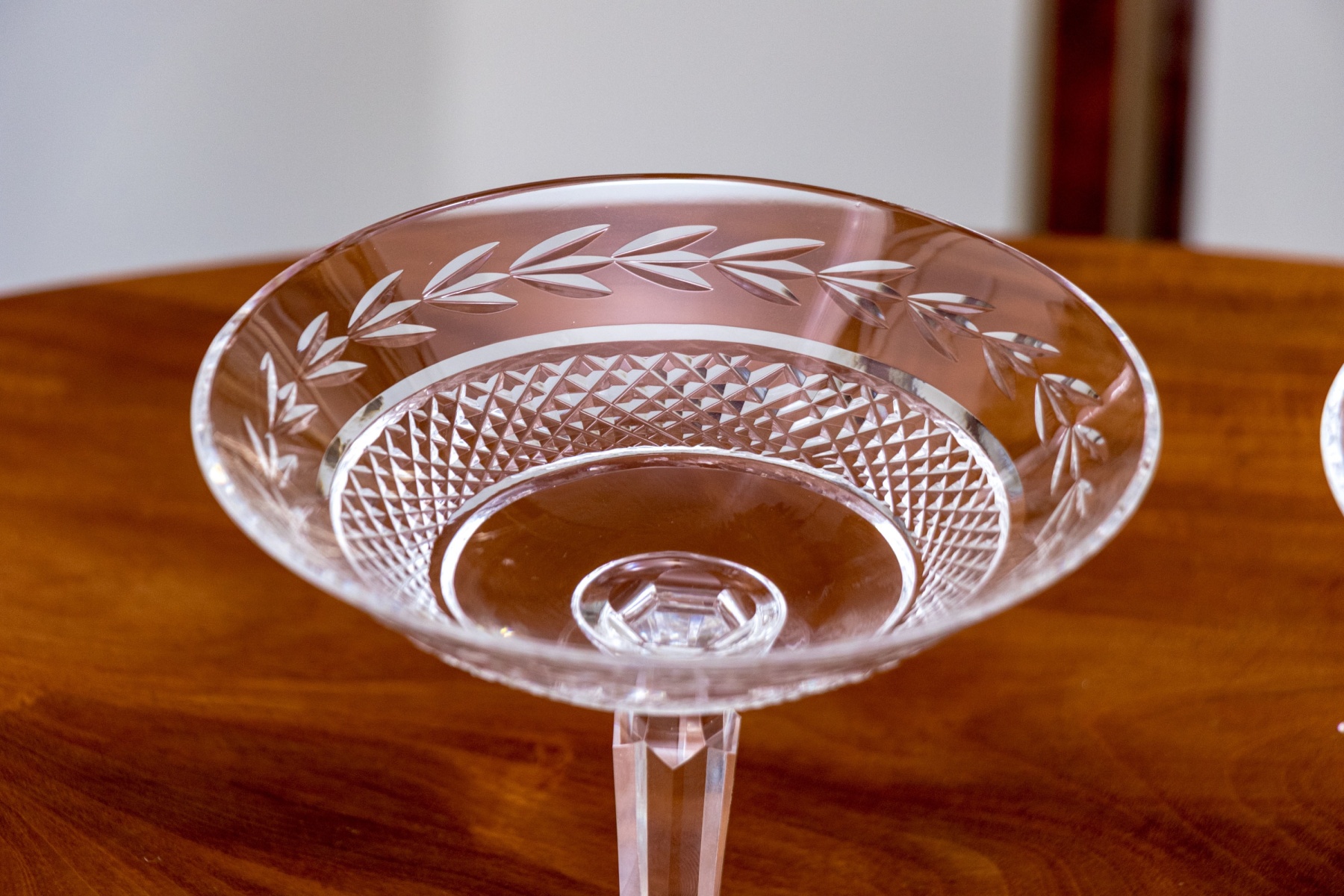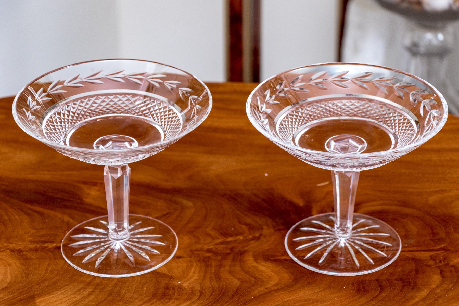 An elegant pair of Waterford Crystal "Glandore" compotes raised on circular feet with faceted stems and wide conical bowls decorated with cross cut bands and foliate cut borders. Marked underfoot.
