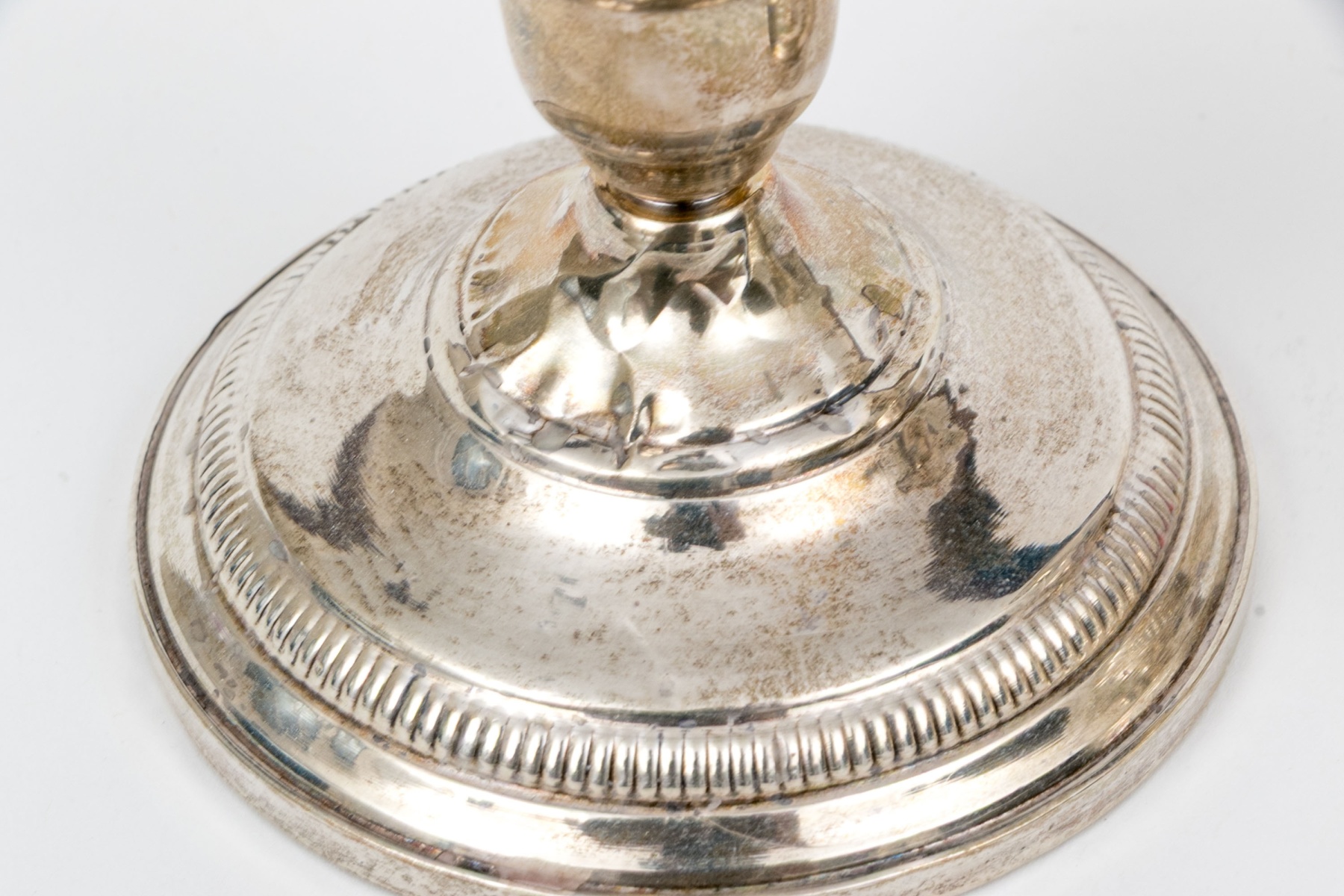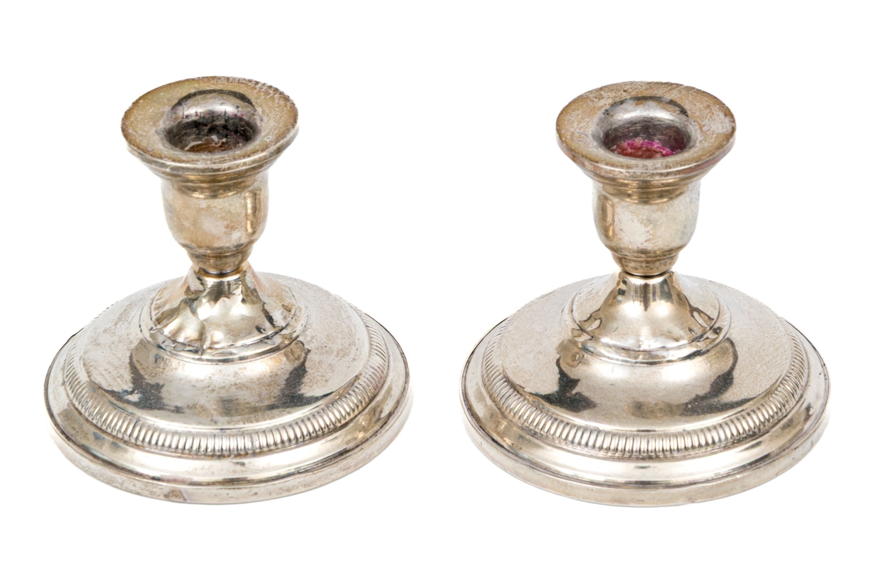 A quality pair of weighted sterling silver candlesticks in classic form, showcasing circular base with short stems and nozzles.