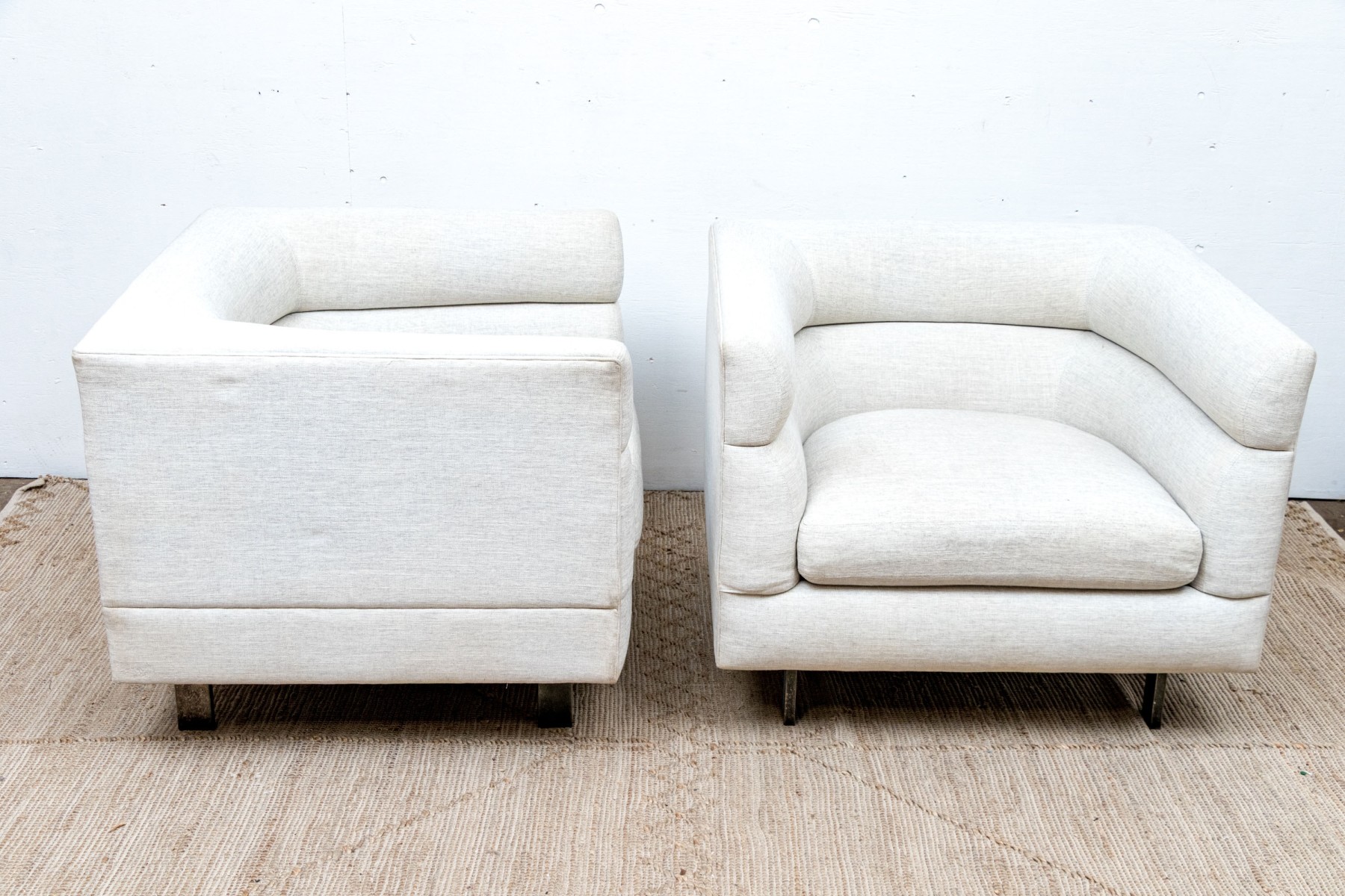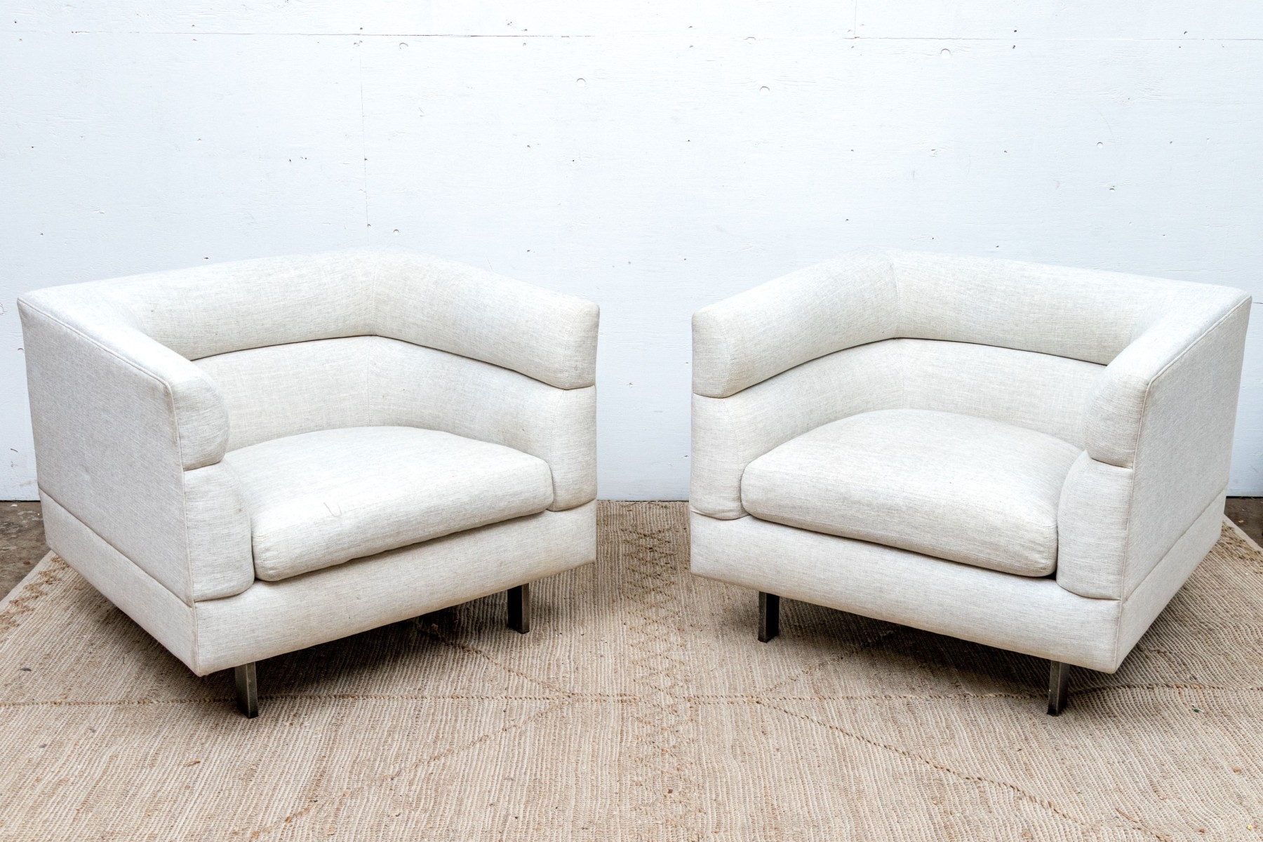Standing on patinated metallic legs the angular framed upholstered lounge chairs have straight backs, and straight arms.