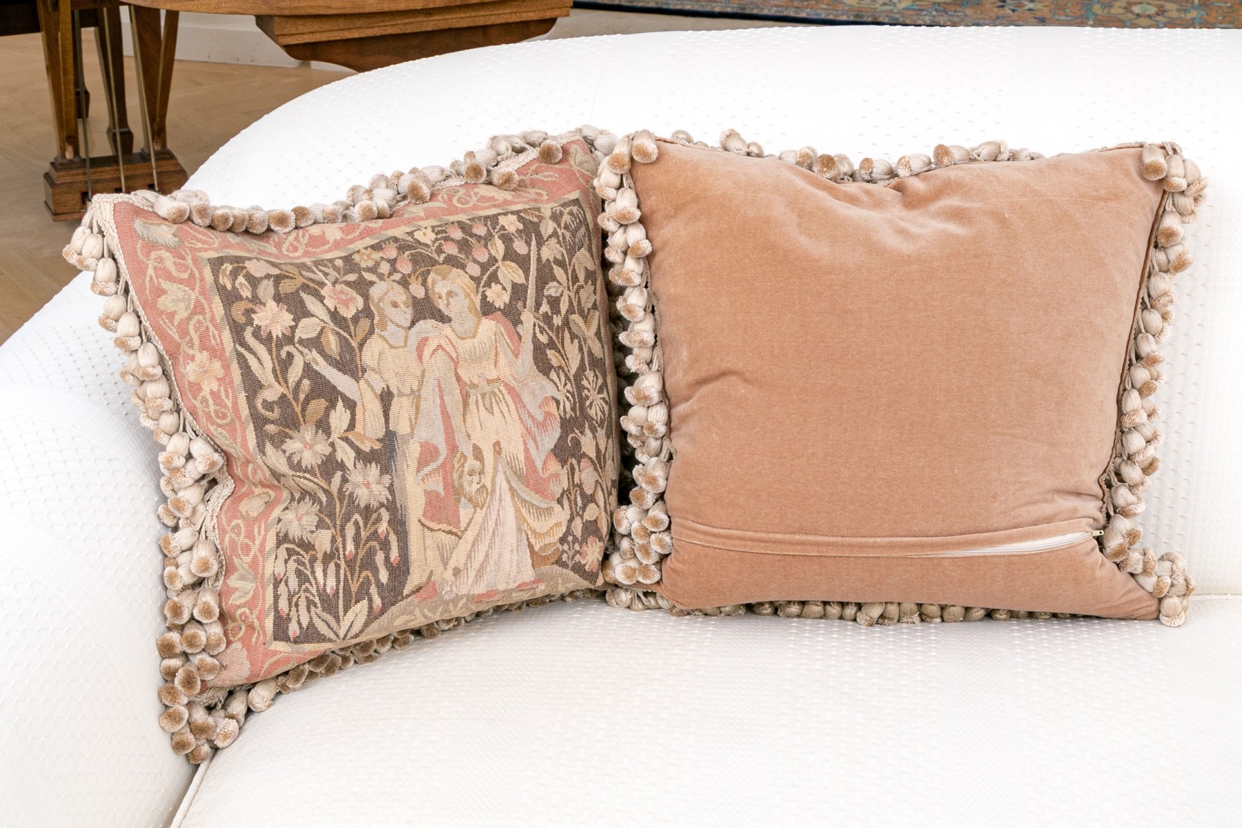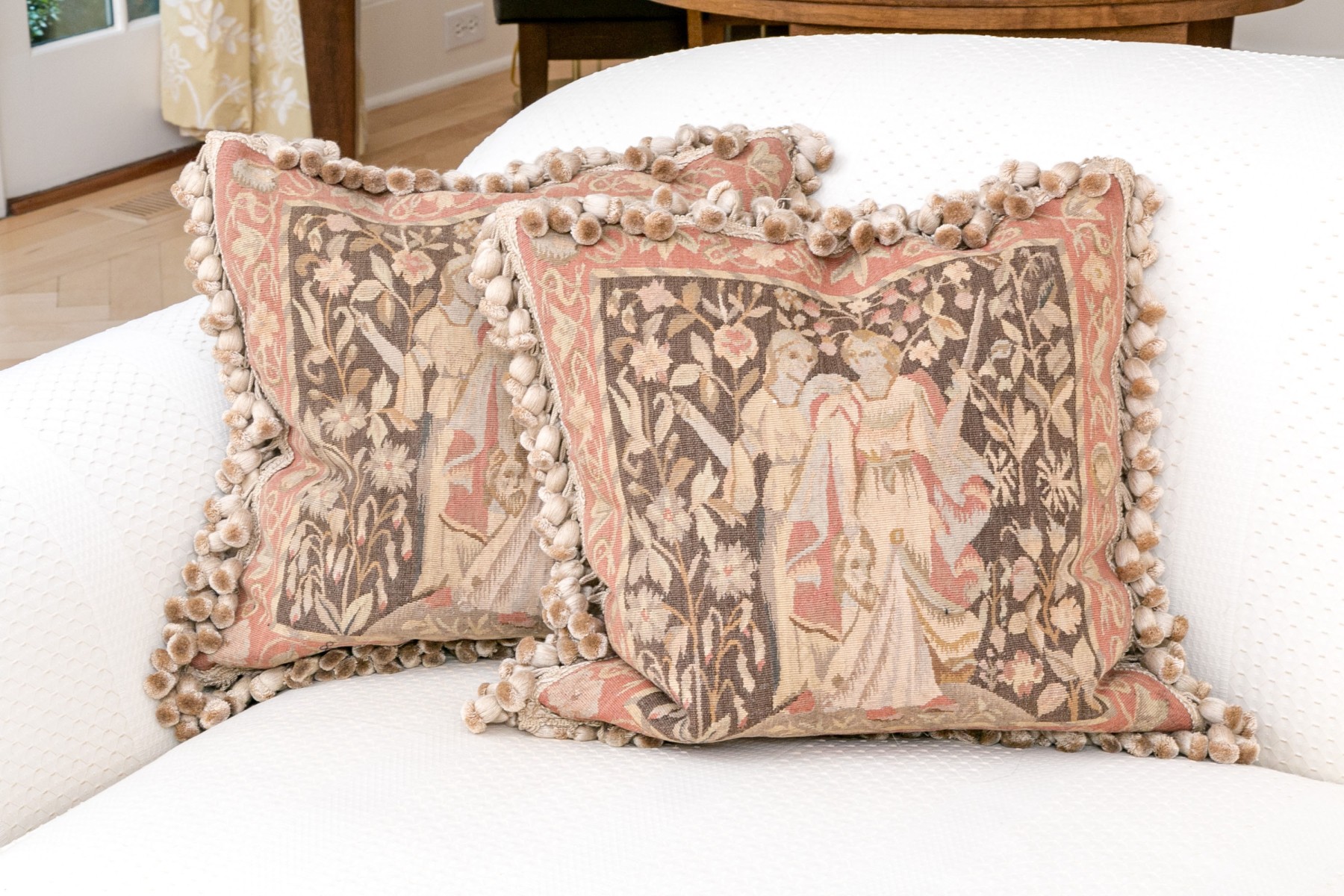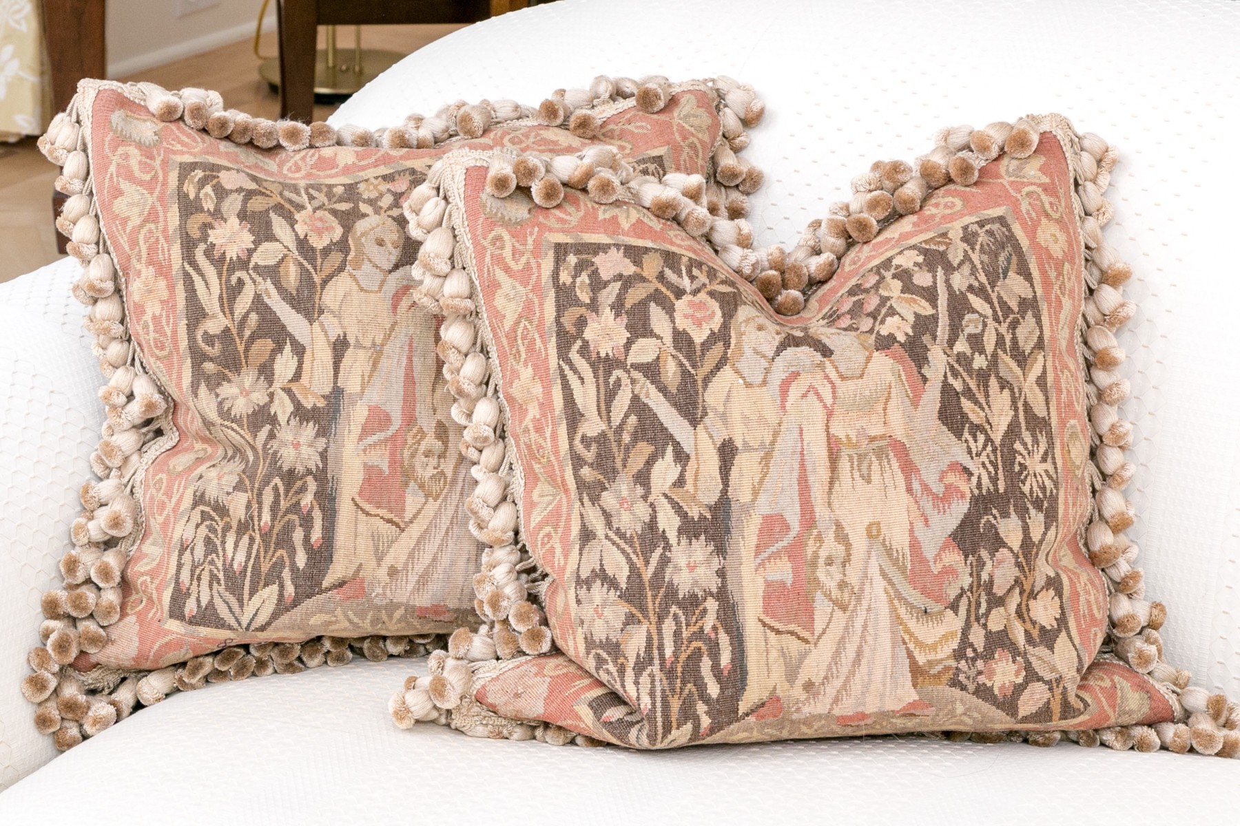 Pair of wool tapestry accent pillows with 2 figures in a garden, possibly Judith cutting off the head of Holofernes. The pillows with tassel ball decoration, cotton velveteen backing with zippered opening. Insert comprised of 95% feathers and 5% down.
