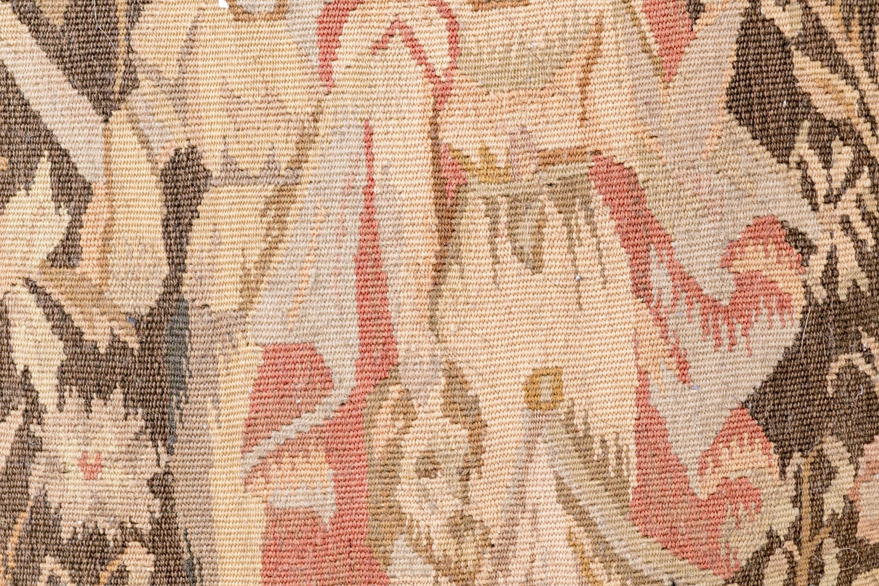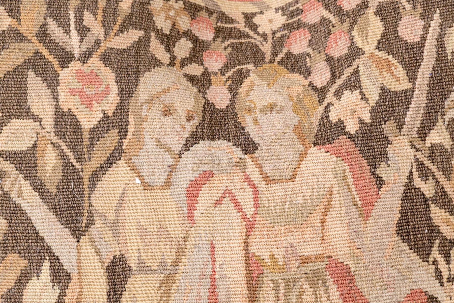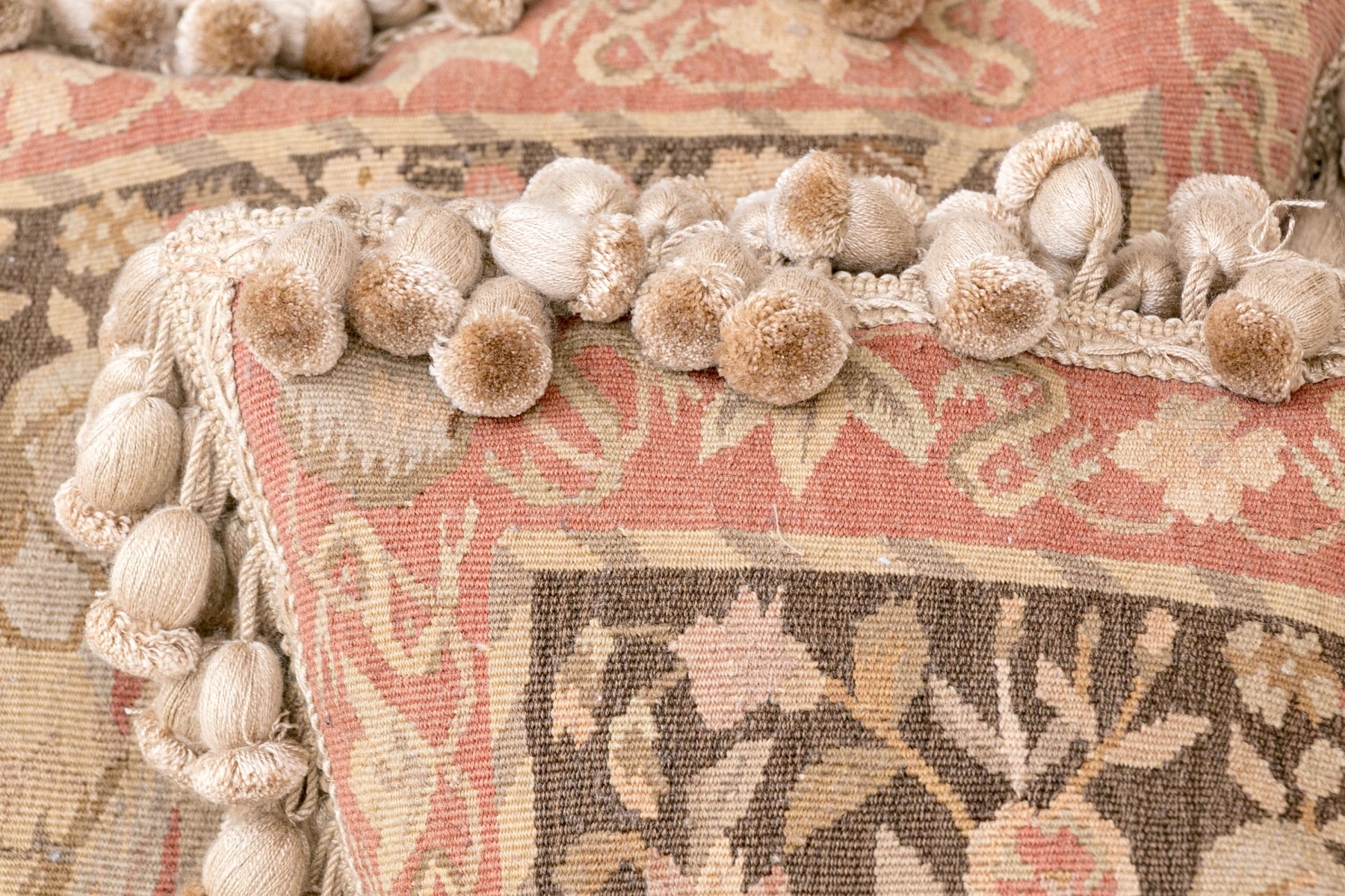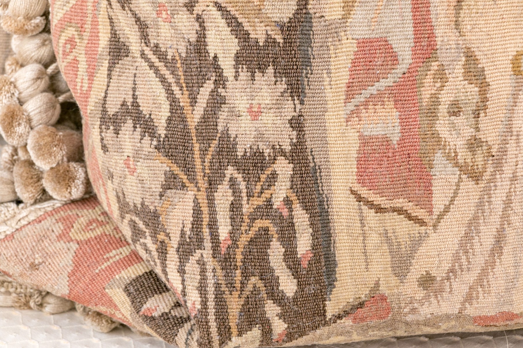 Pair of wool tapestry accent pillows with 2 figures in a garden, possibly Judith cutting off the head of Holofernes. The pillows with tassel ball decoration, cotton velveteen backing with zippered opening. Insert comprised of 95% feathers and 5% down.