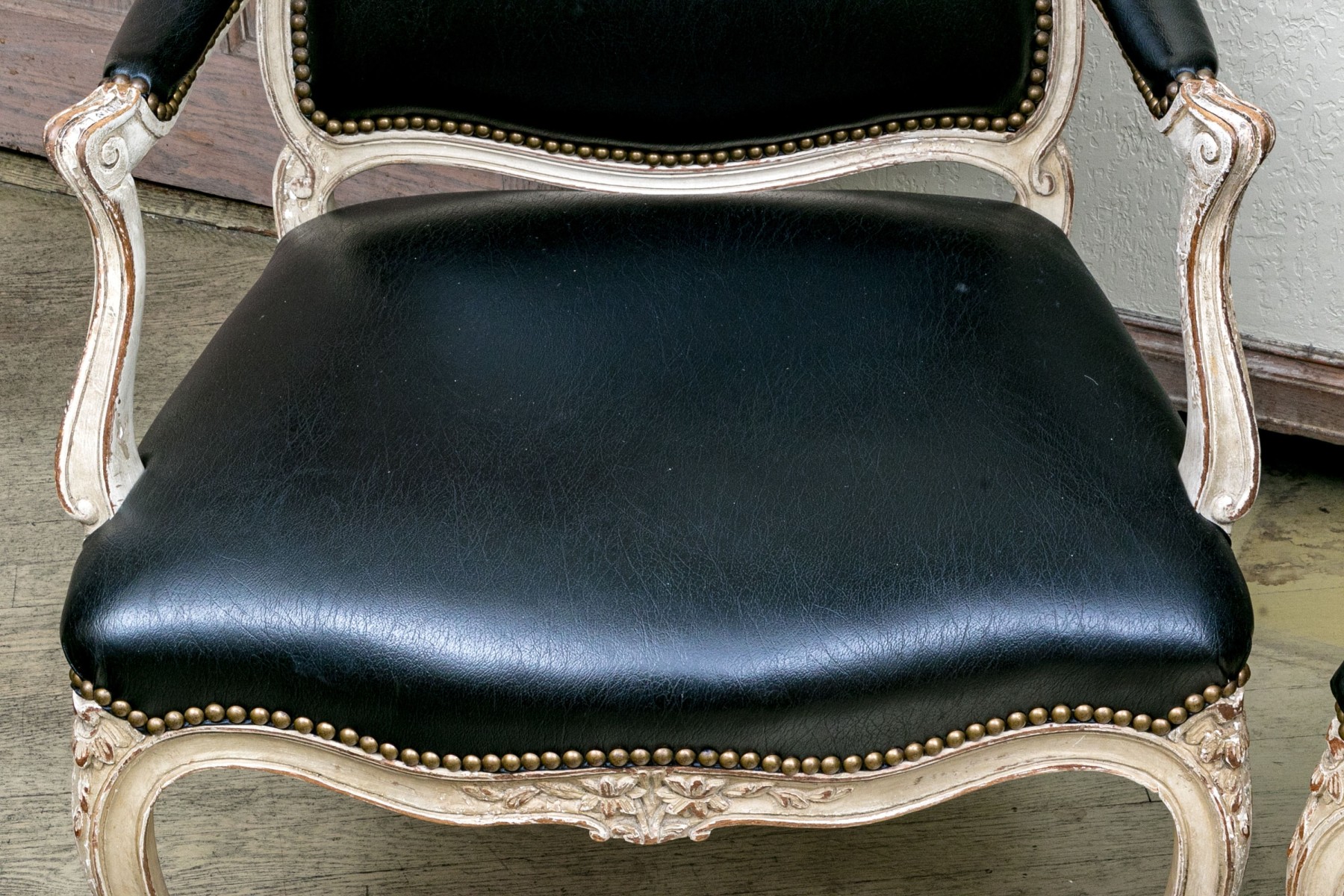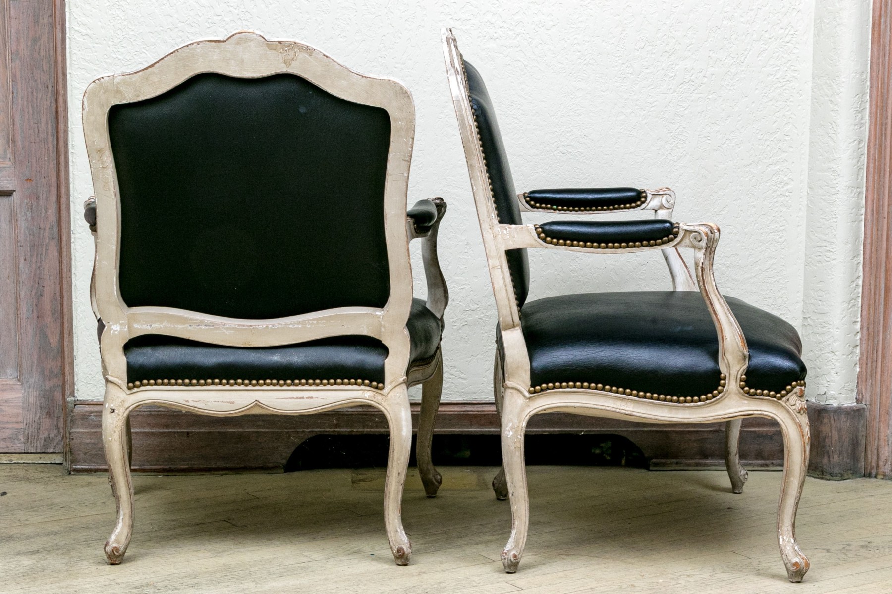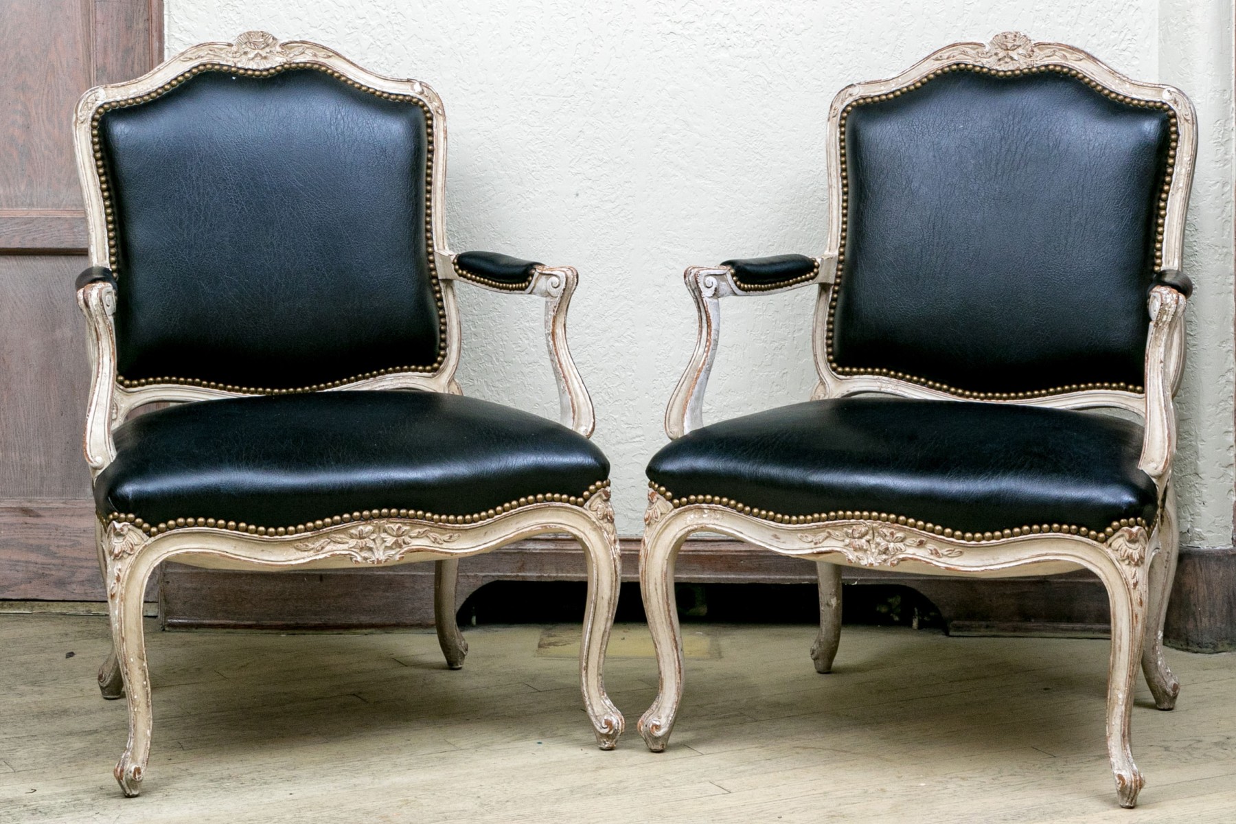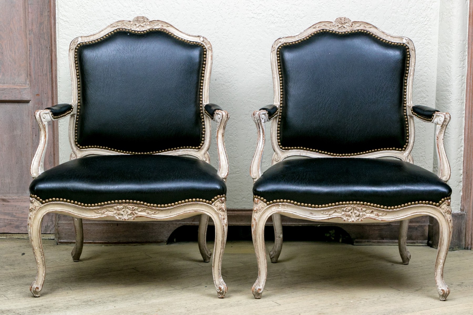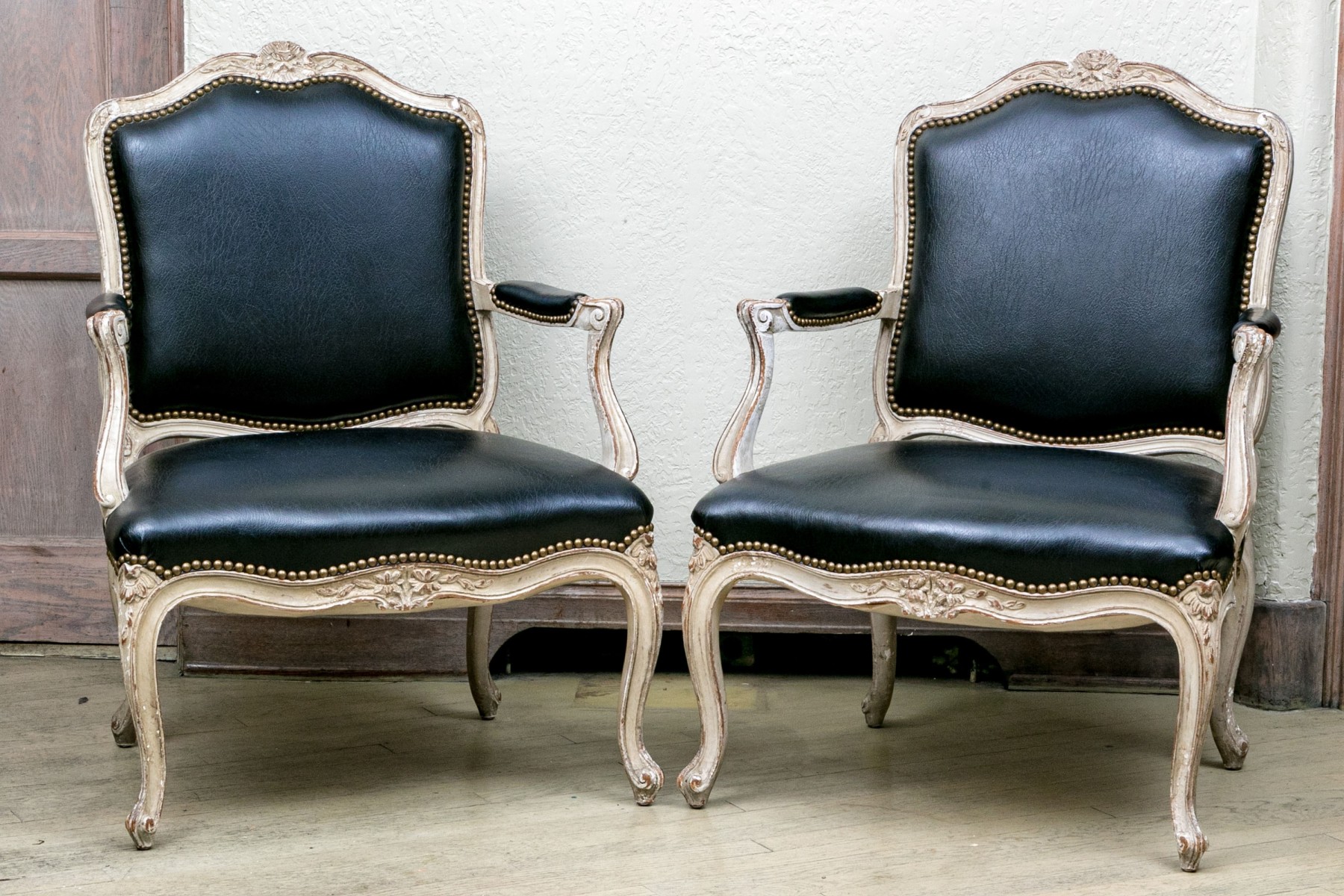 A stylish pair of Louis XV style fauteuils blending traditional forms with sleek, contemporary flare. The chairs feature rustic, whitewashed framed with floral crests over serpentine toprails that echo the elegant curves of the arms and legs. Upholstered in rich black leather for excellent visual contrast. The upholstery is lined with brass nailhead trims, heralding cabriole legs with foliate carved details around the knees and aprons.