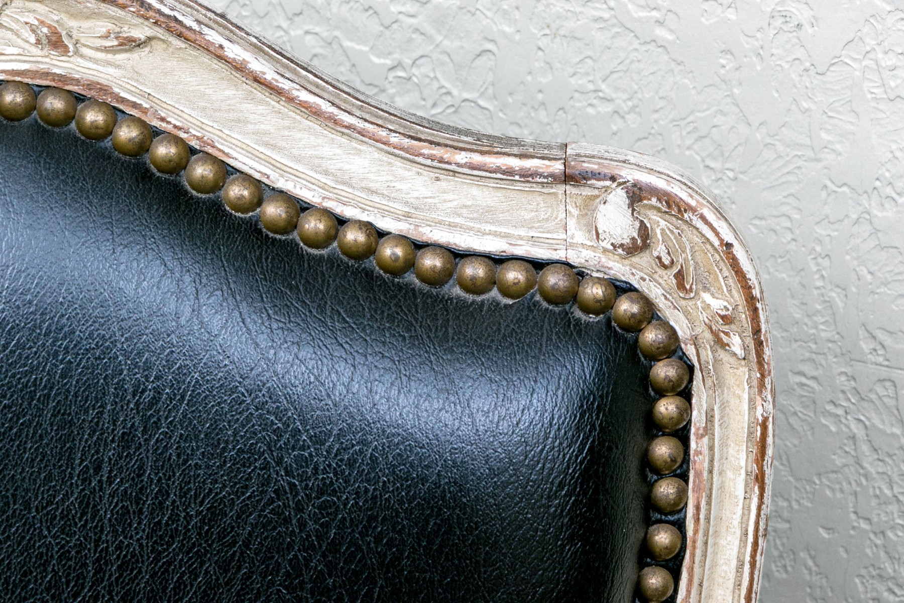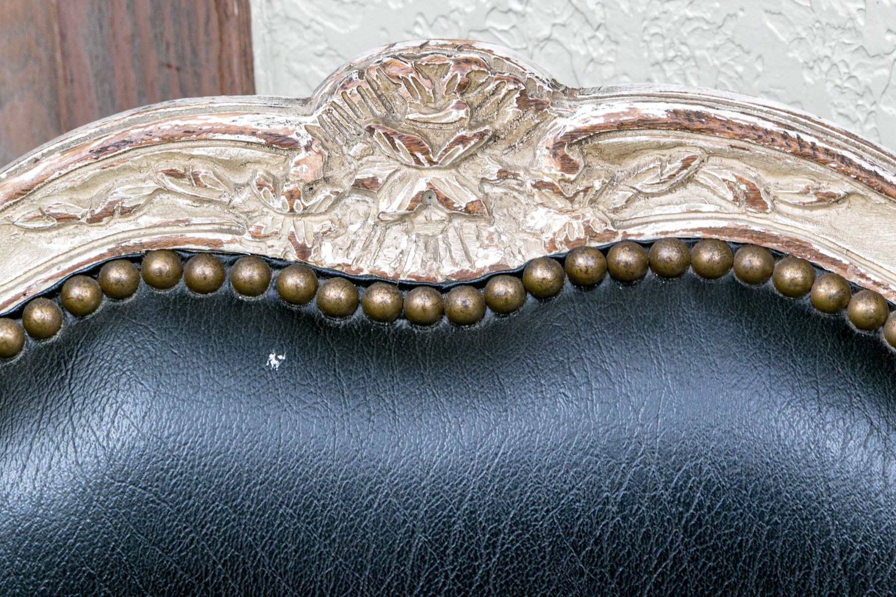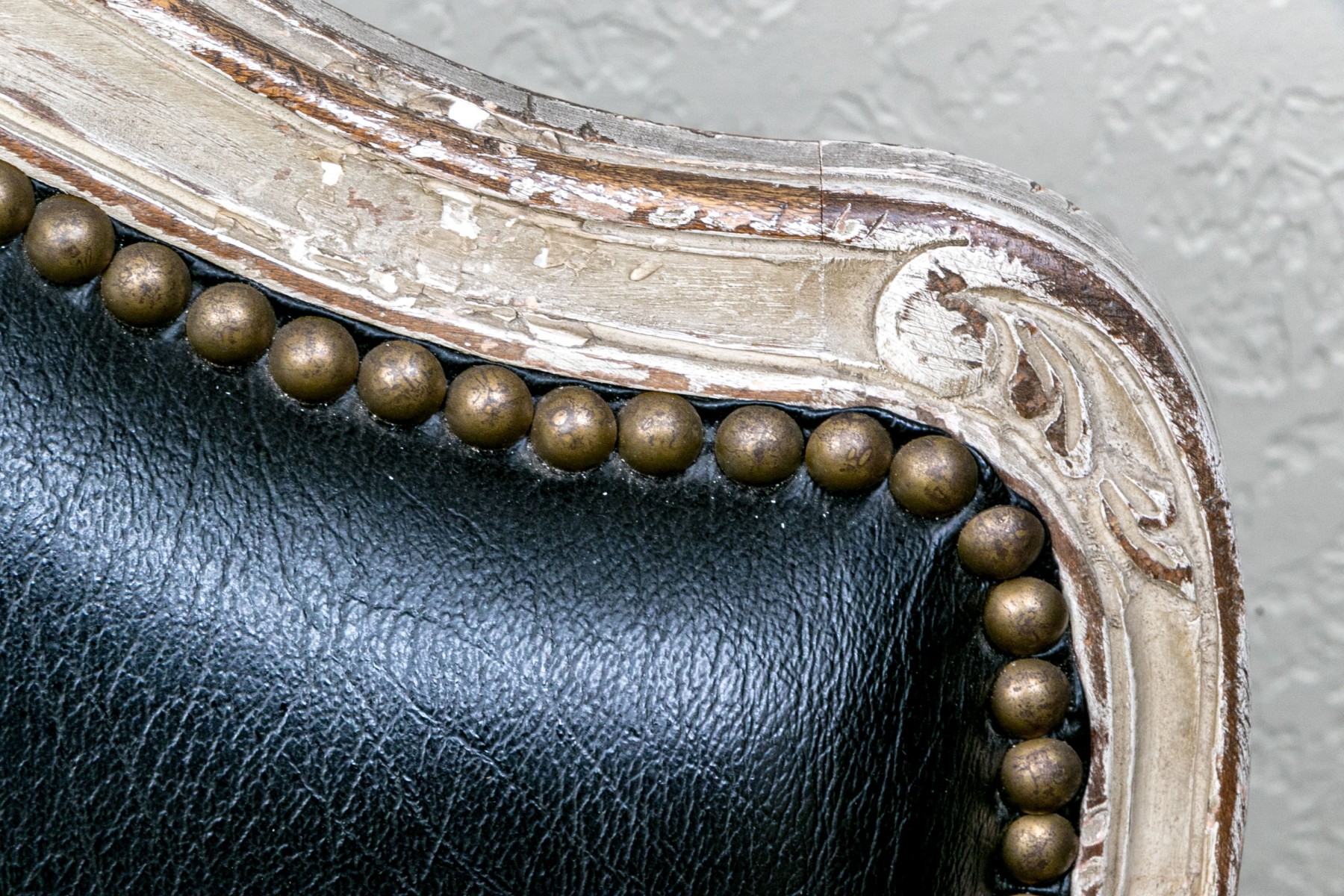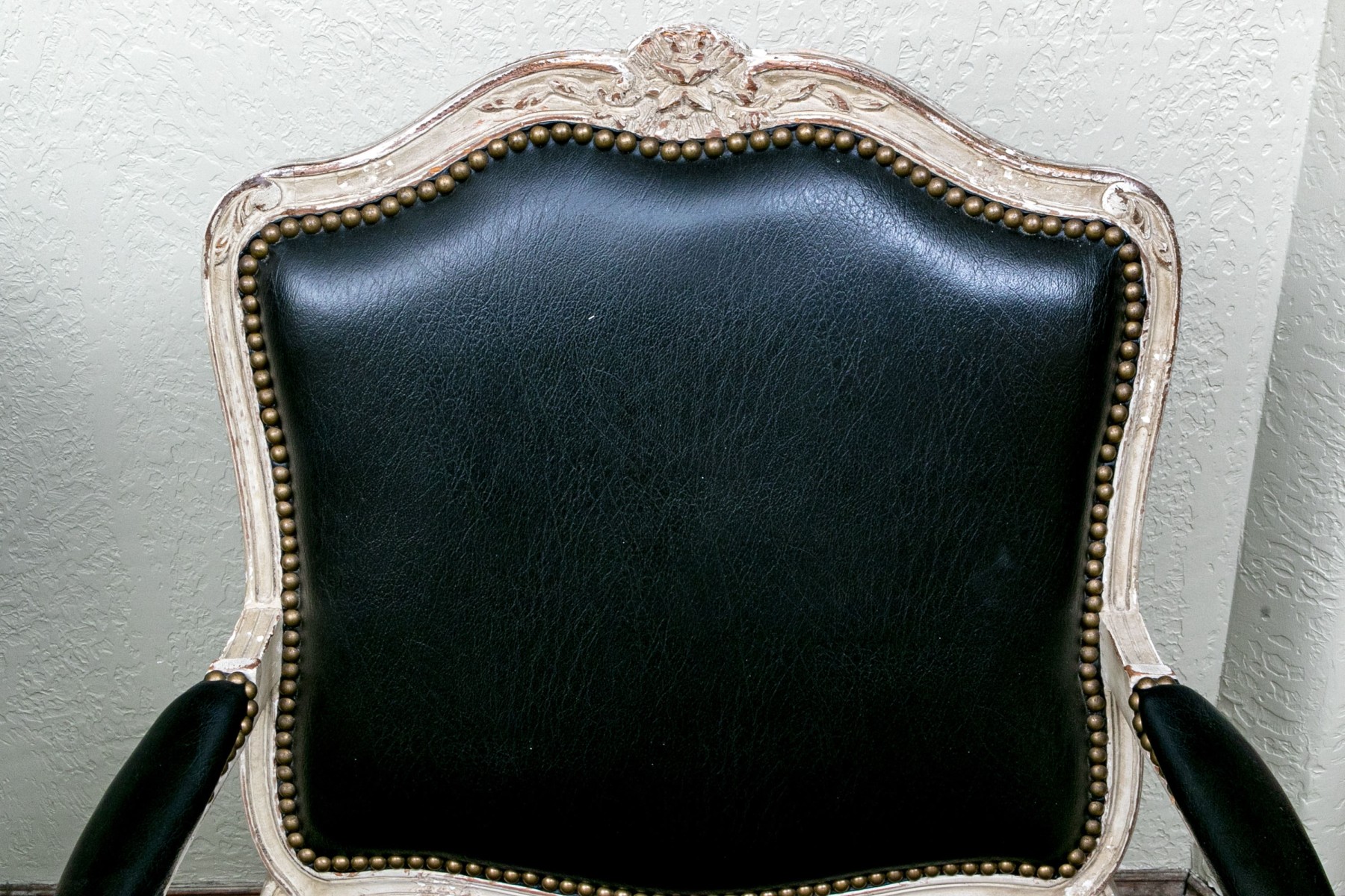 A stylish pair of Louis XV style fauteuils blending traditional forms with sleek, contemporary flare. The chairs feature rustic, whitewashed framed with floral crests over serpentine toprails that echo the elegant curves of the arms and legs. Upholstered in rich black leather for excellent visual contrast. The upholstery is lined with brass nailhead trims, heralding cabriole legs with foliate carved details around the knees and aprons.
