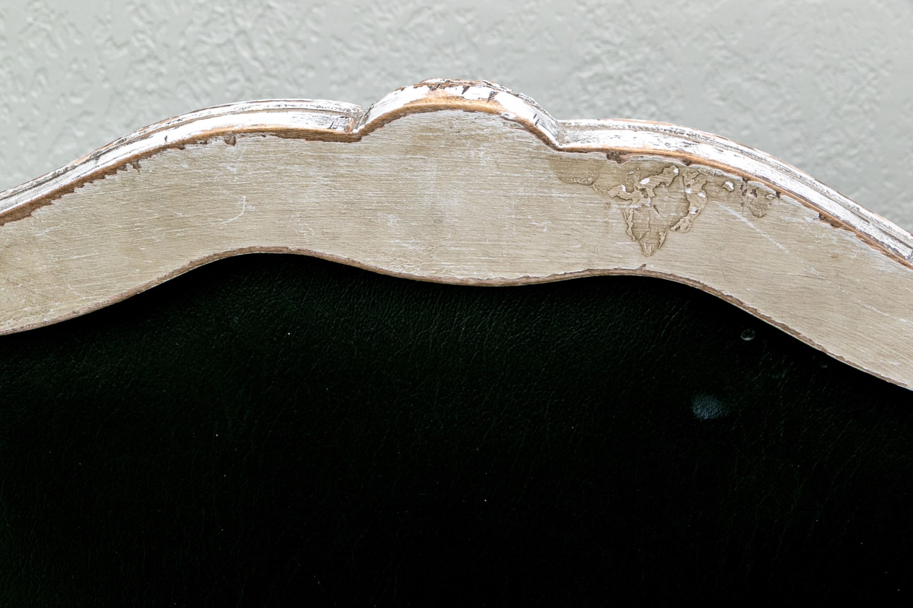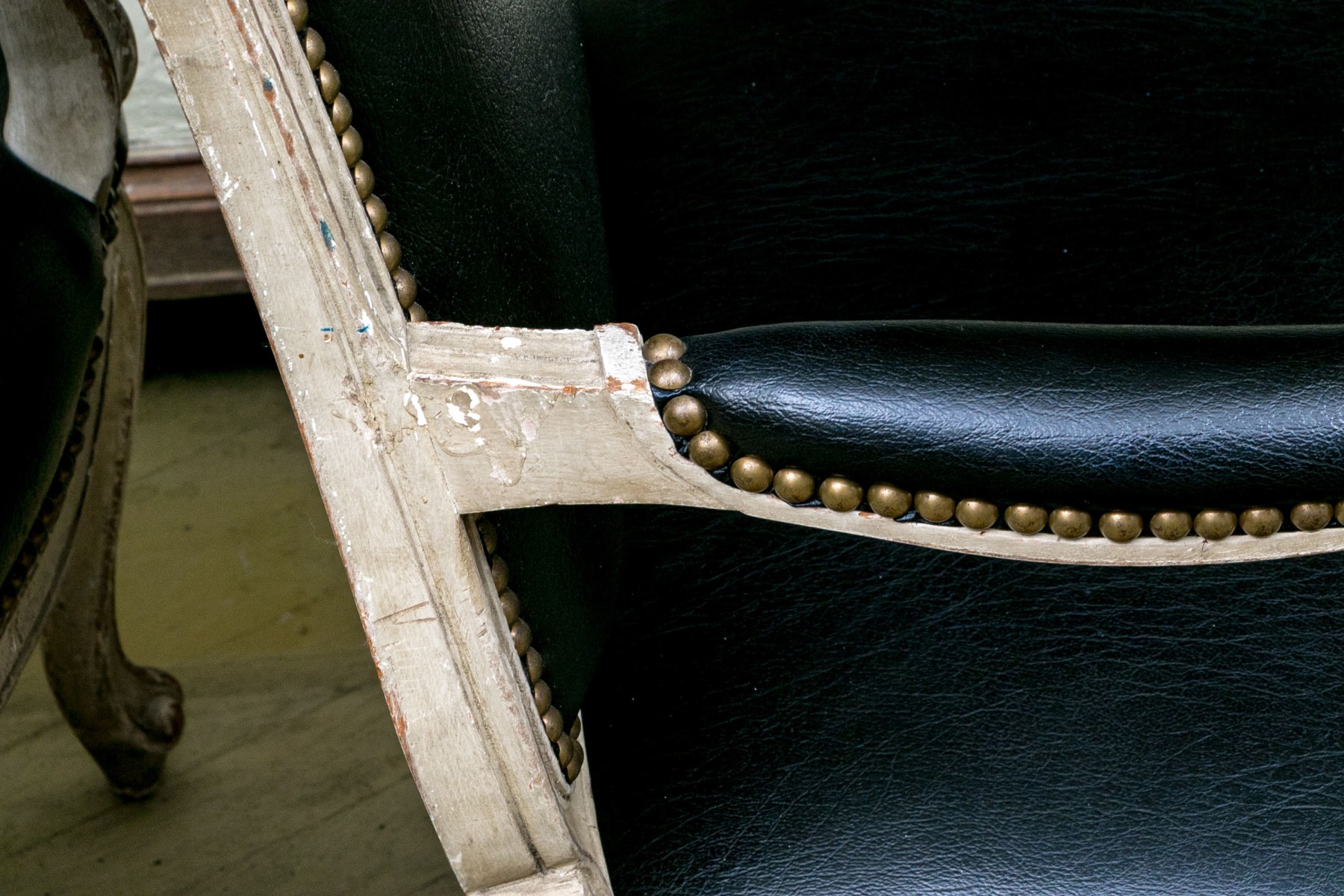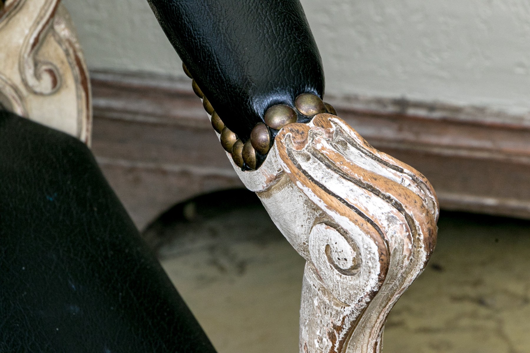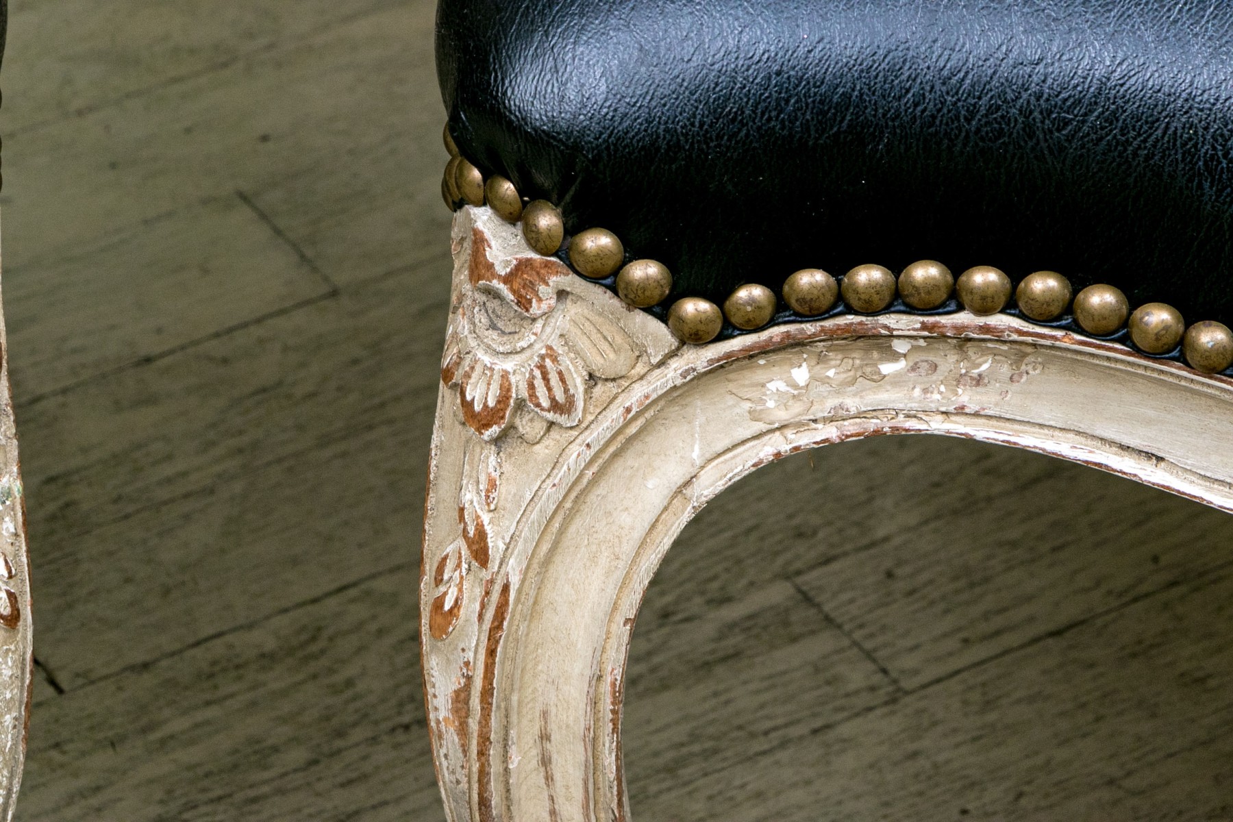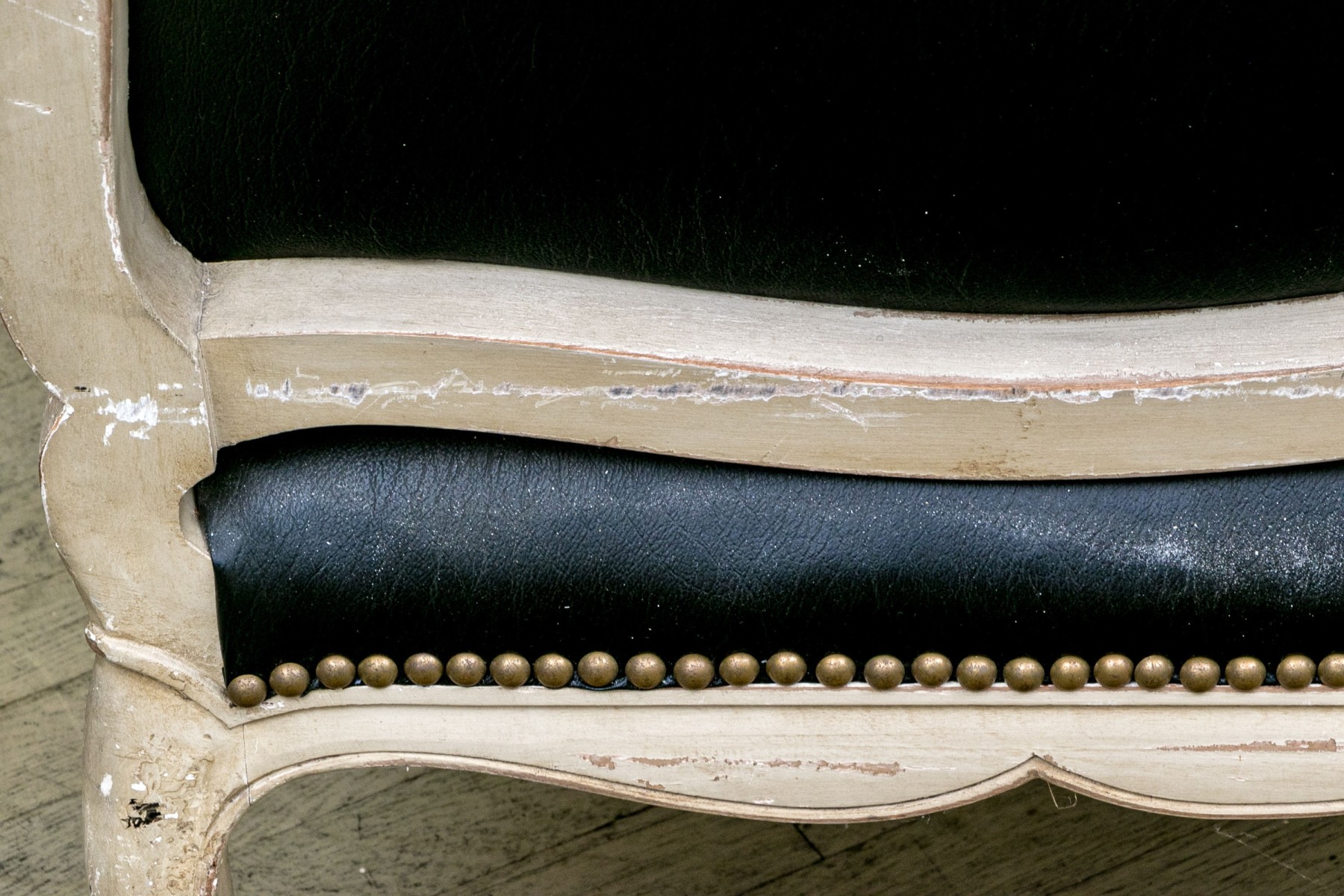 A stylish pair of Louis XV style fauteuils blending traditional forms with sleek, contemporary flare. The chairs feature rustic, whitewashed framed with floral crests over serpentine toprails that echo the elegant curves of the arms and legs. Upholstered in rich black leather for excellent visual contrast. The upholstery is lined with brass nailhead trims, heralding cabriole legs with foliate carved details around the knees and aprons.