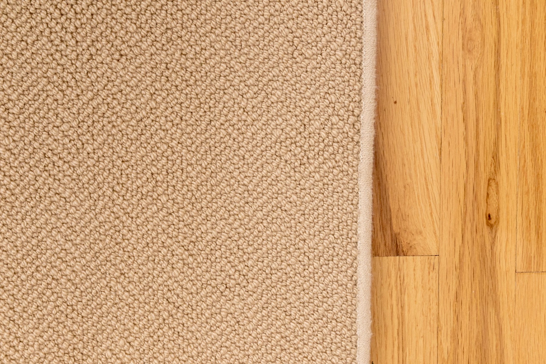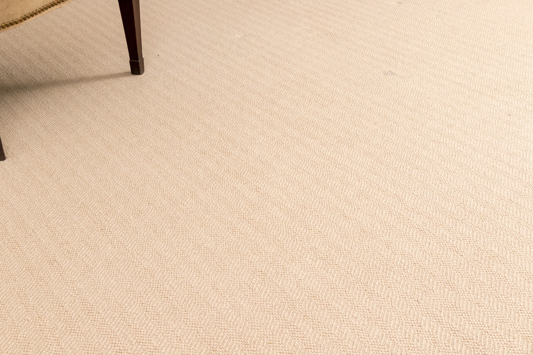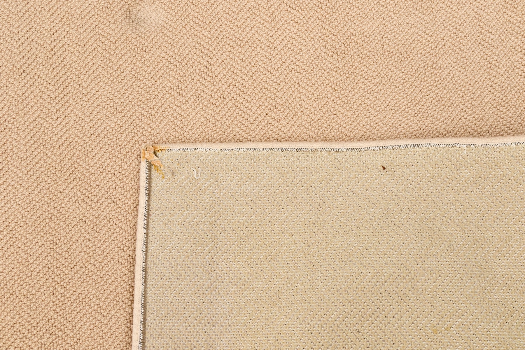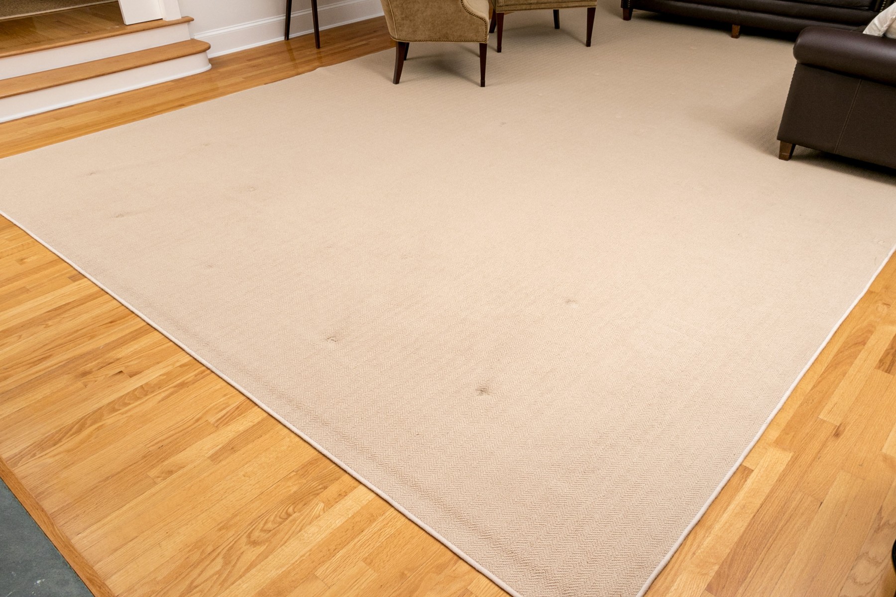 Karastan custom cut, cream wool loop area rug, wool wrap binding, 12’0.5” x 25’-8”.