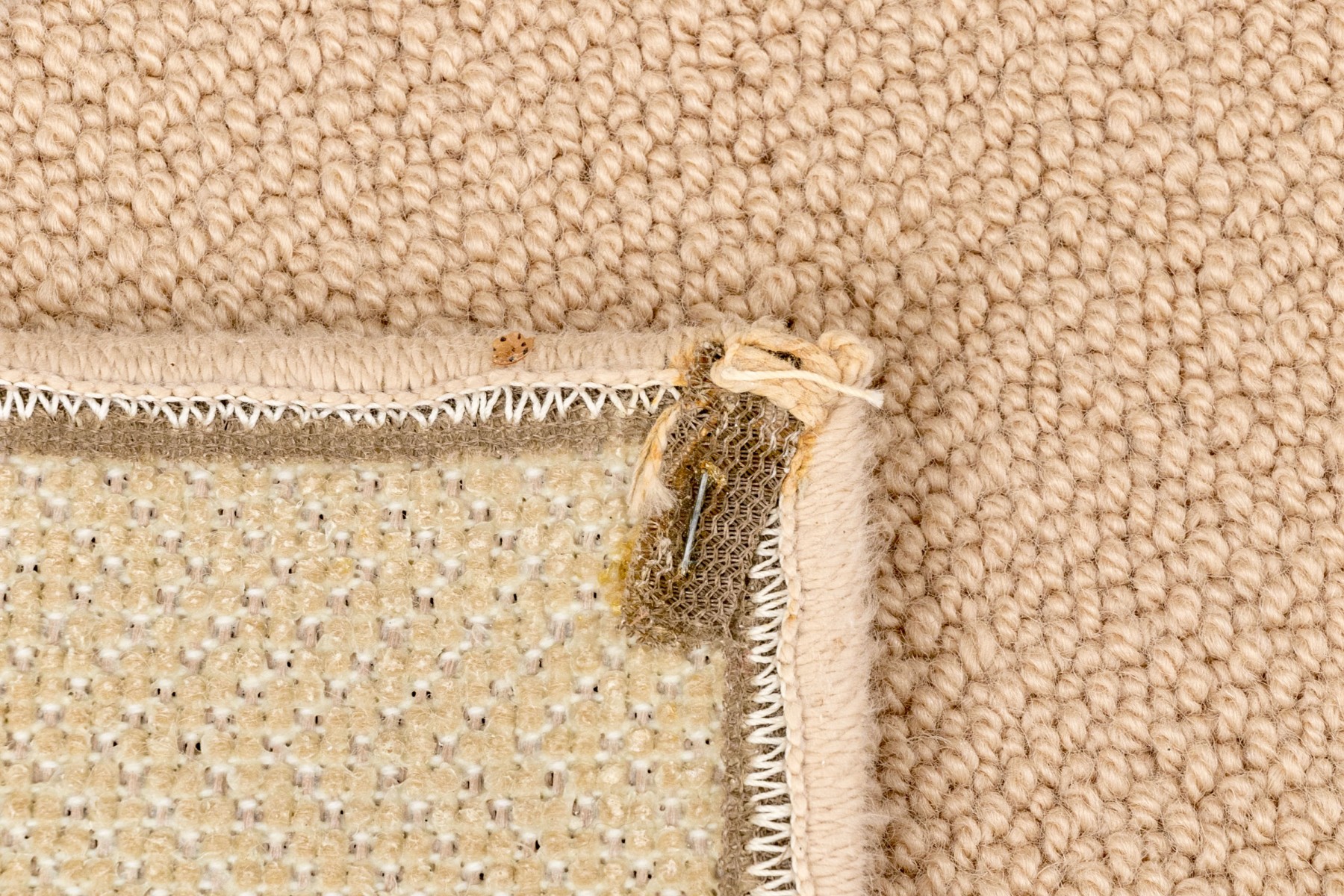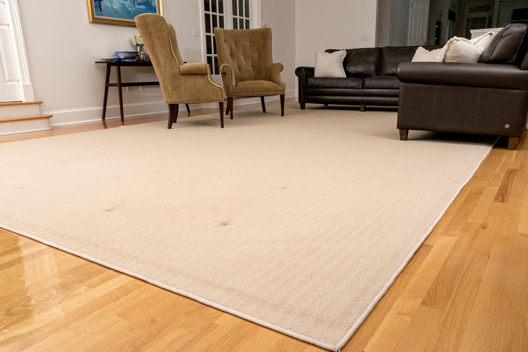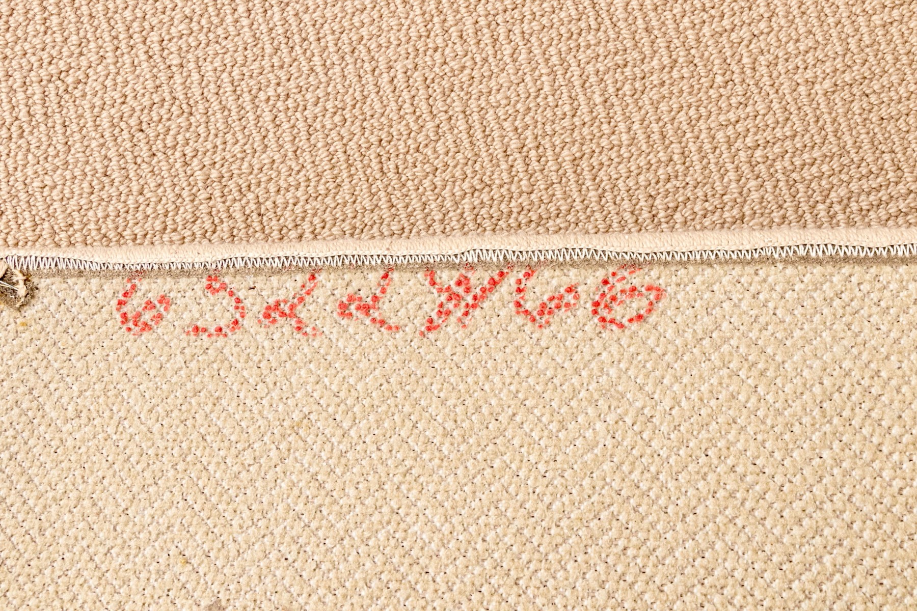 Karastan custom cut, cream wool loop area rug, wool wrap binding, 12’0.5” x 25’-8”.