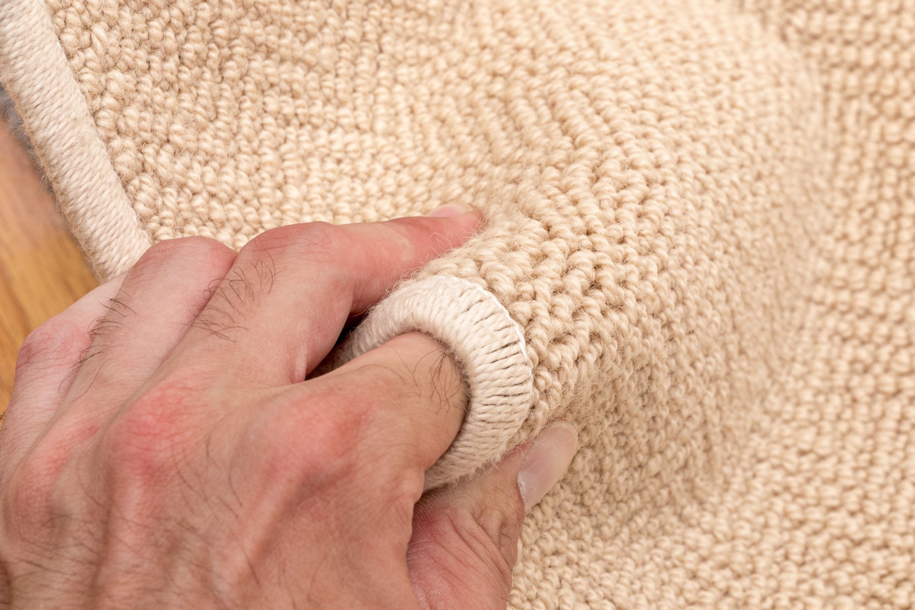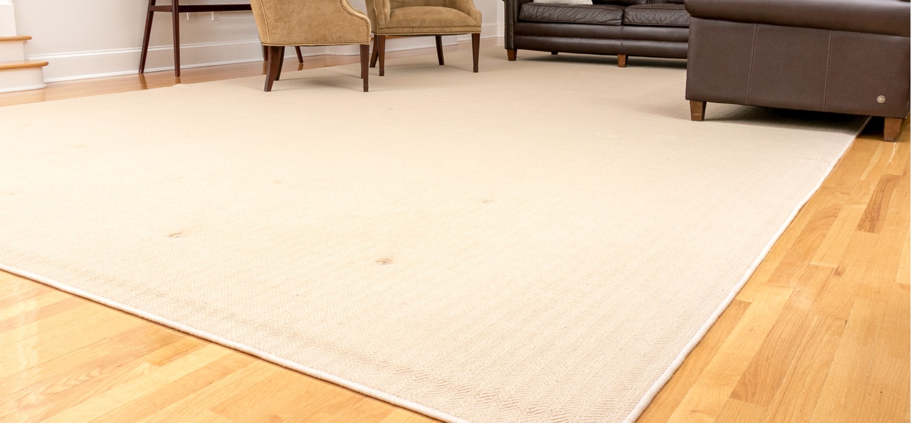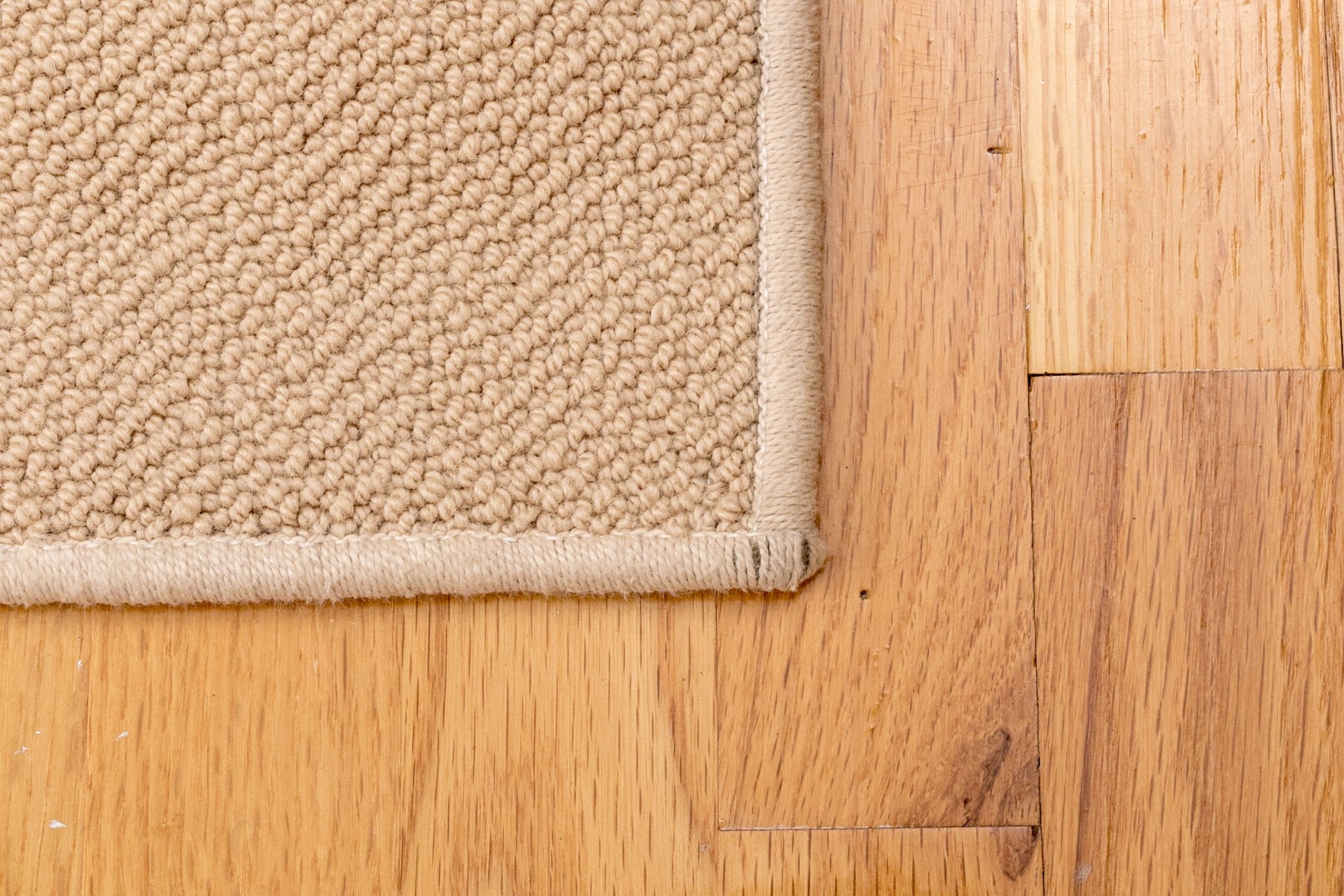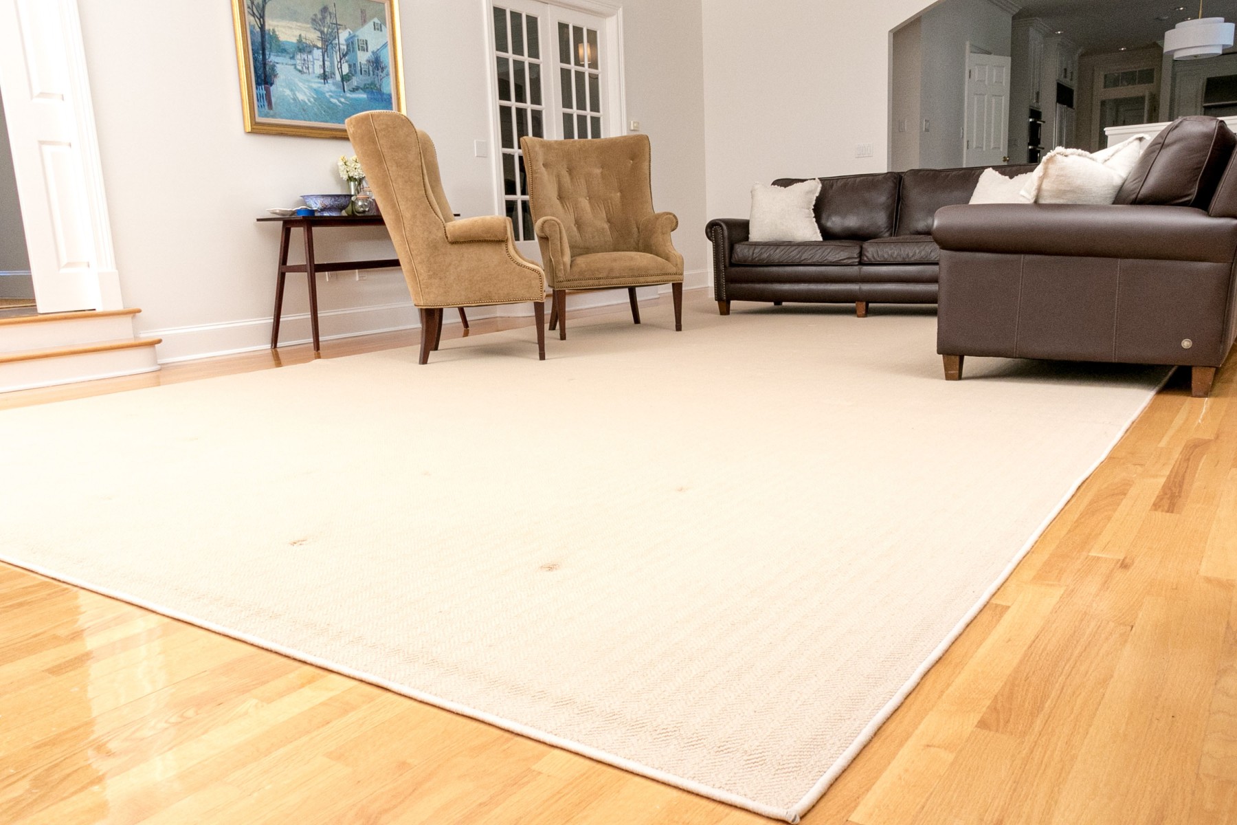Karastan custom cut, cream wool loop area rug, wool wrap binding, 12’0.5” x 25’-8”.